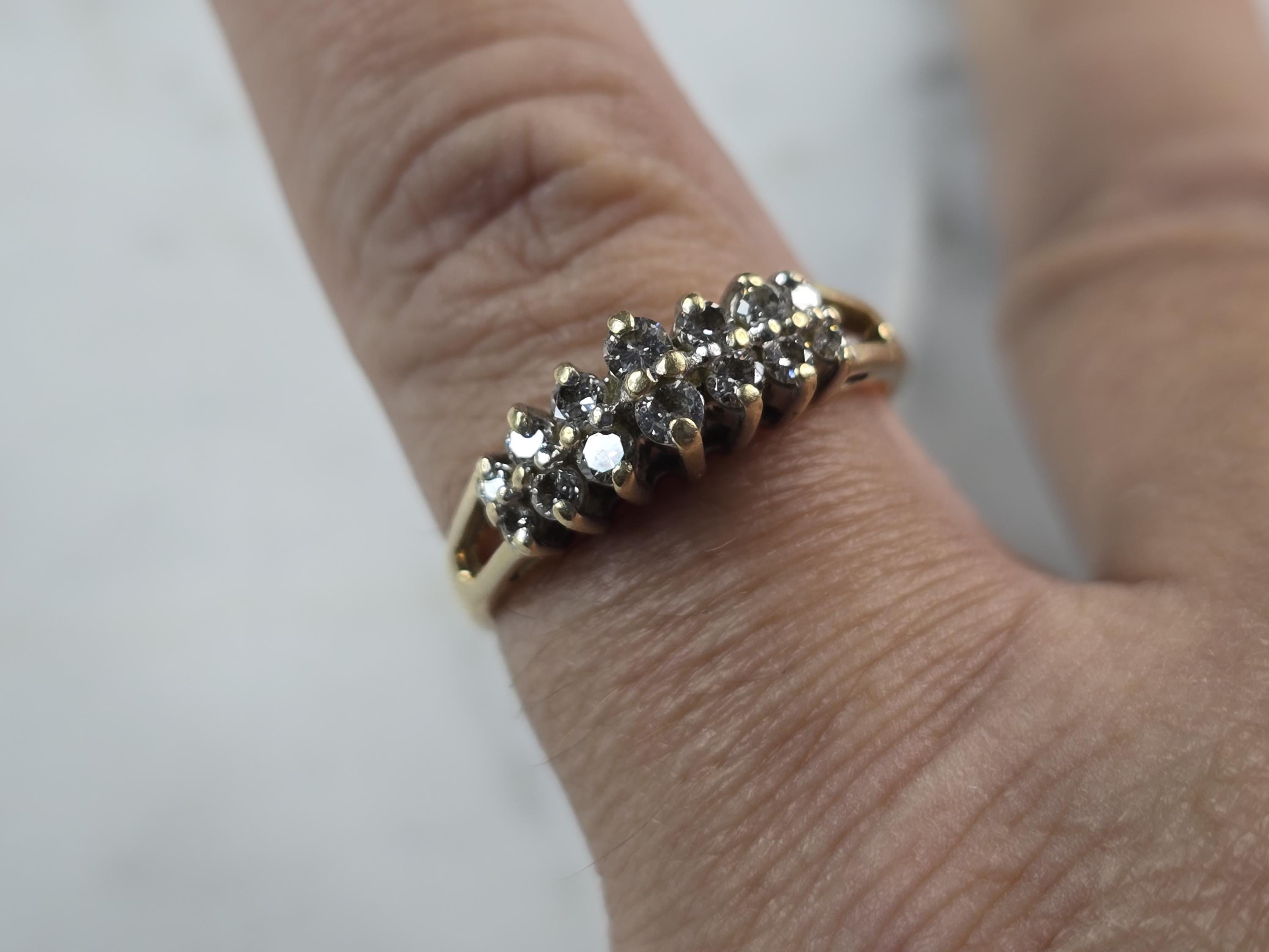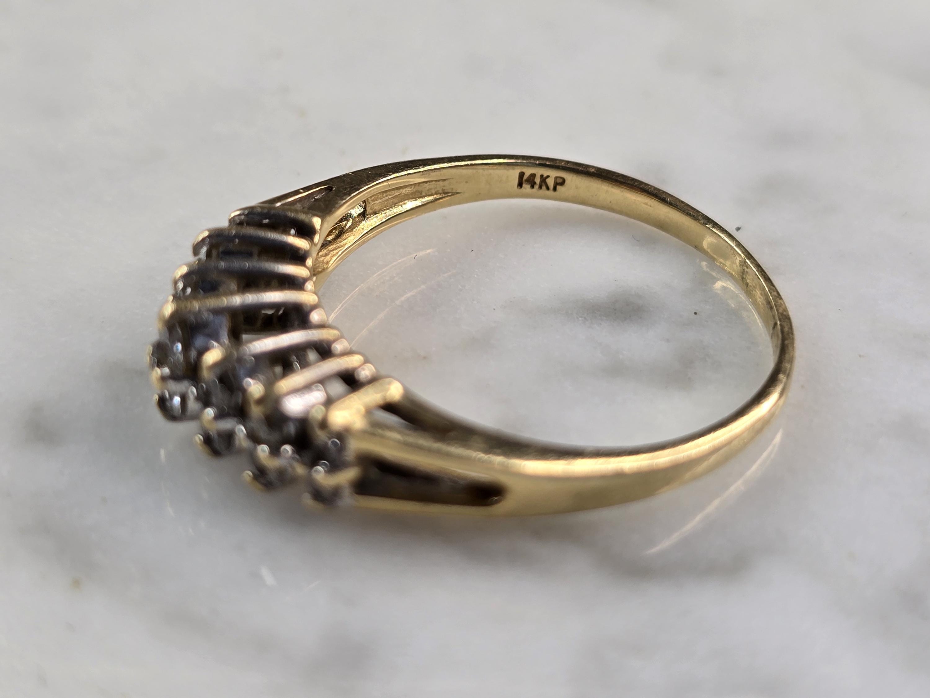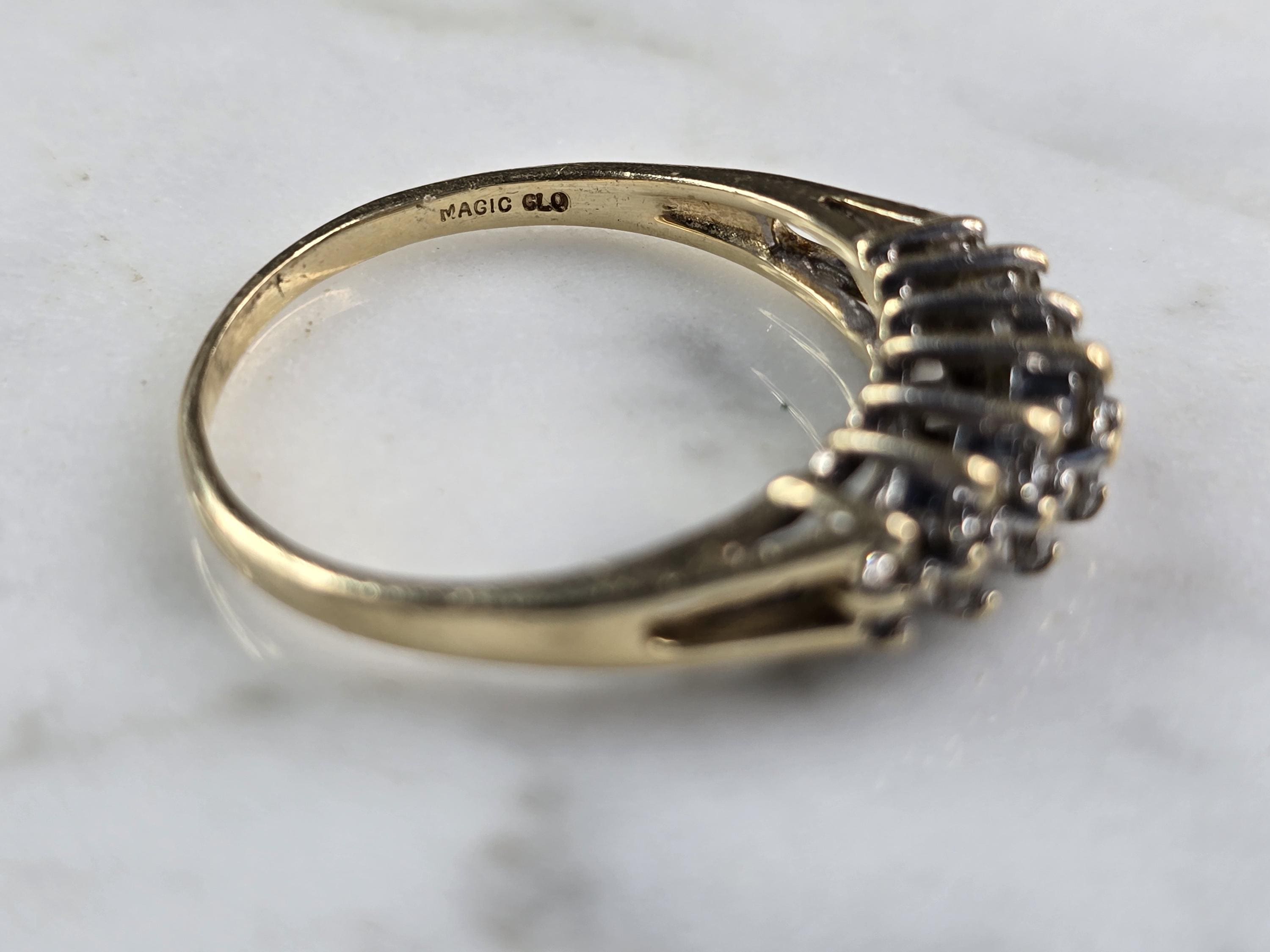 A WOMENS VINTAGE ESTATE 14K YELLOW GOLD DIAMOND CLUSTER RING WITH ABOUT 0.46cts OF DIAMONDS. THE TOTAL WEIGHT IS 3.3g, AND IS A SIZE 8.25. RING IS MARKED "14KP, MAGIC-GLO. THE "P" STANDS FOR PLUMB NOT PLATED. ANY QUESTIONS PLEASE DONT HESITATE TO ASK. BE SURE TO CHECK OUT SOME OF OUR OTHER GREAT ITEMS UP FOR SALE. THANK YOU.