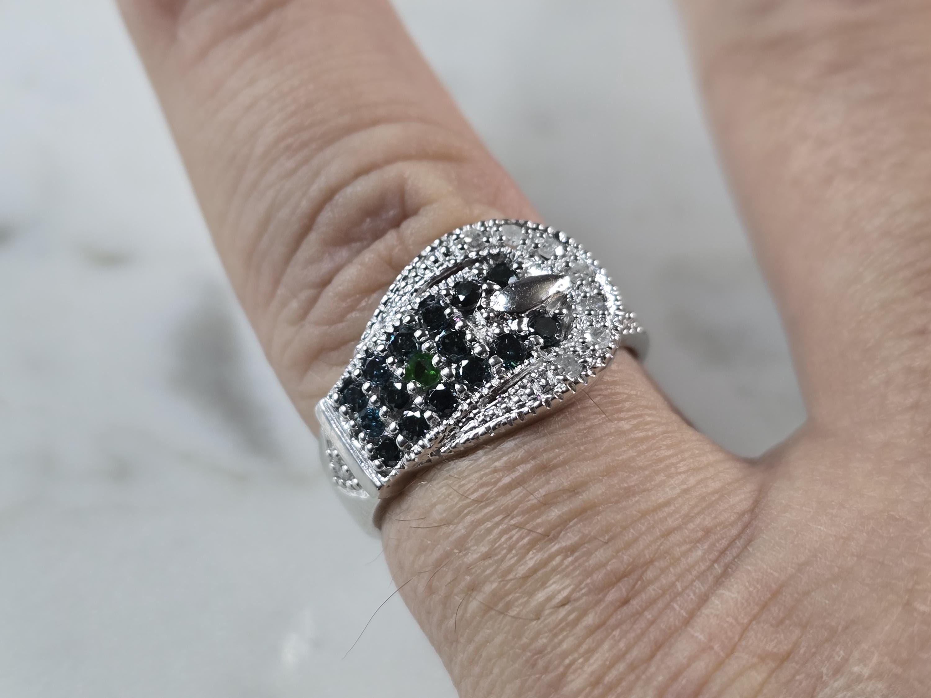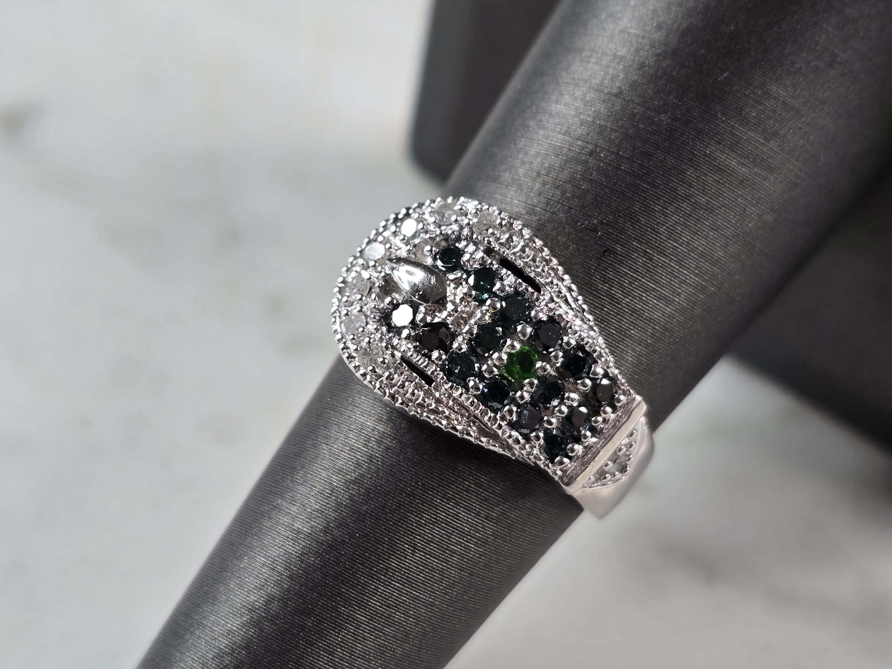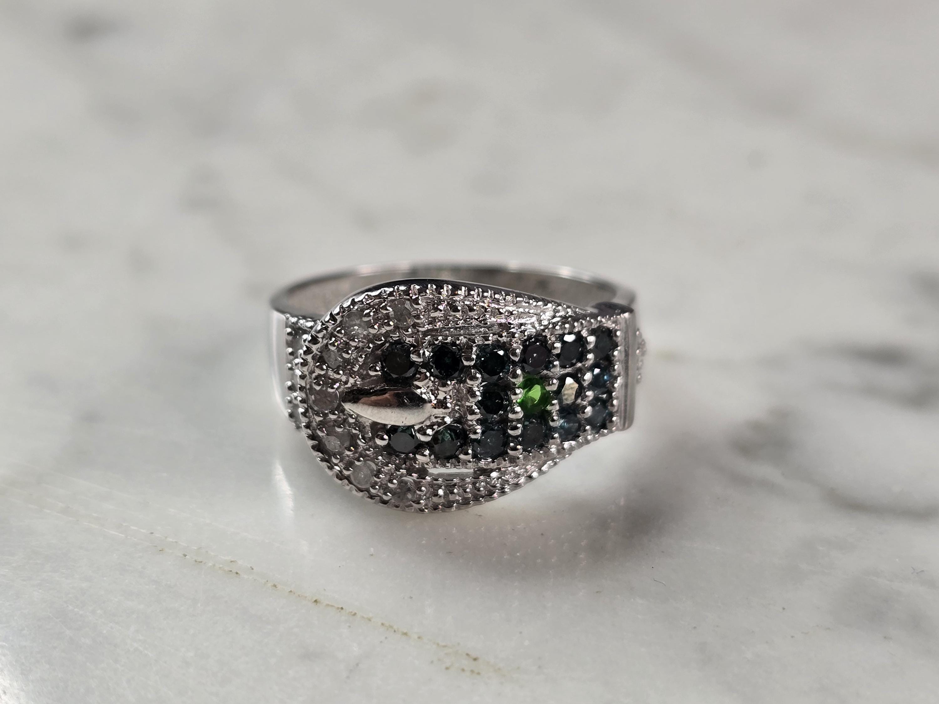 A WOMENS VINTAGE ESTATE 10K WHITE GOLD DIAMOND & SAPPHIRE BUCKLE RING. THE RING WEIGHS 3.5g, AND IS A SIZE 7.0. THERE ARE ABOUT .11cts OF DIAMONDS, AND ABOUT 0.32cts OF SAPPHIRES. RING IS MARKED "10K, LJ". ONE STONE APPEARS TO BE EITHER DIOPSIDE OR EMERALD. NOT SURE IF THAT IS PART OF THE DESIGN OR NOT. RING MAKES A LOVELY GIFT FOR THAT SOMEONE SPECIAL. ANY QUESTIONS, PLEASE DO NOT HESITATE TO ASK. BE SURE TO CHECK OUT SOME OF MY OTHER GREAT ITEMS UP FOR SALE. THANK YOU.