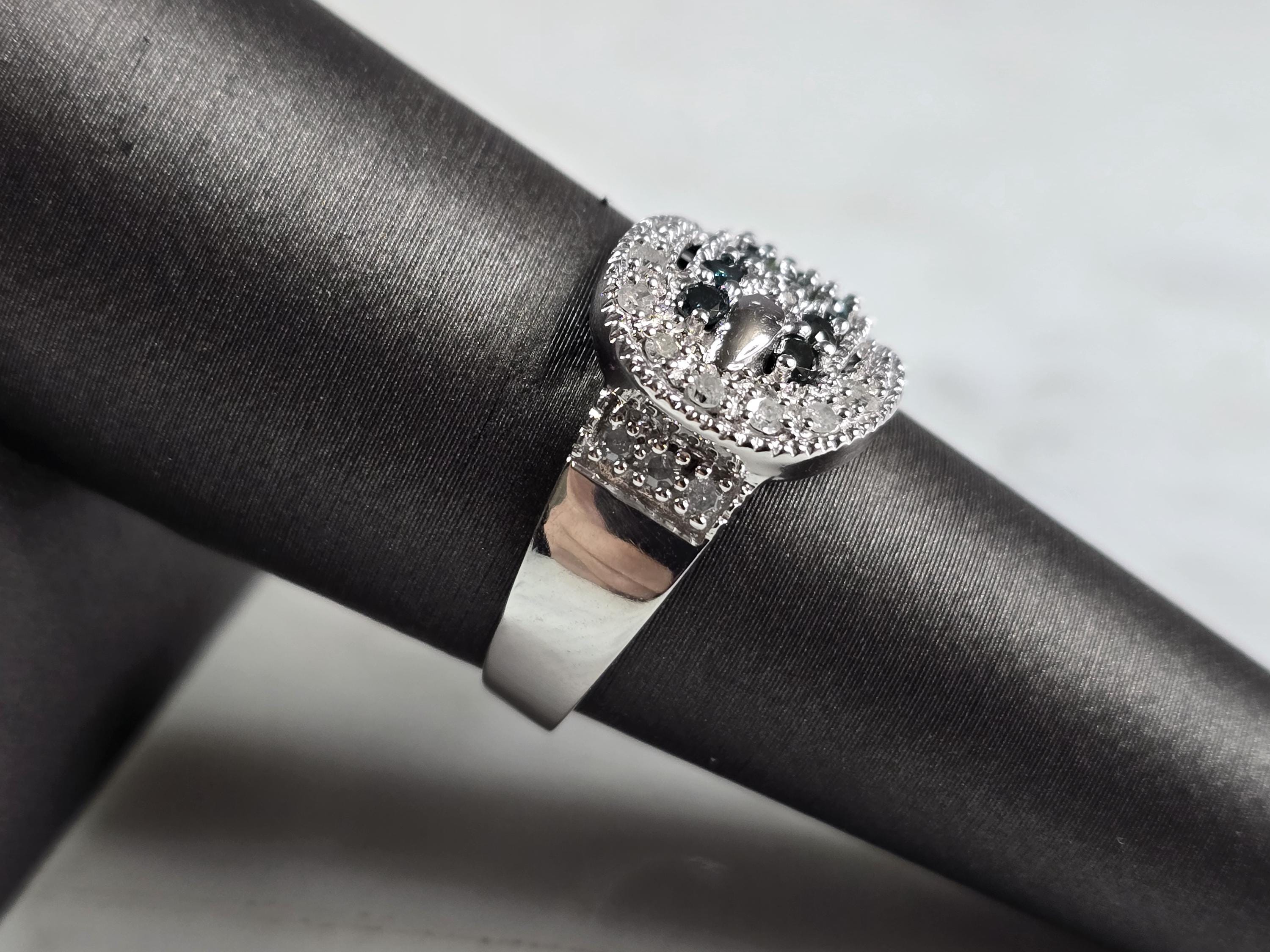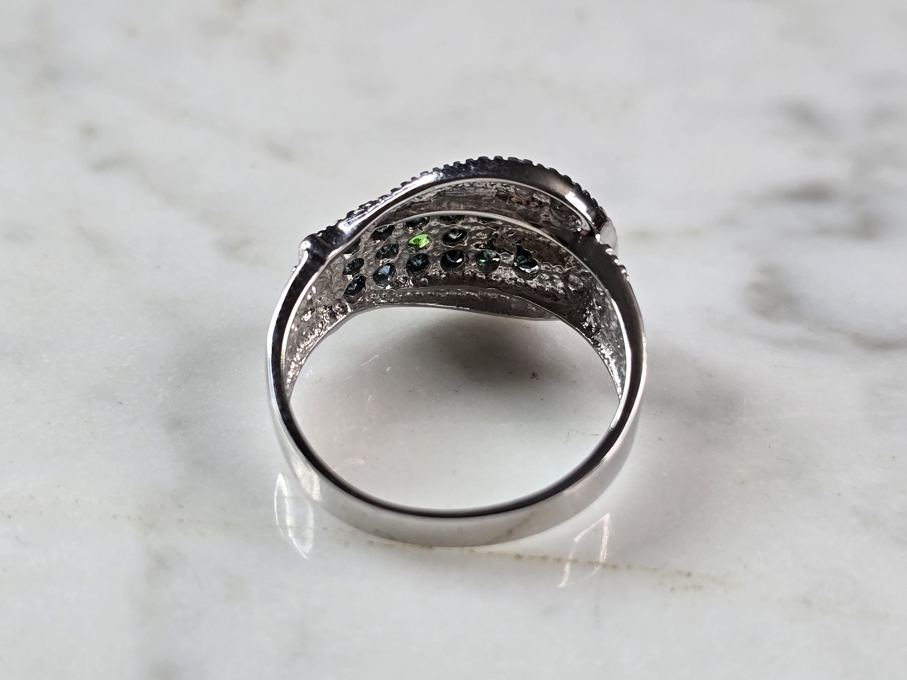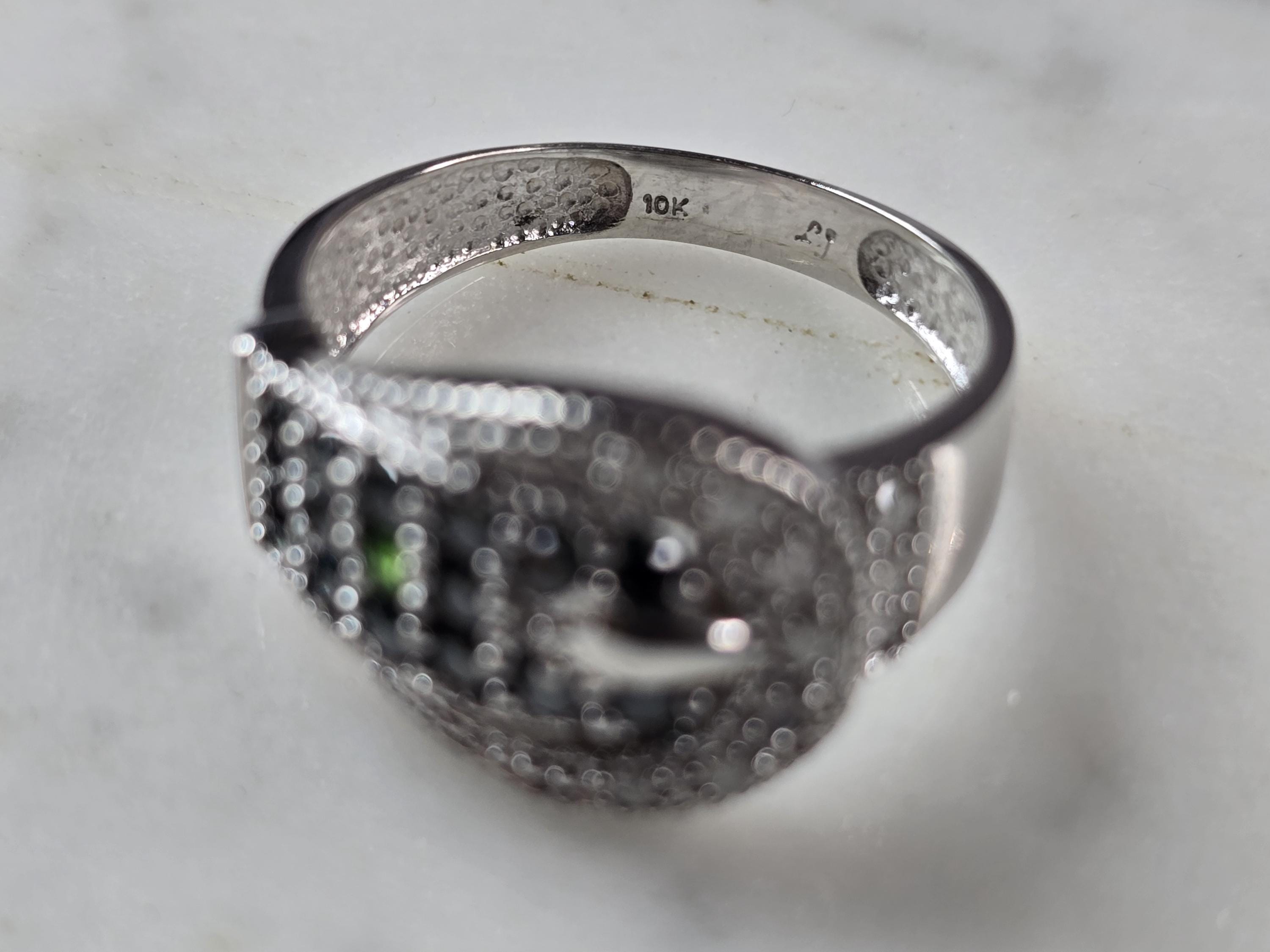 A WOMENS VINTAGE ESTATE 10K WHITE GOLD DIAMOND & SAPPHIRE BUCKLE RING. THE RING WEIGHS 3.5g, AND IS A SIZE 7.0. THERE ARE ABOUT .11cts OF DIAMONDS, AND ABOUT 0.32cts OF SAPPHIRES. RING IS MARKED "10K, LJ". ONE STONE APPEARS TO BE EITHER DIOPSIDE OR EMERALD. NOT SURE IF THAT IS PART OF THE DESIGN OR NOT. RING MAKES A LOVELY GIFT FOR THAT SOMEONE SPECIAL. ANY QUESTIONS, PLEASE DO NOT HESITATE TO ASK. BE SURE TO CHECK OUT SOME OF MY OTHER GREAT ITEMS UP FOR SALE. THANK YOU.