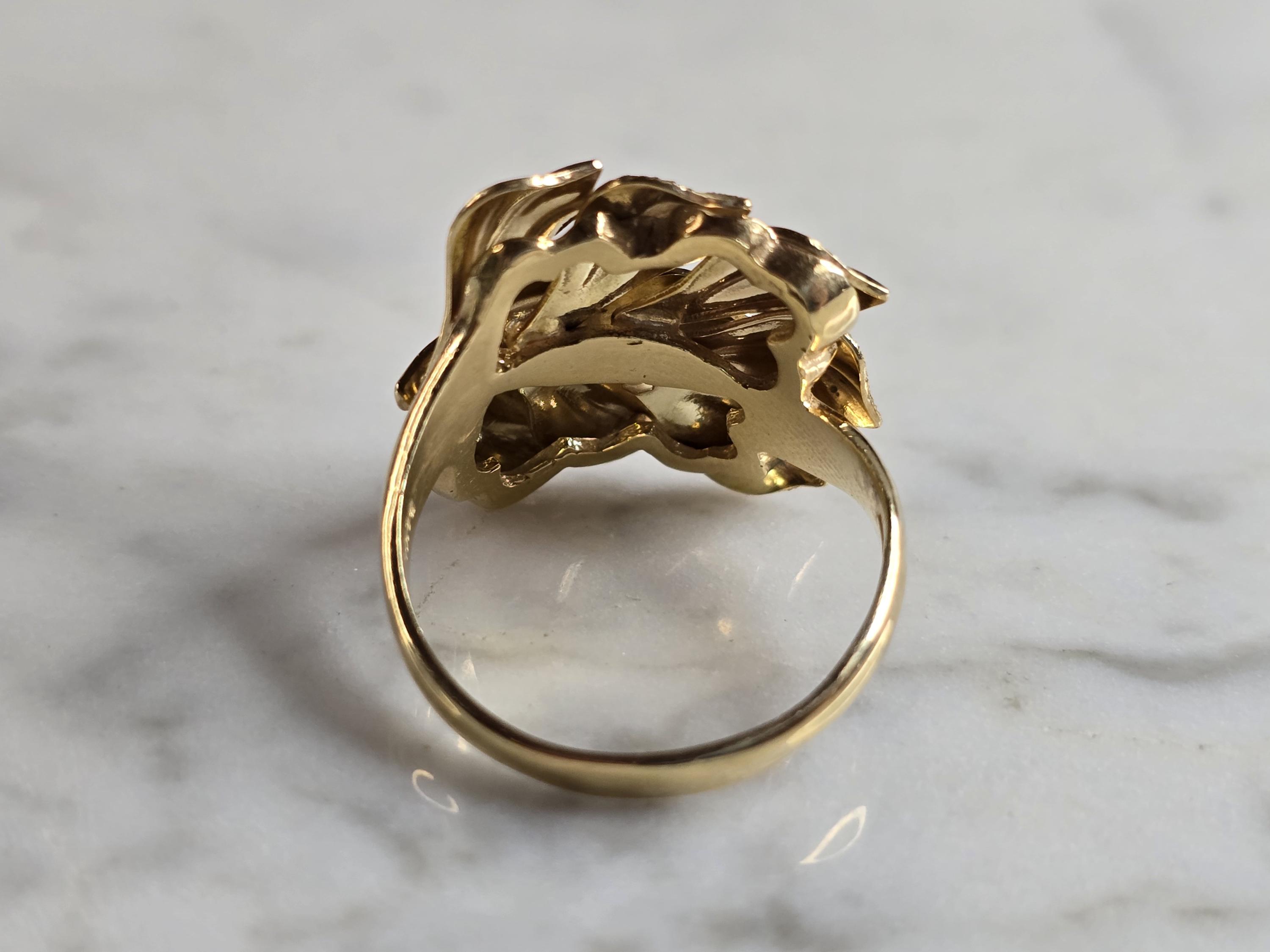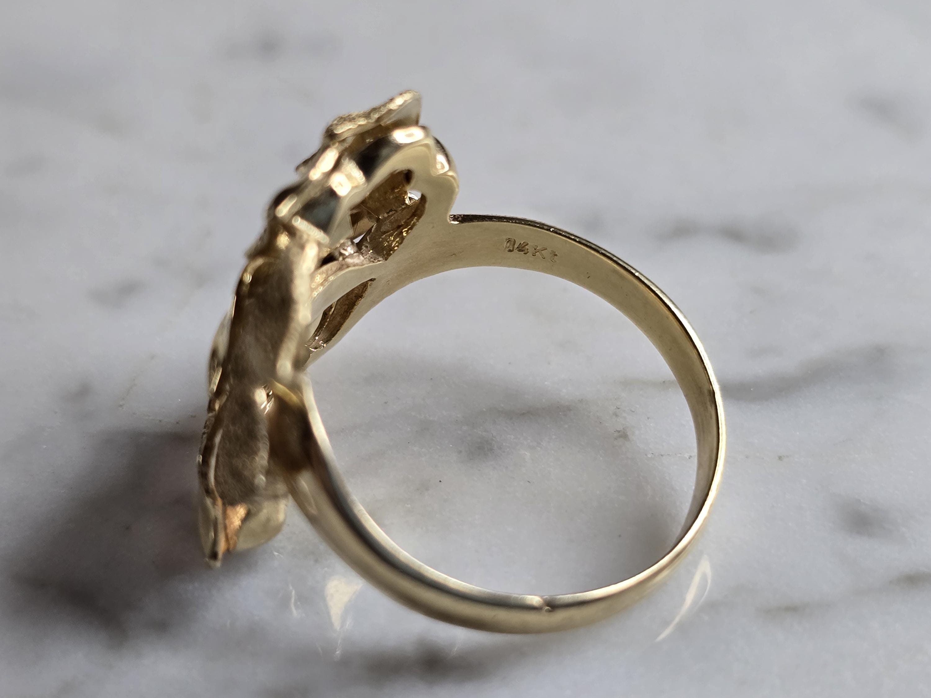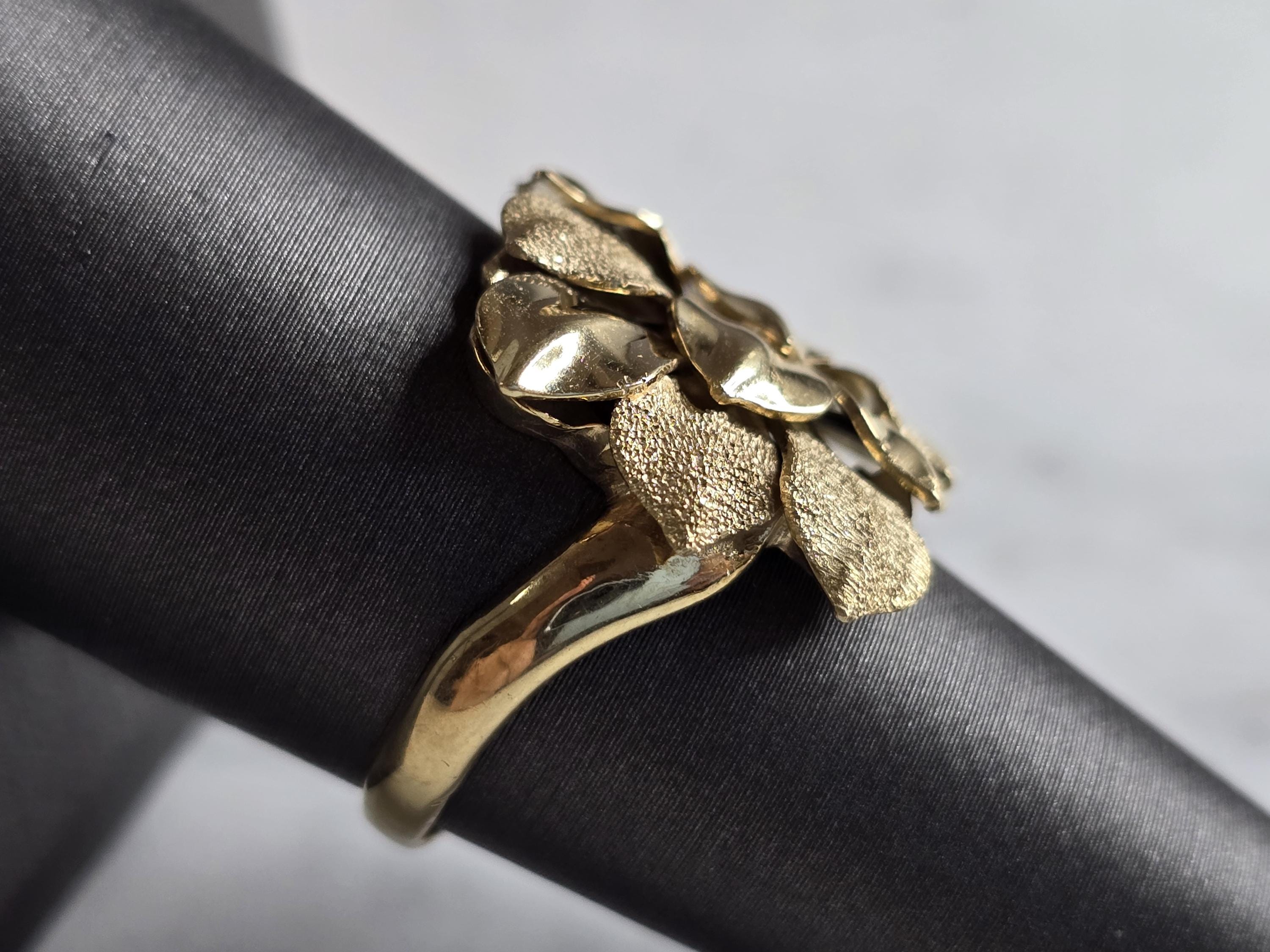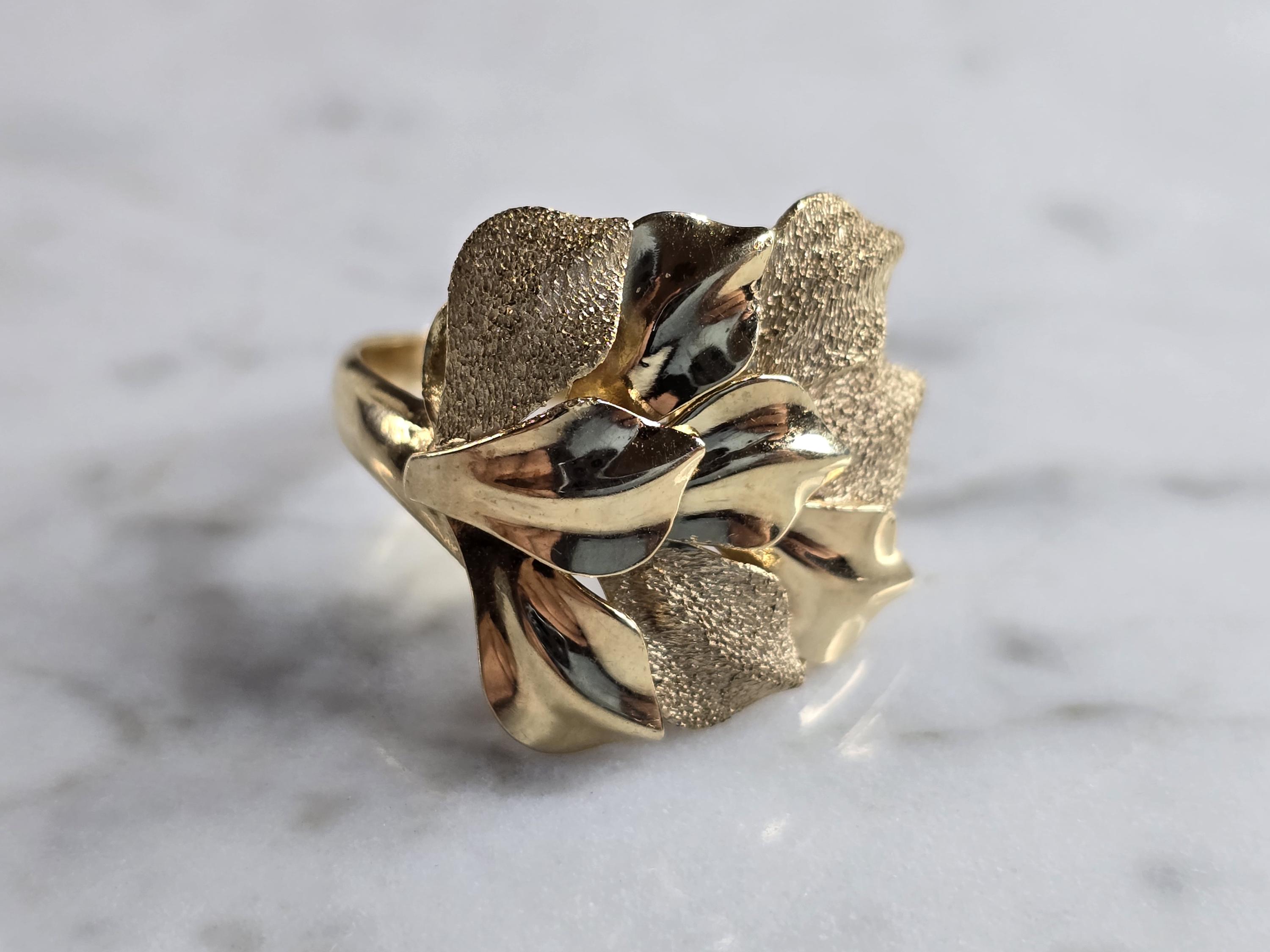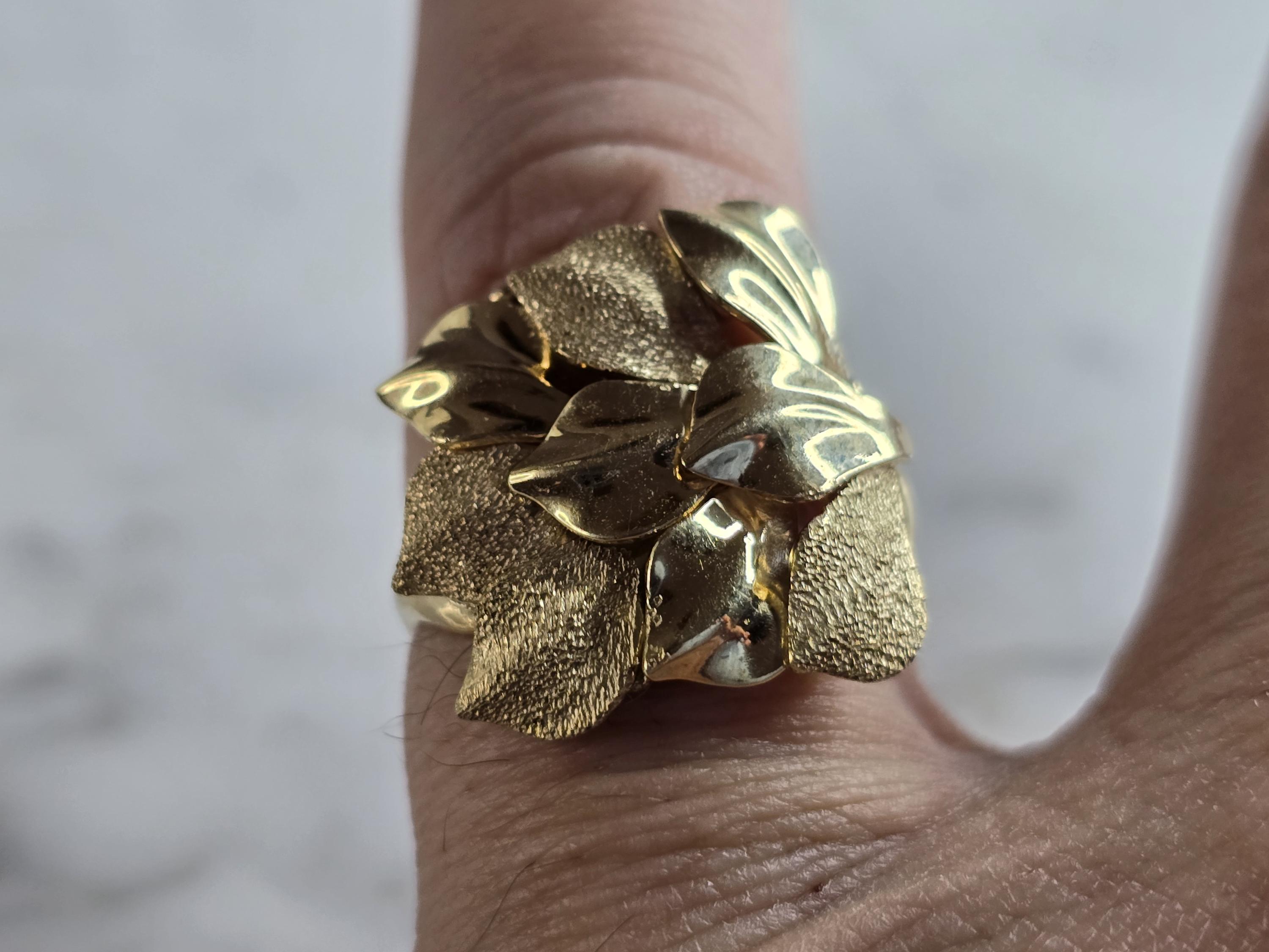 A WOMENS VINTAGE ESTATE 14K YELLOW GOLD FLORAL ITALIAN MADE RING. THE RING WEIGHS 5.9g AND IS A SIZE 8.25. THE FACE OF THE RING MEASURES 3/4" LONG. RING IS STAMPED ON THE INSIDE. THIS WOULD MAKE A LOVELY GIFT FOR THAT SOMEONE SPECIAL. ANY QUESTIONS, PLEASE ASK. BE SURE TO CHECK OUT SOME OF MY OTHER GREAT ITEMS UP FOR SALE. THANK YOU.