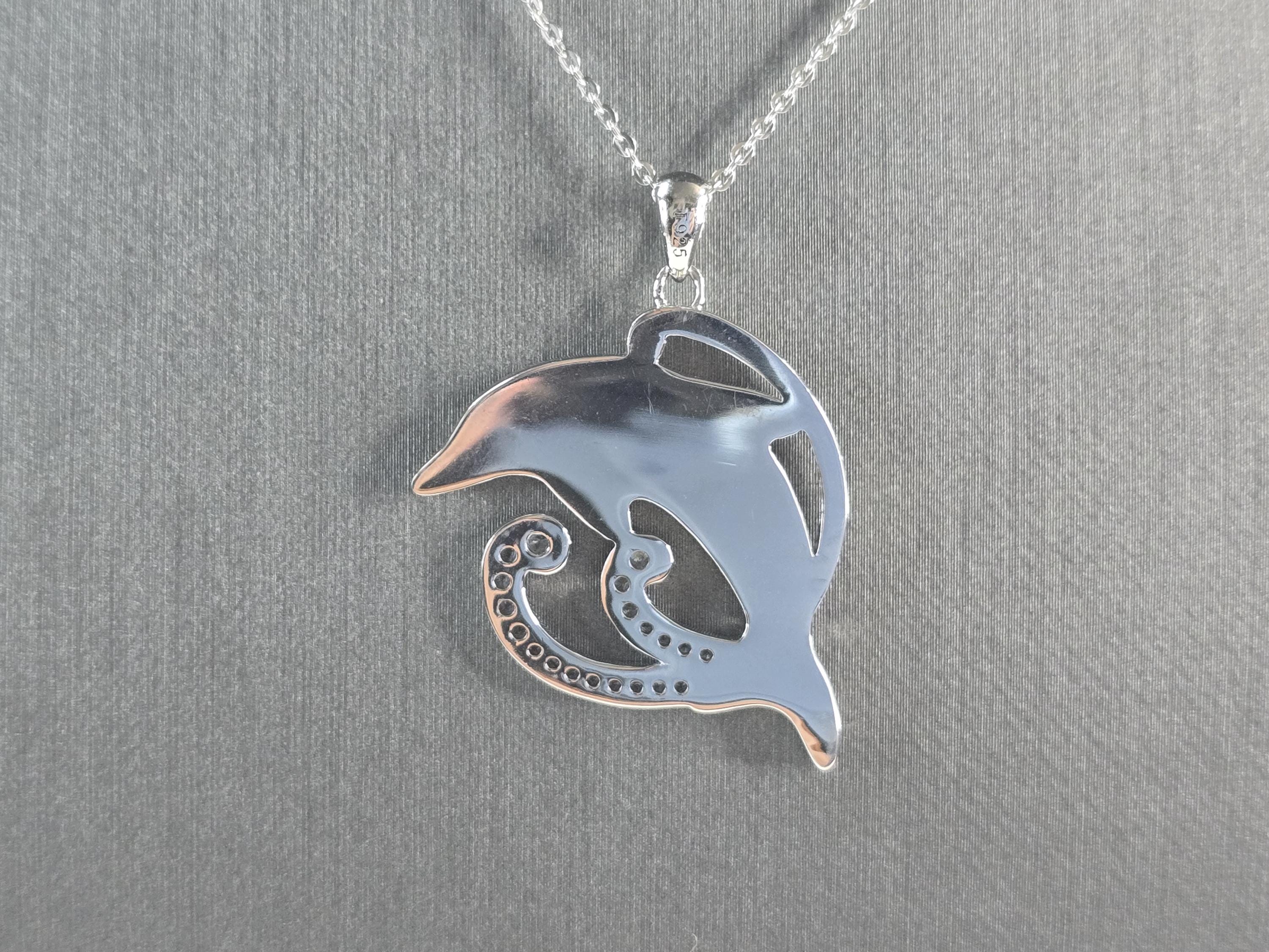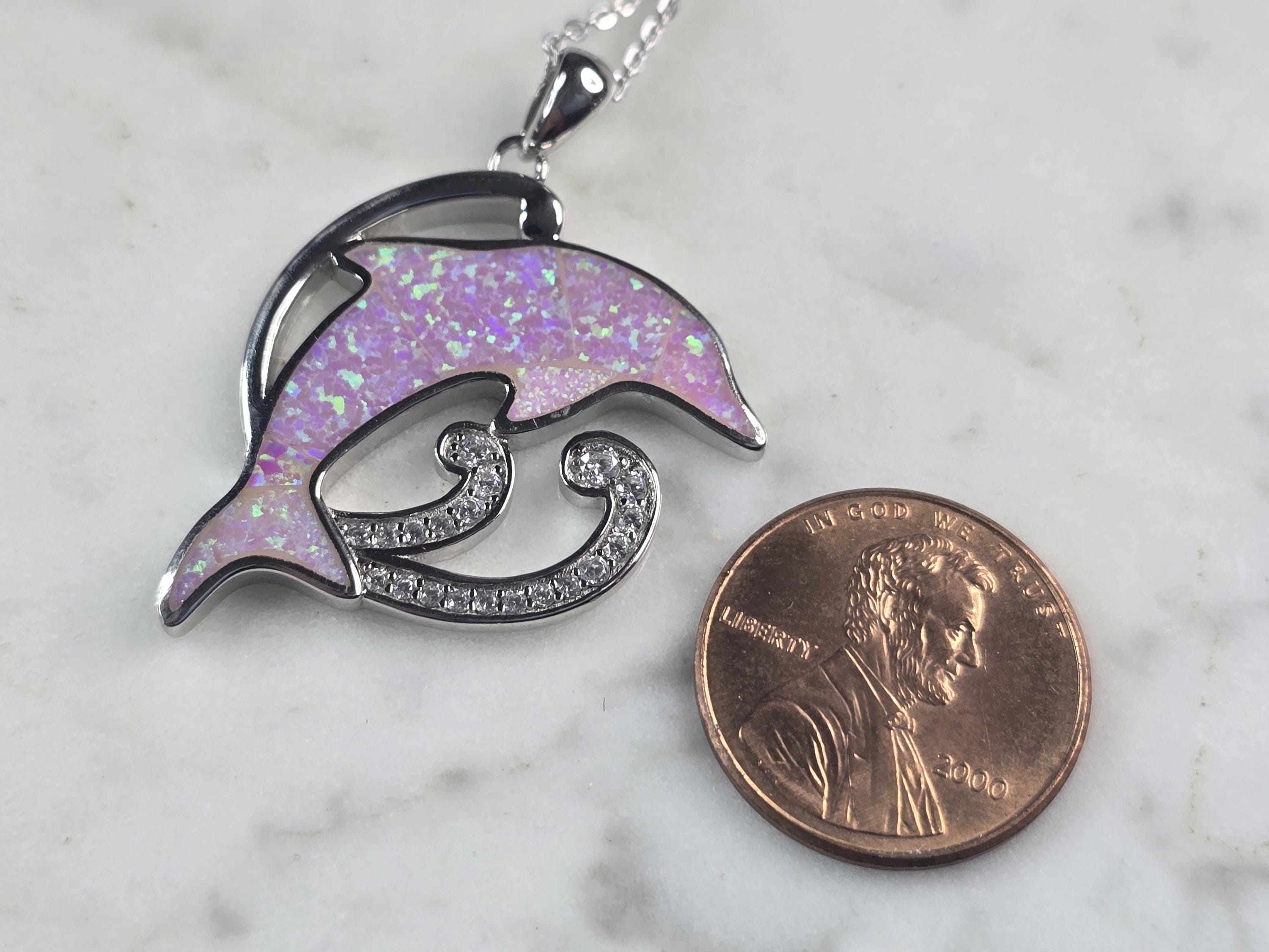 A WOMENS STERLING SILVER PINK OPAL DOLPHIN PENDANT WITH NECKLACE. THE PENDANT WITH NECKLACE WEIGHS 6.7g. PENDANT MEASURES 1 3/8" LONG BY 1" WIDE, AND THE NECKLACE MEASURES 18" LONG, ADJUSTABLE TO 16". NOT SURE IF STONES ARE REAL OR MAN MADE. MAKES A GREAT GIFT FOR THAT SOMEONE SPECIAL. ANY QUESTIONS, PLEASE ASK. BE SURE TO CHECK OUT OUR OTHER ITEMS FOR SALE.