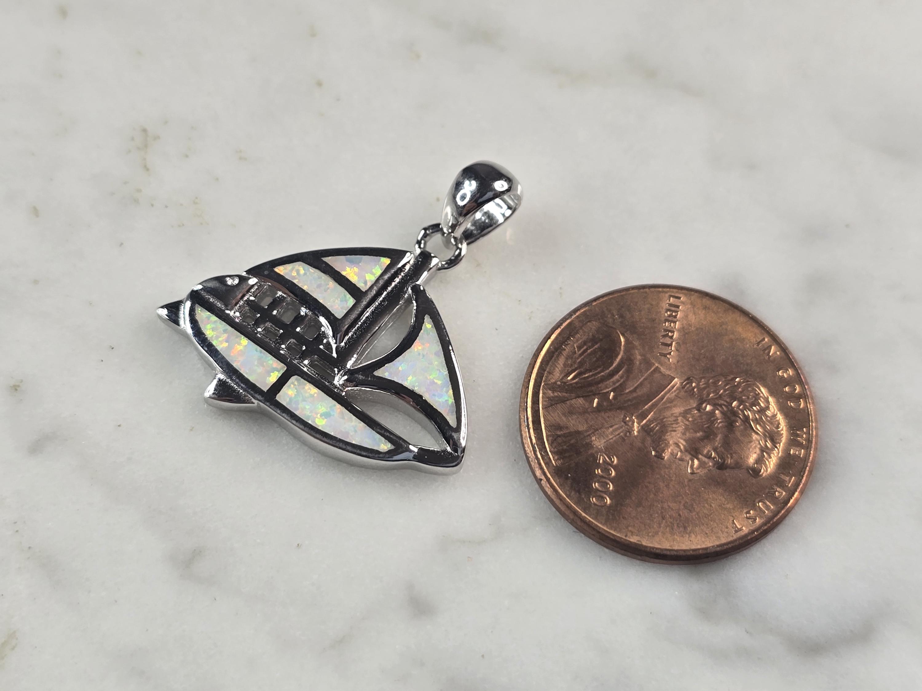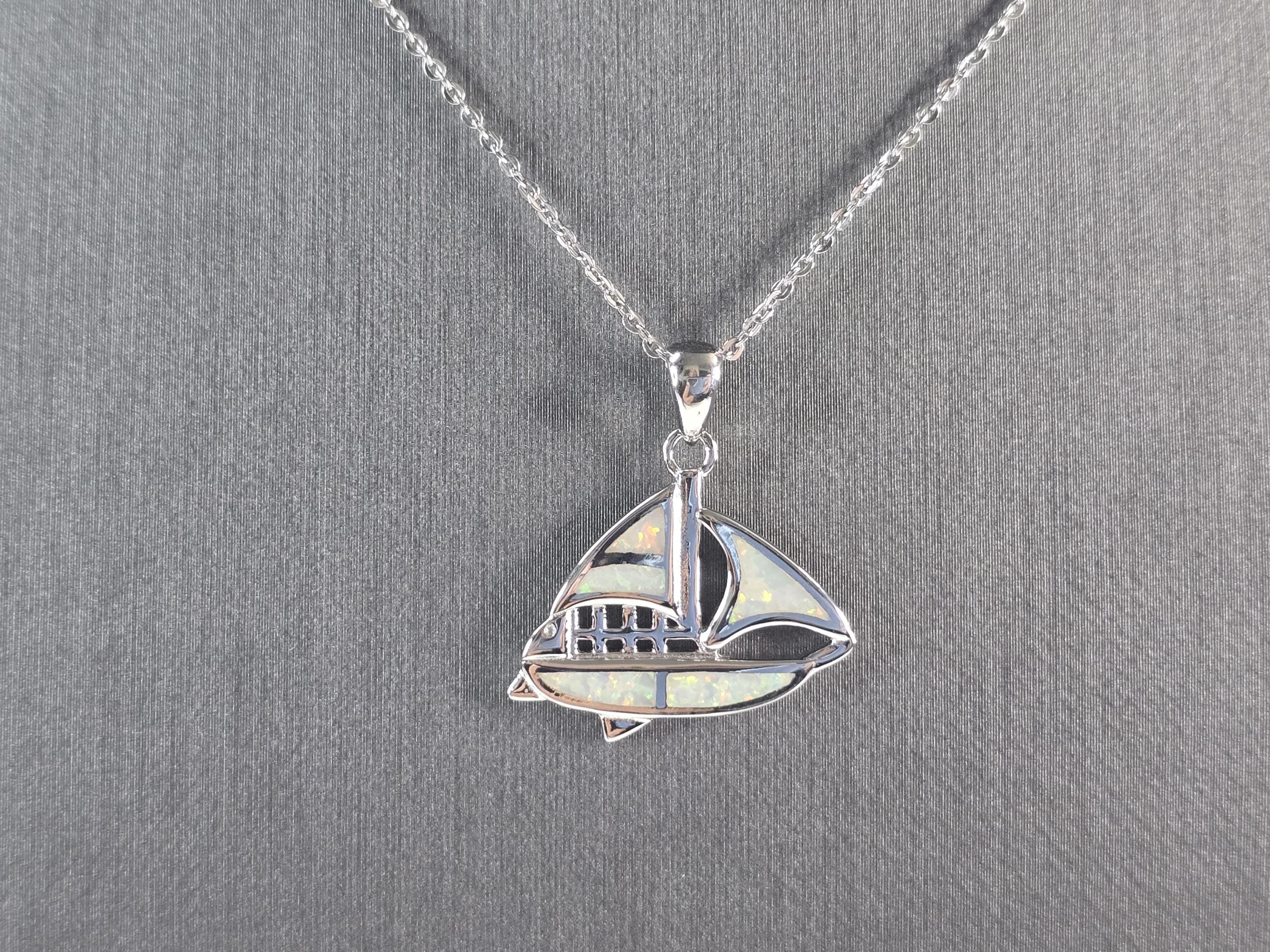 A WOMENS STERLING SILVER OPAL SAIL BOAT PENDANT WITH NECKLACE. THE PENDANT WITH NECKLACE WEIGHS 5.0g. THE PENDANT MEASURES 7/8" LONG BY 7/8" WIDE, AND THE NECKLACE MEASURES 18" LONG, ADJUSTABLE TO 16". NOT SURE IF STONES ARE REAL OR MAN MADE. MAKES A GREAT GIFT FOR THAT SOMEONE SPECIAL. ANY QUESTIONS, PLEASE ASK. BE SURE TO CHECK OUT OUR OTHER ITEMS FOR SALE.