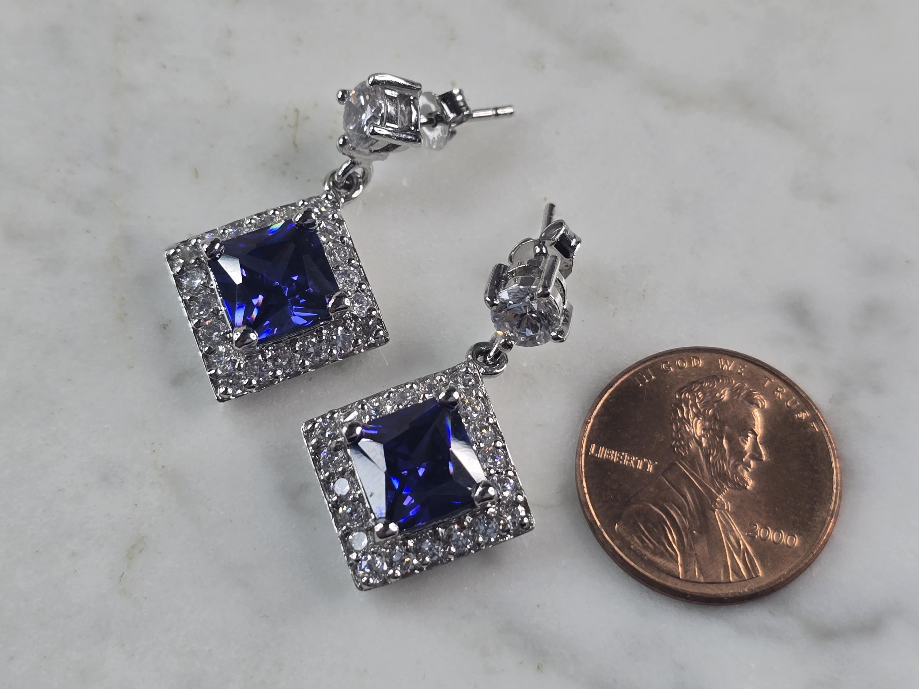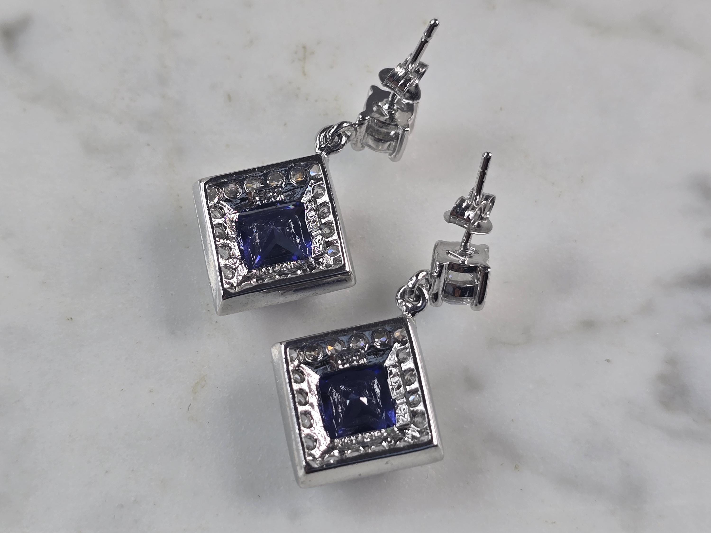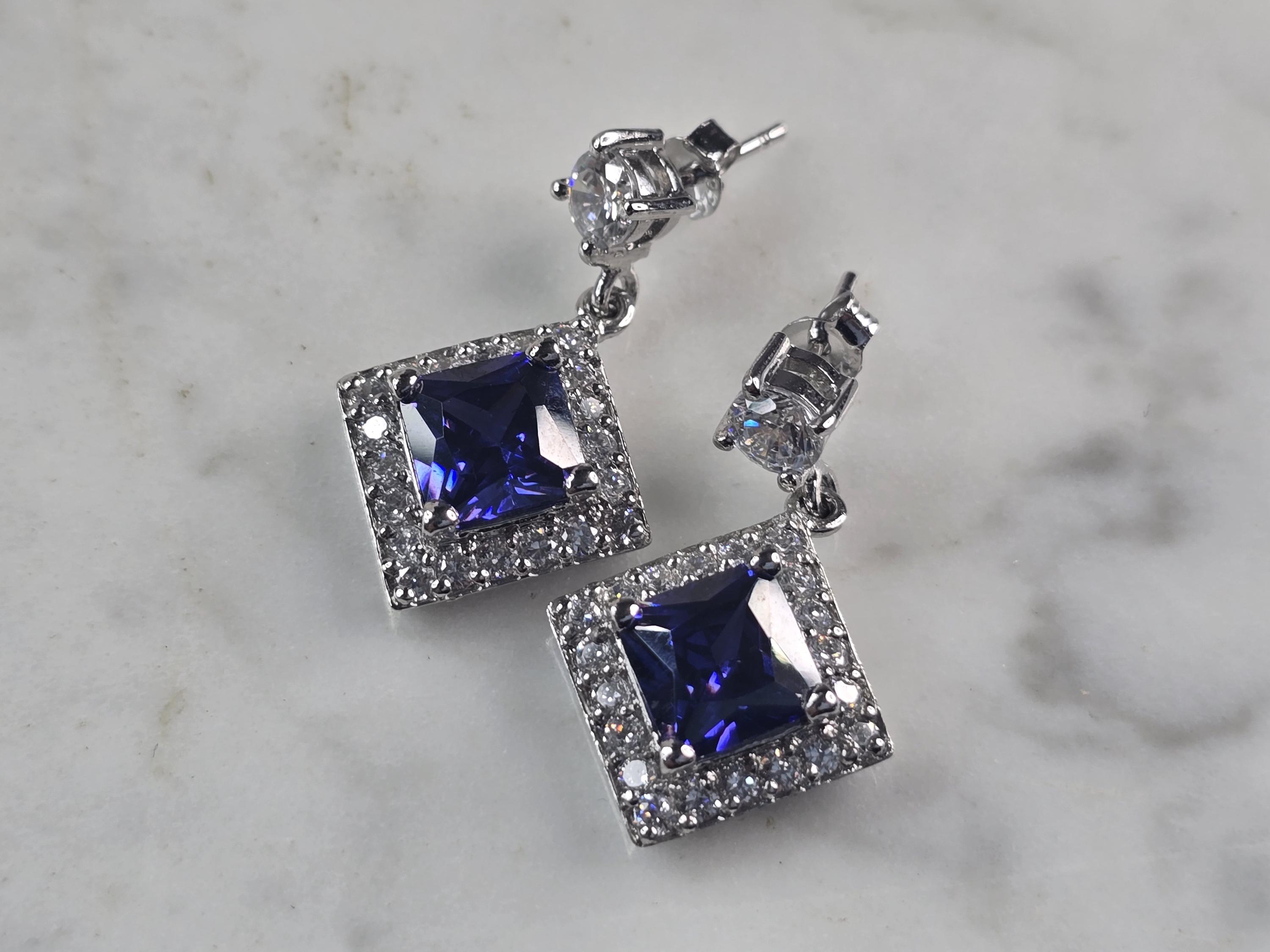 A PAIR OF WOMENS STERLING SILVER TANZANITE COLORED CZ EARRINGS THAT WEIGH 8.0g AND MEASURE 1 1/8" LONG BY 3/4" WIDE. NOT SURE IF STONES ARE NATURAL OR MAN MADE. ANY QUESTIONS, PLEASE DO NOT HESITATE TO ASK. BE SURE TO CHECK OUT SOME OF MY OTHER GREAT ITEMS UP FOR SALE. THANK YOU