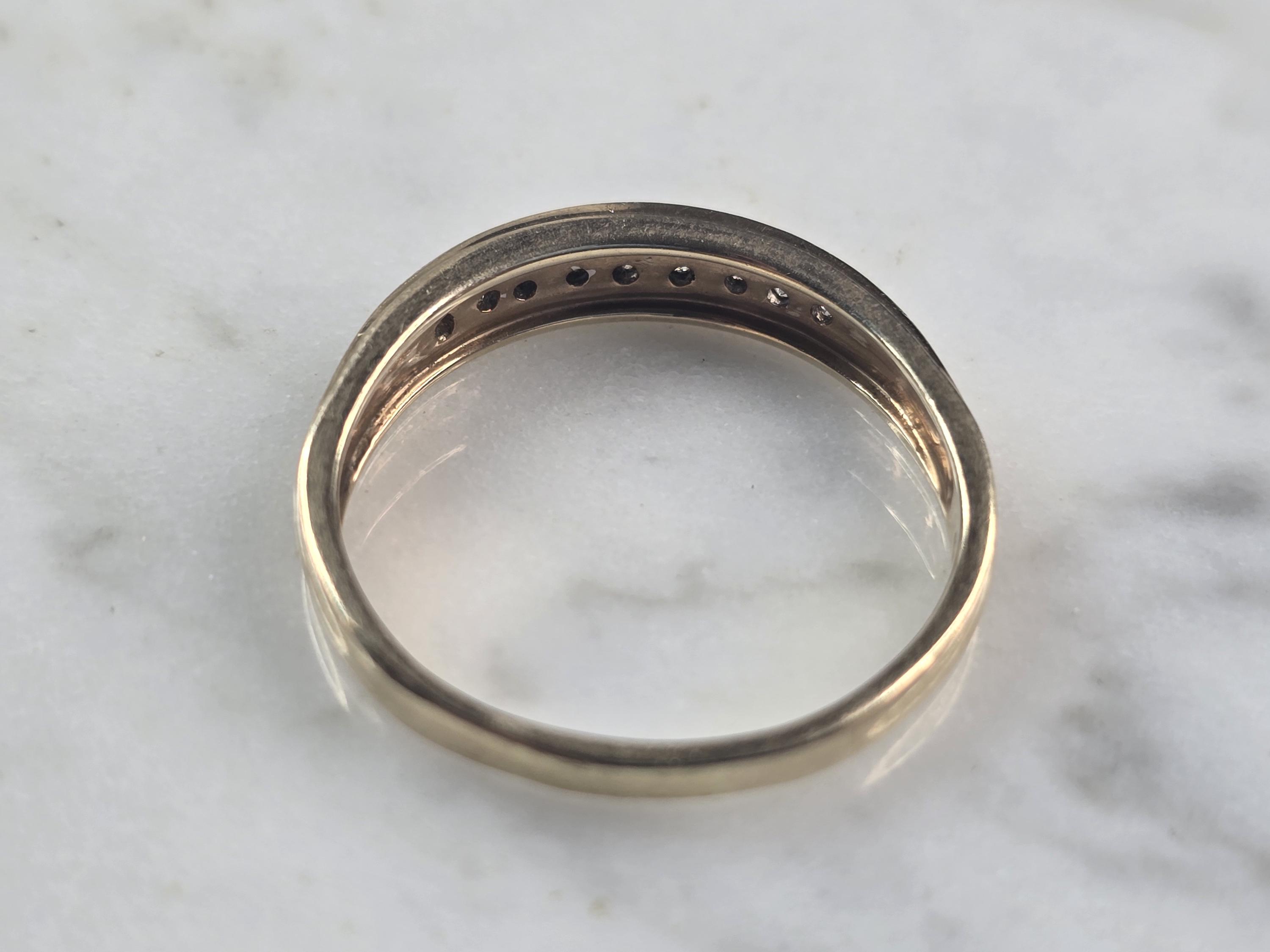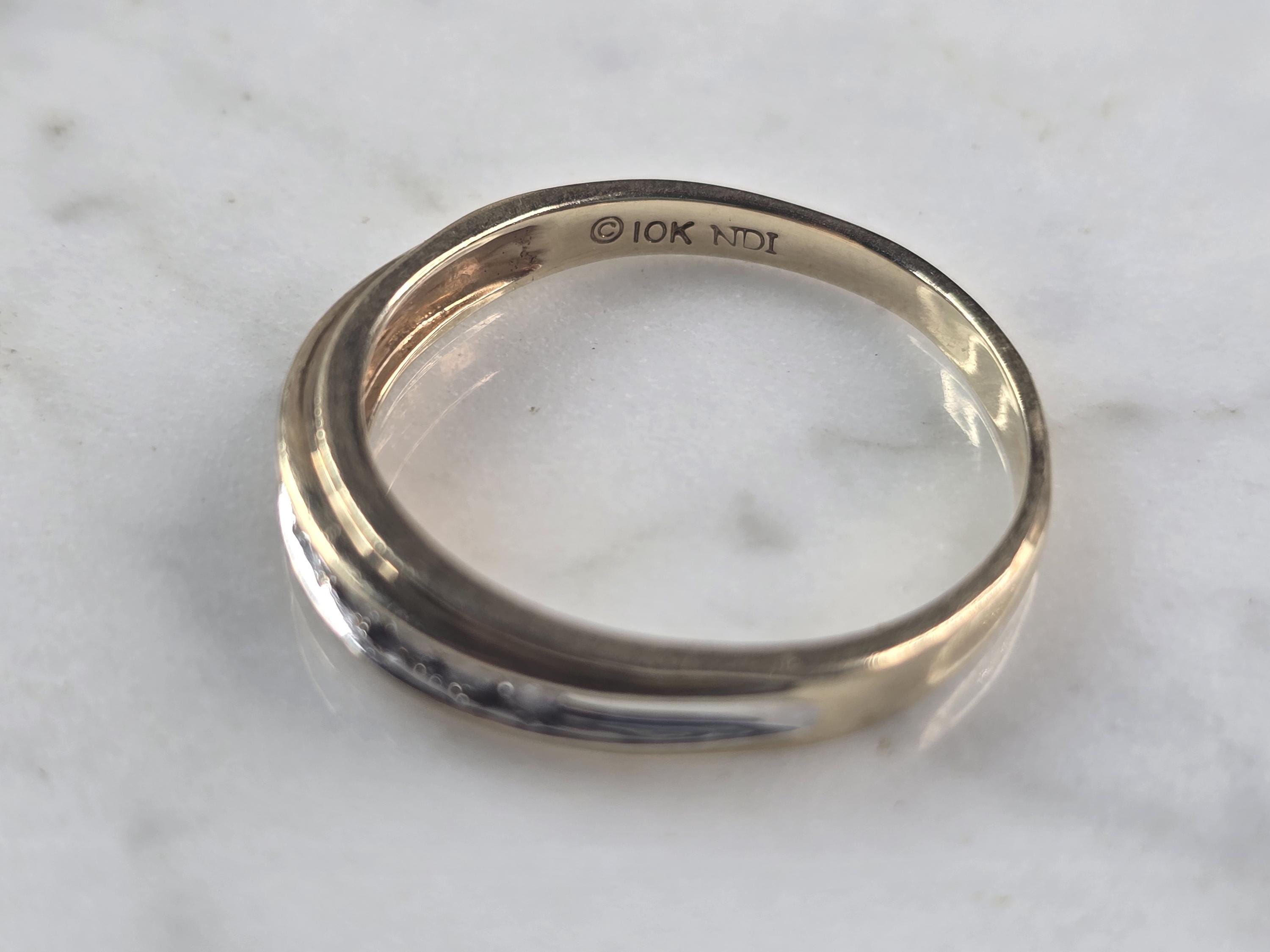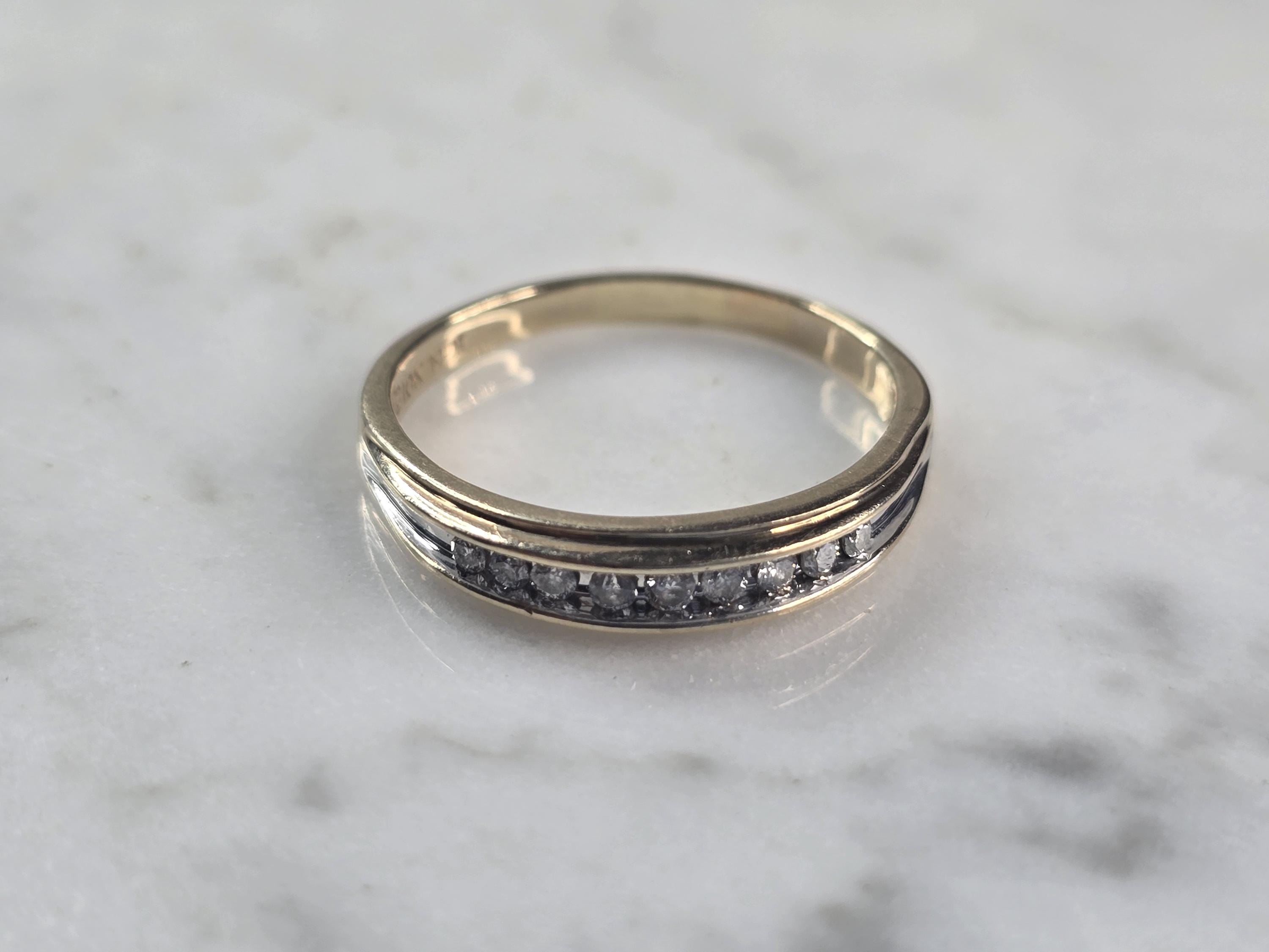 A WOMENS VINTAGE ESTATE 10K YELLOW GOLD DIAMOND RING. THE RING WEIGHS 2.6g, AND IS A SIZE 8.75. THE WIDTH OF THE RING IS 1/8". THE RING HAS 9 TINY DIAMONDS IN IT. RING IS MARKED ON THE INSIDE OF THE BAND. ANY QUESTIONS PLEASE DO NOT HESITATE TO ASK. BE SURE TO CHECK OUT SOME OF MY OTHER GREAT ITEMS UP FOR SALE. THANK YOU.
