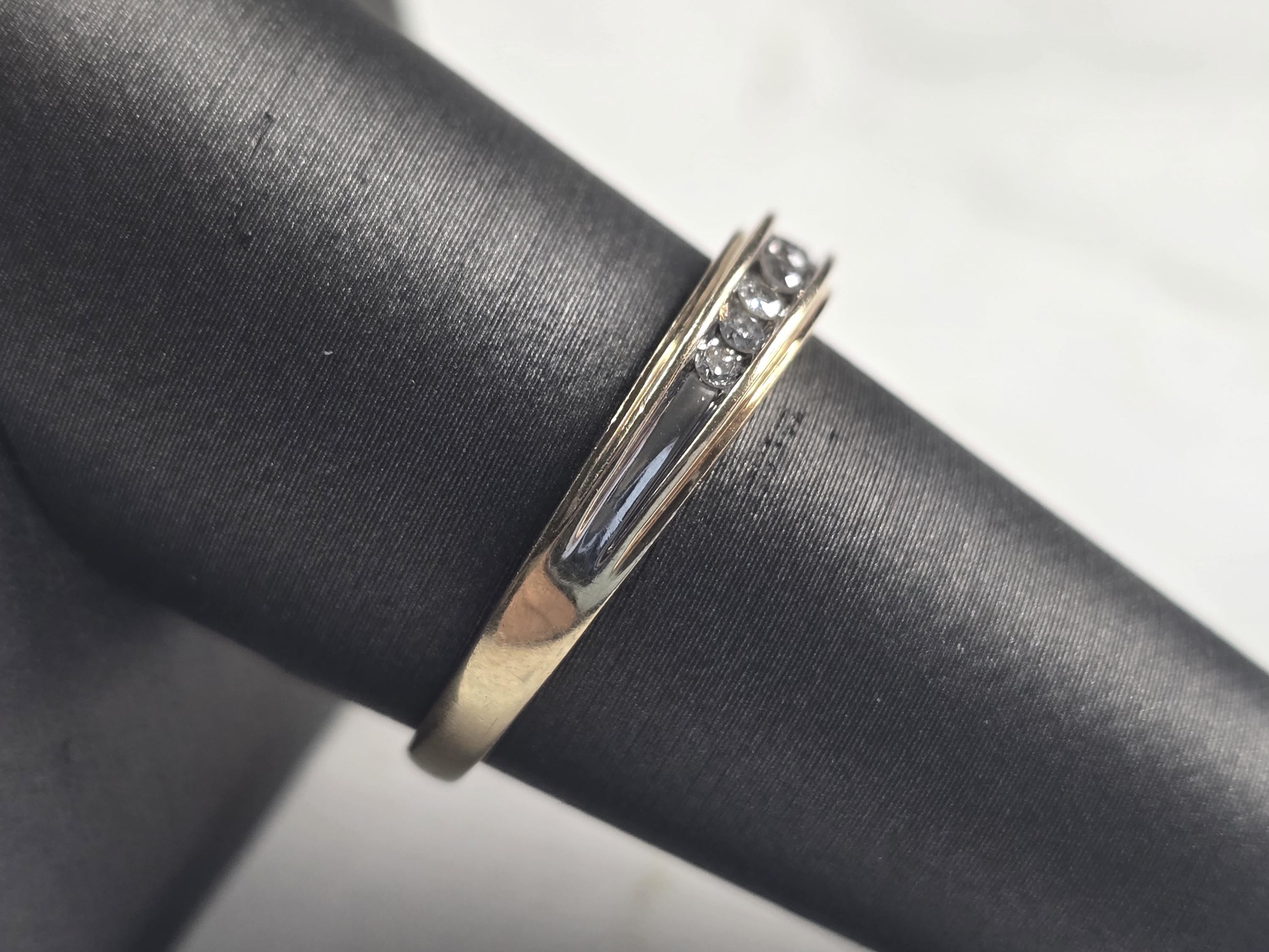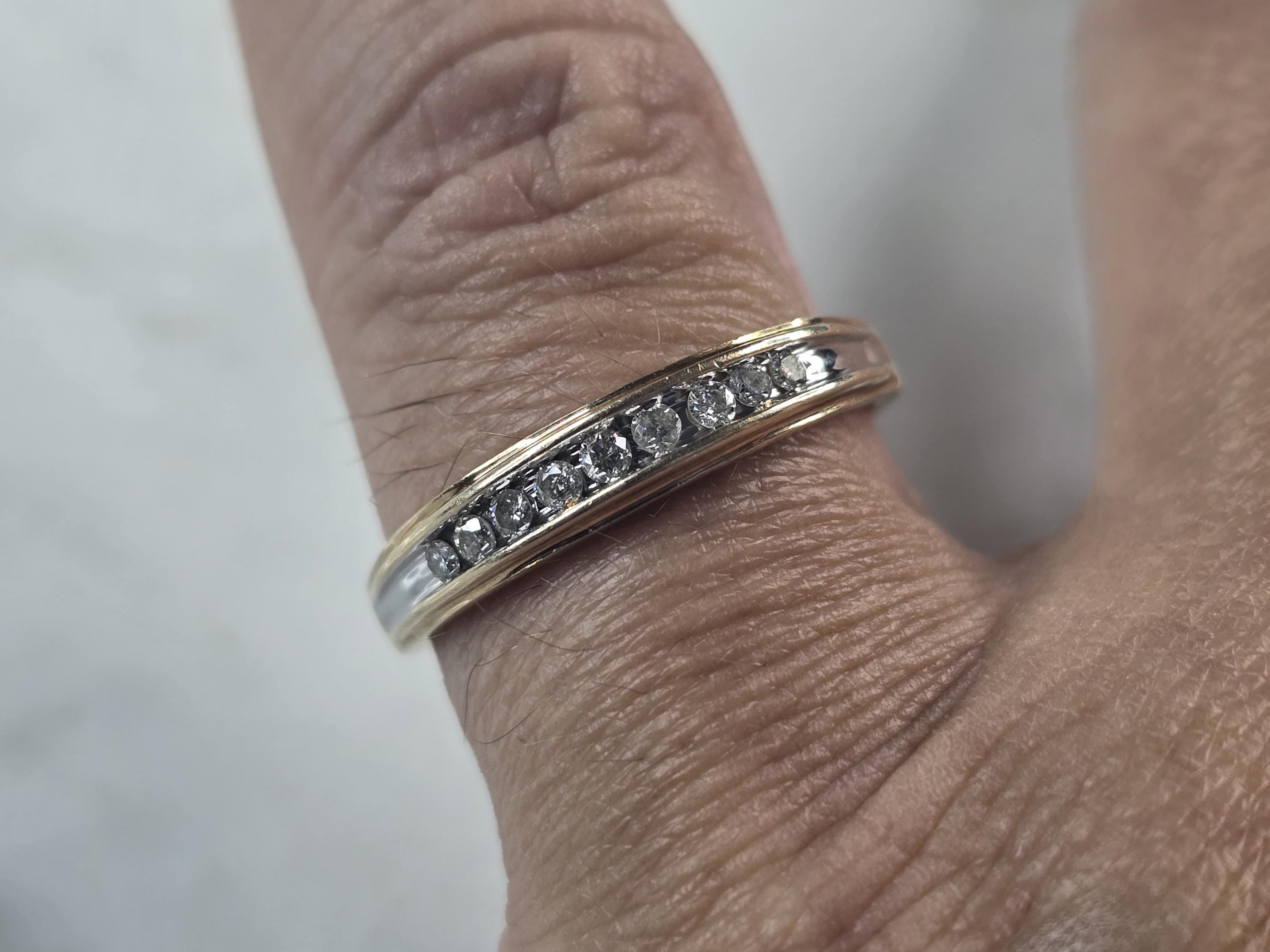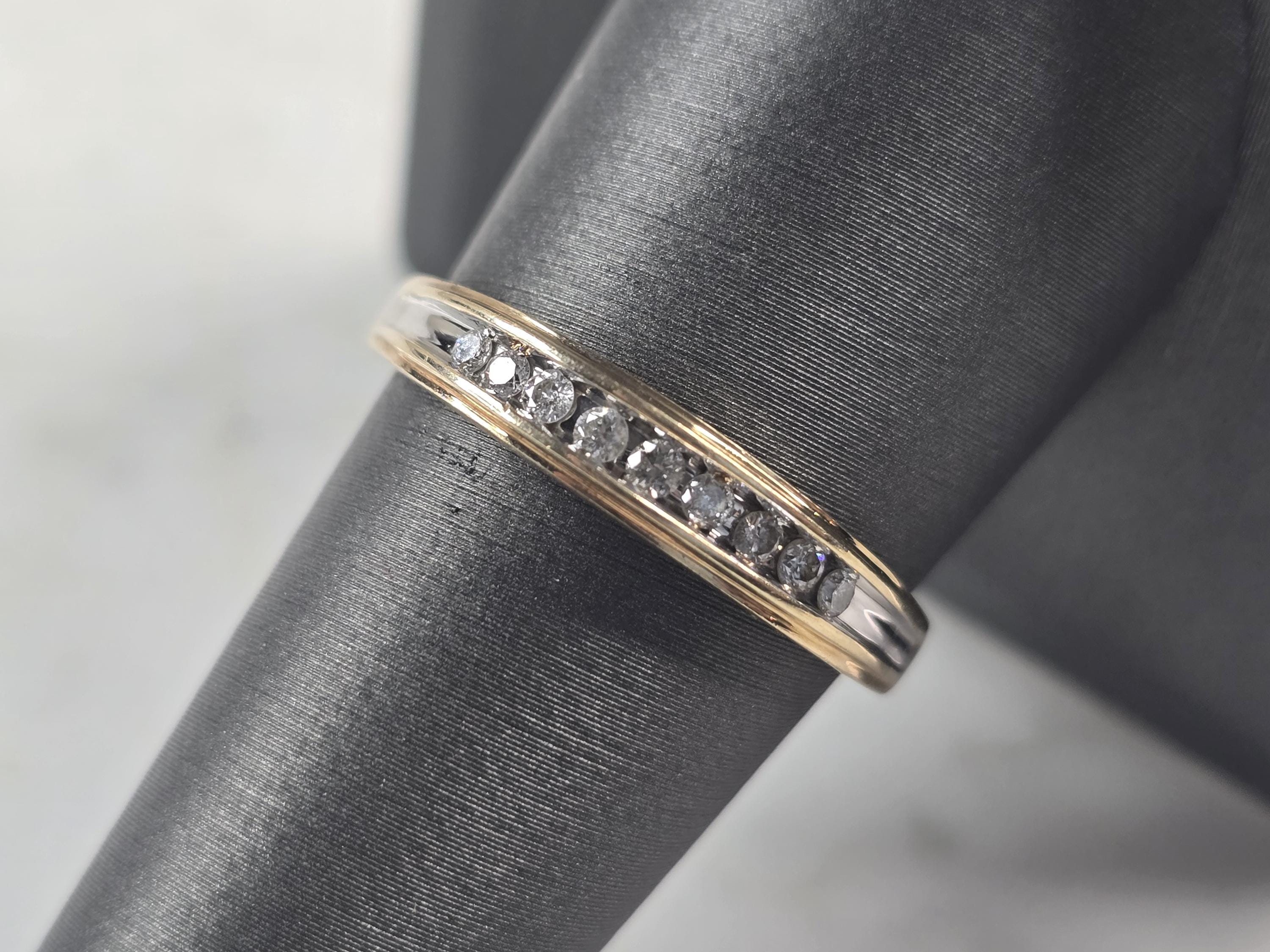 A WOMENS VINTAGE ESTATE 10K YELLOW GOLD DIAMOND RING. THE RING WEIGHS 2.6g, AND IS A SIZE 8.75. THE WIDTH OF THE RING IS 1/8". THE RING HAS 9 TINY DIAMONDS IN IT. RING IS MARKED ON THE INSIDE OF THE BAND. ANY QUESTIONS PLEASE DO NOT HESITATE TO ASK. BE SURE TO CHECK OUT SOME OF MY OTHER GREAT ITEMS UP FOR SALE. THANK YOU.