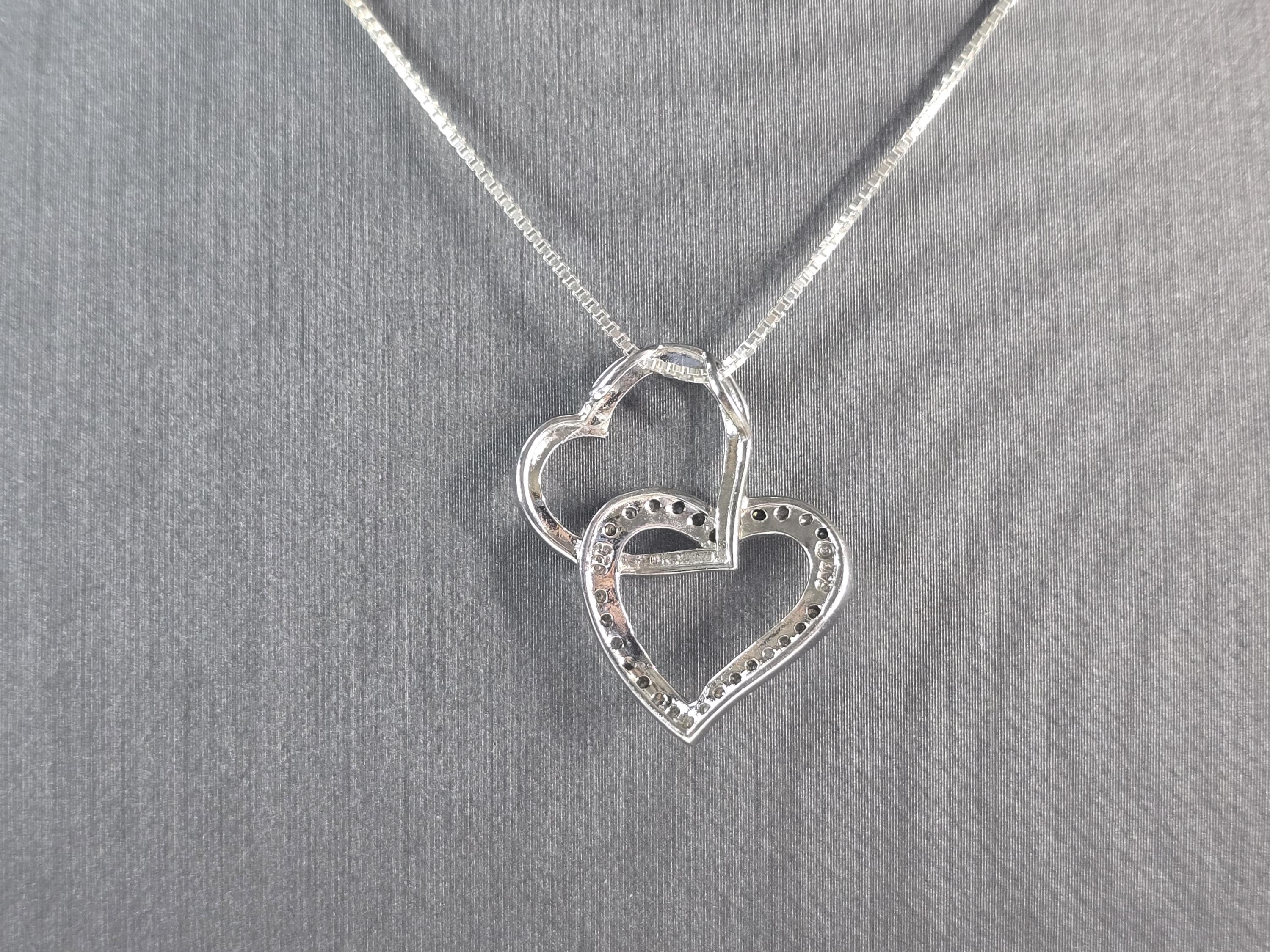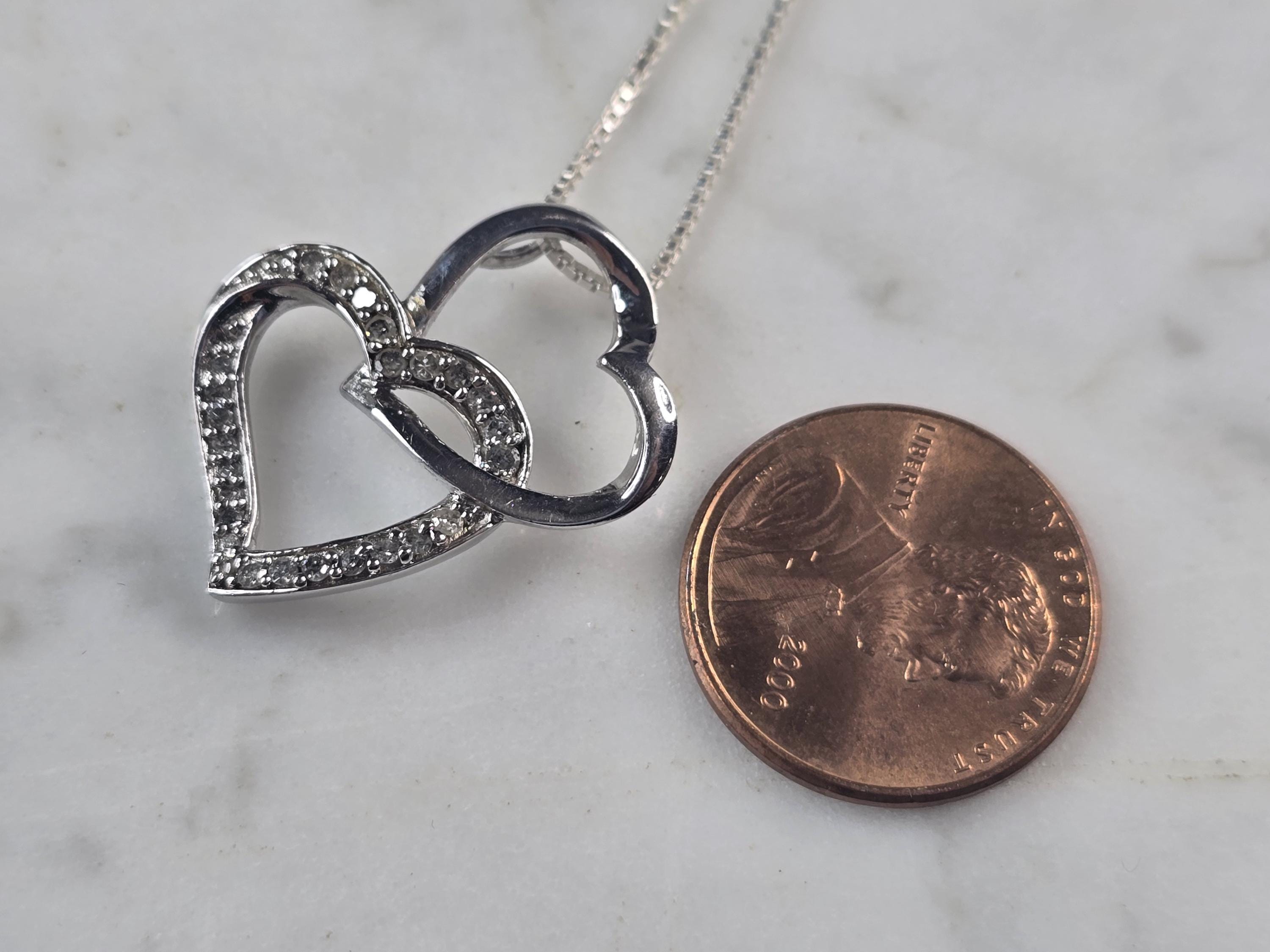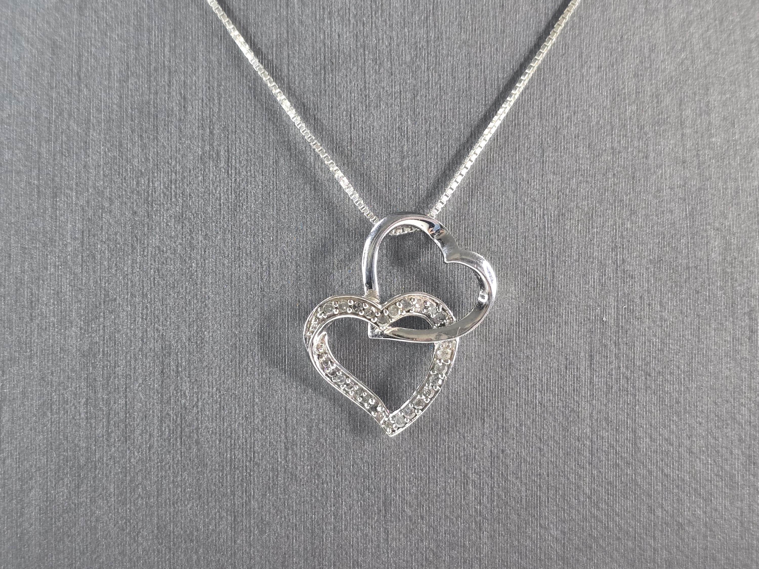 A WOMEN'S VINTAGE ESTATE STERLING SILVER DIAMOND HEART PENDANT WITH NECKLACE. THE TOTAL WEIGHT IS 3.6g. THE NECKLACE MEASURES 18 1/4" LONG AND THE PENDANT MEASURES 1" BY 7/8". THERE ARE 27 TINY DIAMONDS IN THIS PENDANT. MAKES A GREAT GIFT FOR THAT SPECIAL SOMEONE.