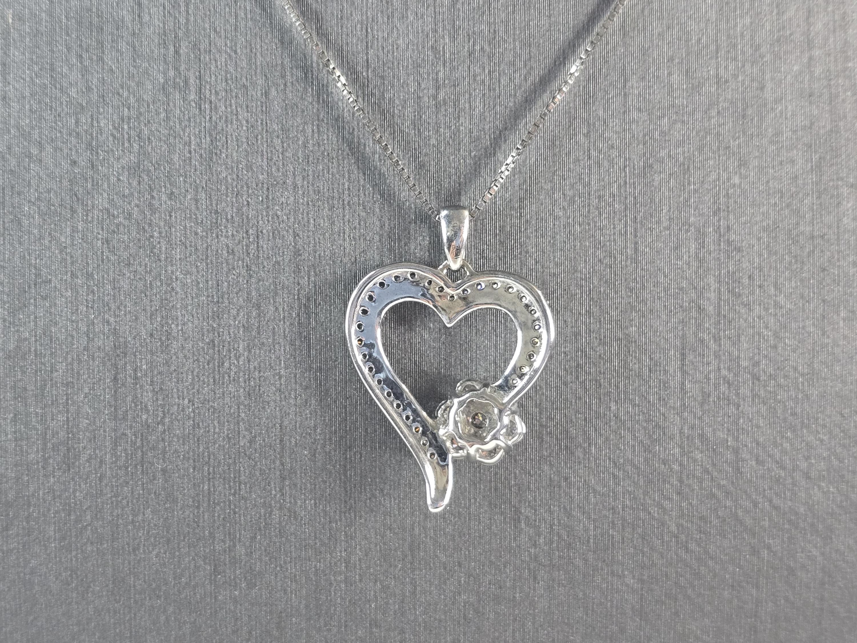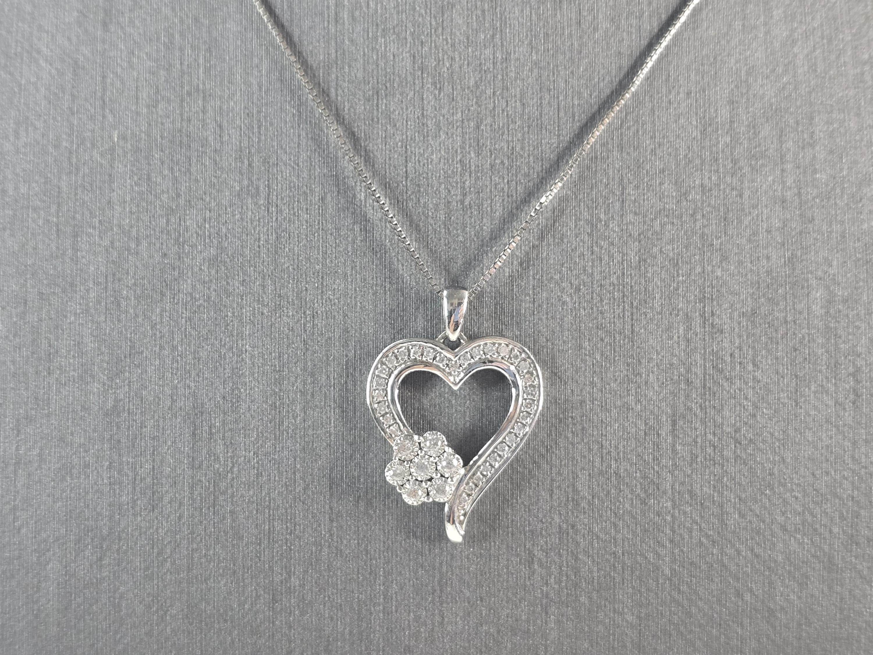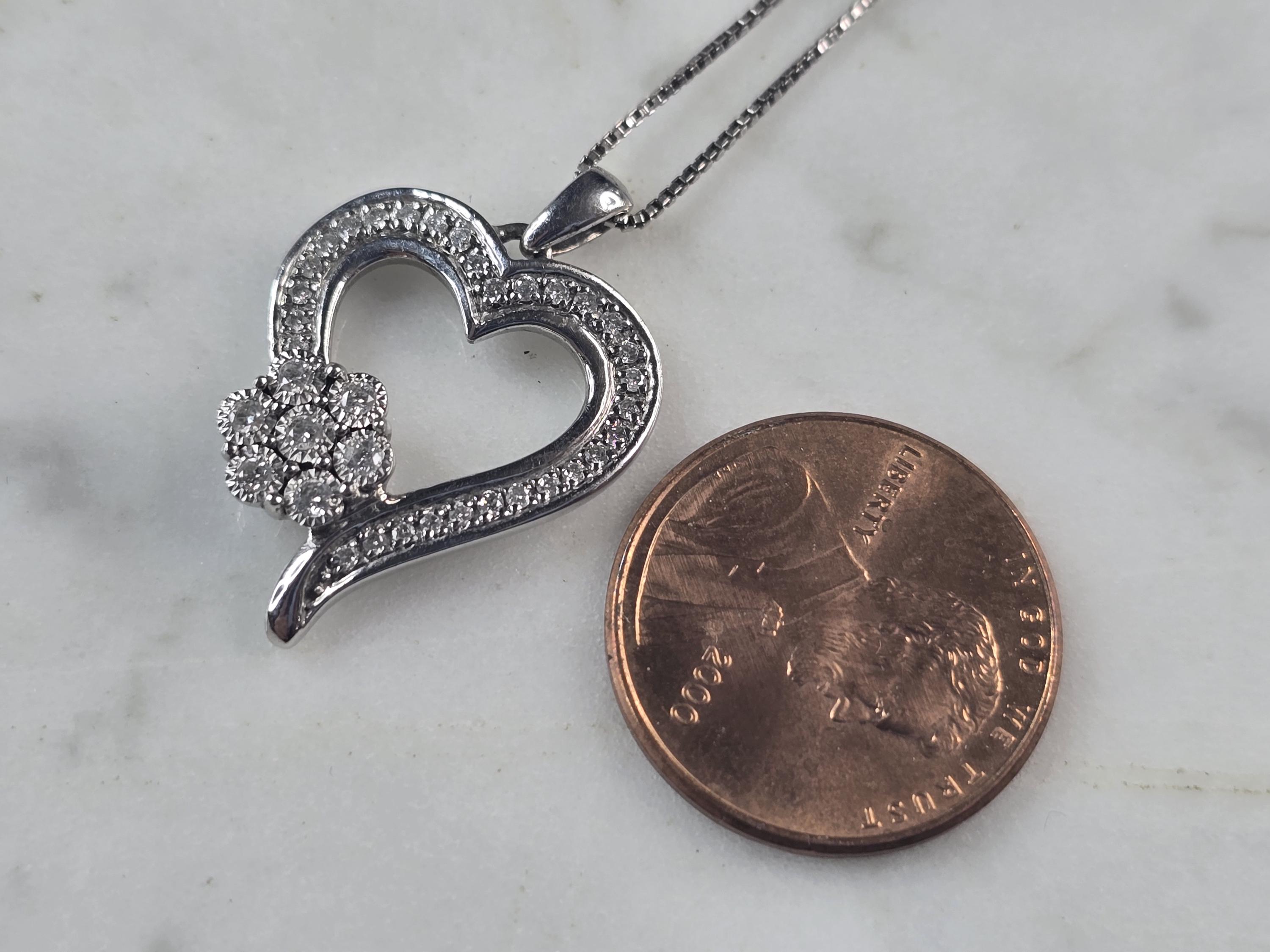 A WOMEN'S VINTAGE ESTATE STERLING SILVER DIAMOND HEART PENDANT WITH NECKLACE. THE TOTAL WEIGHT IS 3.6g. THE NECKLACE MEASURES 18 1/2" LONG AND THE PENDANT MEASURES 1" BY 3/4". THERE ARE ABOUT 0.53cts OF DIAMONDS. MAKES A GREAT GIFT FOR THAT SPECIAL SOMEONE.