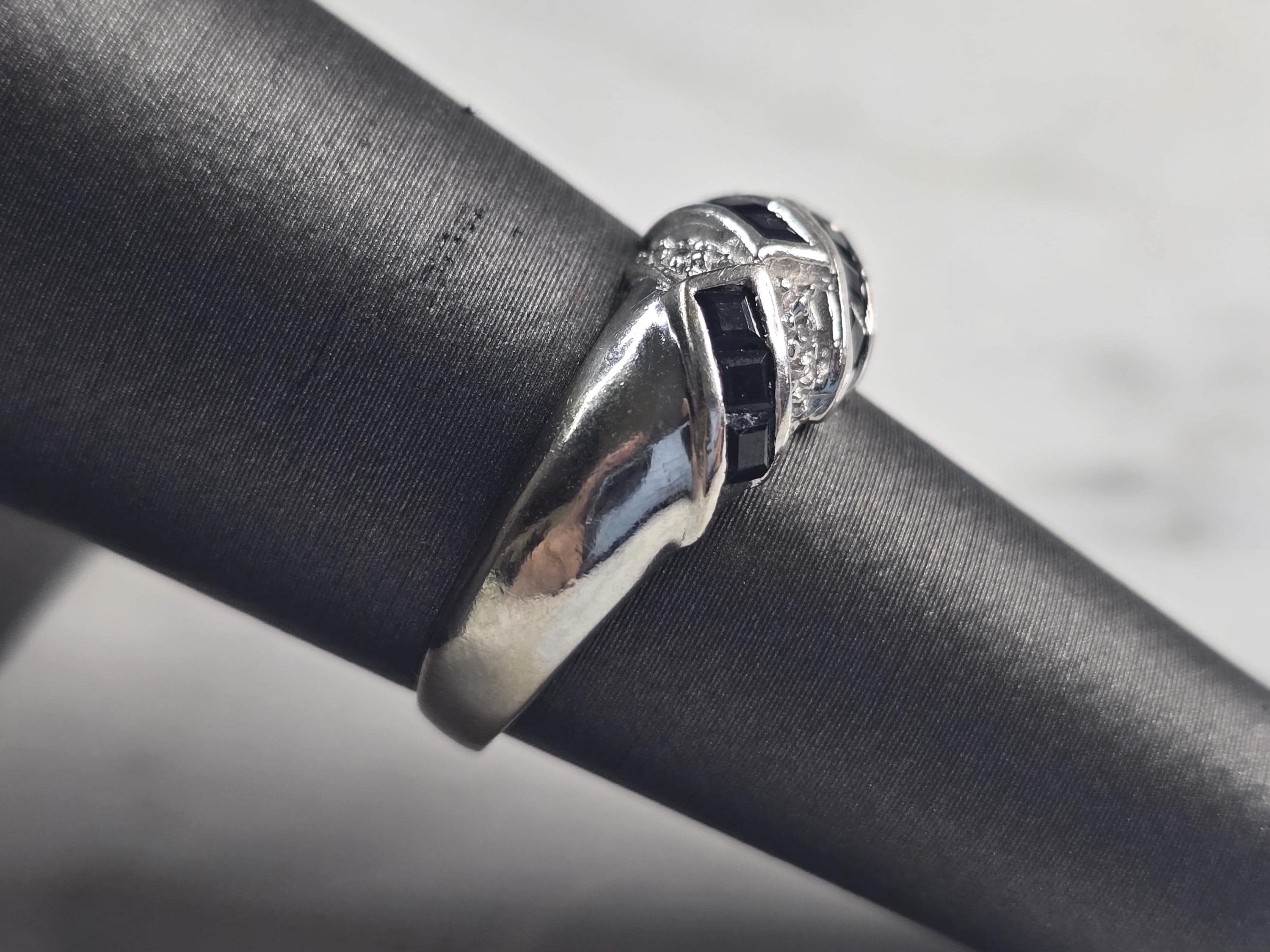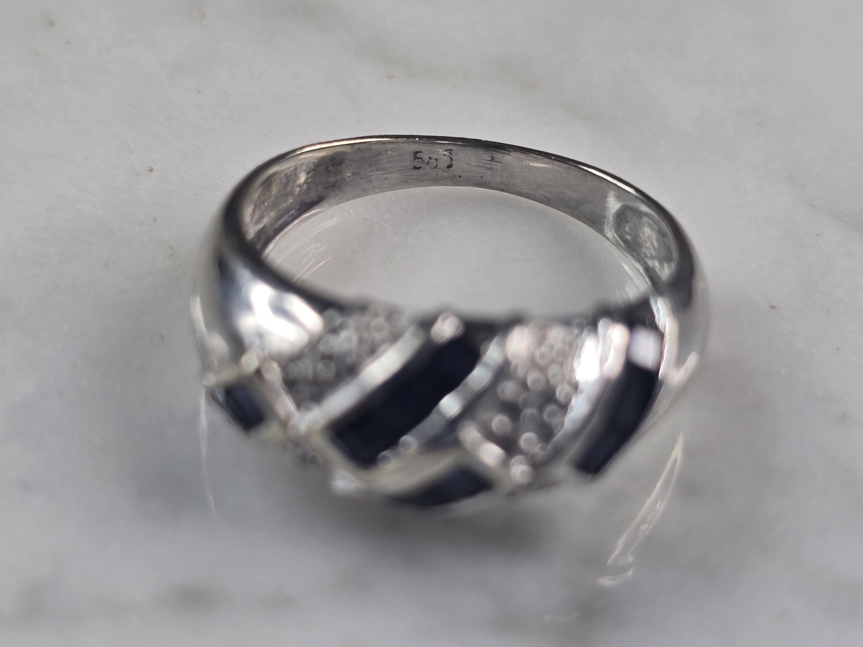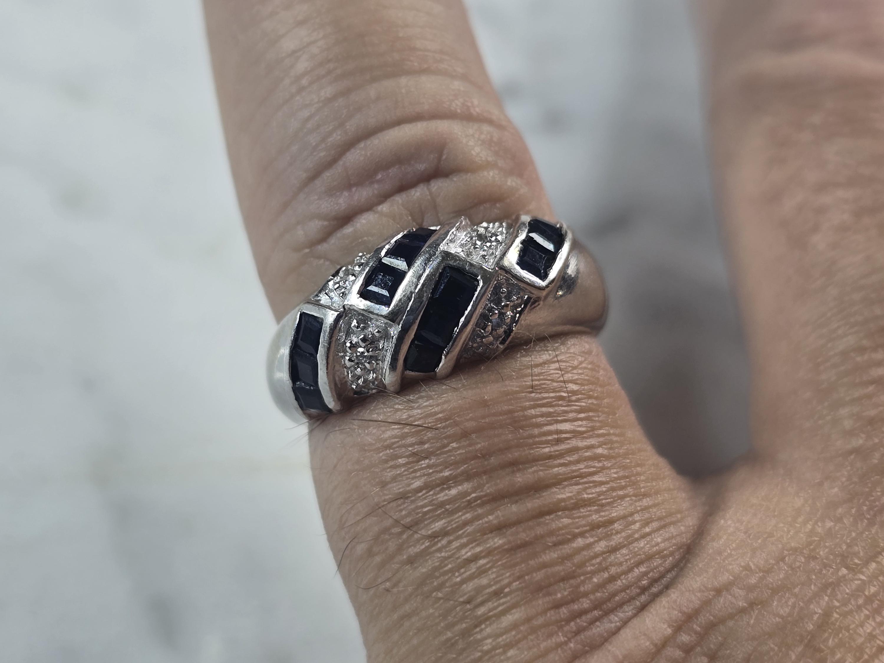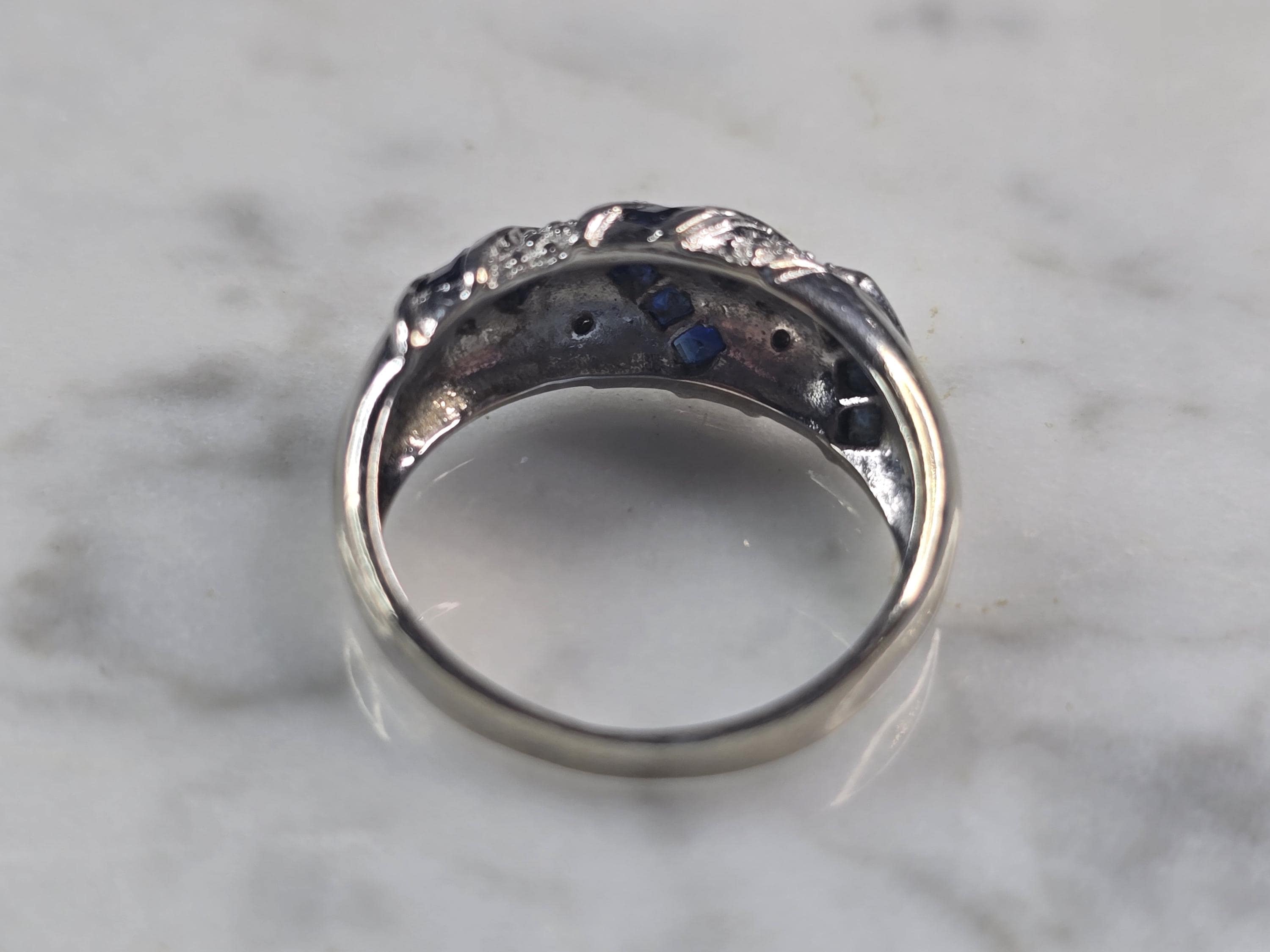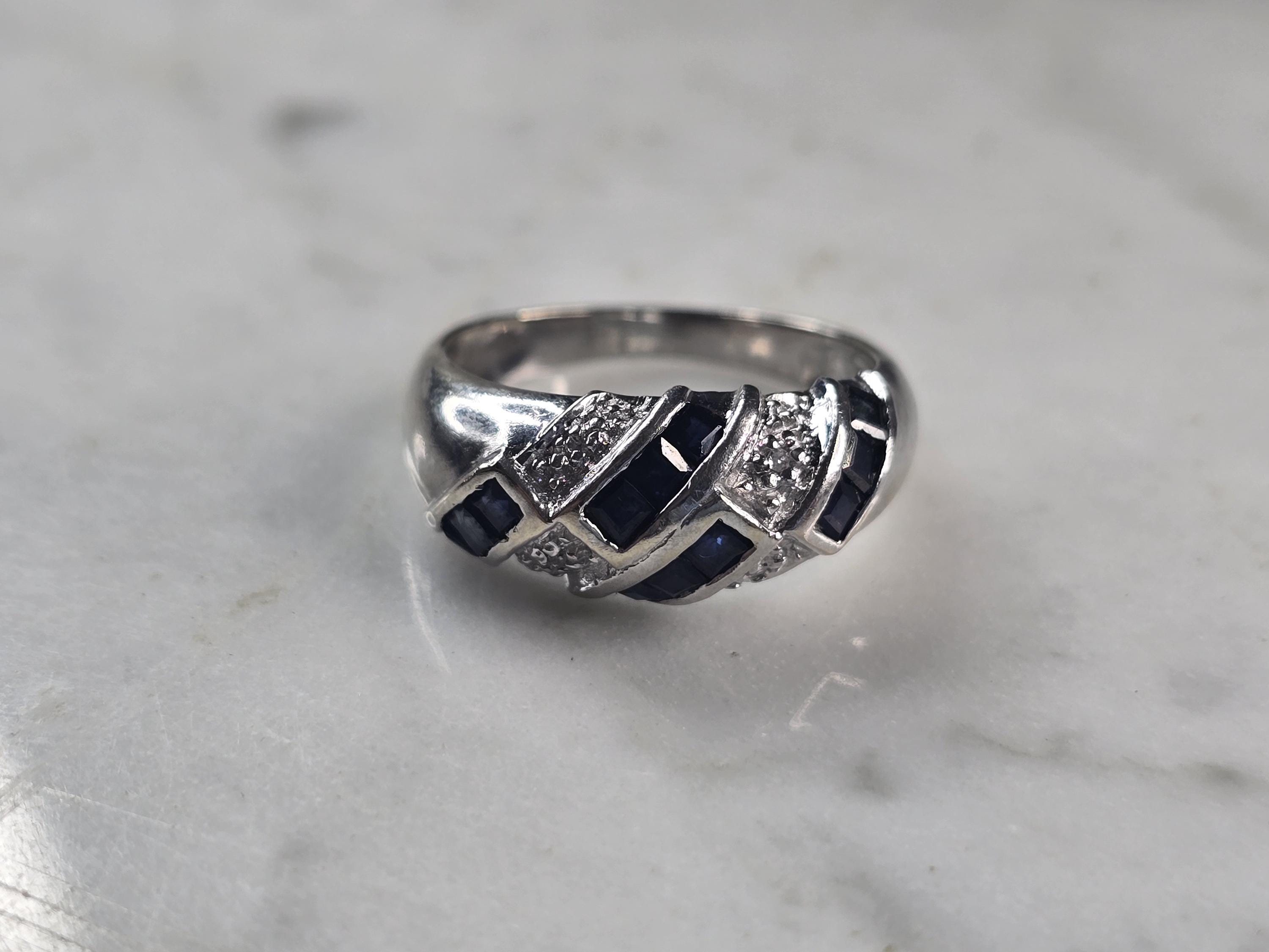 A WOMENS VINTAGE ESTATE 14K WHITE GOLD SAPPHIRE AND DIAMOND RING. THE RING WEIGHS 3.8g. THE SIZE OF THE RING IS A 6.25. THE WIDTH OF THE RING 3/8". THERE ARE 12 SAPPHIRES AND 4 DIAMONDS. ANY QUESTIONS PLEASE DO NOT HESITATE TO ASK. BE SURE TO CHECK OUT SOME OF MY OTHER GREAT ITEMS UP FOR SALE. THANK YOU.
