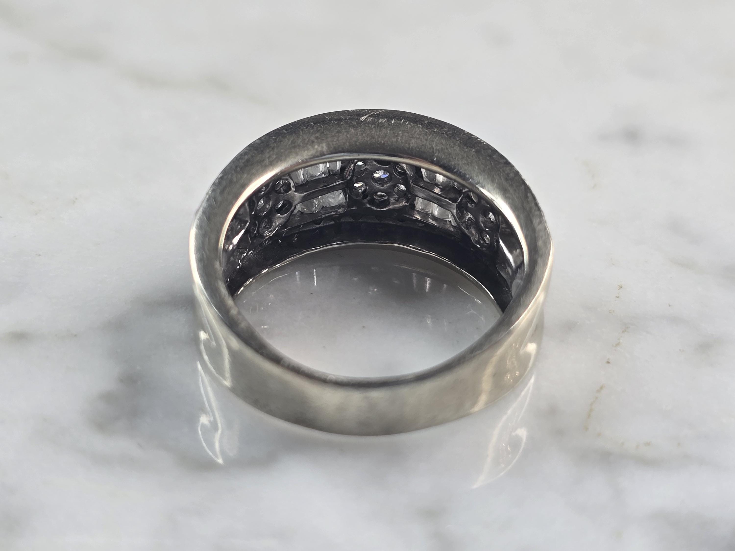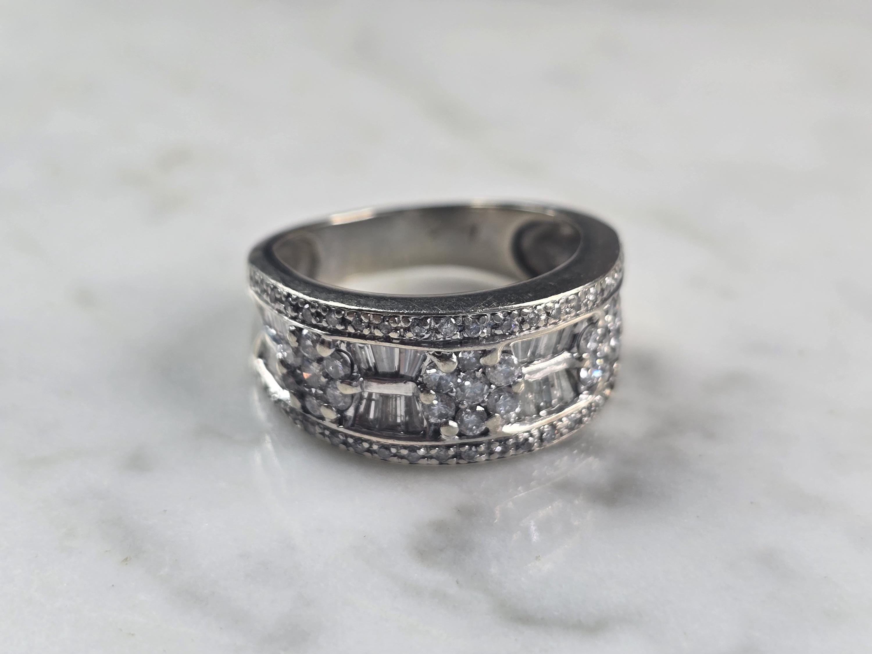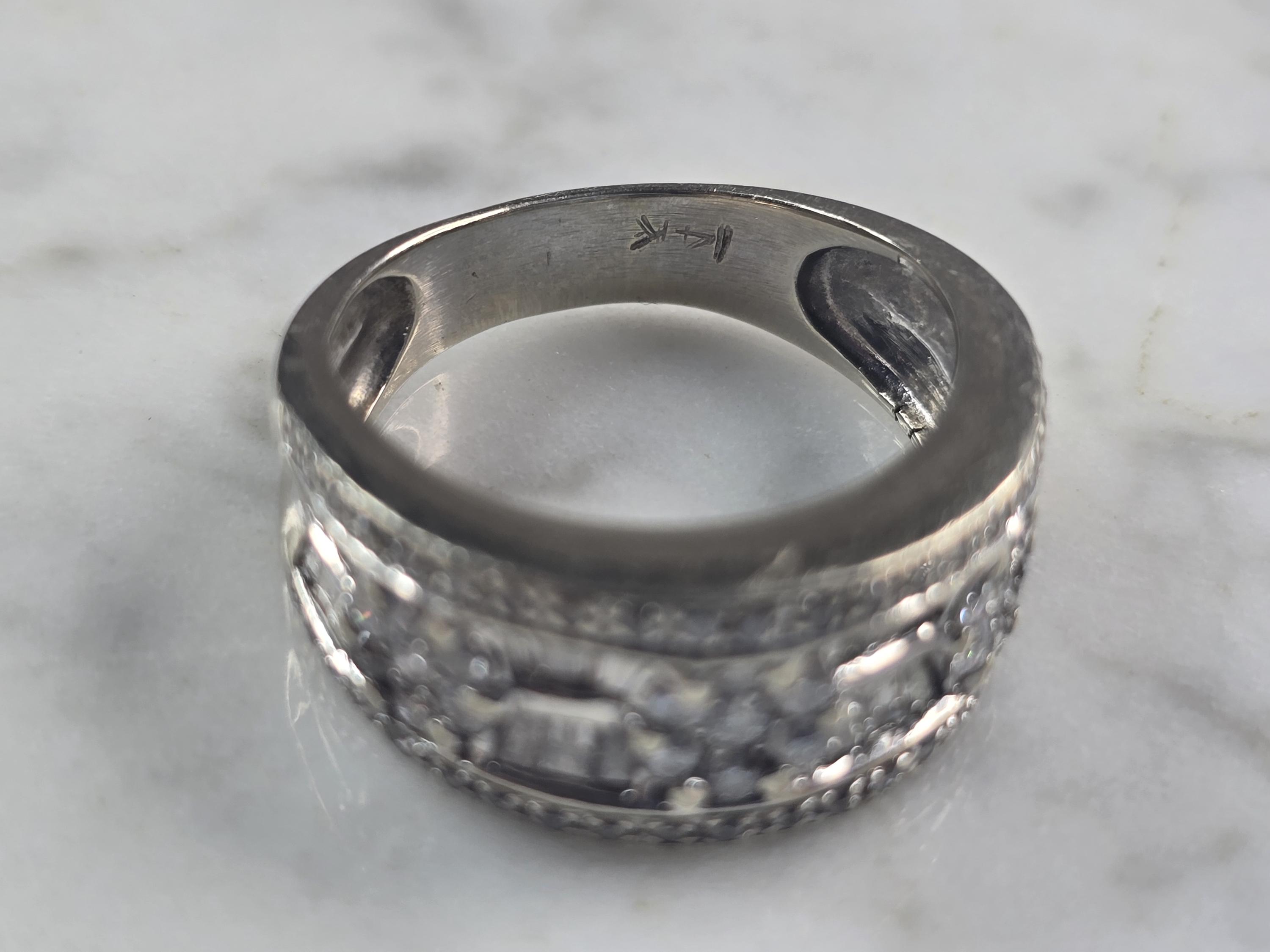 A WOMENS VINTAGE ESTATE 14K WHITE GOLD DIAMOND RING WITH ABOUT 1.73cts OF DIAMONDS IN IT. THE RING WEIGHS 6.1g. THE SIZE OF THE RING IS A 7.0. THE WIDTH OF THE RING IS 3/8". THERE IS ONE DIAMOND MISSING. BUYING AS IS. THIS MAKES A LOVELY GIFT FOR THAT SOMEONE SPECIAL. ANY QUESTIONS PLEASE, DO NOT HESITATE TO ASK. BE SURE TO CHECK OUT SOME OF MY OTHER GREAT ITEMS UP FOR SALE. THANK YOU.
