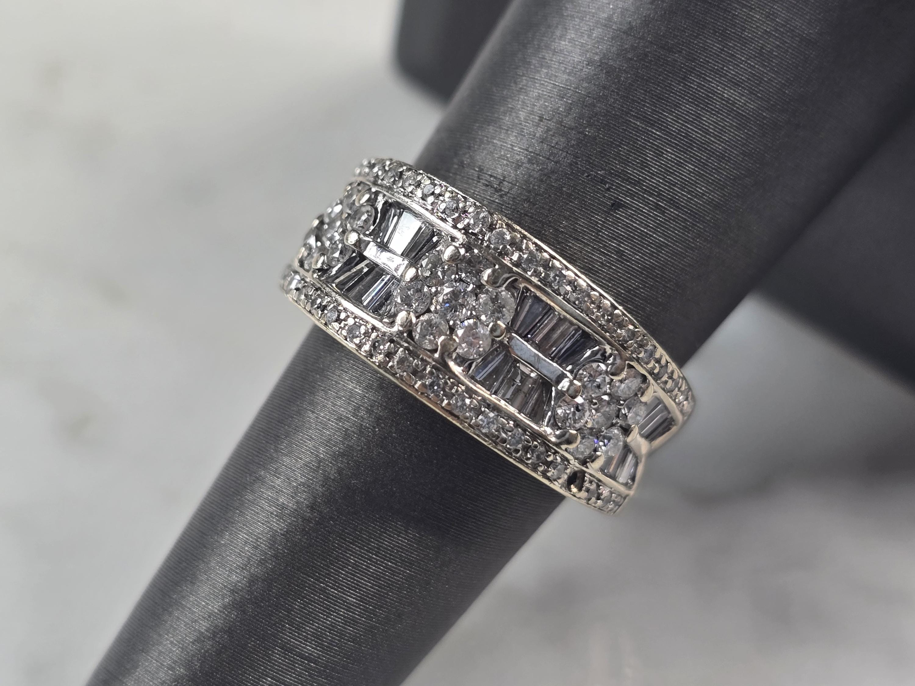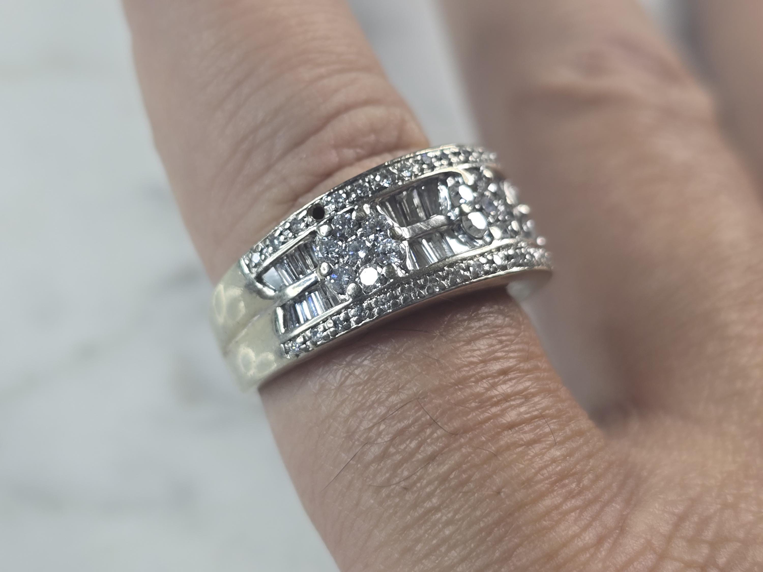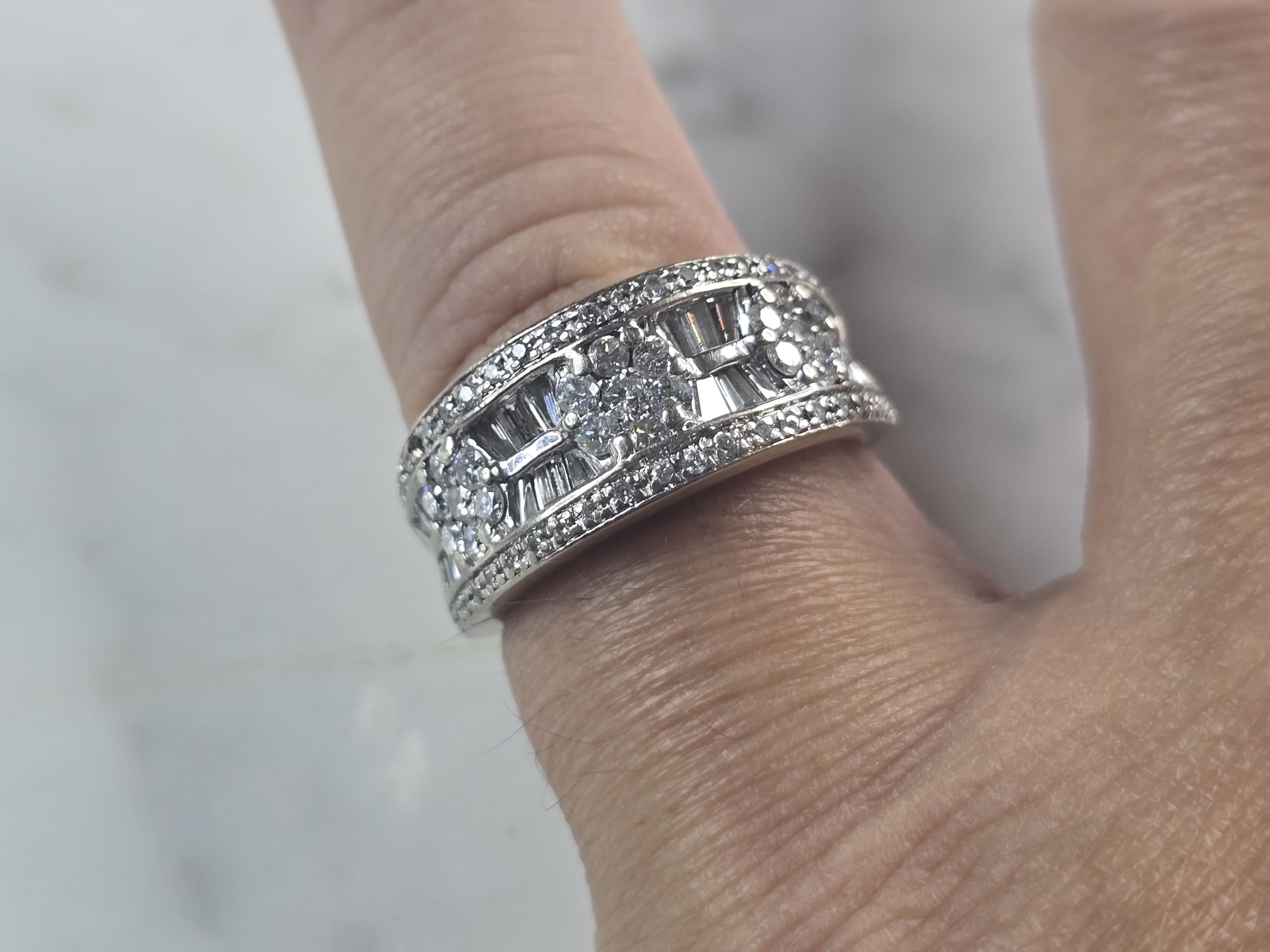 A WOMENS VINTAGE ESTATE 14K WHITE GOLD DIAMOND RING WITH ABOUT 1.73cts OF DIAMONDS IN IT. THE RING WEIGHS 6.1g. THE SIZE OF THE RING IS A 7.0. THE WIDTH OF THE RING IS 3/8". THERE IS ONE DIAMOND MISSING. BUYING AS IS. THIS MAKES A LOVELY GIFT FOR THAT SOMEONE SPECIAL. ANY QUESTIONS PLEASE, DO NOT HESITATE TO ASK. BE SURE TO CHECK OUT SOME OF MY OTHER GREAT ITEMS UP FOR SALE. THANK YOU.