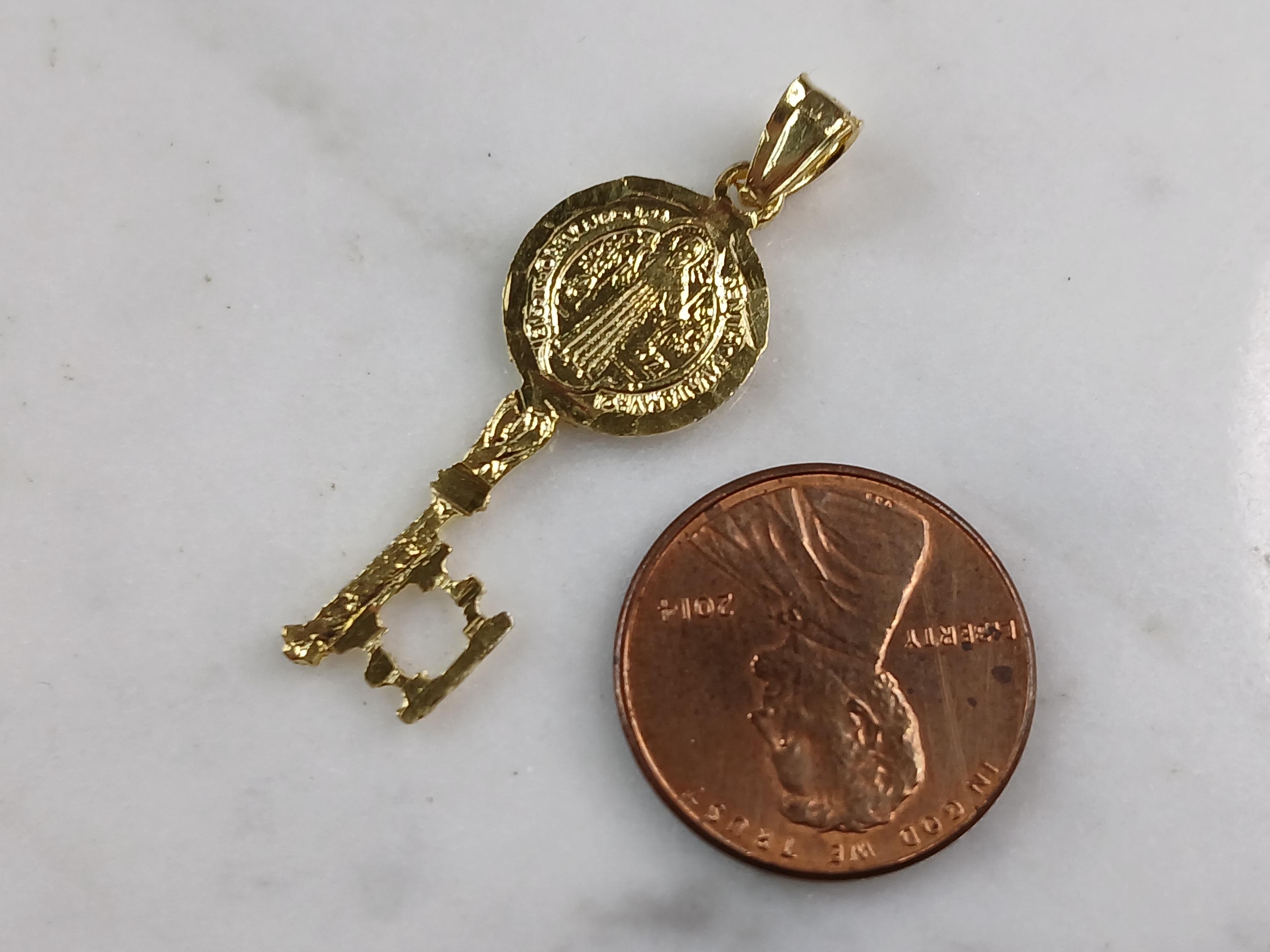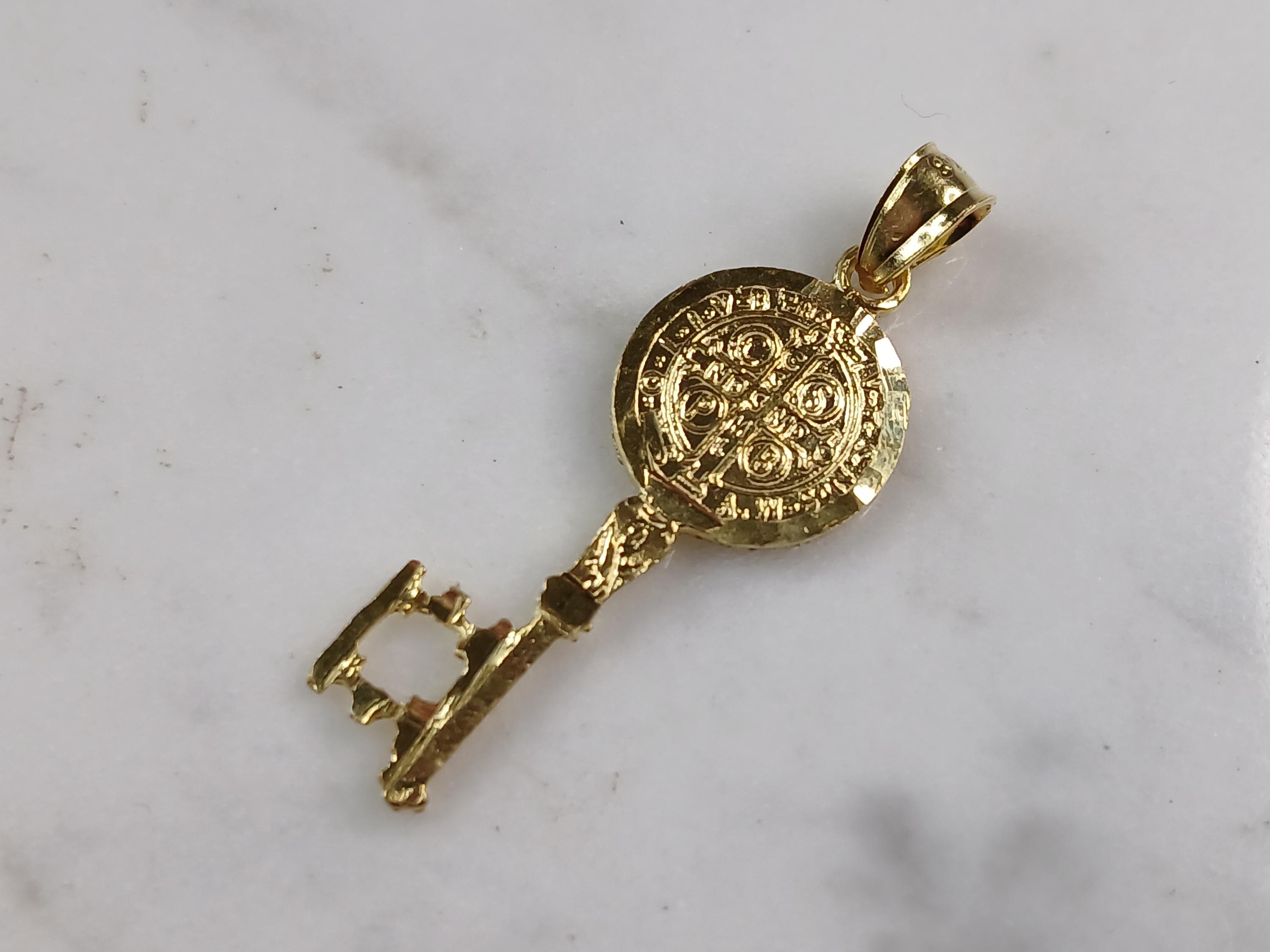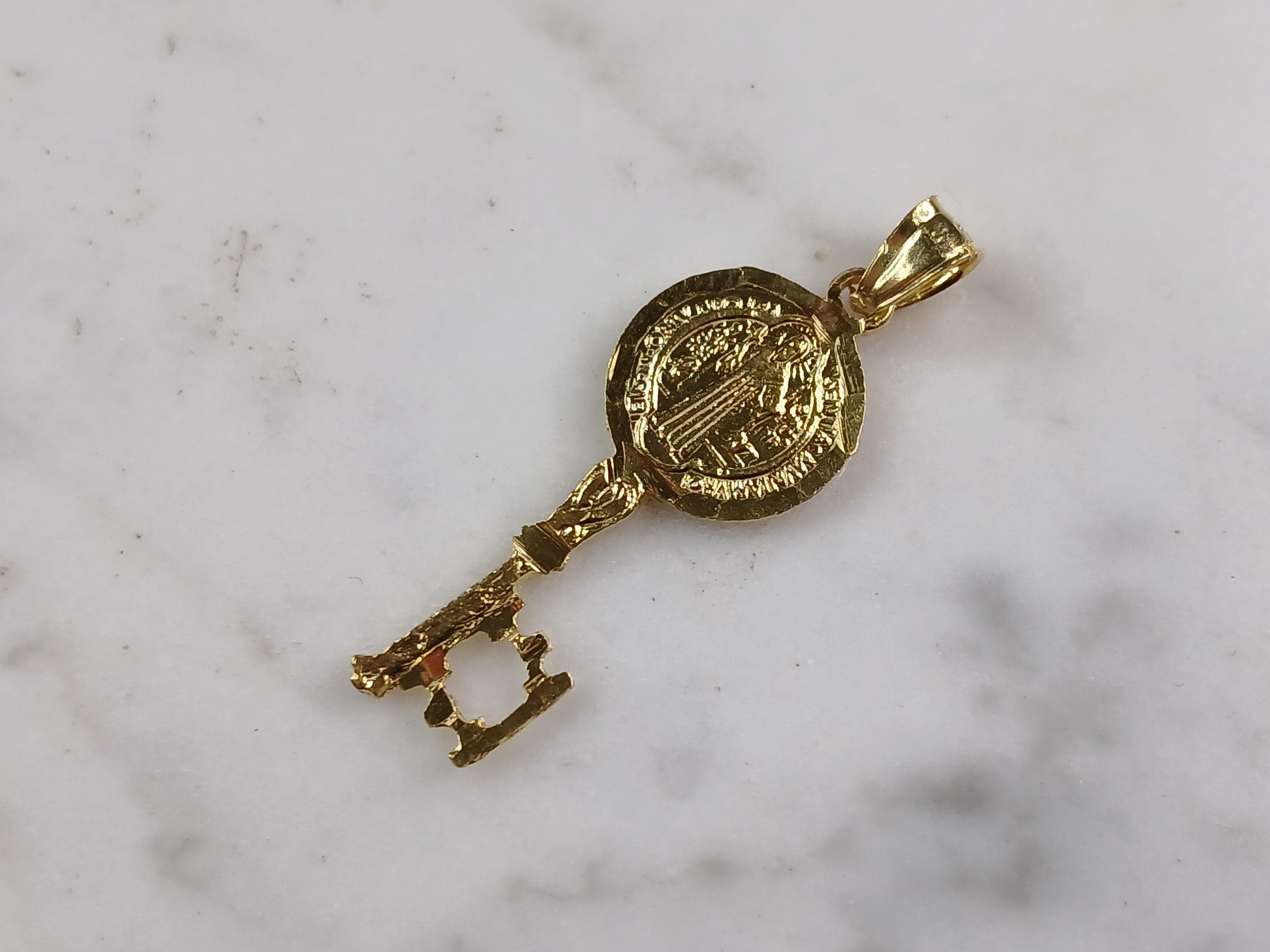 A WOMENS STERLING SILVER GOLD TONE RELGIOUS SAINT BENEDICT KEY PENDANT WITH NECKLACE . THE TOTAL WEIGHT IS 3.1g. THE PENDANT MEASURES 1 1/2" LONG BY 1/2" WIDE, AND THE NECKLACE MEASURES 18" LONG, AND IS ADJUSTABLE TO 16" LONG. MAKES A GREAT GIFT FOR THAT SPECIAL SOMEONE. ANY QUESTIONS, PLEASE DO NOT HESITATE TO ASK.
