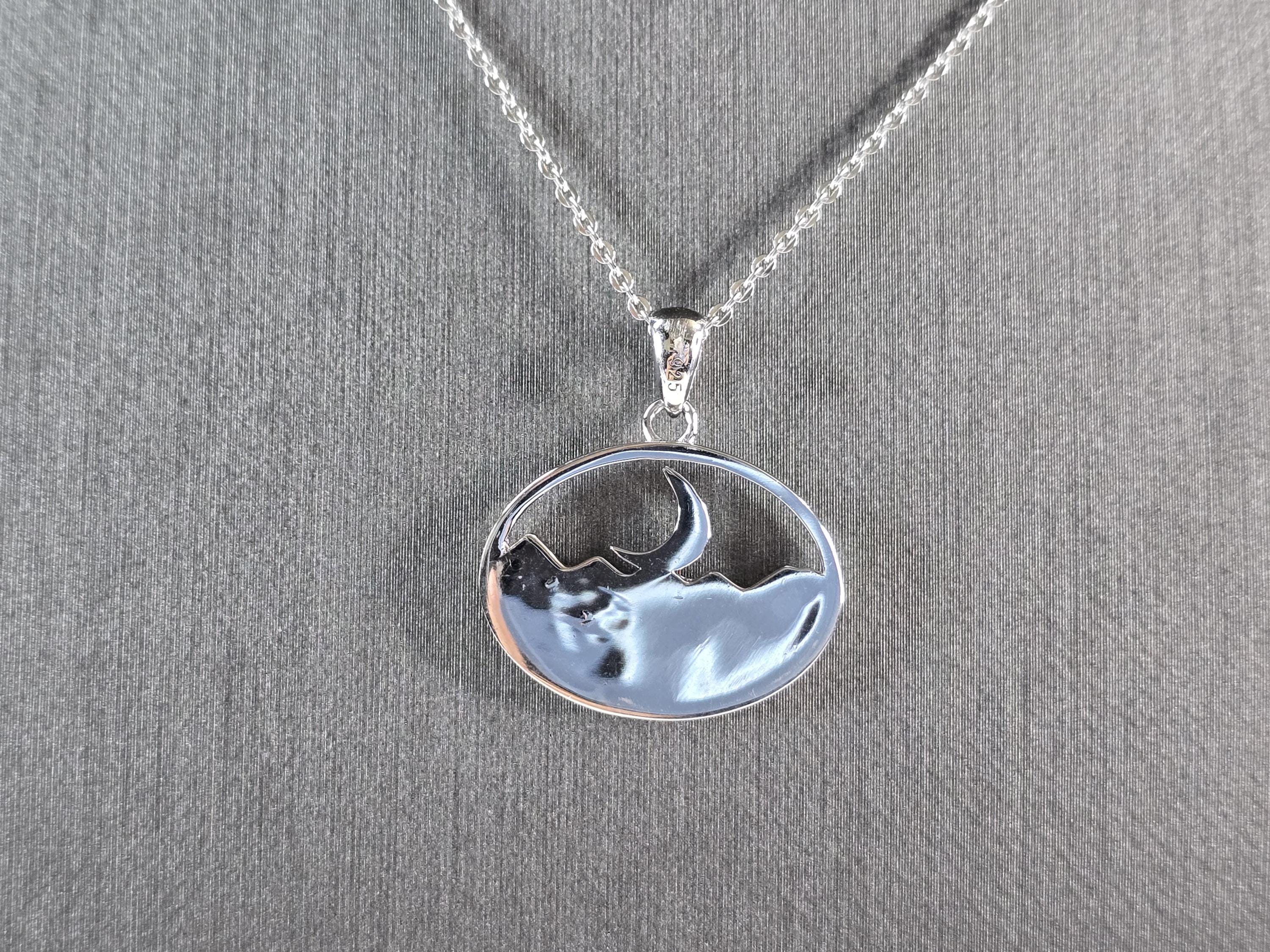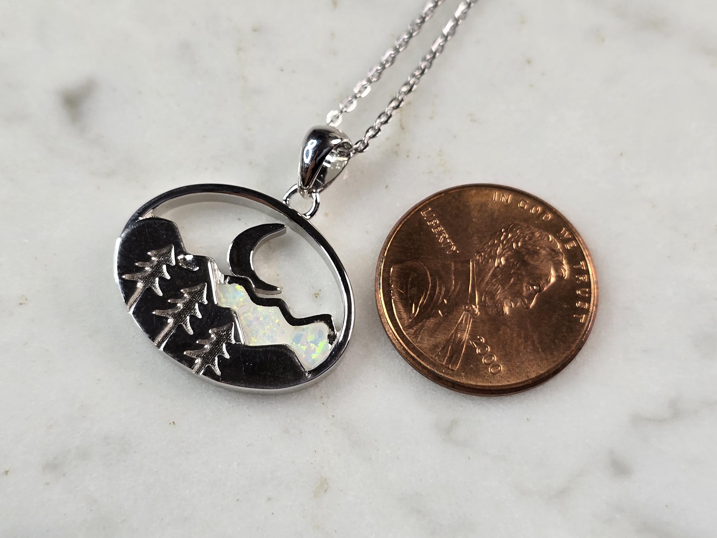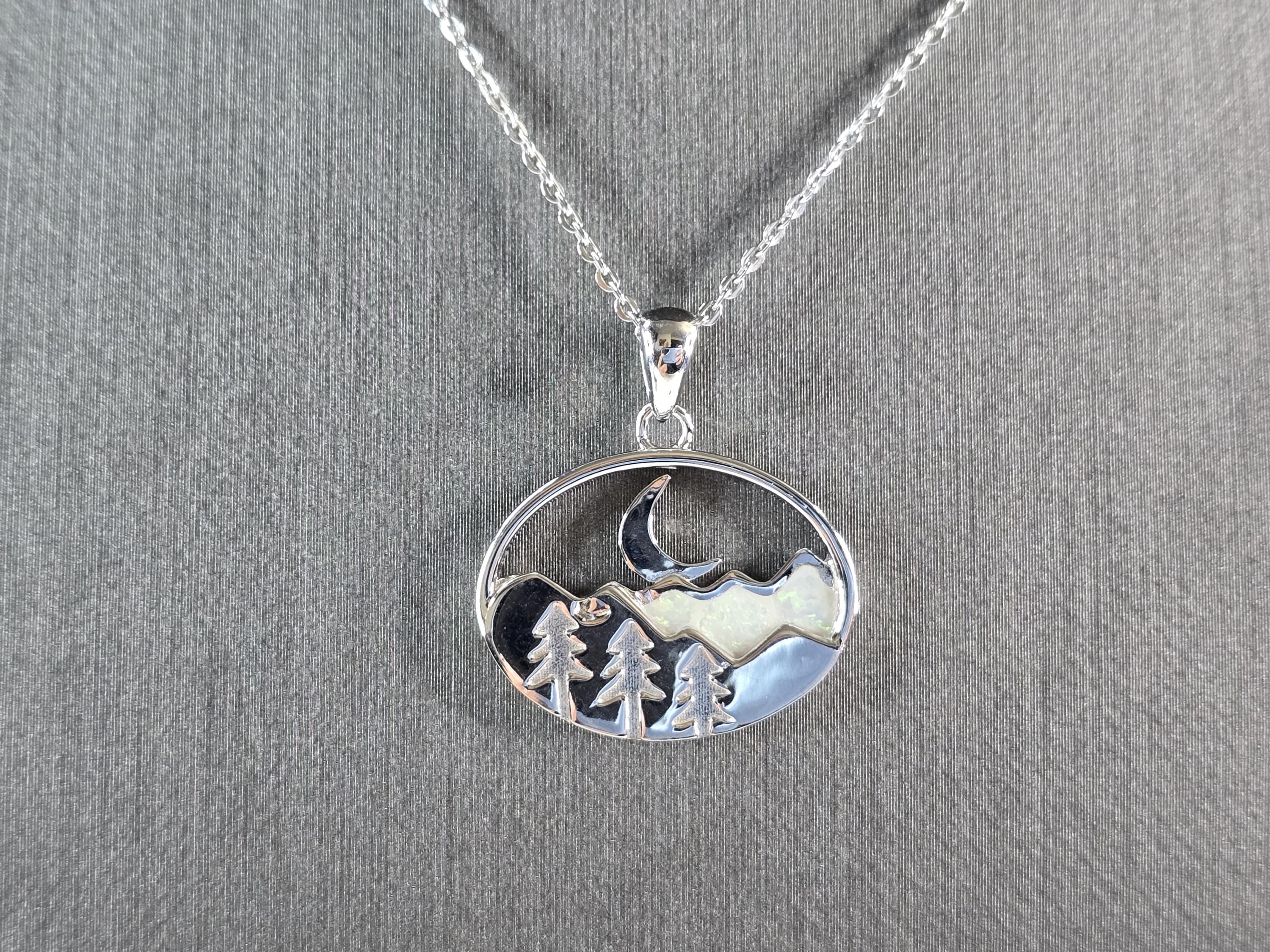 A WOMENS STERLING SILVER OPAL MOUNTAIN MOON PENDANT. THE PENDANT WITH NECKLACE WEIGHS 5.4g. THE PENDANT MEASURES 7/8" LONG BY 7/8" WIDE. THE NECKLACE MEASURES 18" LONG AND IS ADJUSTABLE TO 16" LONG. NOT SURE IF STONES ARE NATURAL OR MAN MADE. MAKES A GREAT GIFT FOR THAT SOMEONE SPECIAL. ANY QUESTIONS, PLEASE ASK. BE SURE TO CHECK OUT OUR OTHER ITEMS FOR SALE.