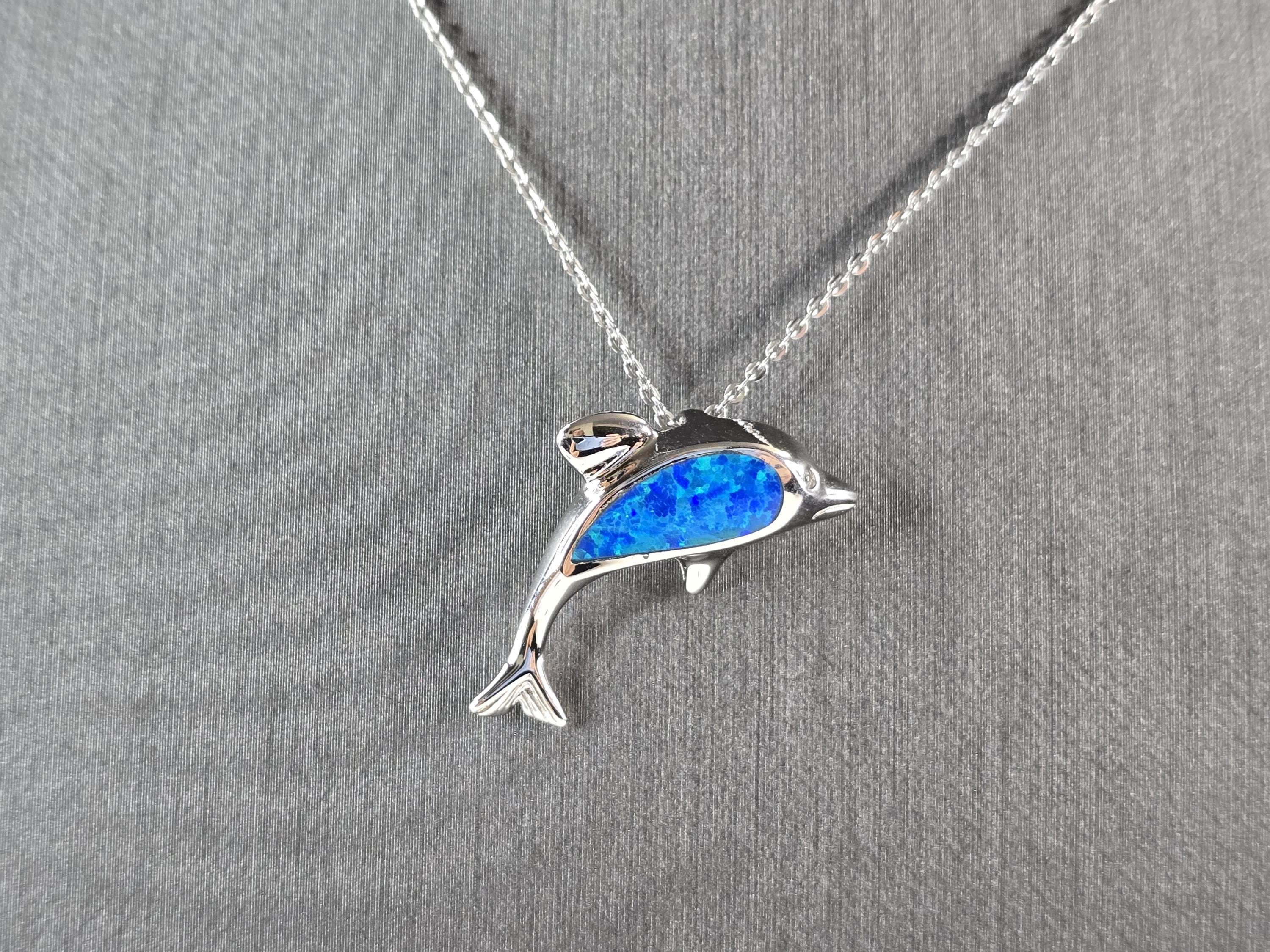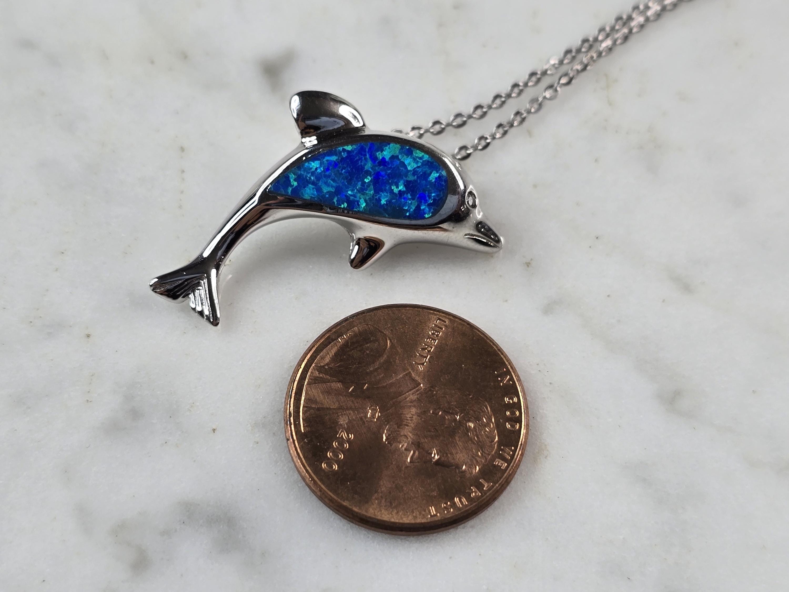 A WOMENS STERLING SILVER BLUE OPAL DOLPHIN PENDANT. THE PENDANT WITH NECKLACE WEIGHS 4.3g. THE PENDANT MEASURES 1" LONG BY 1/2" WIDE. THE NECKLACE MEASURES 18" LONG AND IS ADJUSTABLE TO 16" LONG. NOT SURE IF STONES ARE NATURAL OR MAN MADE. MAKES A GREAT GIFT FOR THAT SOMEONE SPECIAL. ANY QUESTIONS, PLEASE ASK. BE SURE TO CHECK OUT OUR OTHER ITEMS FOR SALE.