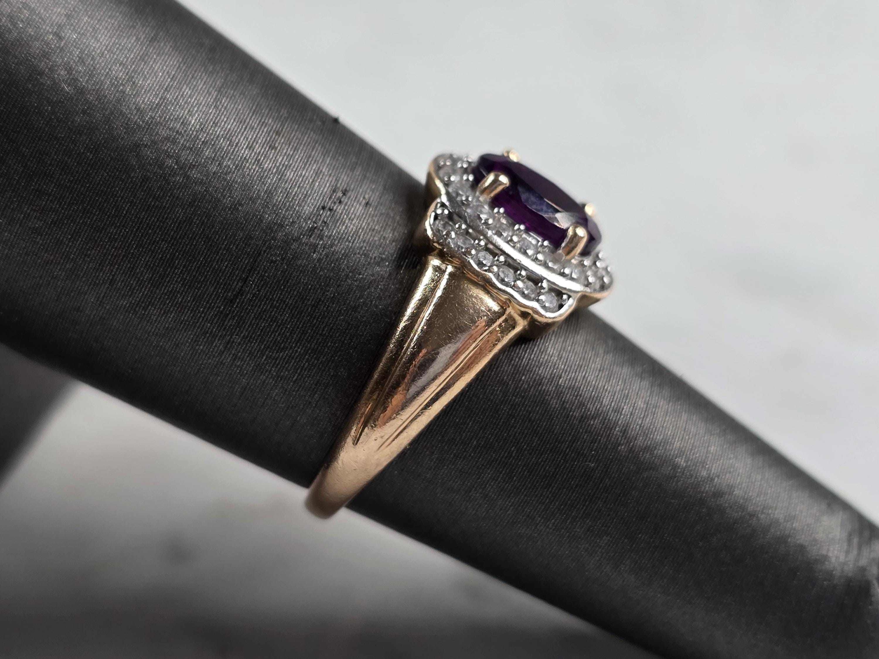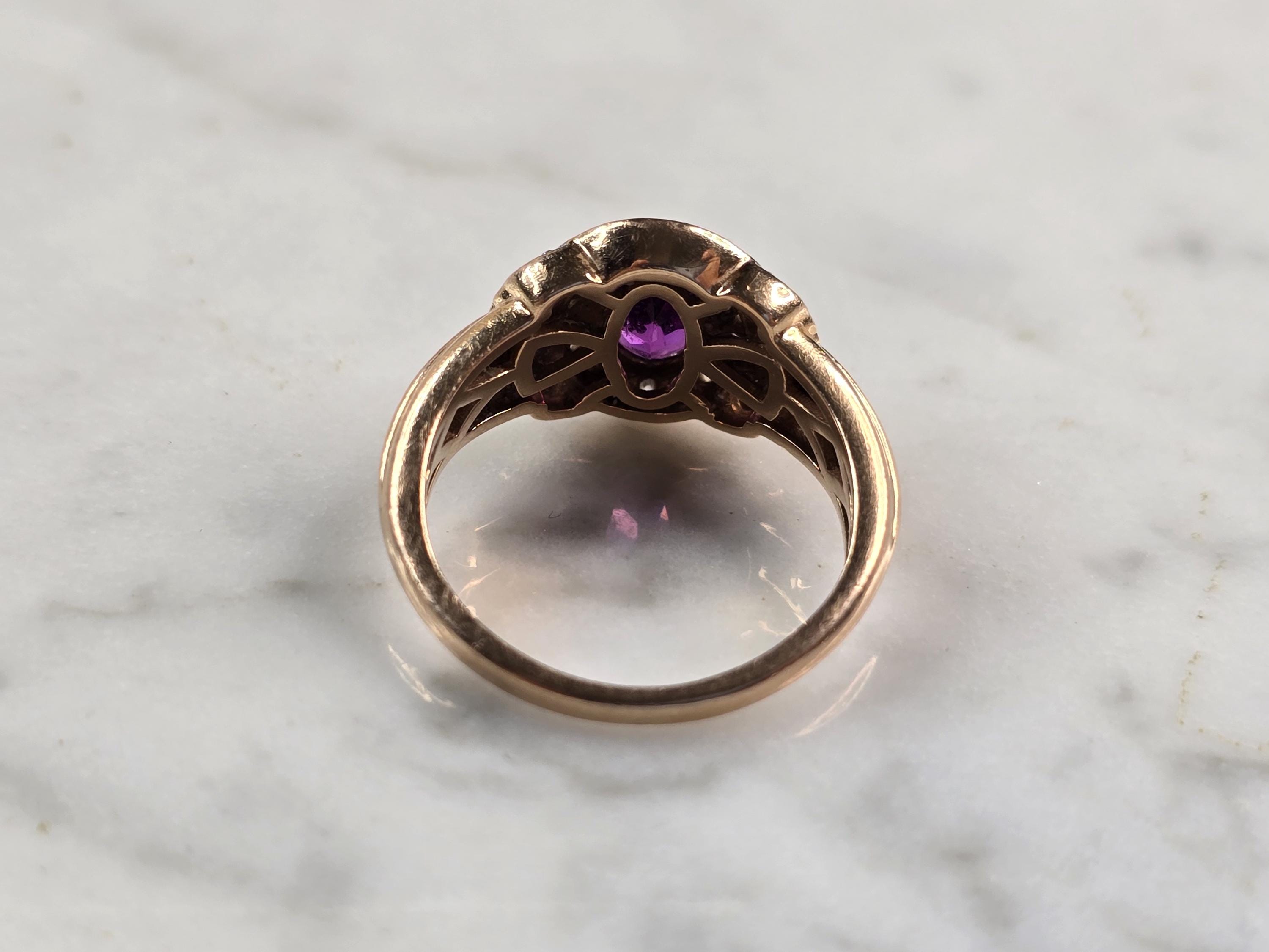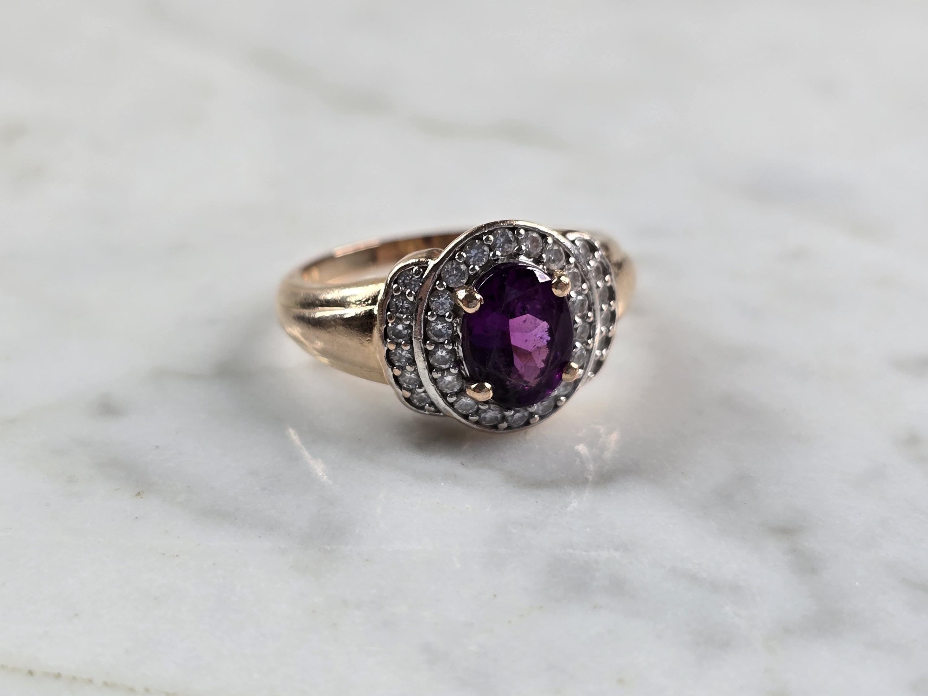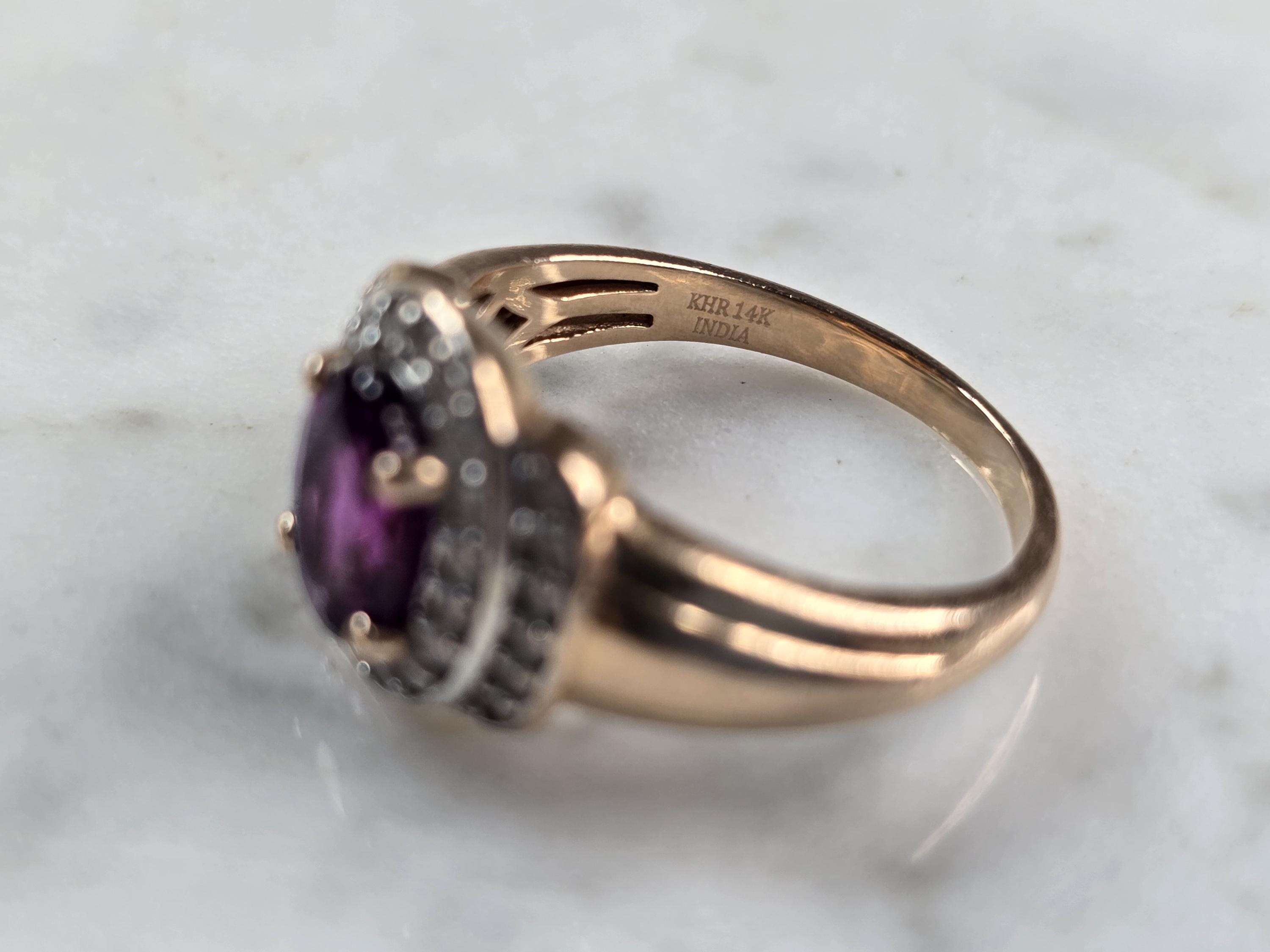 A WOMENS VINTAGE ESTATE 14K ROSE GOLD AMETHYST DIAMOND RING. THE RING WEIGHS 4.5g, AND IS A SIZE 6.25. THE WIDTH OF THE RING IS 1/2". THERE ARE 30 TINY DIAMONDS IN THIS RING. RING IS STAMPED "14K". NOT SURE IF AMETHYST IS NATURAL OR MAN MADE. ANY QUESTIONS, PLEASE DON'T HESITATE TO ASK. BE SURE TO CHECK OUT SOME OF MY OTHER GREAT ITEMS UP FOR SALE. THANK YOU .