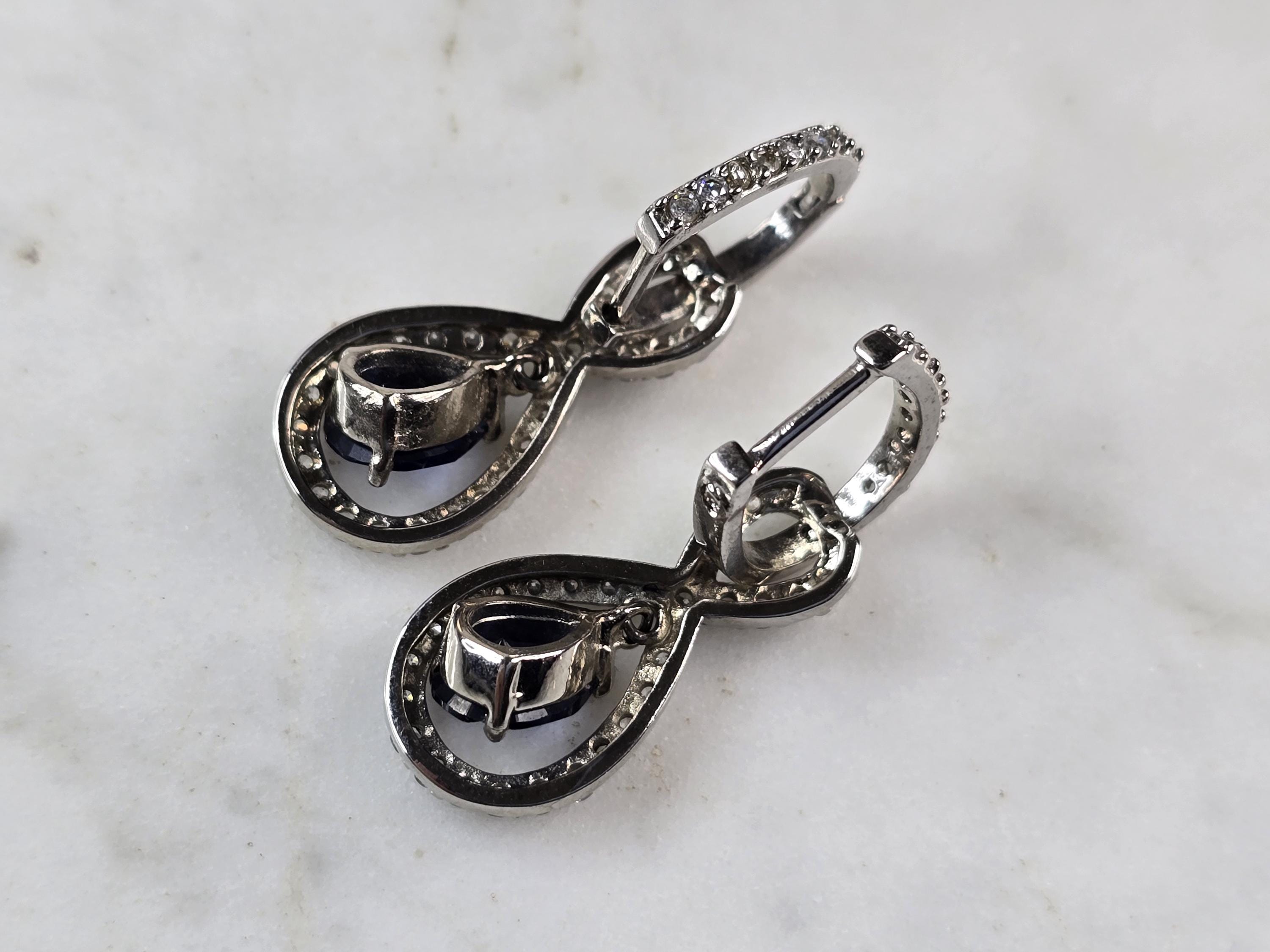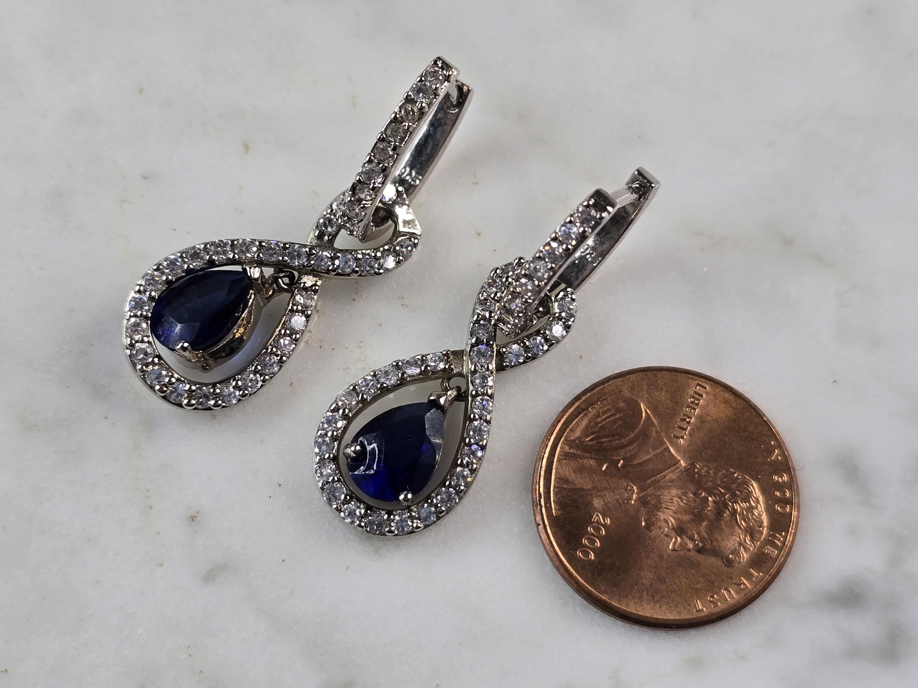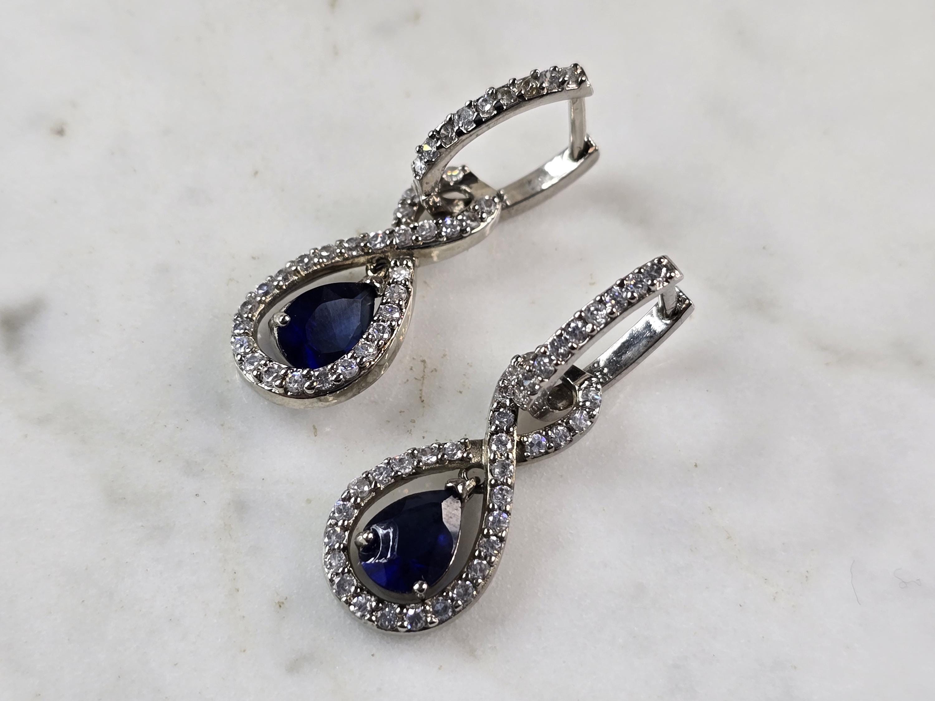 A PAIR OF WOMENS STERLING SILVER SAPPHIRE COLORED CZ EARRINGS THAT WEIGH 5.4g AND MEASURE 1 1/4" LONG BY 1/2" WIDE. NOT SURE IF STONES ARE NATURAL OR MAN MADE. ANY QUESTIONS, PLEASE DO NOT HESITATE TO ASK. BE SURE TO CHECK OUT SOME OF MY OTHER GREAT ITEMS UP FOR SALE. THANK YOU