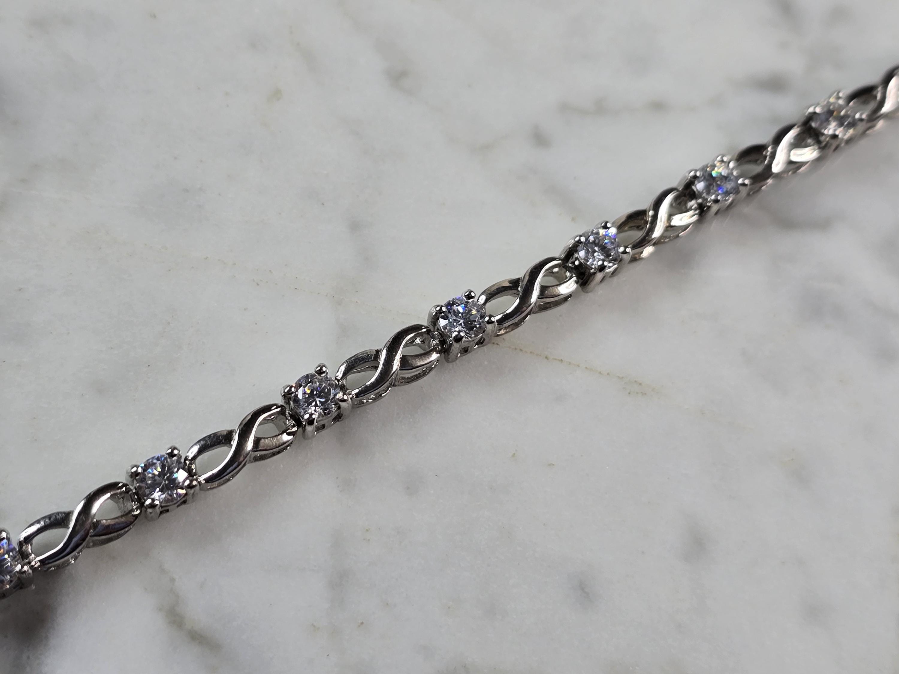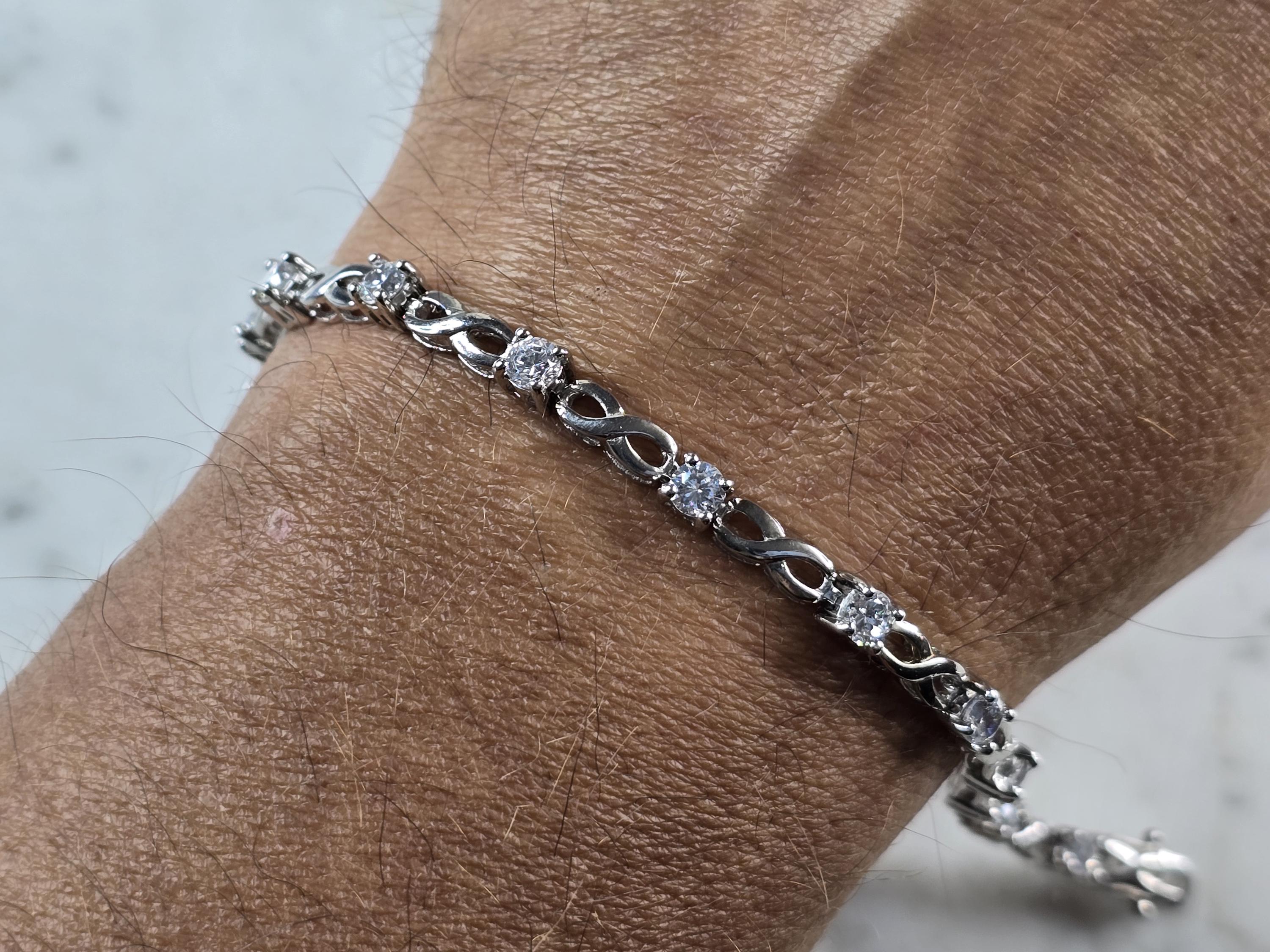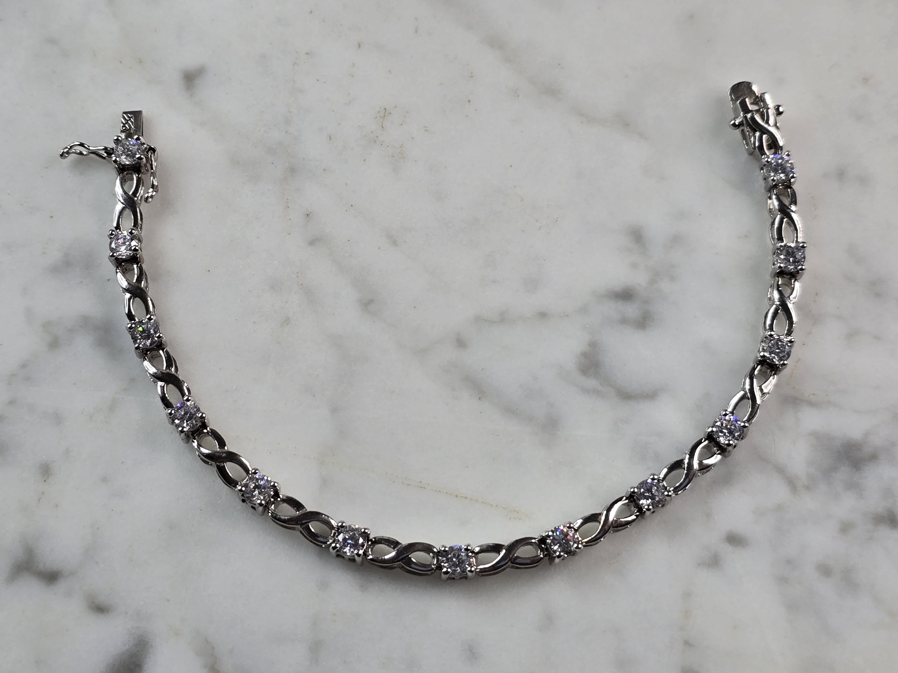 A WOMENS VINTAGE ESTATE STERLING SILVER CZ TENNIS BRACELET. BRACELET IS ABOUT 7 3/8" LONG BY 3/16" WIDE, AND WEIGHS 12.3g. WOULD MAKE A LOVELY GIFT FOR THAT SOMEONE SPECIAL. BE SURE TO CHECK OUT SOME OF MY OTHER GREAT ITEMS UP FOR SALE. THANK YOU