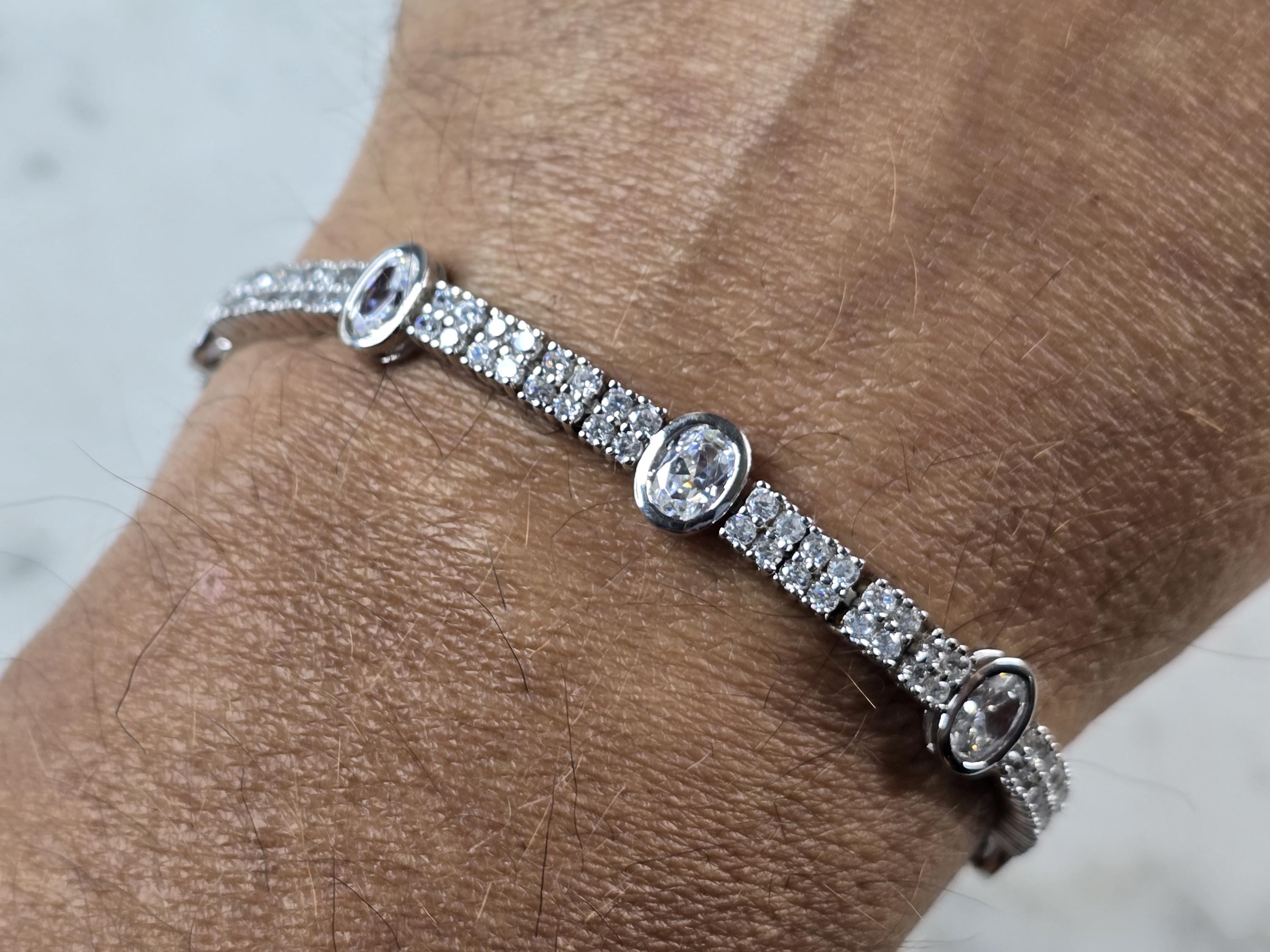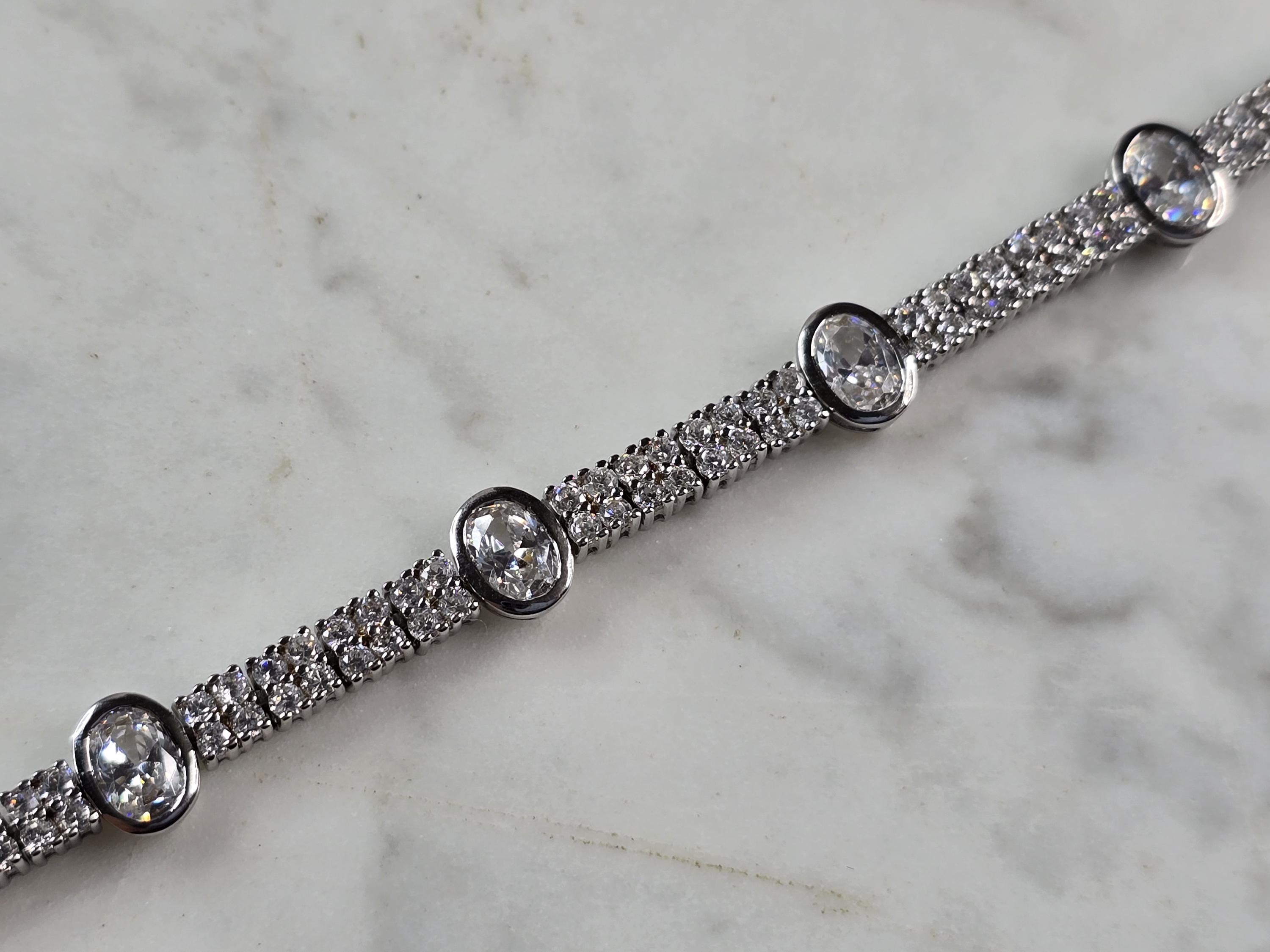 A WOMENS VINTAGE ESTATE STERLING SILVER CZ ANKLET TENNIS BRACELET. BRACELET IS ABOUT 8 1/4" LONG BY 5/16" WIDE, AND WEIGHS 16.5g. WOULD MAKE A LOVELY GIFT FOR THAT SOMEONE SPECIAL. BE SURE TO CHECK OUT SOME OF MY OTHER GREAT ITEMS UP FOR SALE. THANK YOU