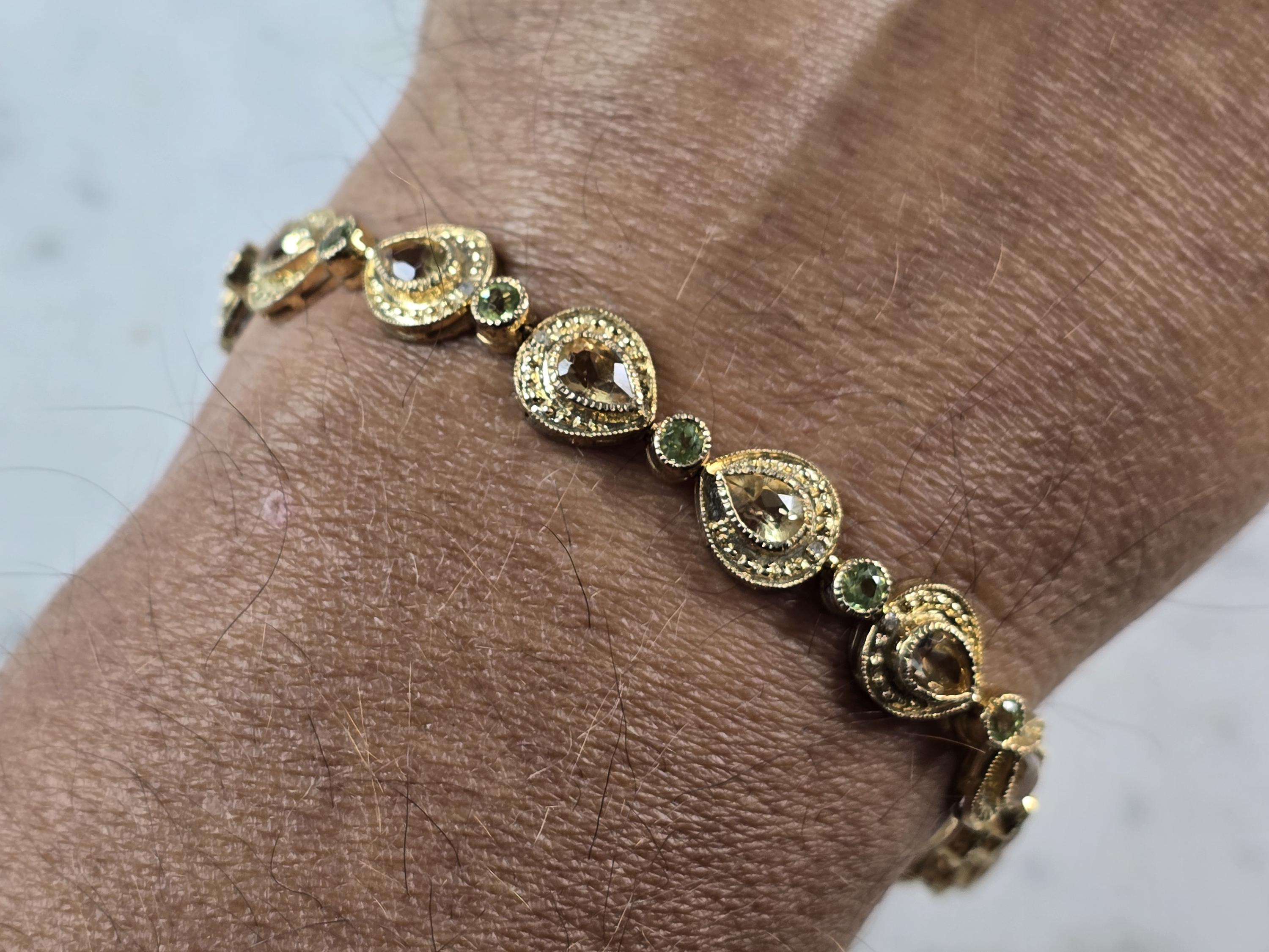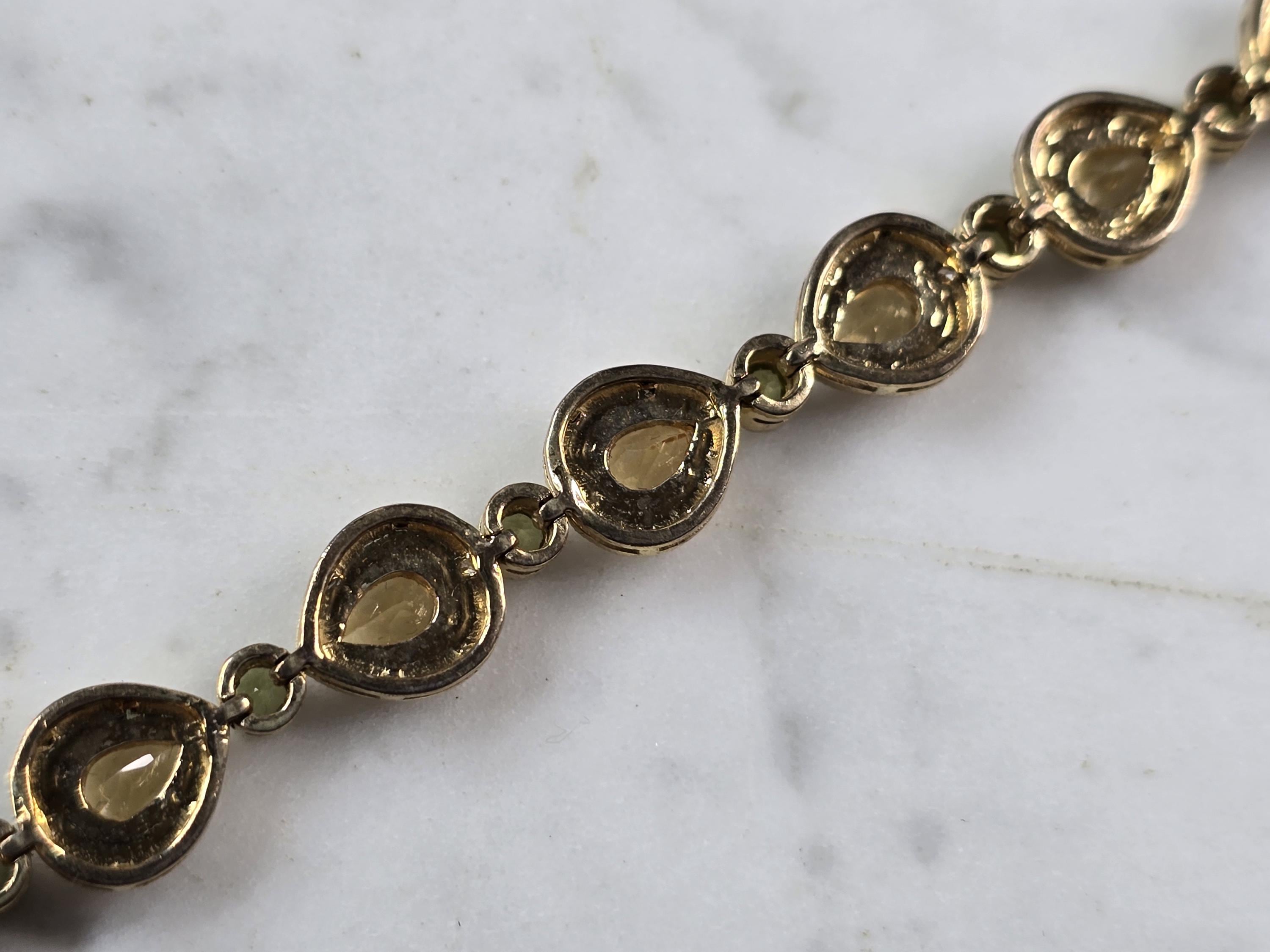 A WOMENS VINTAGE ESTATE STERLING SILVER GOLD TONE BRACELET WITH CITIRINE & PERIDOT COLORED STONES. BRACELET IS ABOUT 7 3/4" LONG BY 3/8" WIDE AND WEIGHS 17.3g. NOT SURE IF STONES ARE NATURAL OR MAN MADE. WOULD MAKE A LOVELY GIFT FOR THAT SOMEONE SPECIAL. BE SURE TO CHECK OUT SOME OF MY OTHER GREAT ITEMS UP FOR SALE. THANK YOU.
