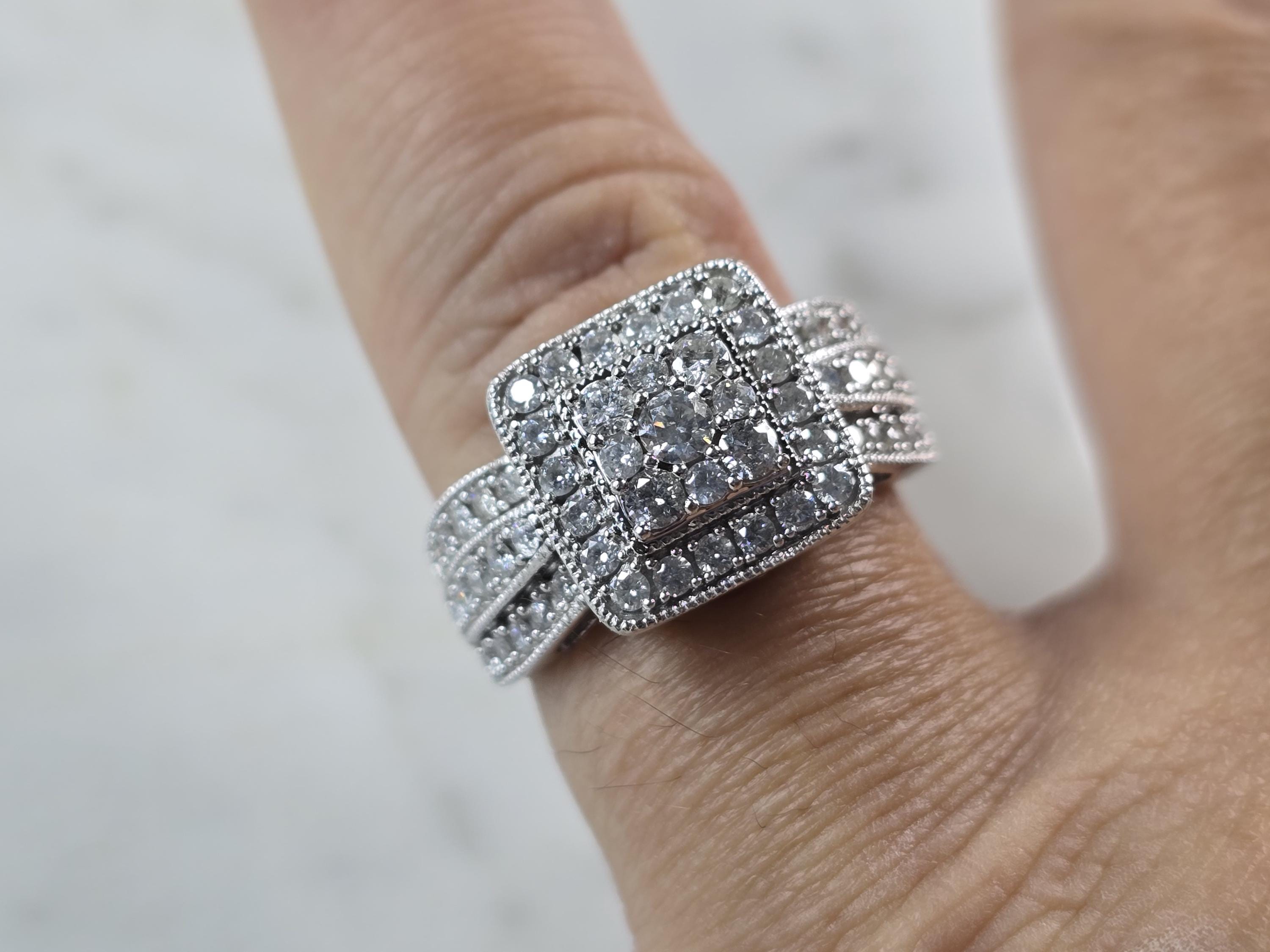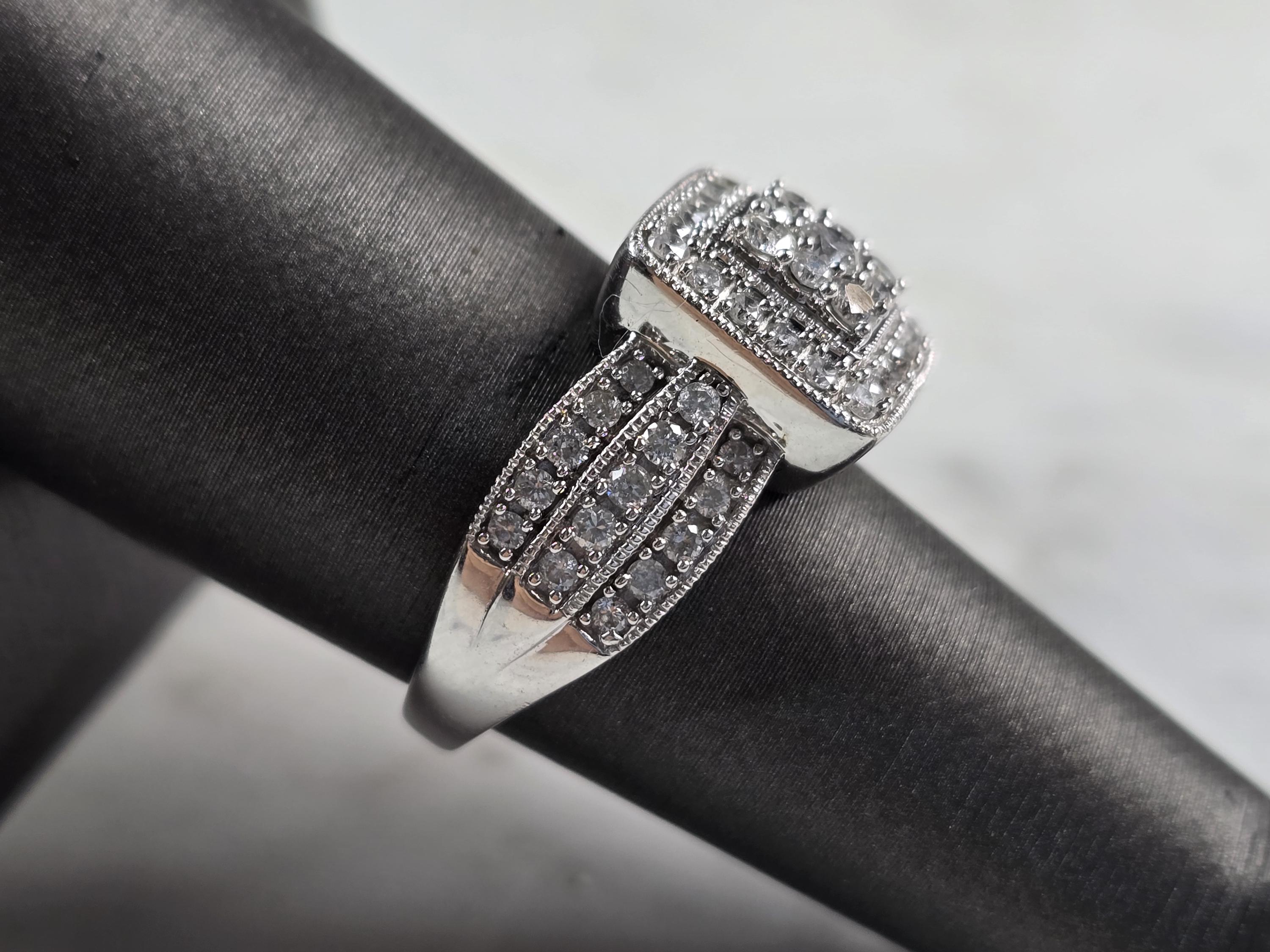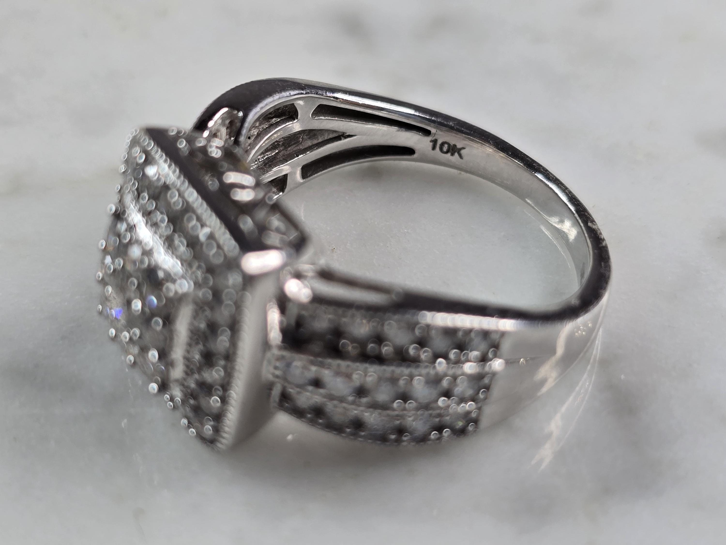 A WOMENS VINTAGE ESTATE 10K WHITE GOLD DIAMOND RING. THERE ARE ABOUT 1.0cts, OF DIAMONDS IN THIS RING. THE TOTAL WEIGHT IS 5.5g, AND IS A SIZE 7.0. THE WIDTH OF THE RING IS ABOUT 1/2". ANY QUESTIONS PLEASE DONT HESITATE TO ASK. BE SURE TO CHECK OUT SOME OF OUR OTHER GREAT ITEMS UP FOR SALE. THANK YOU.