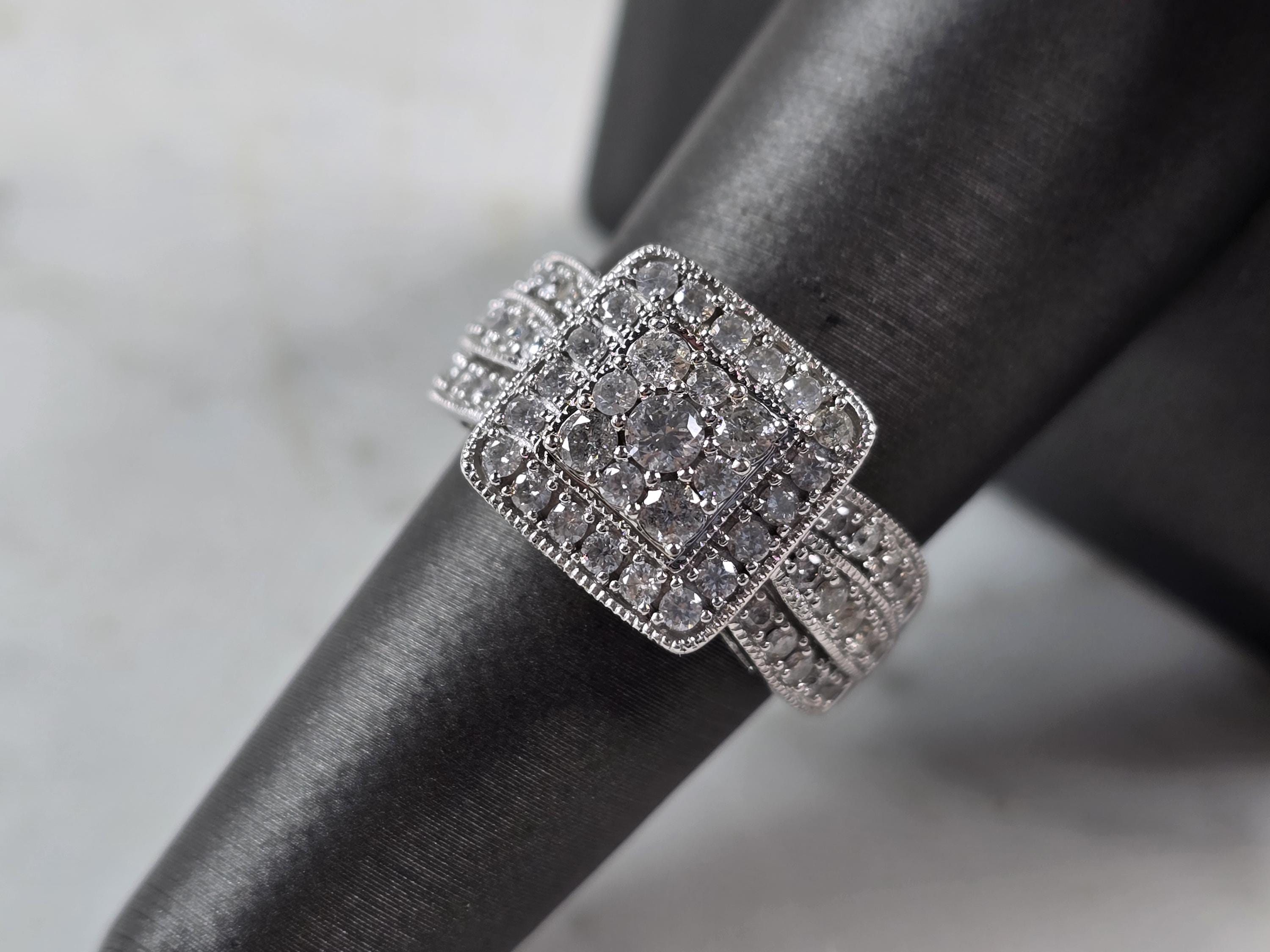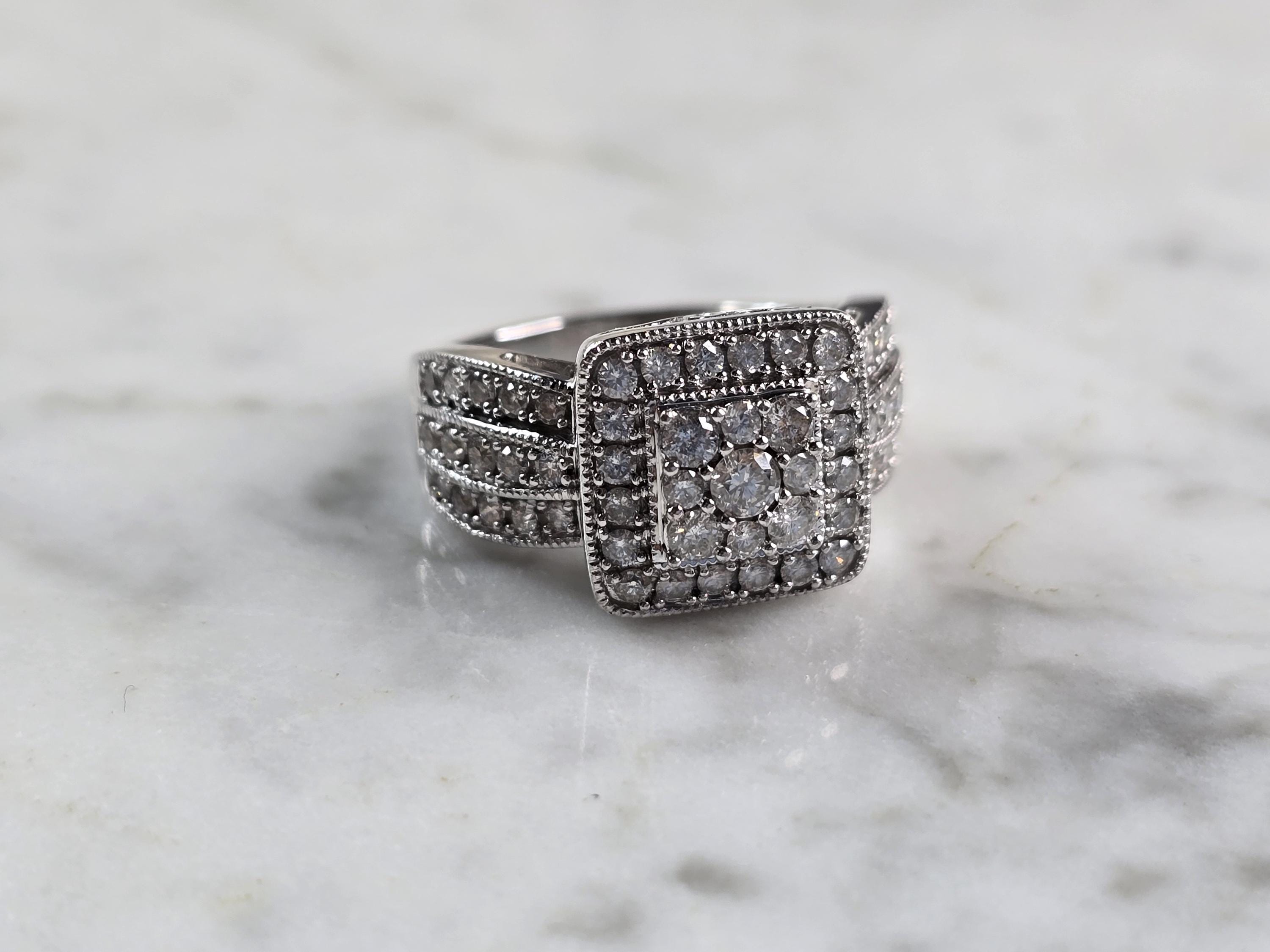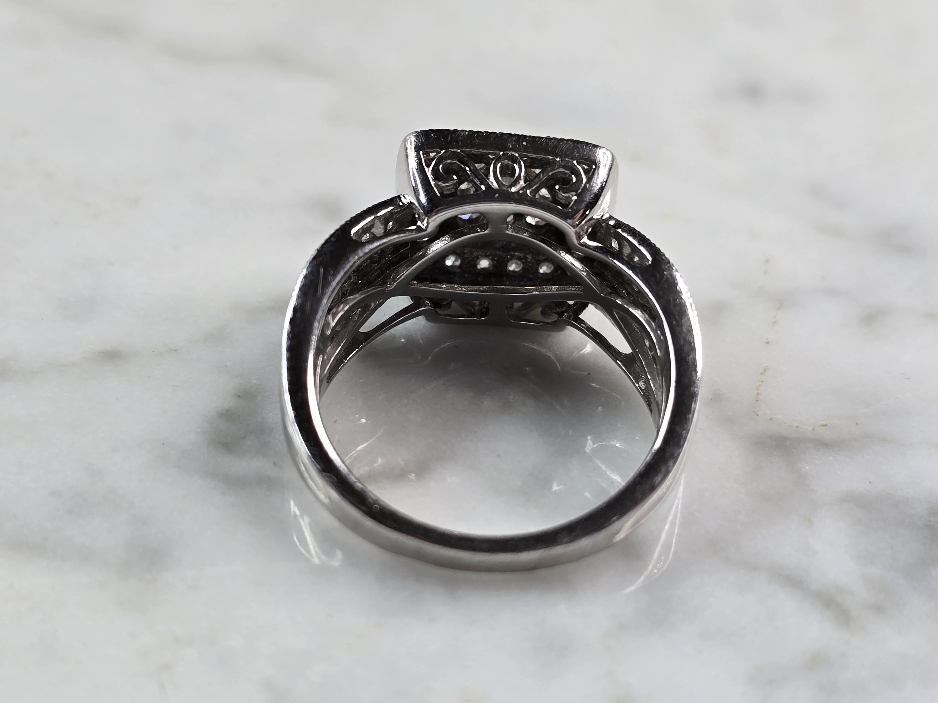 A WOMENS VINTAGE ESTATE 10K WHITE GOLD DIAMOND RING. THERE ARE ABOUT 1.0cts, OF DIAMONDS IN THIS RING. THE TOTAL WEIGHT IS 5.5g, AND IS A SIZE 7.0. THE WIDTH OF THE RING IS ABOUT 1/2". ANY QUESTIONS PLEASE DONT HESITATE TO ASK. BE SURE TO CHECK OUT SOME OF OUR OTHER GREAT ITEMS UP FOR SALE. THANK YOU.