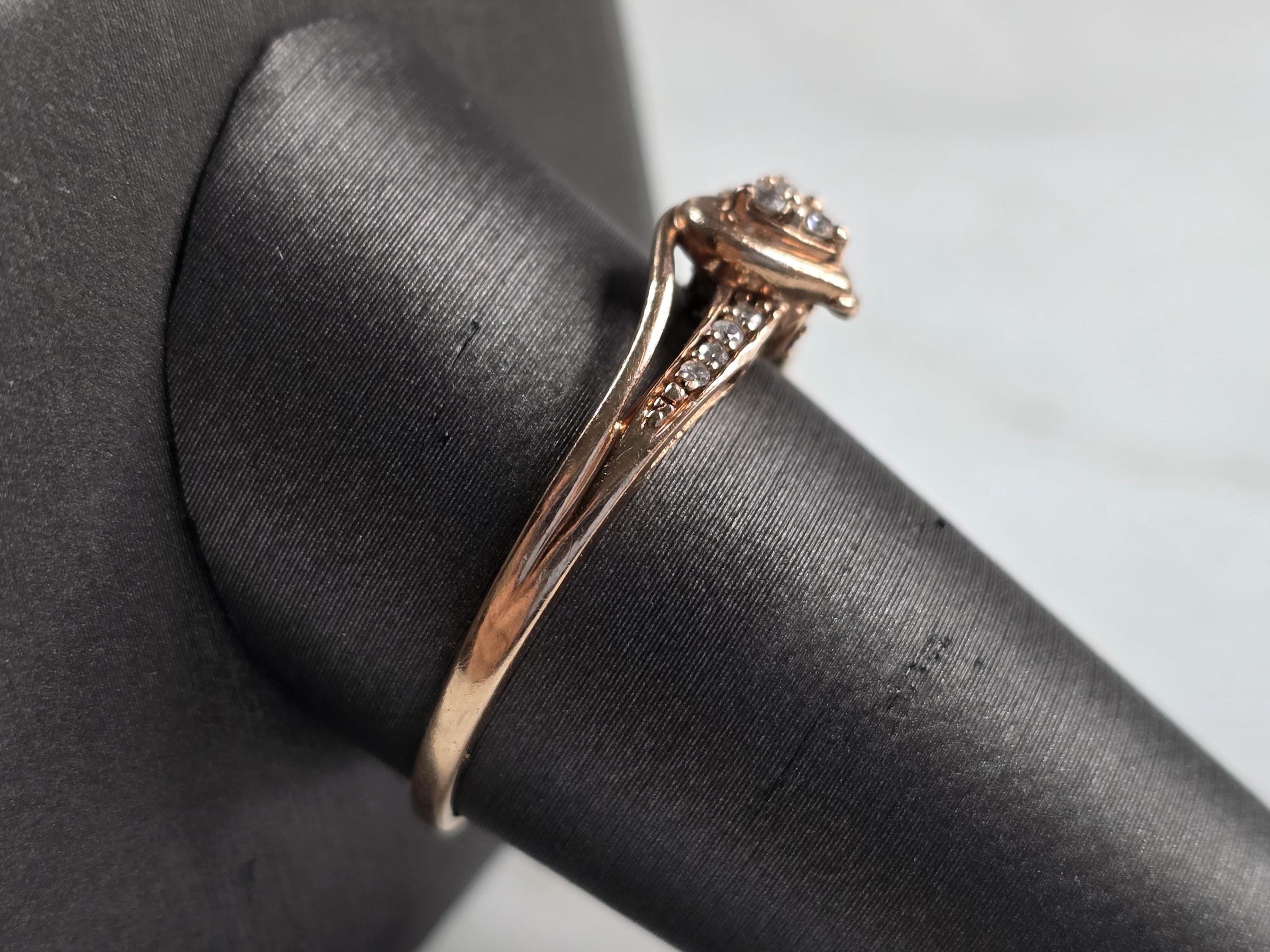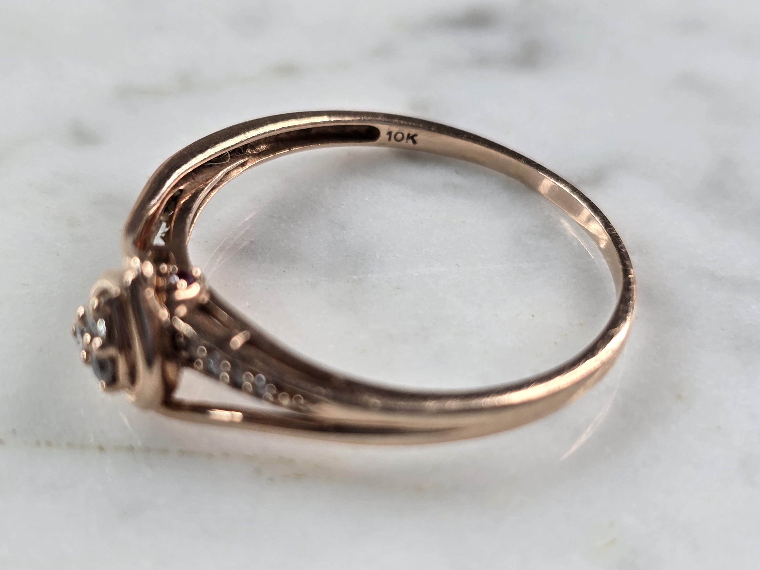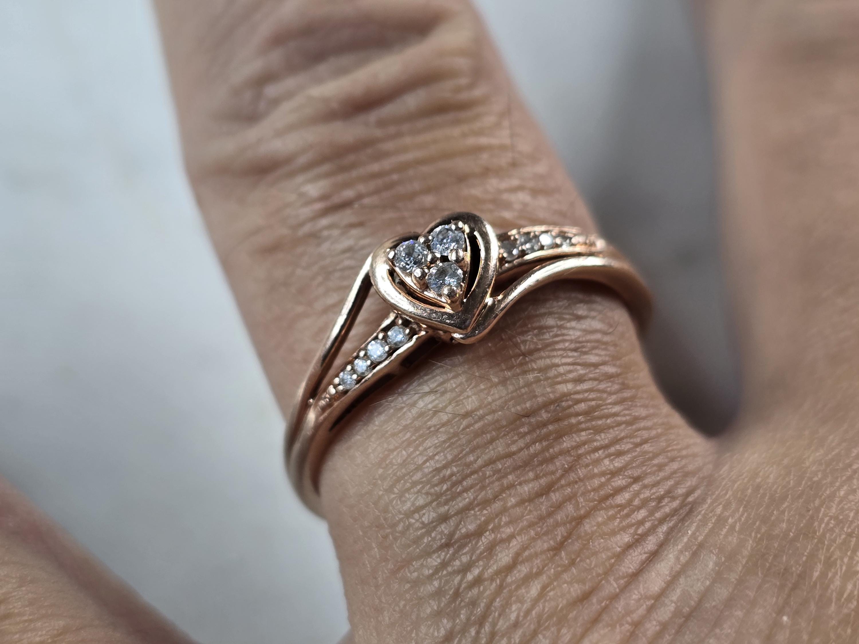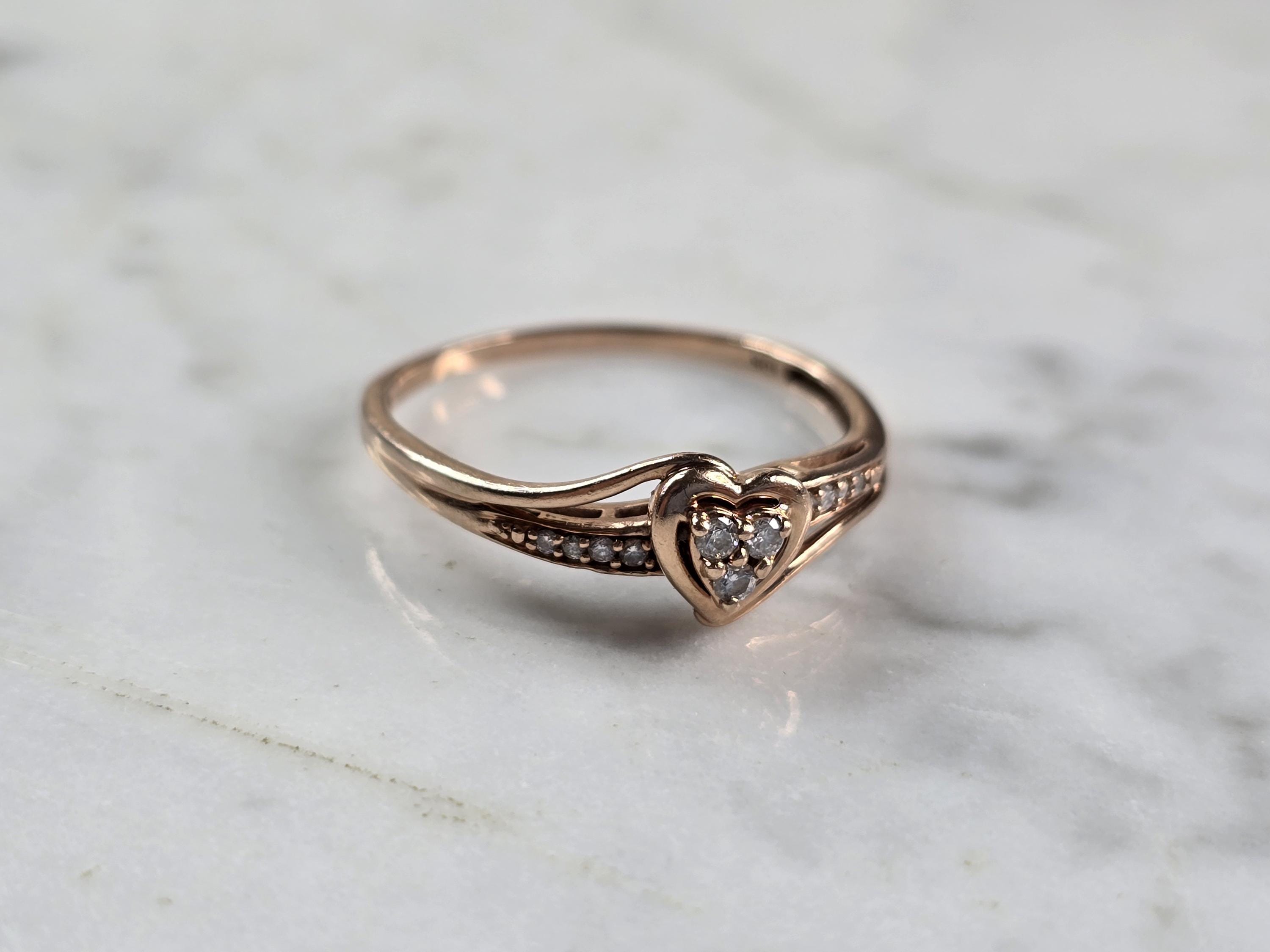 A WOMENS VINTAGE ESTATE 10K ROSE GOLD DIAMOND HEART RING. THE RING WEIGHS 2.3g, AND IS A SIZE 10.75. THE WIDTH OF THE RING IS 1/4". THERE ARE 11 TINY DIAMONDS IN THIS RING. ANY QUESTIONS, PLEASE DON'T HESITATE TO ASK. BE SURE TO CHECK OUT SOME OF MY OTHER GREAT ITEMS UP FOR SALE. THANK YOU .