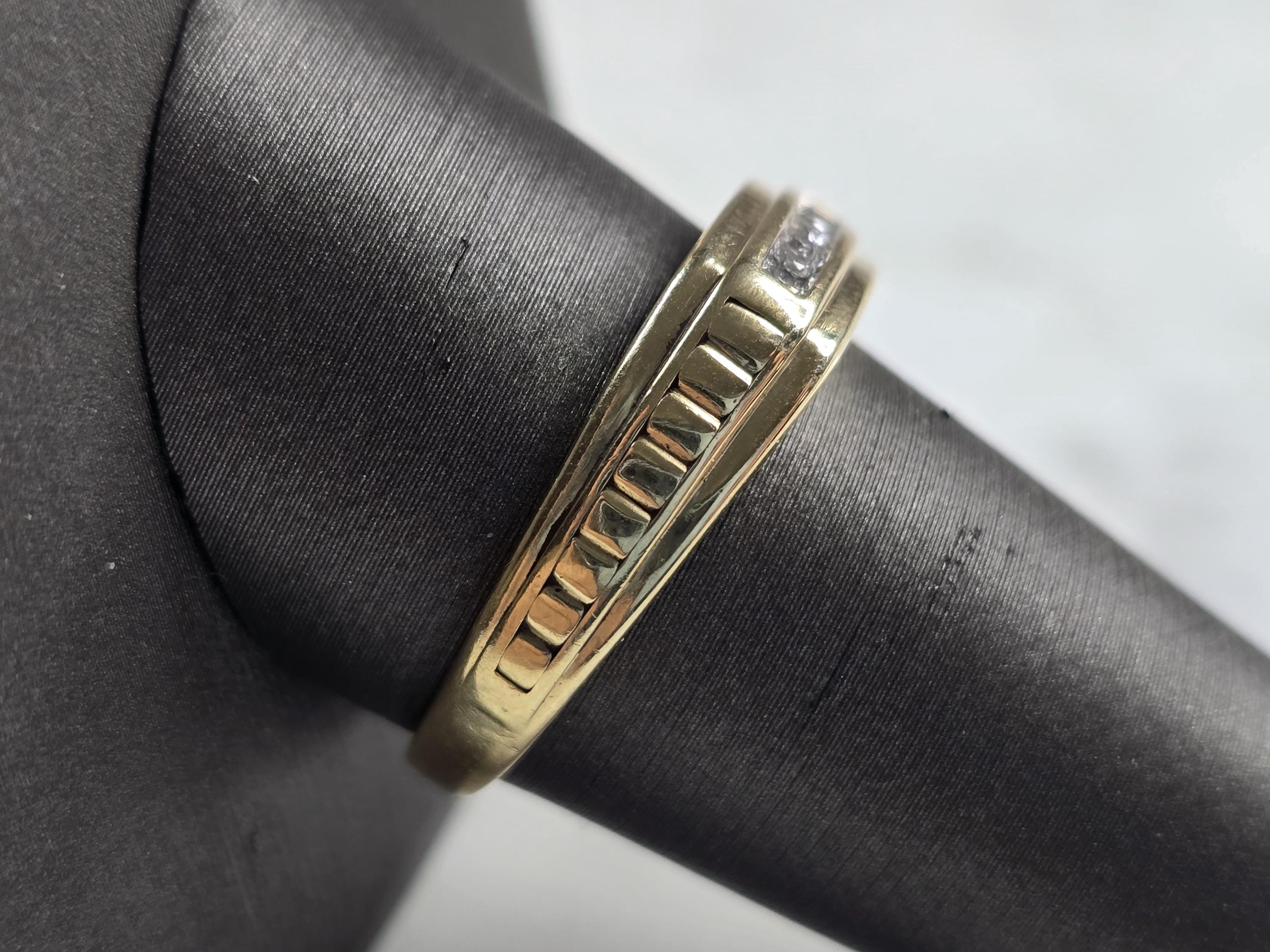 A MENS VINTAGE 10K YELLOW GOLD DIAMOND RING. THE SIZE OF THE RING IS A 10.5, AND WEIGHS 3.4g. THE WIDTH OF THE BAND IS 1/4". RING HAS 7 TINY DIAMONDS. RING IS STAMPED 10K. ANY QUESTIONS PLEASE DO NOT HESITATE TO ASK. BE SURE TO CHECK OUT SOME OF MY OTHER GREAT ITEMS UP FOR SALE. THANK YOU.