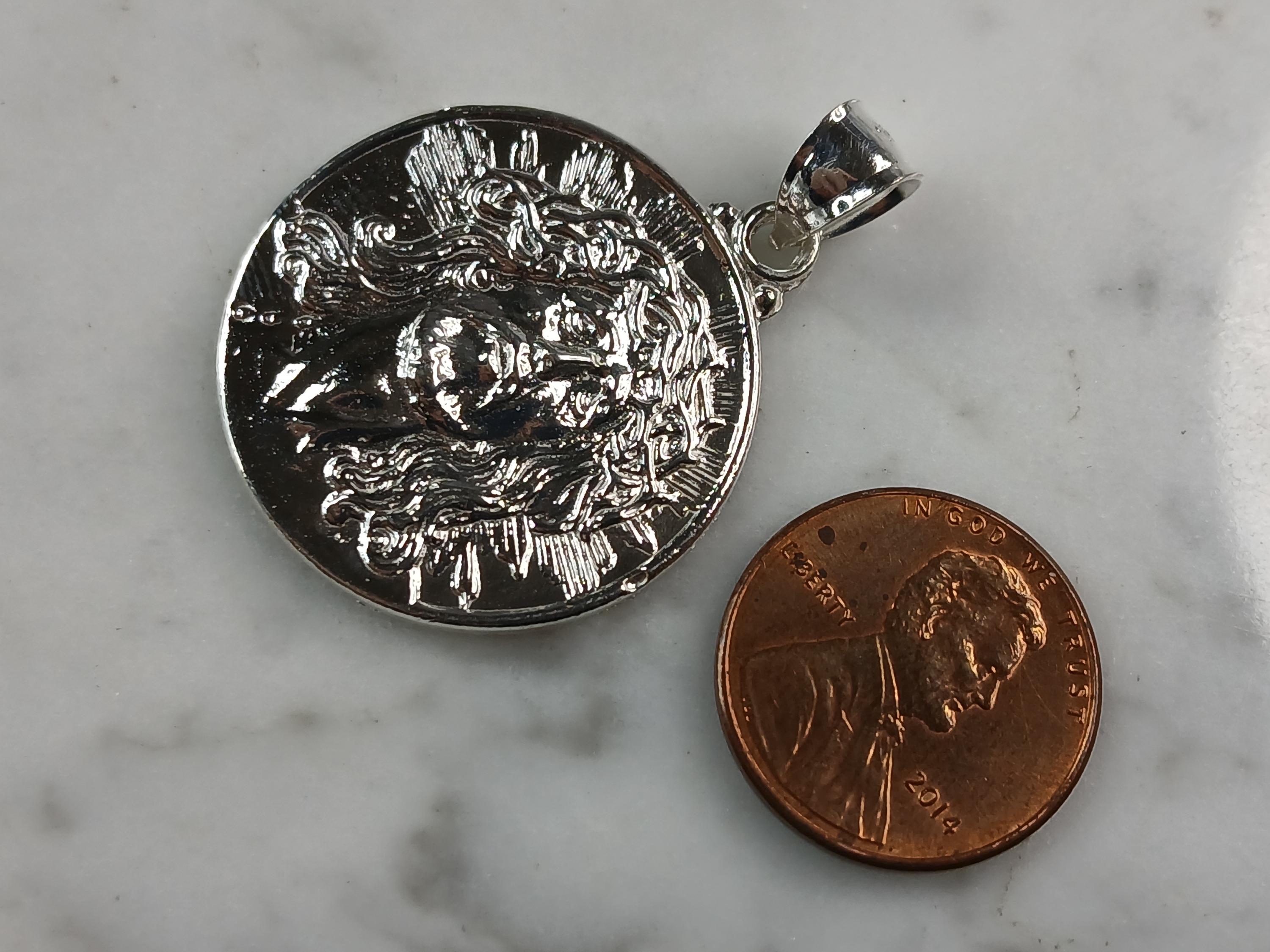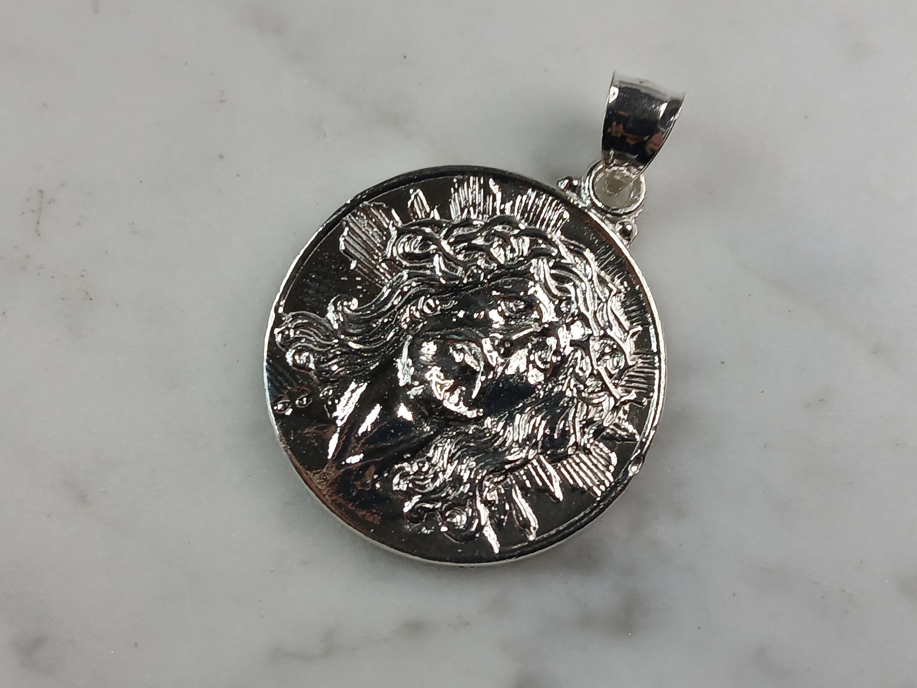 A WOMENS STERLING SILVER RELIGIOUS JESUS PENDANT WITH NECKLACE . THE TOTAL WEIGHT IS 9.6g. THE PENDANT MEASURES 1 1/2" LONG BY 1 1/4" WIDE. THE NECKLACE MEASURES 18" LONG AND IS ADJUSTABLE TO 16" LONG. MAKES A GREAT GIFT FOR THAT SPECIAL SOMEONE. ANY QUESTIONS, PLEASE DO NOT HESITATE TO ASK.