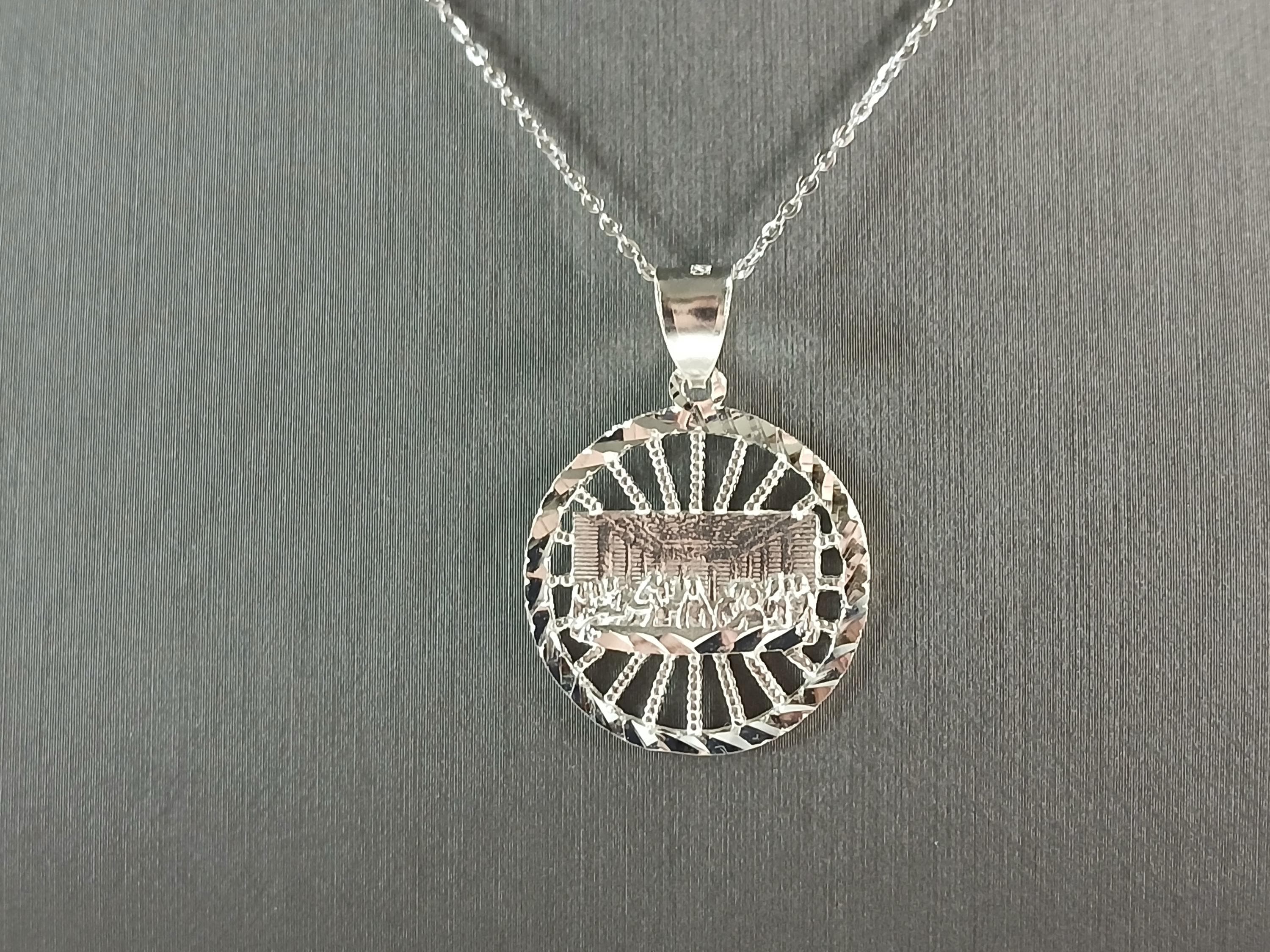 A STERLING SILVER RELIGIOUS LAST SUPPER PENDANT WITH NECKLACE. PENDANT WITH NECKLACE WEIGHS 4.0g. THE PENDANT MEASURES 1 1/4" LONG BY 7/8" WIDE. THE NECKLACE MEASURES 18" LONG AND IS ADJUSTABLE TO 16". MAKES A GREAT GIFT FOR THAT SOMEONE SPECIAL. ANY QUESTIONS, PLEASE ASK. BE SURE TO CHECK OUT OUR OTHER ITEMS FOR SALE.