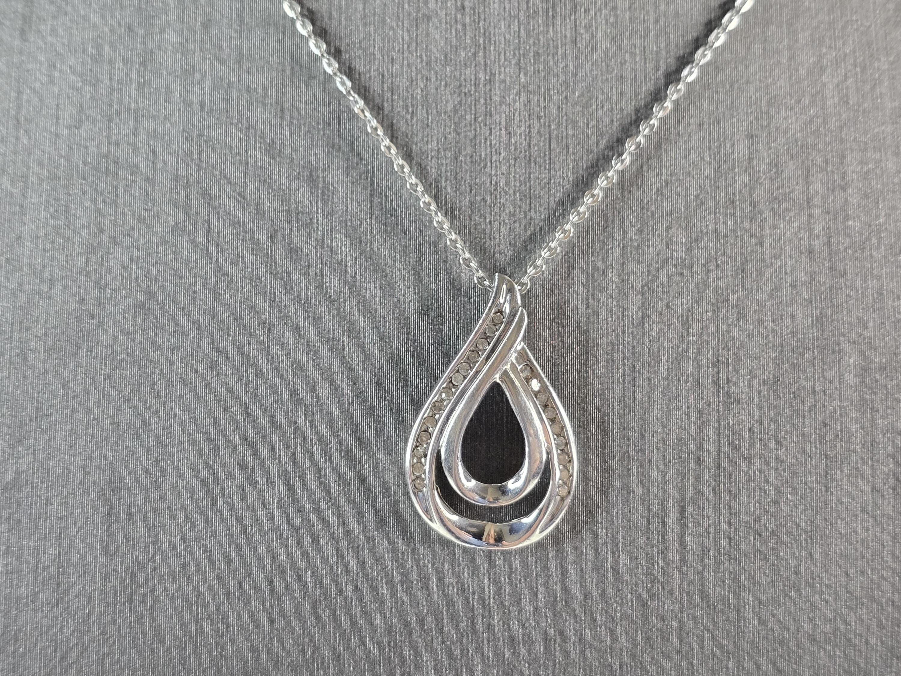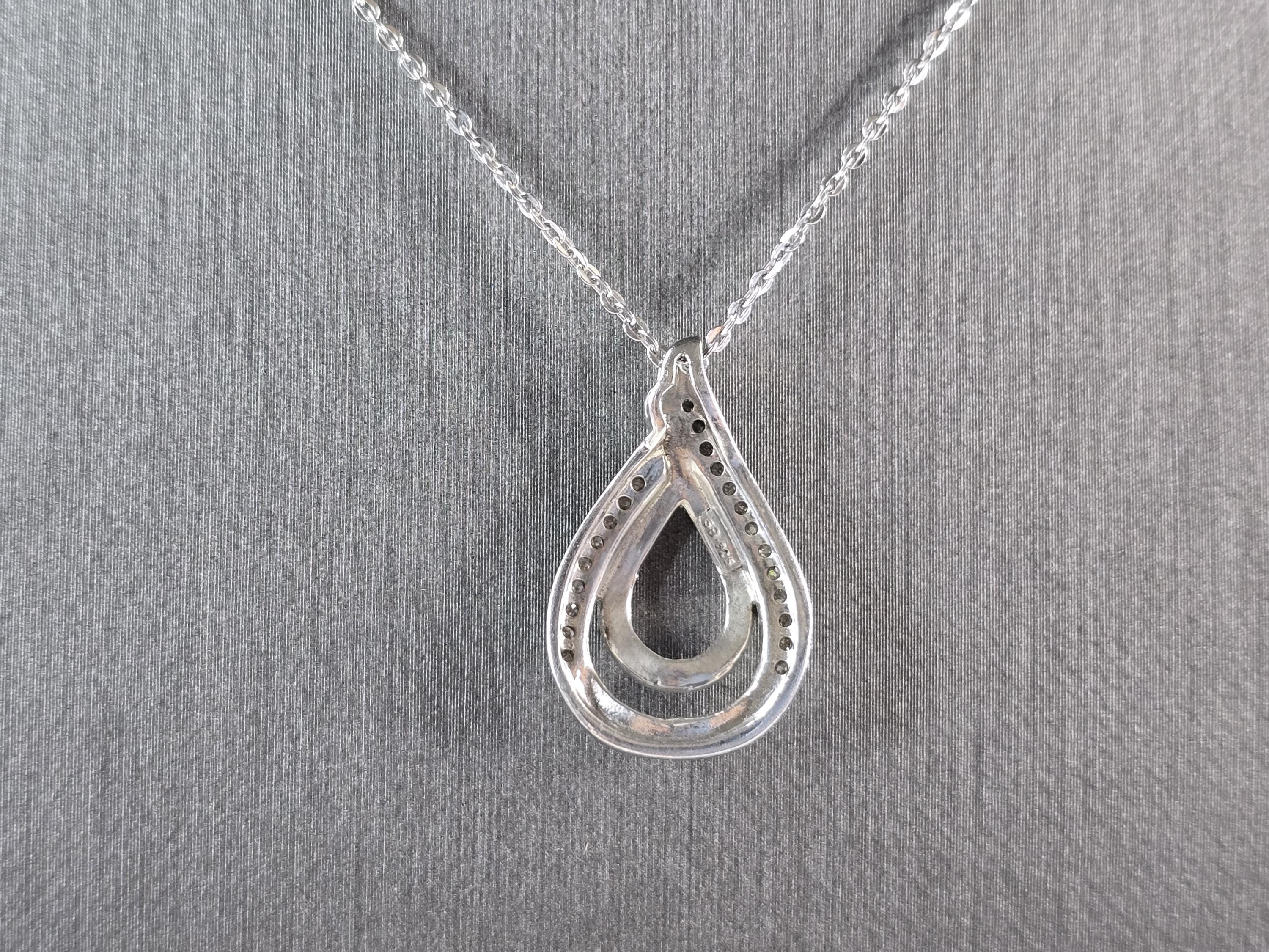 A WOMEN'S VINTAGE ESTATE STERLING SILVER DIAMOND TEAR DROP PENDANT WITH NECKLACE. THE TOTAL WEIGHT IS 3.4g. THE NECKLACE MEASURES 18" LONG AND IS ADJUSTABLE TO 16". THE PENDANT MEASURES 7/8" BY 1/2". THERE ARE 22 TINY DIAMONDS IN THIS PENDANT. MAKES A GREAT GIFT FOR THAT SPECIAL SOMEONE.