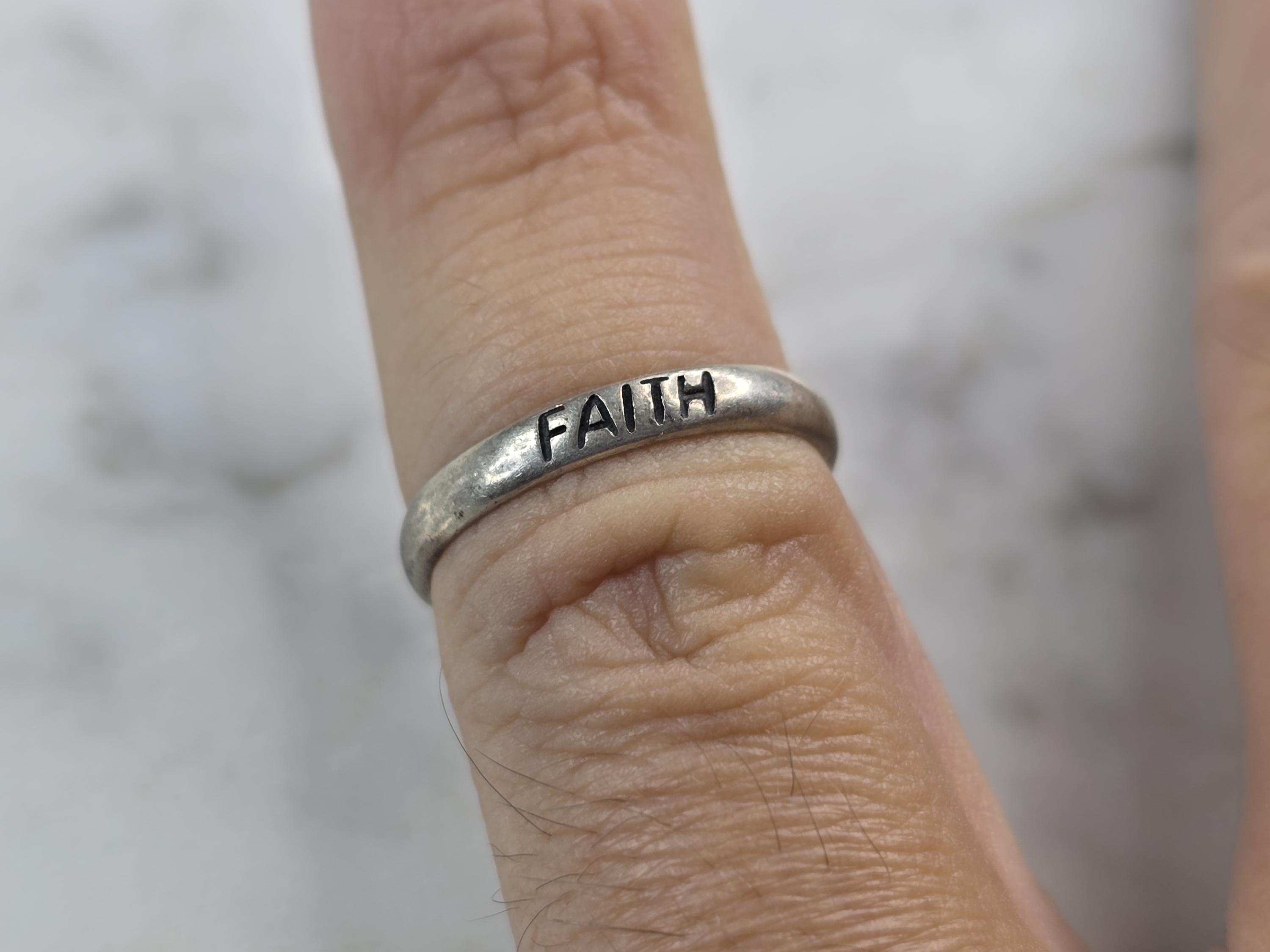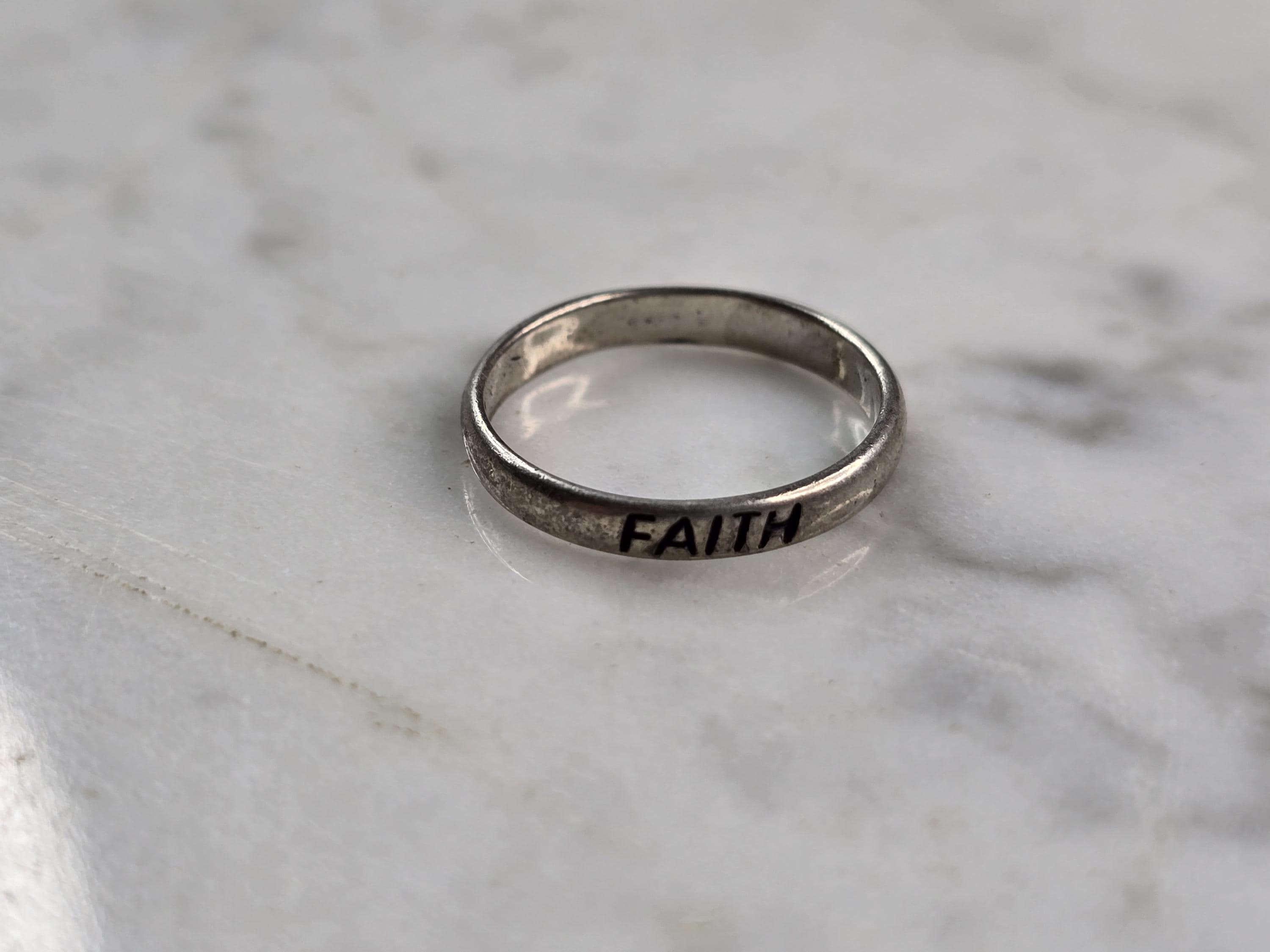 A WOMENS VINTAGE ESTATE STERLING SILVER "FAITH" RING. THE RING SIZE IS A 5.0, AND WEIGHS 1.2g. THE WIDTH OF THE RING IS 1/8". THIS WOULD MAKE A NICE GIFT FOR THAT SOMEONE SPECIAL. ANY OTHER QUESTIONS PLEASE DO NOT HESITATE TO ASK. BE SURE TO CHECK OUT SOME OF MY OTHER GREAT ITEMS UP FOR SALE. THANK YOU.