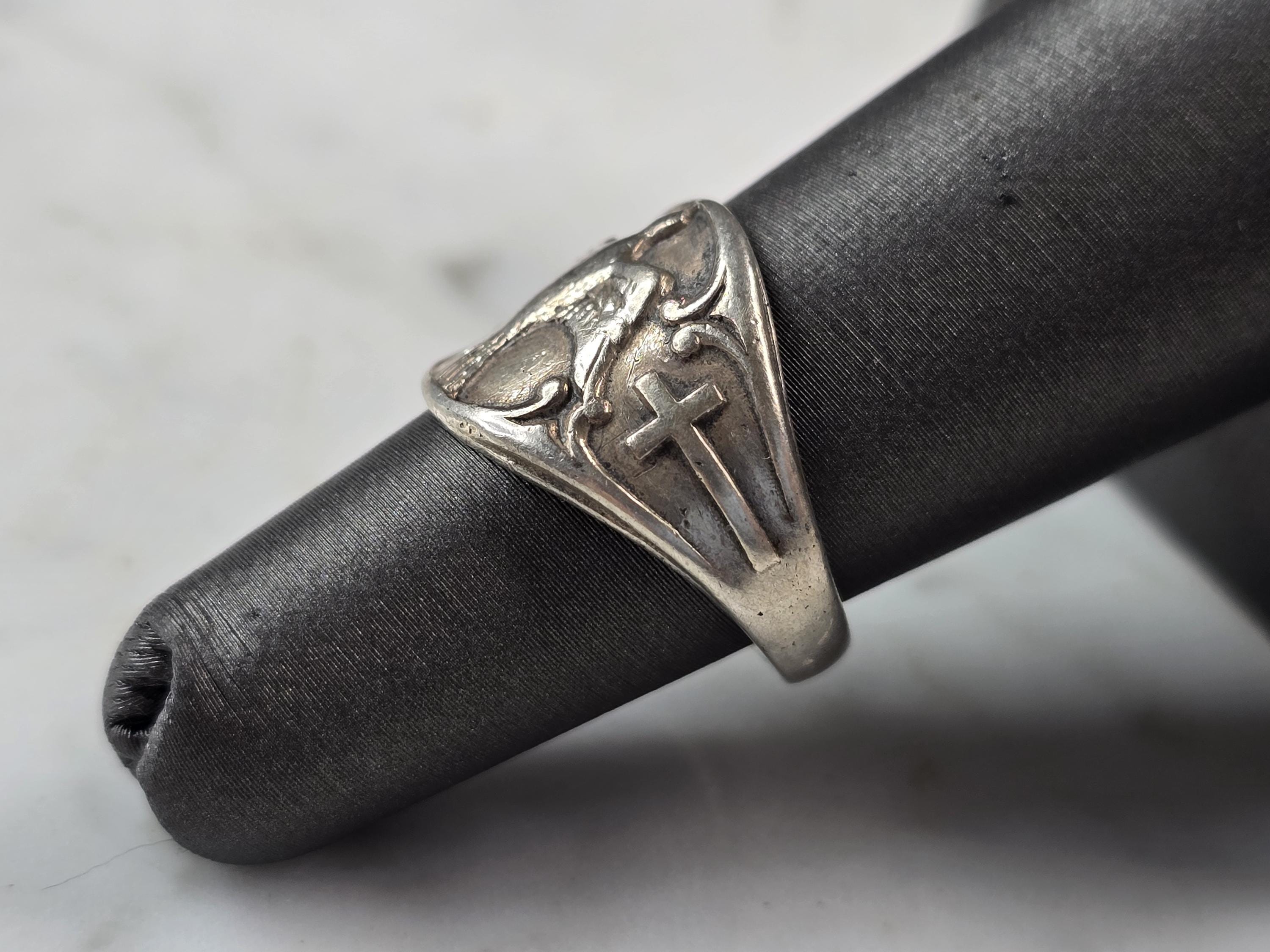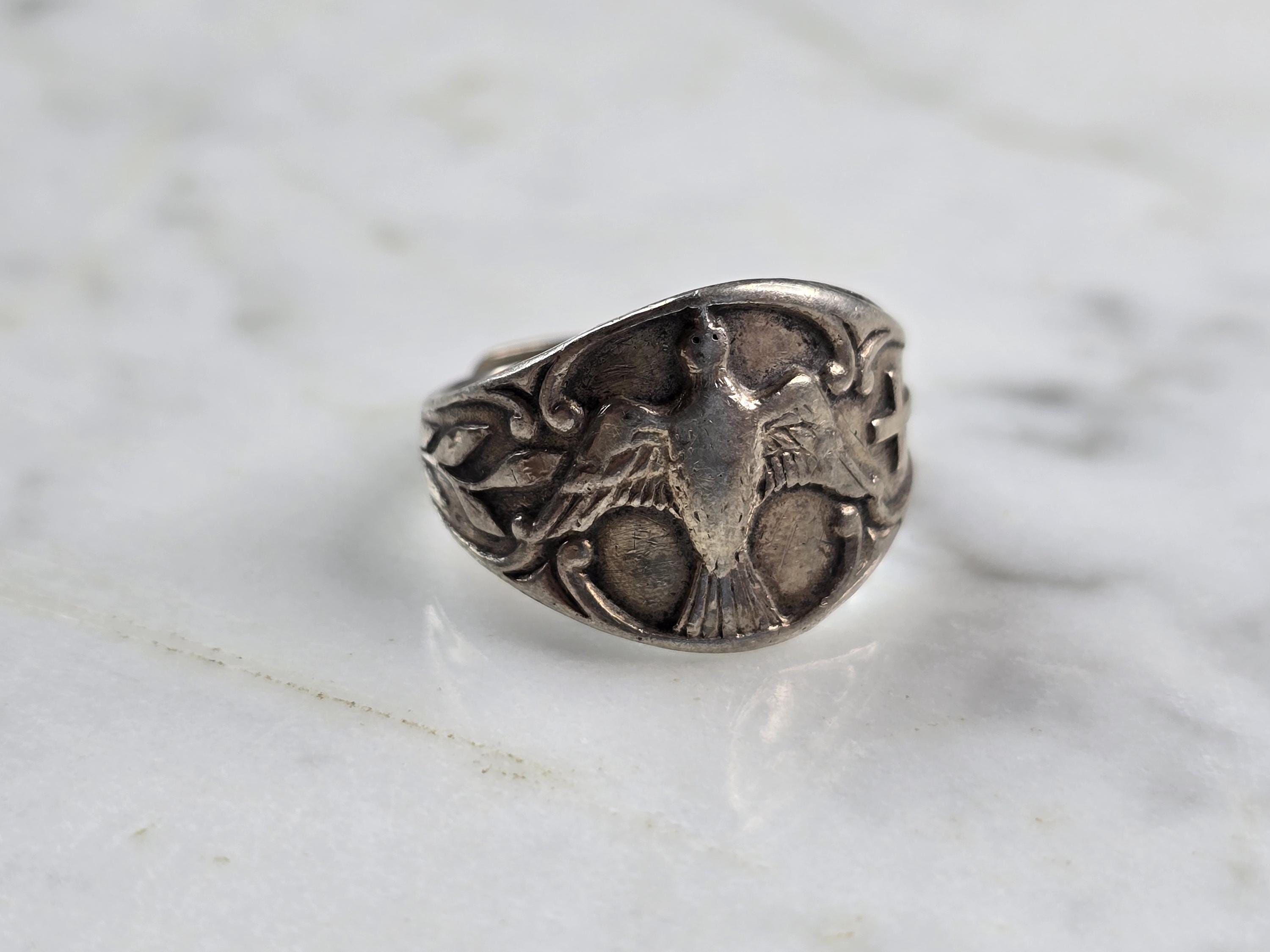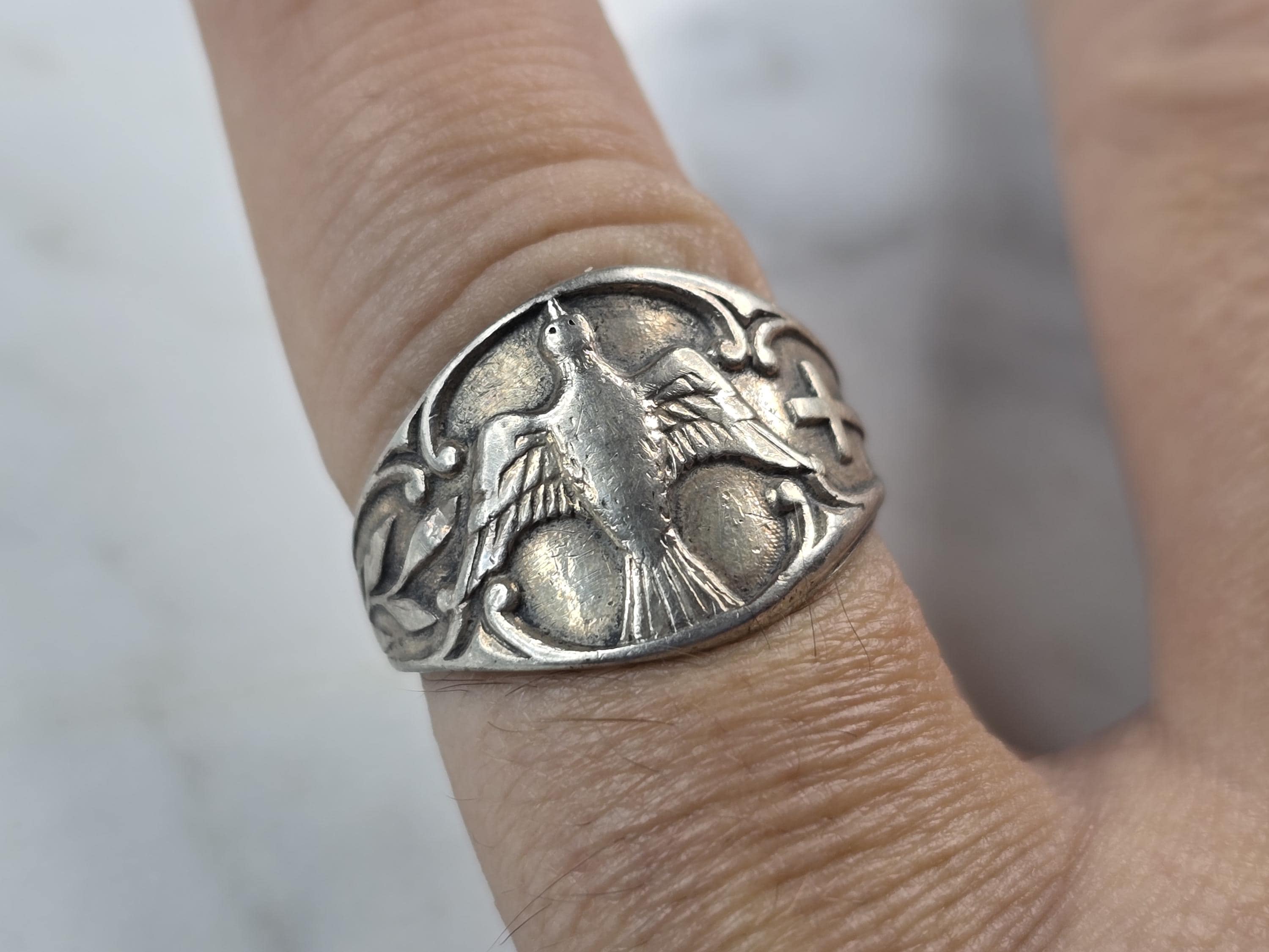 A WOMENS VINTAGE ESTATE STERLING SILVER RELIGIOUS DOVE CROSS RING. THE TOTAL WEIGHT IS 4.6g, AND IS A SIZE 6.0. THE WIDTH OF THE RING IS 1/2". RING SIZE CAN BE ADJUSTED SOME. THIS RING WOULD MAKE A GREAT GIFT FOR SOMEONE SPECIAL. ANY QUESTIONS PLEASE DONT HESITATE TO ASK. BE SURE TO CHECK OUT SOME OF OUR OTHER GREAT ITEMS UP FOR SALE. THANK YOU.