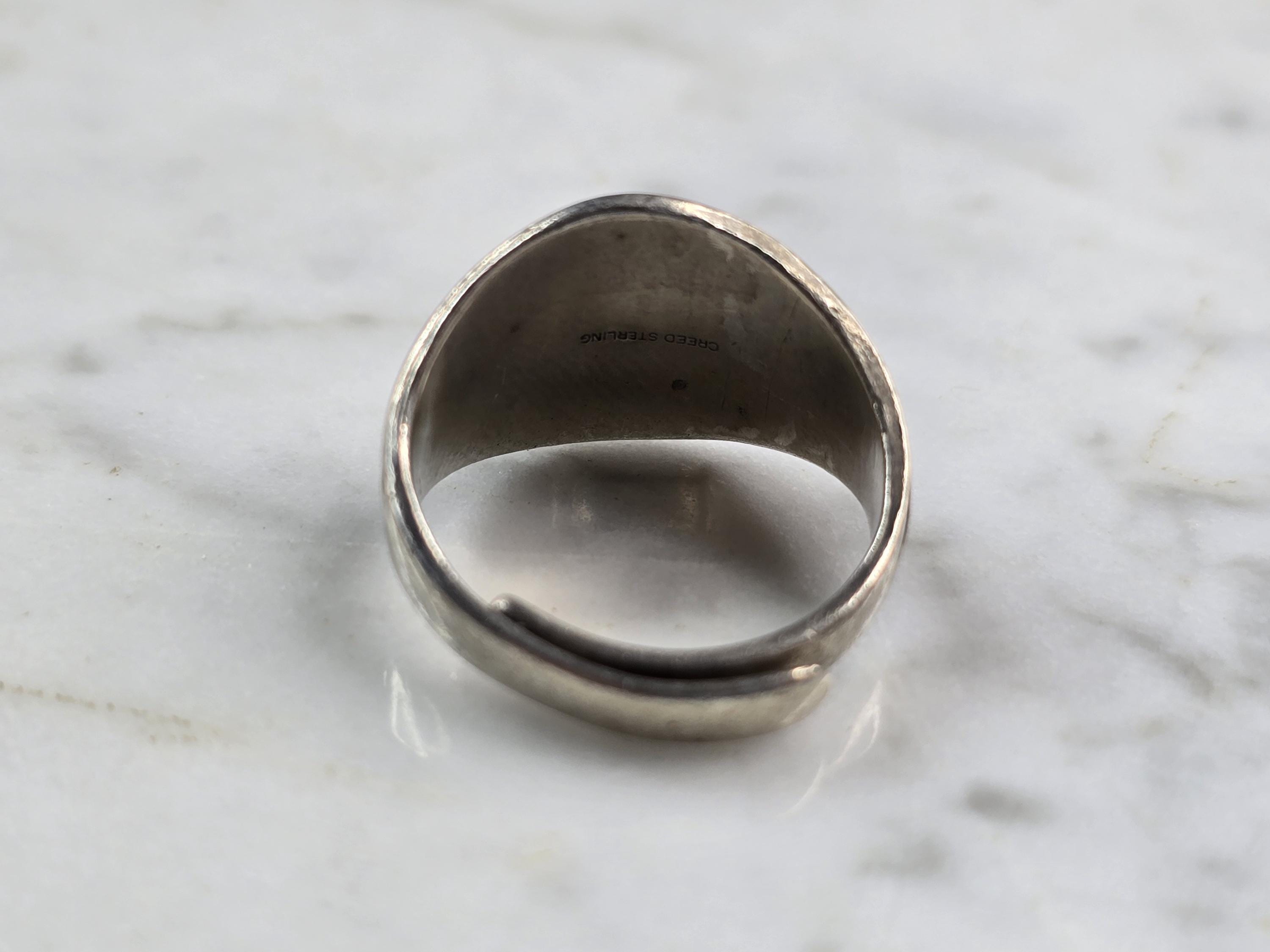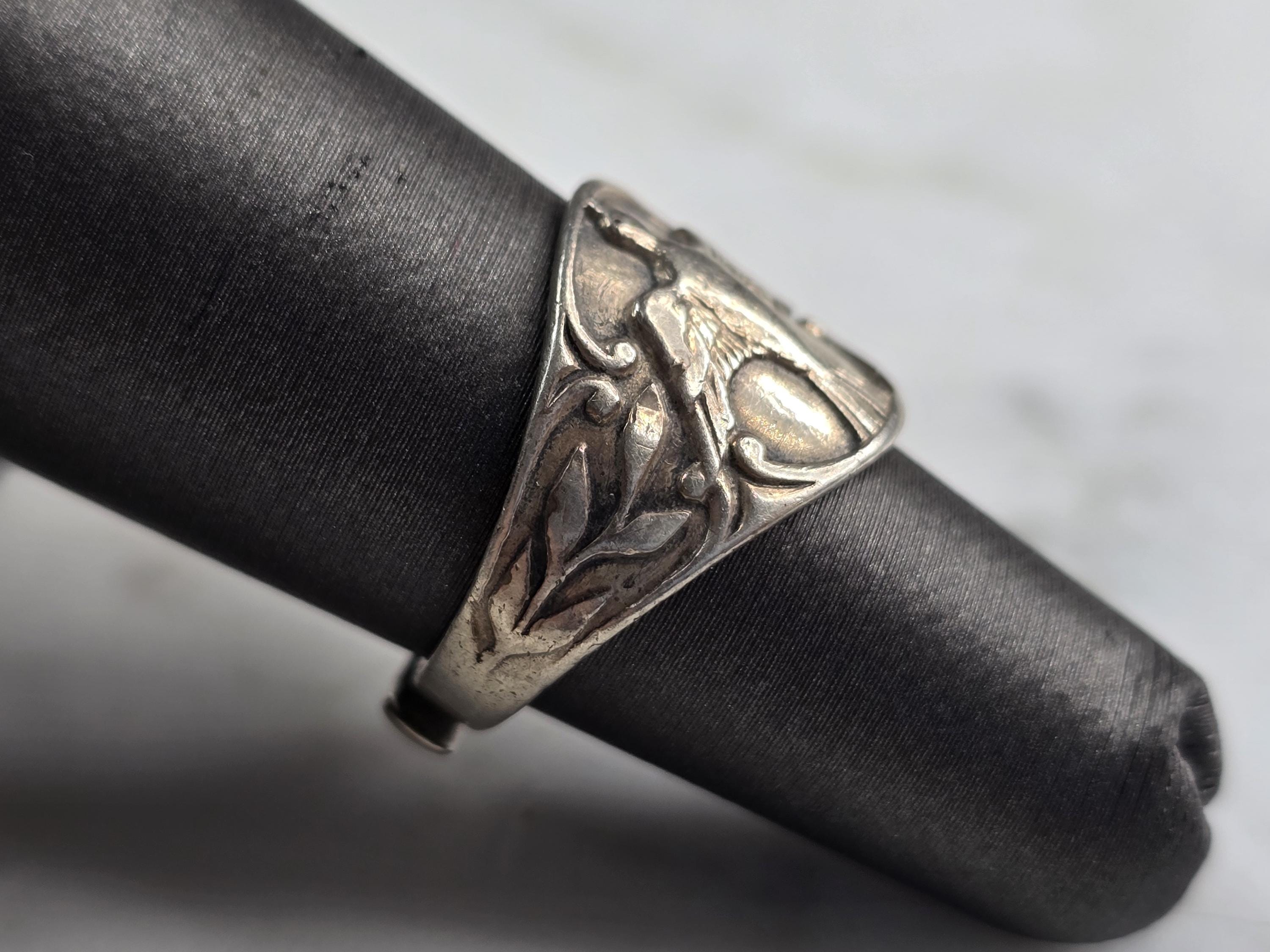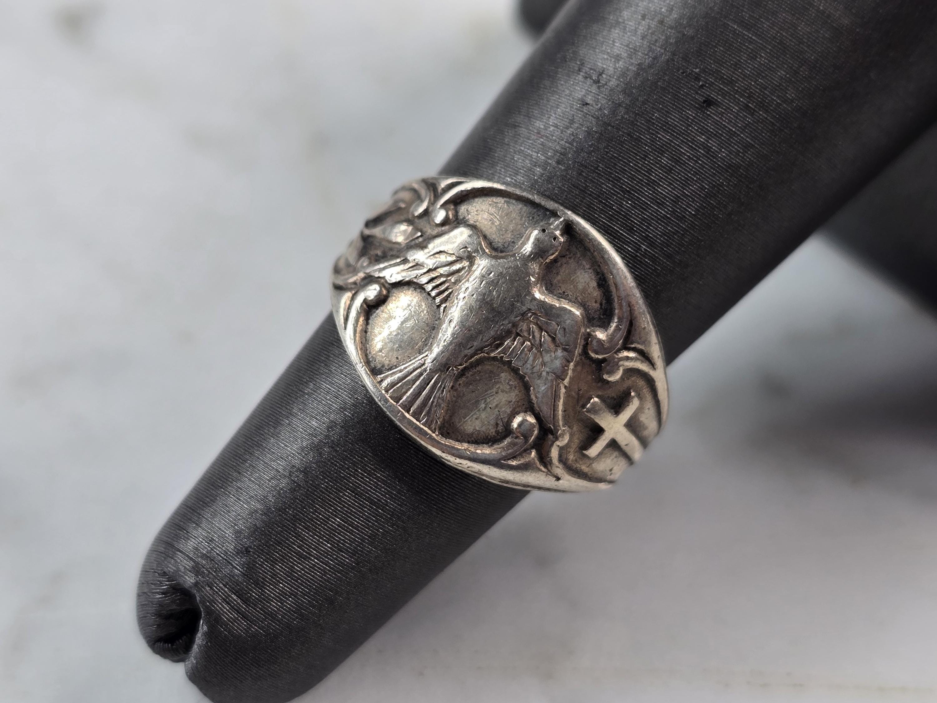 A WOMENS VINTAGE ESTATE STERLING SILVER RELIGIOUS DOVE CROSS RING. THE TOTAL WEIGHT IS 4.6g, AND IS A SIZE 6.0. THE WIDTH OF THE RING IS 1/2". RING SIZE CAN BE ADJUSTED SOME. THIS RING WOULD MAKE A GREAT GIFT FOR SOMEONE SPECIAL. ANY QUESTIONS PLEASE DONT HESITATE TO ASK. BE SURE TO CHECK OUT SOME OF OUR OTHER GREAT ITEMS UP FOR SALE. THANK YOU.