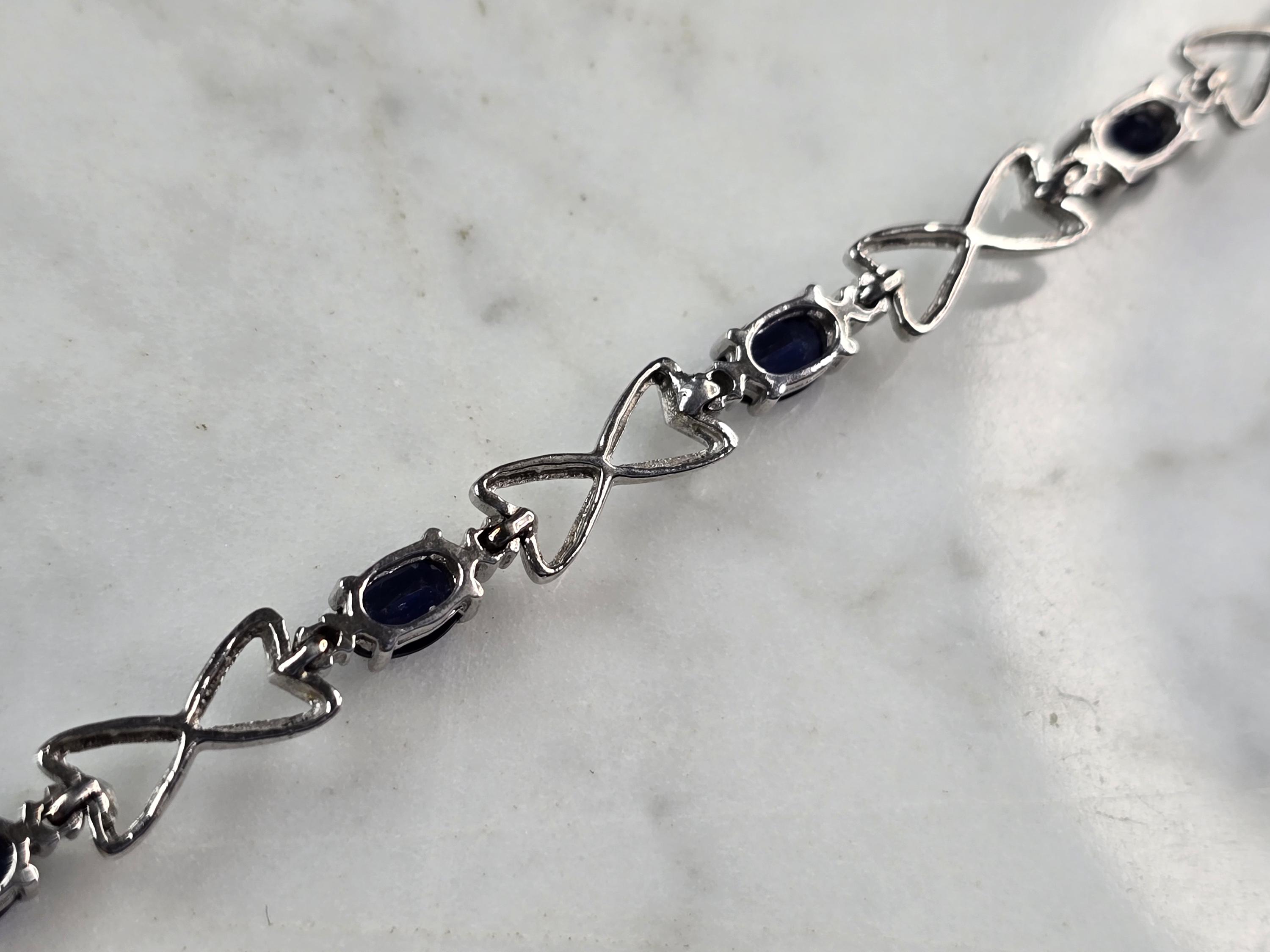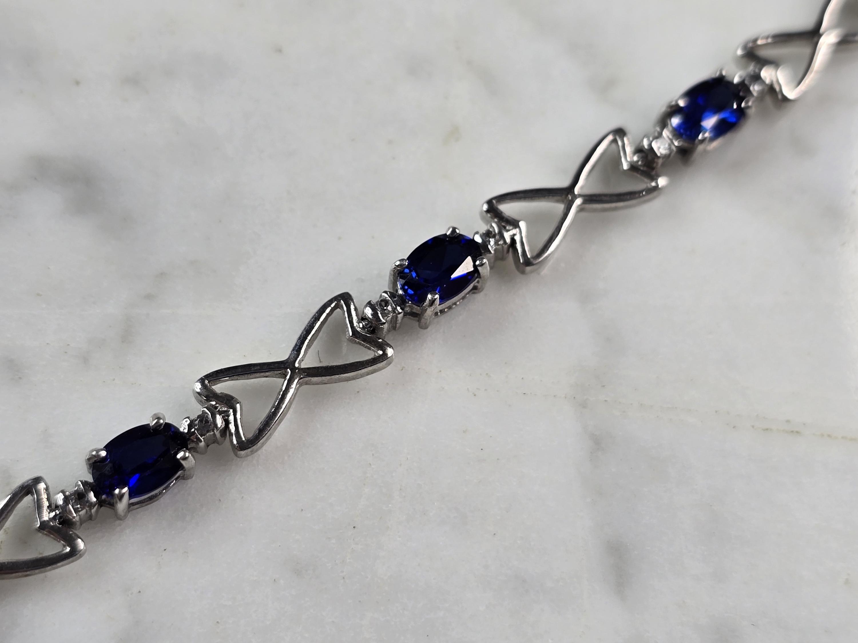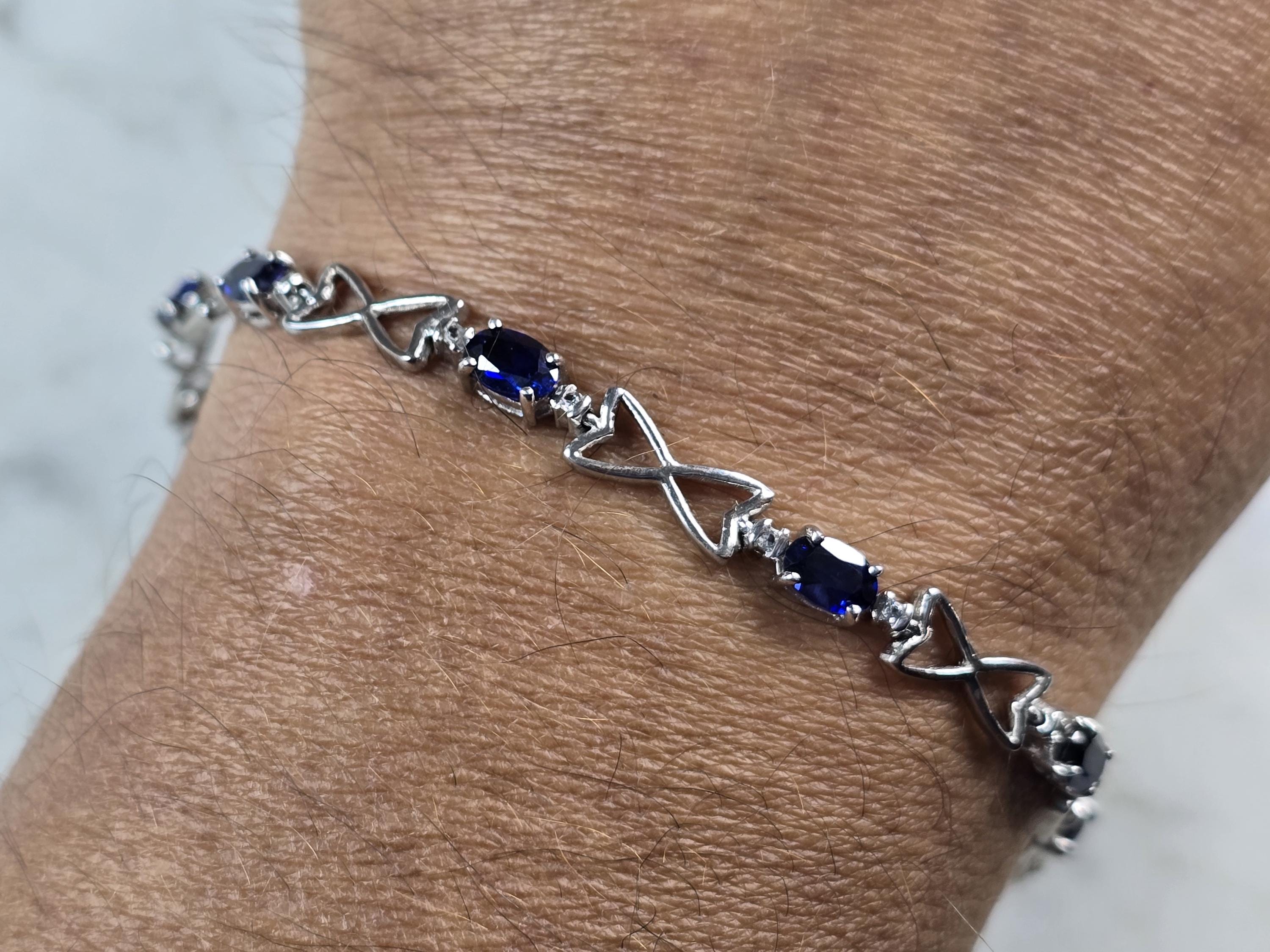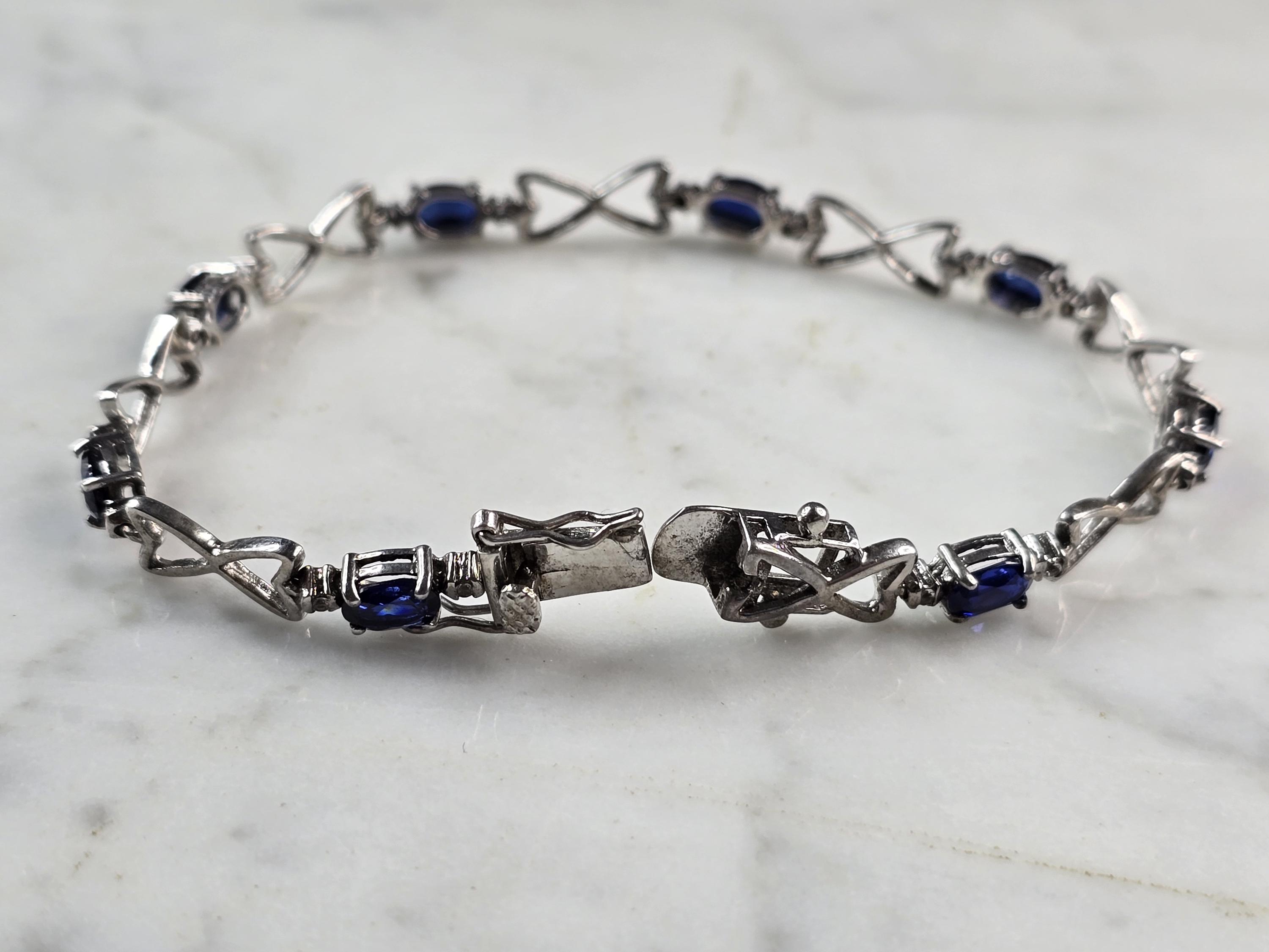 A WOMENS VINTAGE ESTATE STERLING SILVER SAPPHIRE COLORED STONE BRACELET. BRACELET MEASURES 7 1/2" LONG BY 1/4" WIDE AND WEIGHS 8.7g. NOT SURE IF STONES ARE NATURAL OR MAN MADE. THIS WOULD MAKE A LOVELY GIFT FOR THAT SOMEONE SPECIAL. ANY QUESTIONS, PLEASE DON'T HESITATE TO ASK. BE SURE TO CHECK OUT SOME OF MY OTHER GREAT ITEMS UP FOR SALE. THANK YOU.