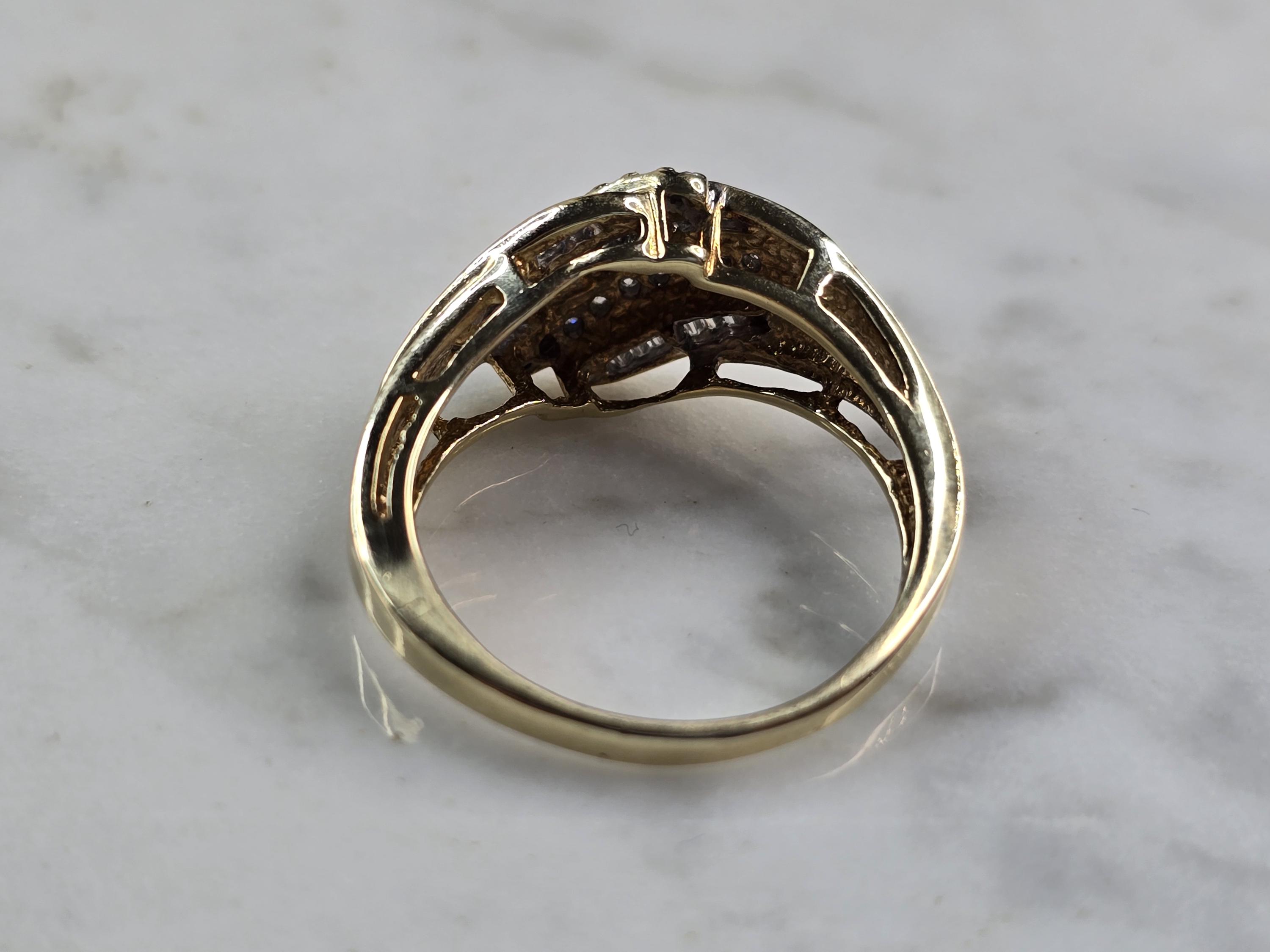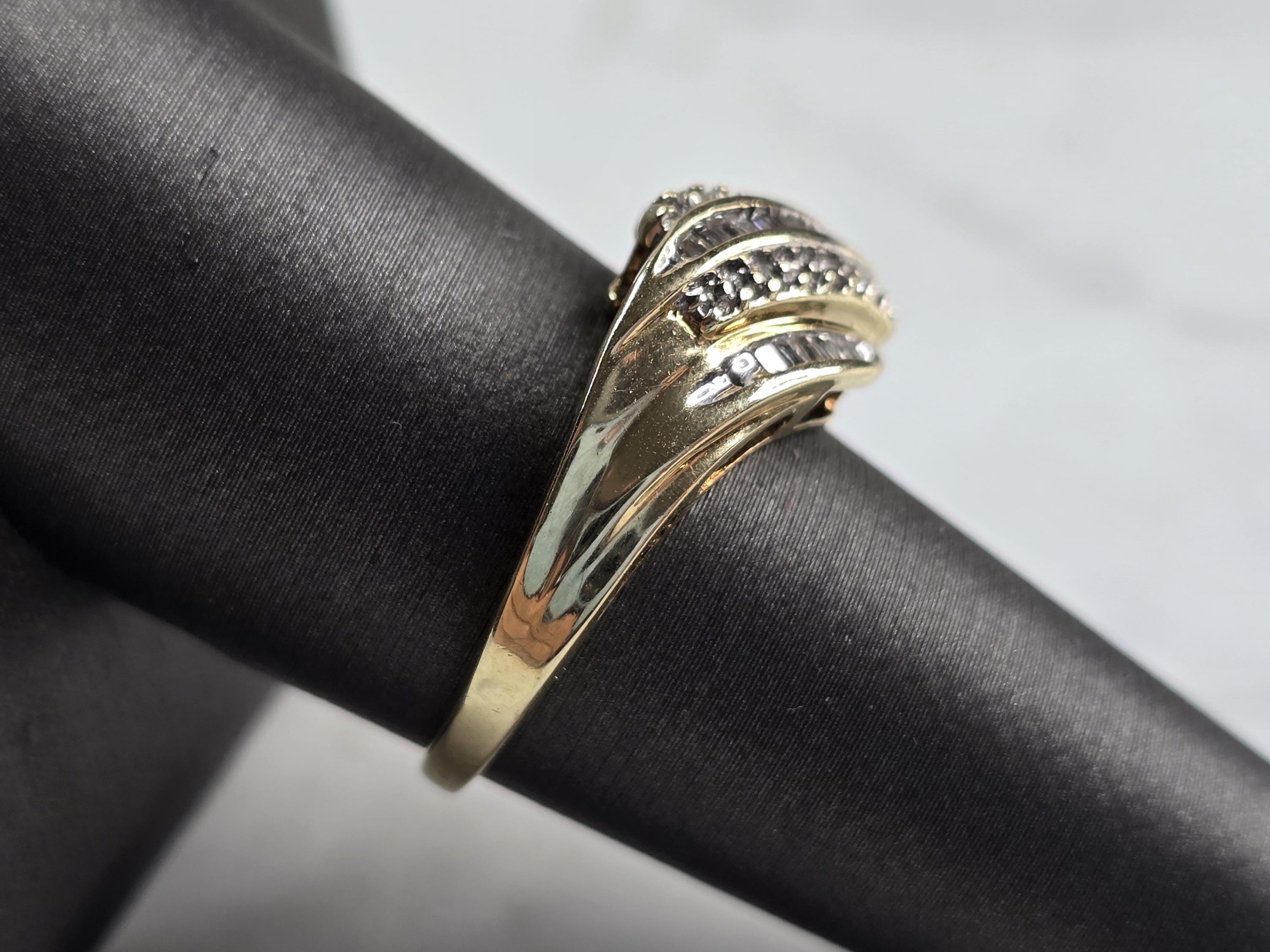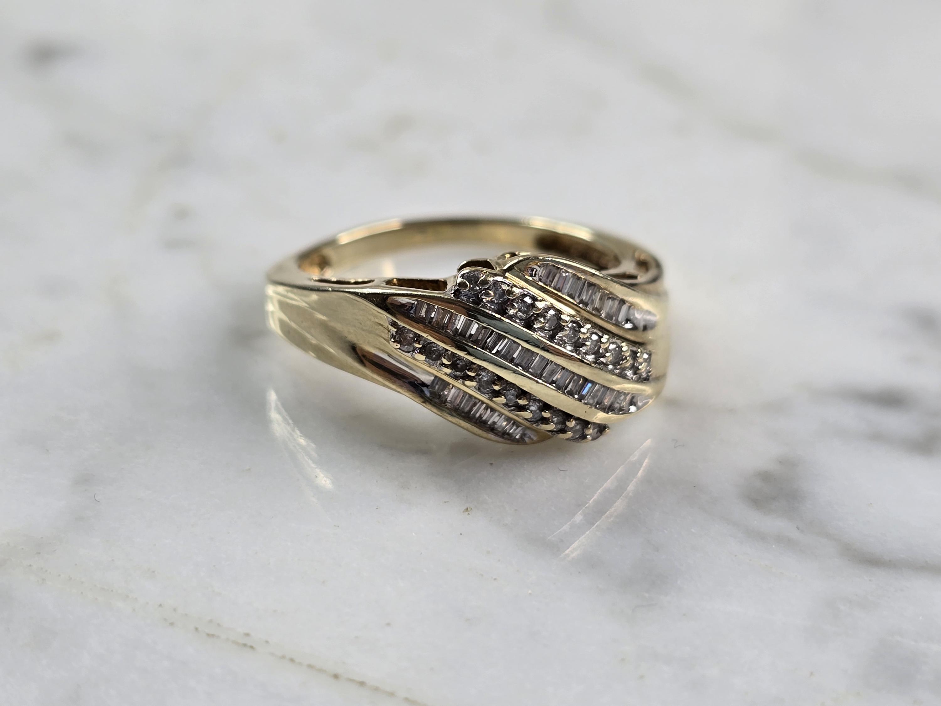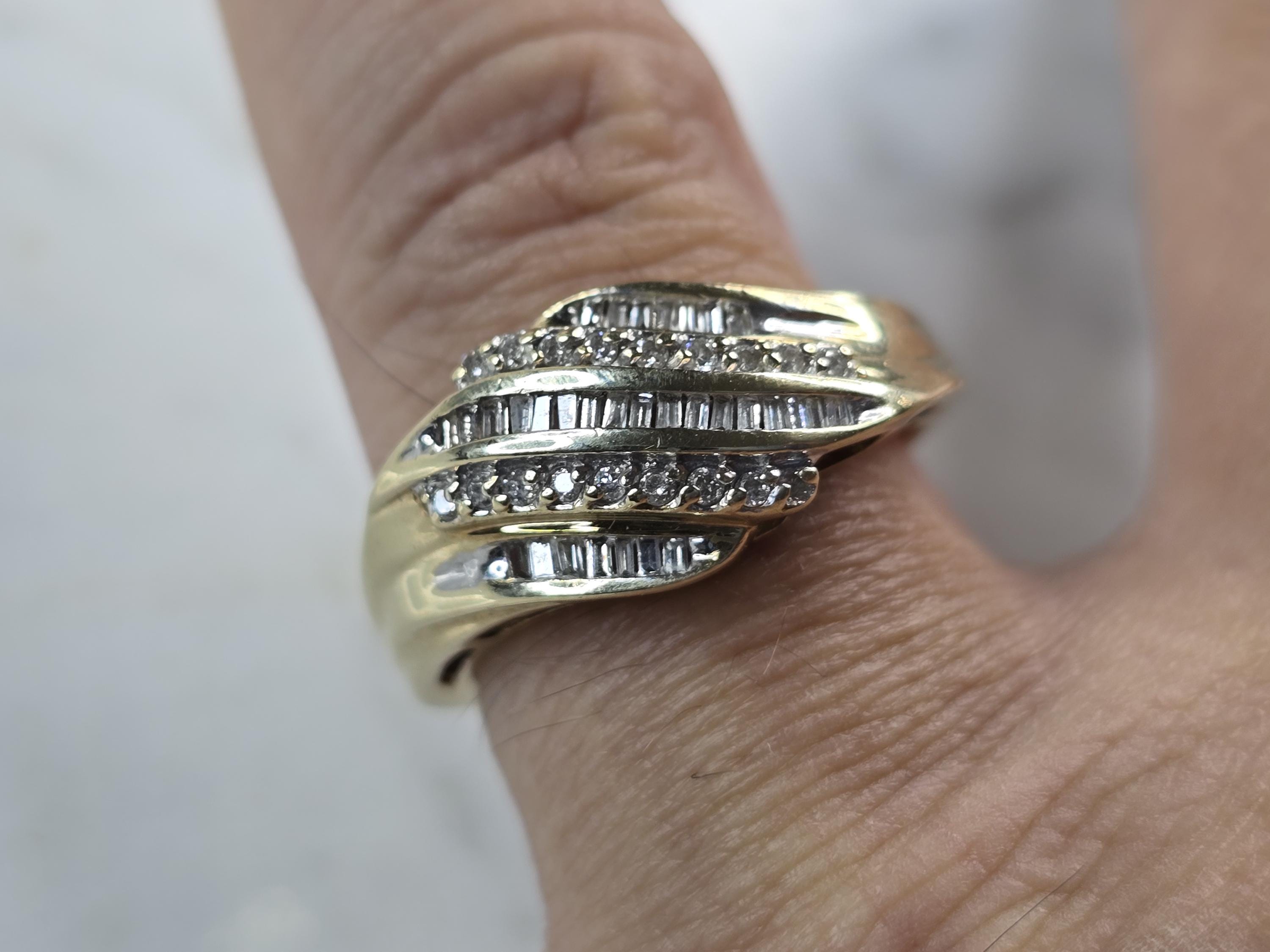 A WOMENS VINTAGE ESTATE 10K YELLOW GOLD DIAMOND RING. THERE ARE 31 BAGUETTE DIAMONDS, AND 18 TINY ROUND DIAMONDS IN THIS RING. THE TOTAL WEIGHT IS 4.0g, AND IS A SIZE 8.25. THE WIDTH OF THE RING IS 1/2". ANY QUESTIONS PLEASE DONT HESITATE TO ASK. BE SURE TO CHECK OUT SOME OF OUR OTHER GREAT ITEMS UP FOR SALE. THANK YOU.