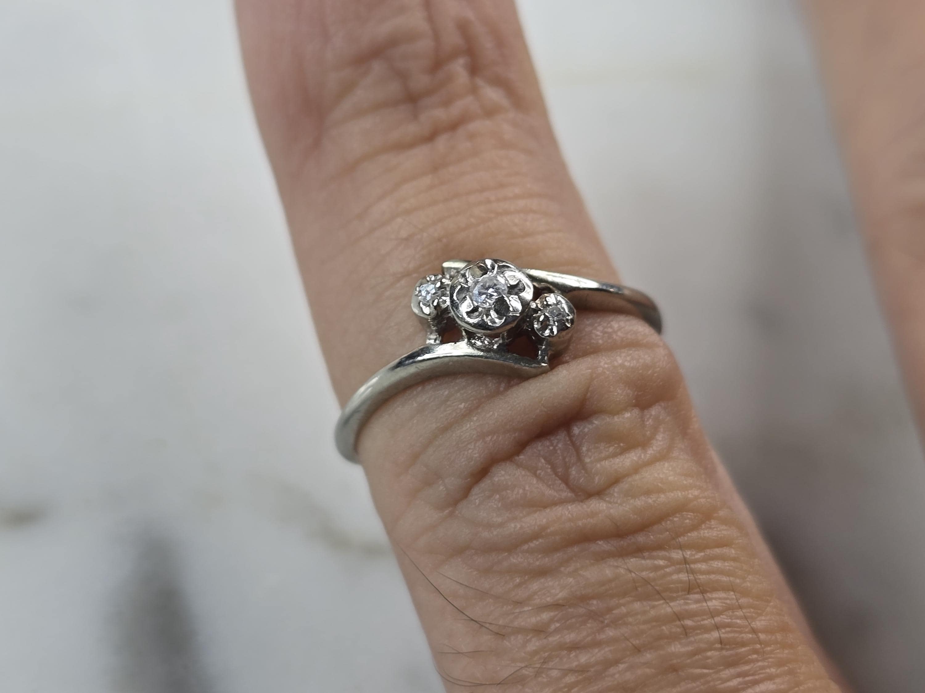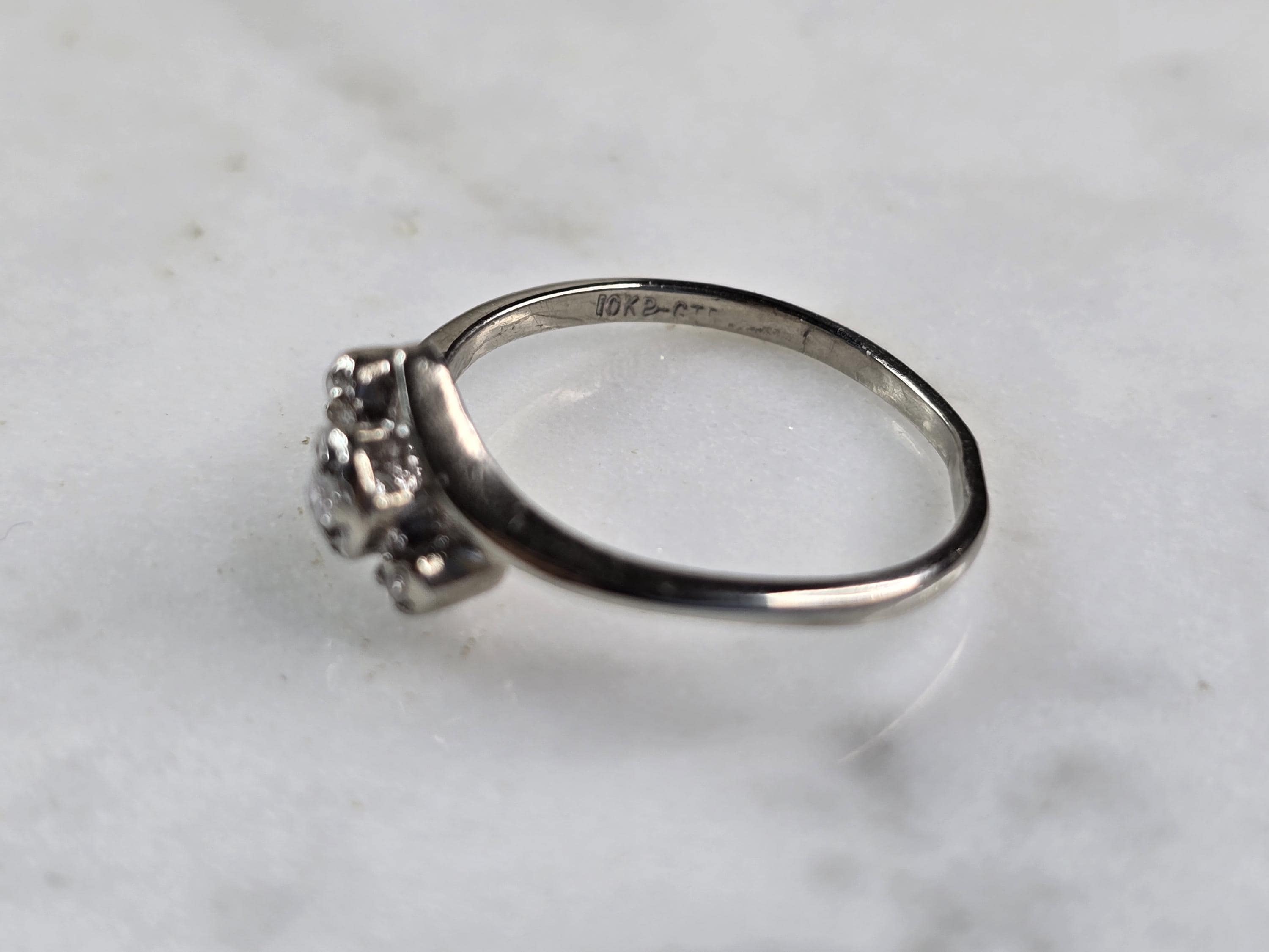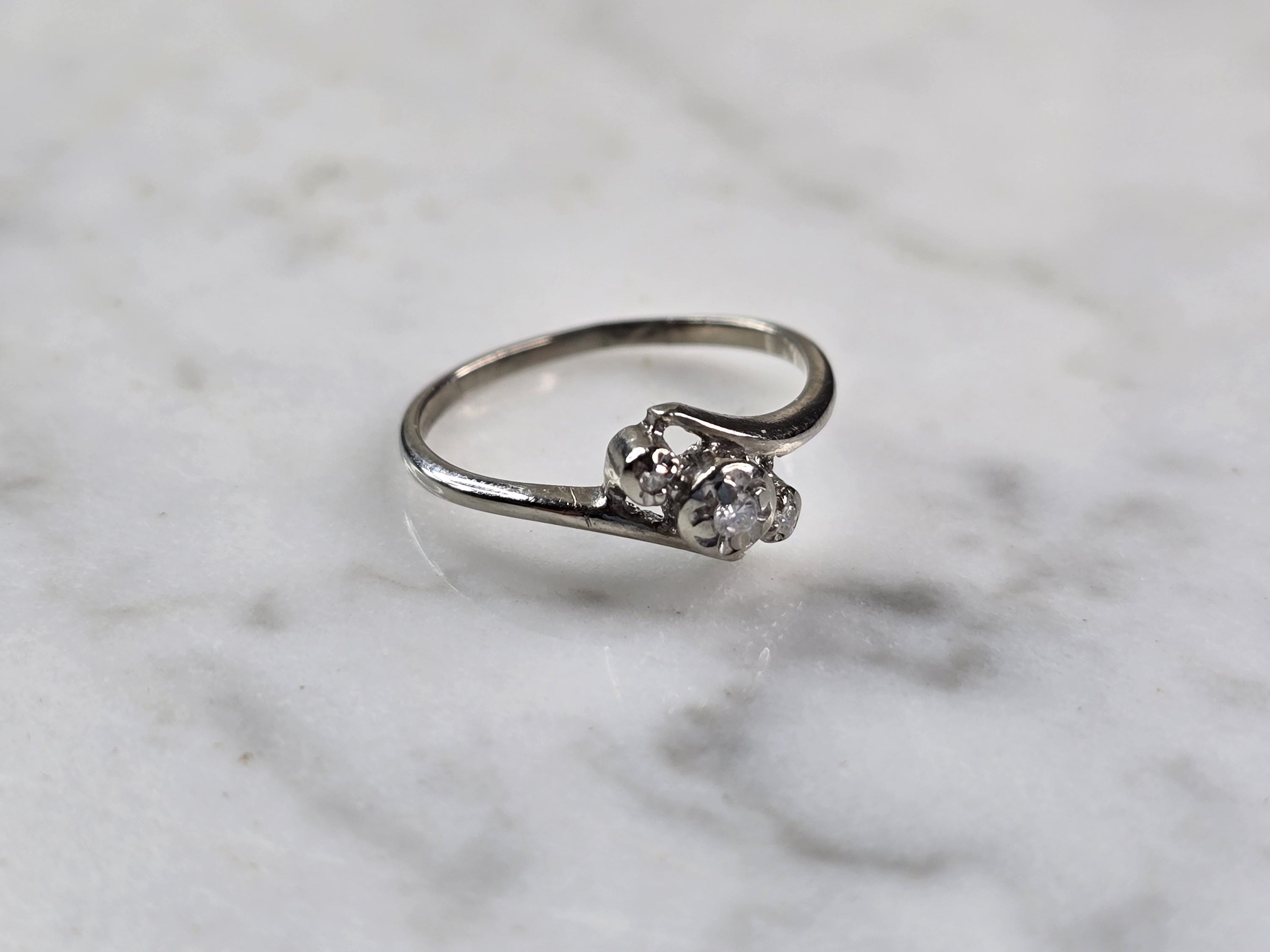 A WOMENS VINTAGE ESTATE 10K WHITE GOLD DIAMOND RING. THERE ARE 3 TINY DIAMONDS IN THIS RING. THE TOTAL WEIGHT IS 1.2g, AND IS A SIZE 4.75. THE WIDTH OF THE RING IS 1/4". ANY QUESTIONS PLEASE DONT HESITATE TO ASK. BE SURE TO CHECK OUT SOME OF OUR OTHER GREAT ITEMS UP FOR SALE. THANK YOU.