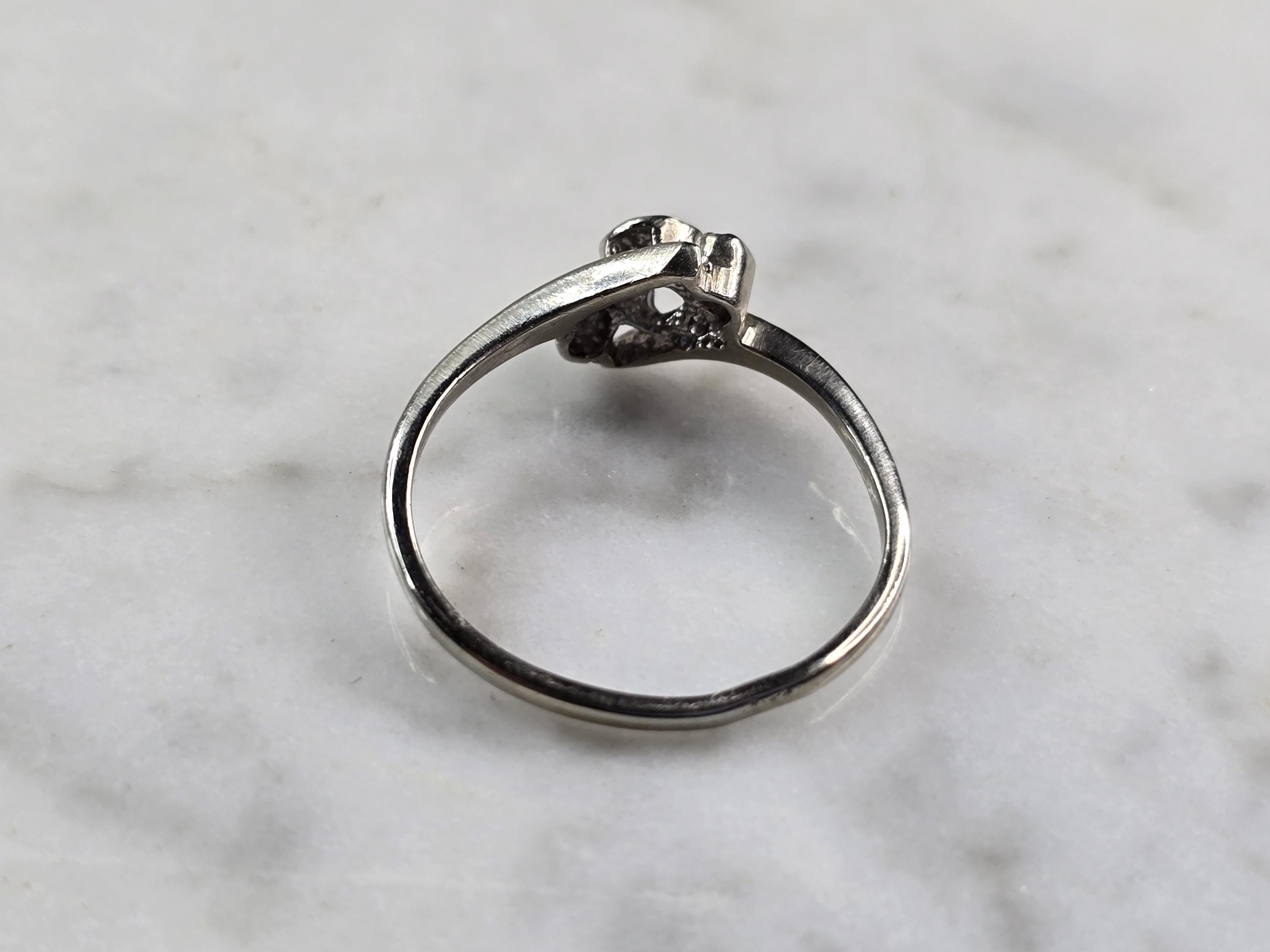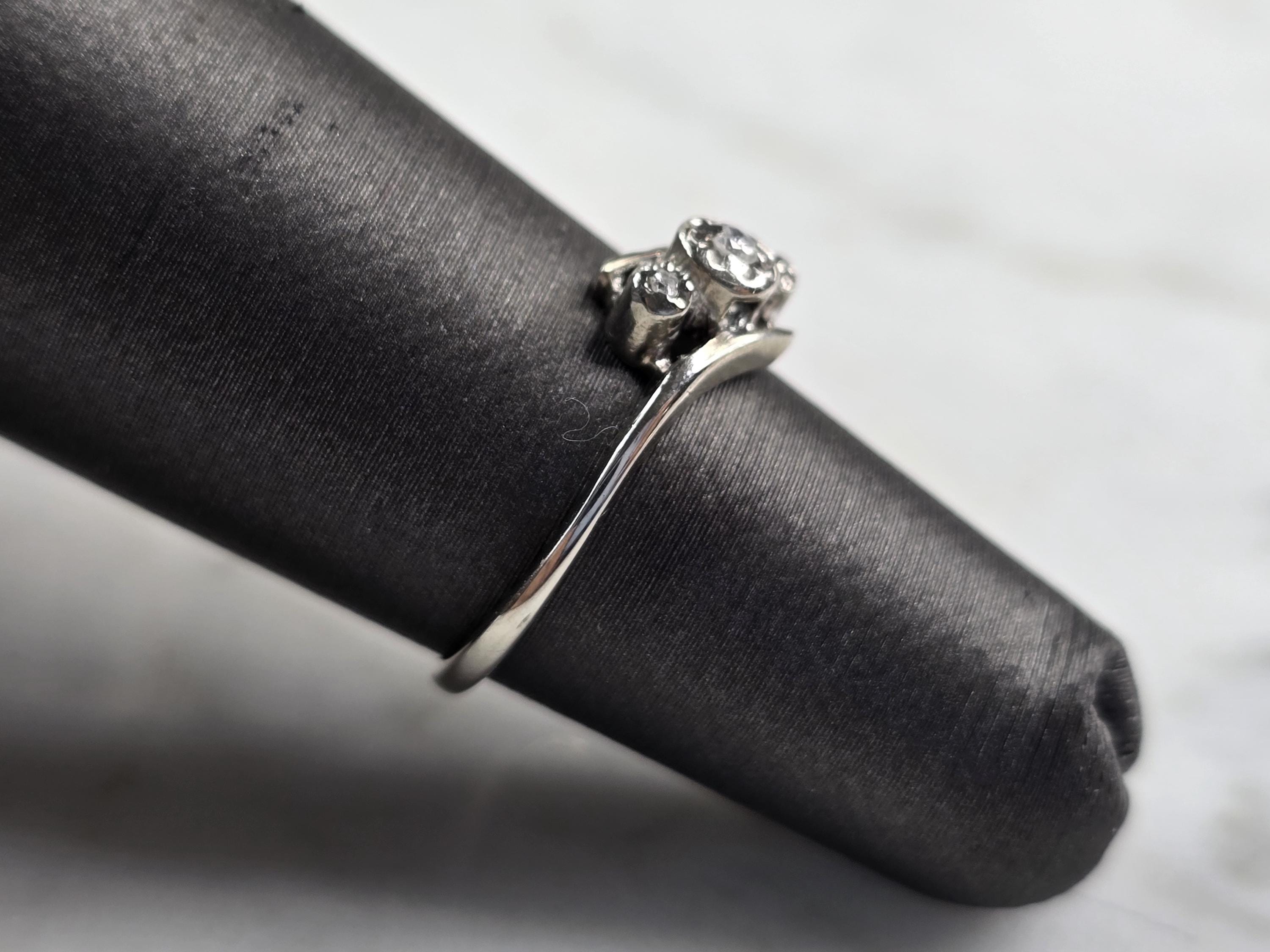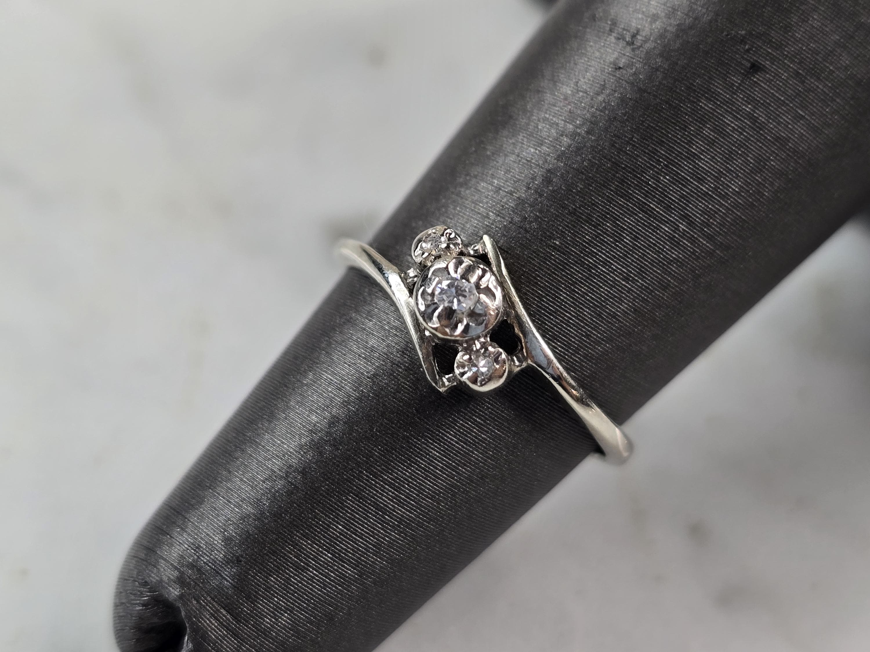 A WOMENS VINTAGE ESTATE 10K WHITE GOLD DIAMOND RING. THERE ARE 3 TINY DIAMONDS IN THIS RING. THE TOTAL WEIGHT IS 1.2g, AND IS A SIZE 4.75. THE WIDTH OF THE RING IS 1/4". ANY QUESTIONS PLEASE DONT HESITATE TO ASK. BE SURE TO CHECK OUT SOME OF OUR OTHER GREAT ITEMS UP FOR SALE. THANK YOU.