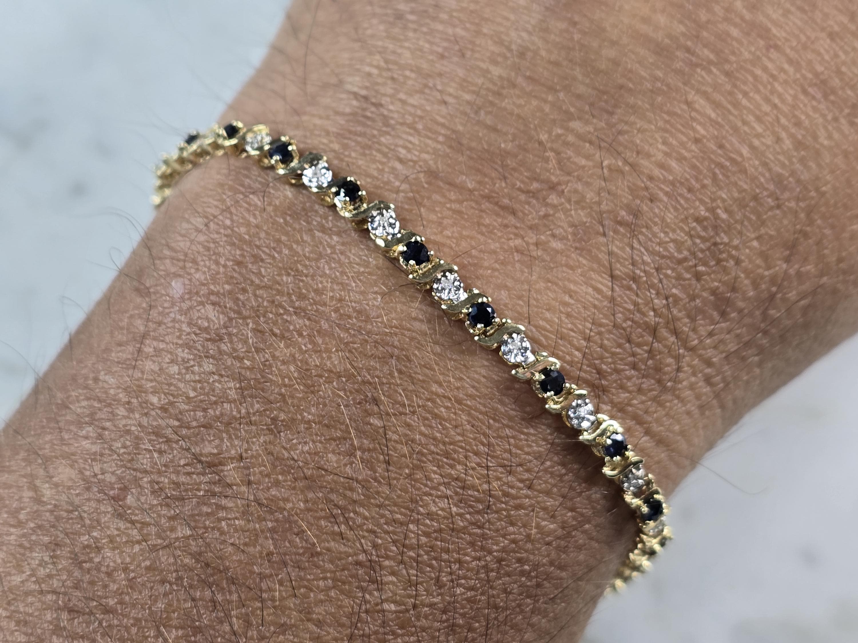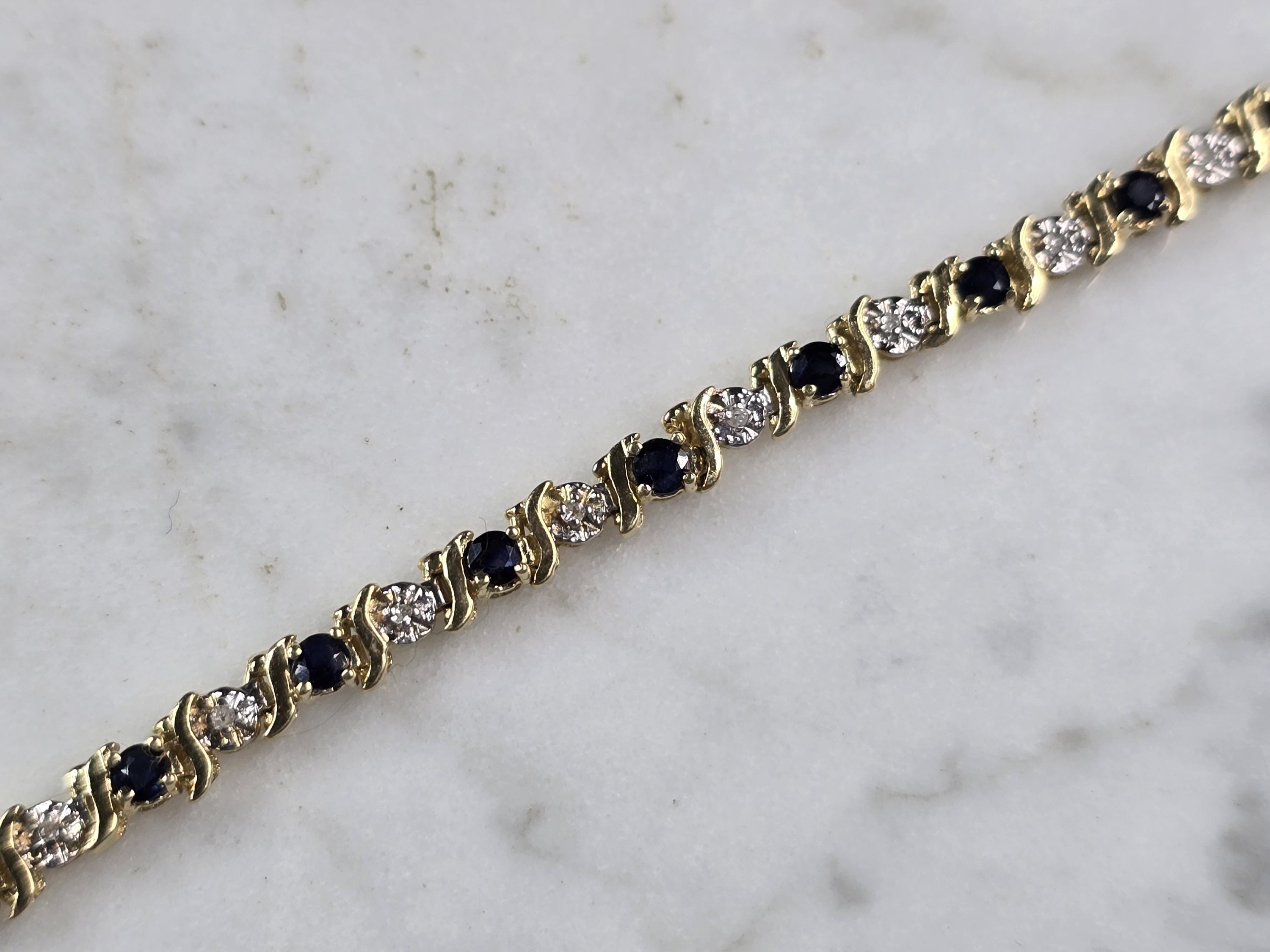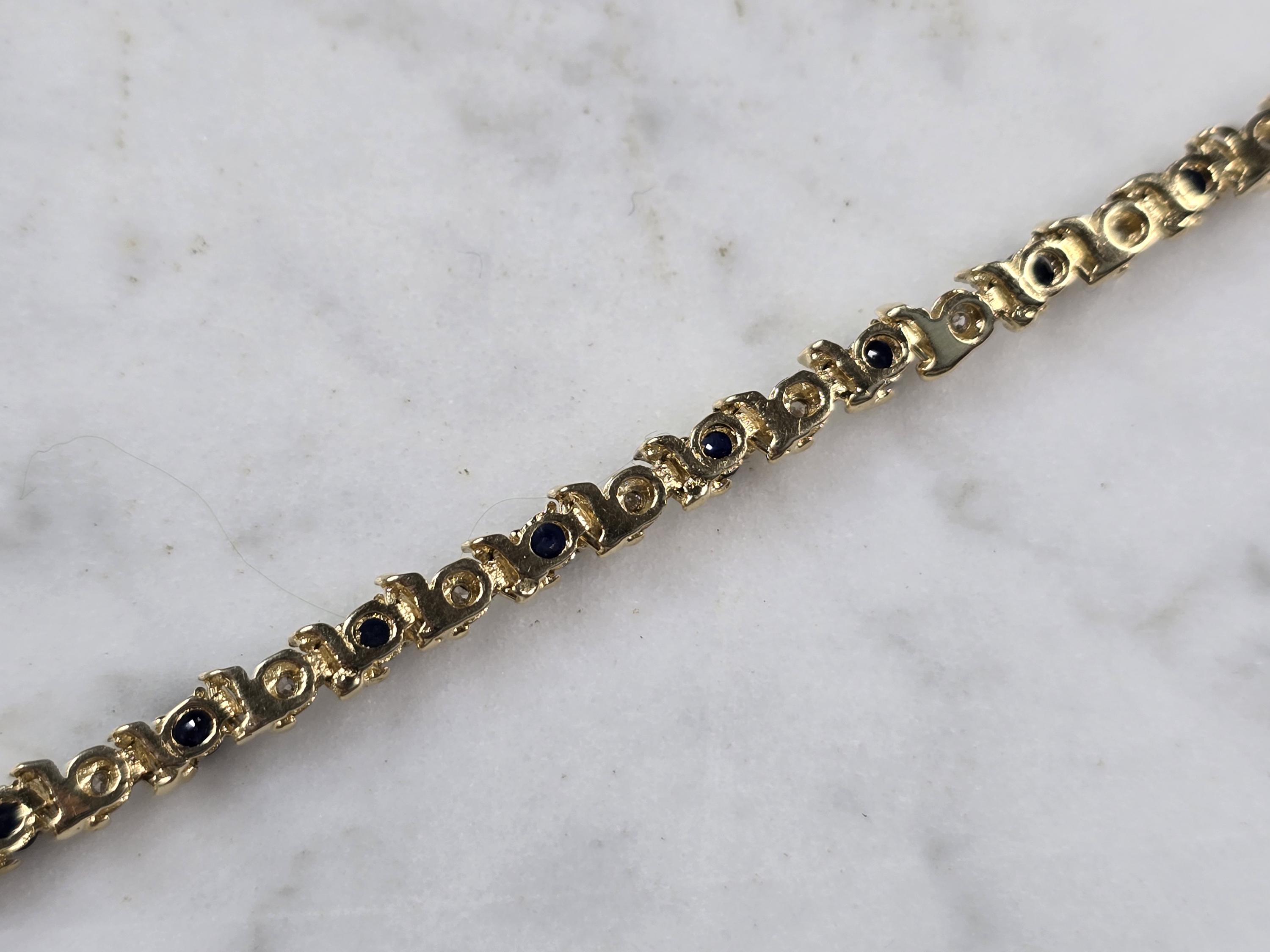 A WOMENS VINTAGE ESTATE 14K GOLD DIAMOND & SAPPHIRE TENNIS BRACELET. BRACELET IS 7 1/2" LONG BY 1/8" WIDE, AND WEIGHS 7.0g. THERE ARE 22 TINY DIAMONDS, AND 22 TINY SAPPHIRES. THIS WOULD MAKE A LOVELY GIFT FOR THAT SOMEONE SPECIAL. BE SURE TO CHECK OUT SOME OF MY OTHER GREAT ITEMS UP FOR SALE. THANK YOU