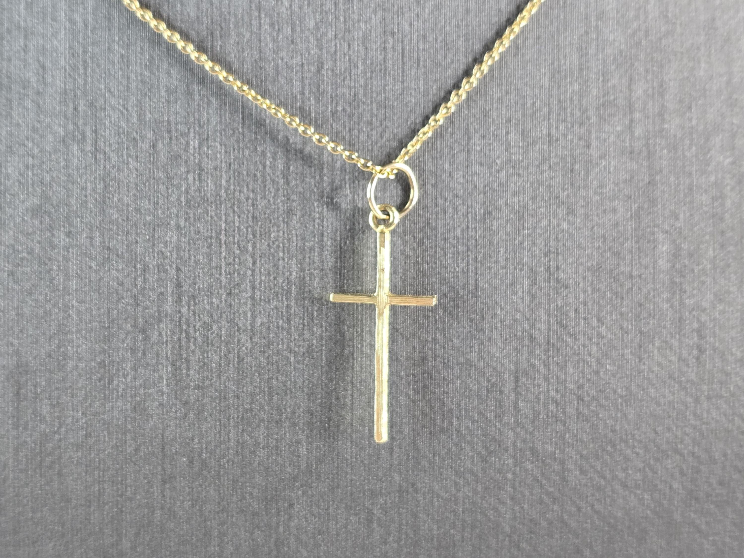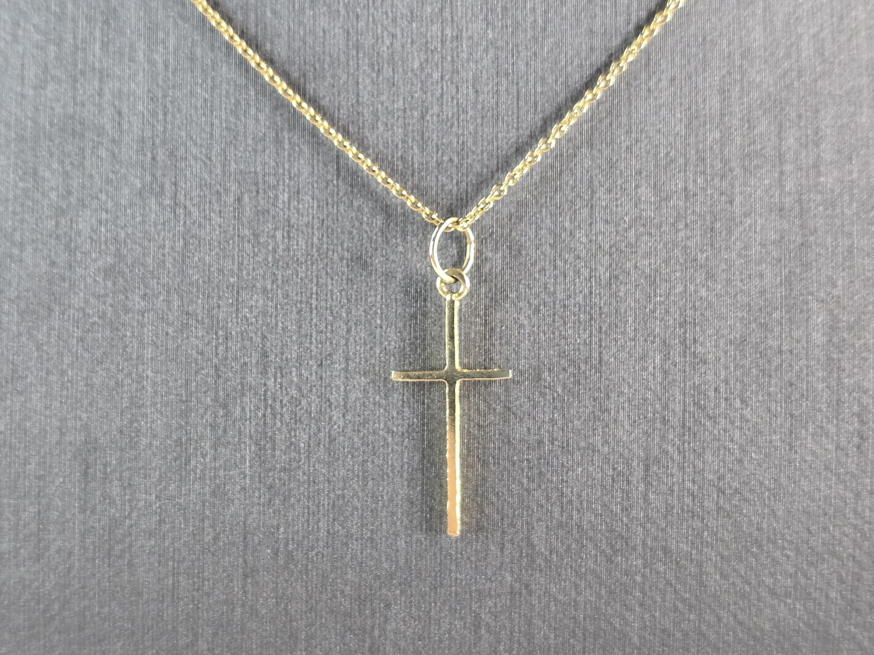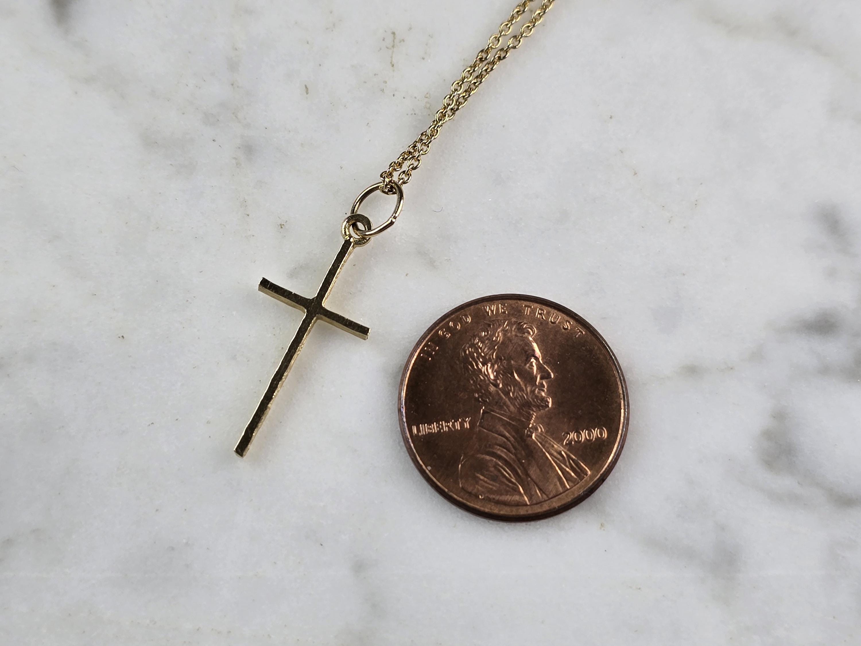 A WOMENS VINTAGE ESTATE 14K GOLD NECKLACE WITH A CROSS PENDANT. TOGETHER THE CROSS AND NECKLACE WEIGHS 2.2g. THE PENDANT MEASURES 1" BY 3/8". THE NECKLACE MEASURES 18 1/2" LONG. WOULD MAKE A LOVELY GIFT FOR THAT SOMEONE SPECIAL. ANY QUESTIONS, PLEASE ASK. BE SURE TO CHECK OUT OUR OTHER ITEMS FOR SALE.
