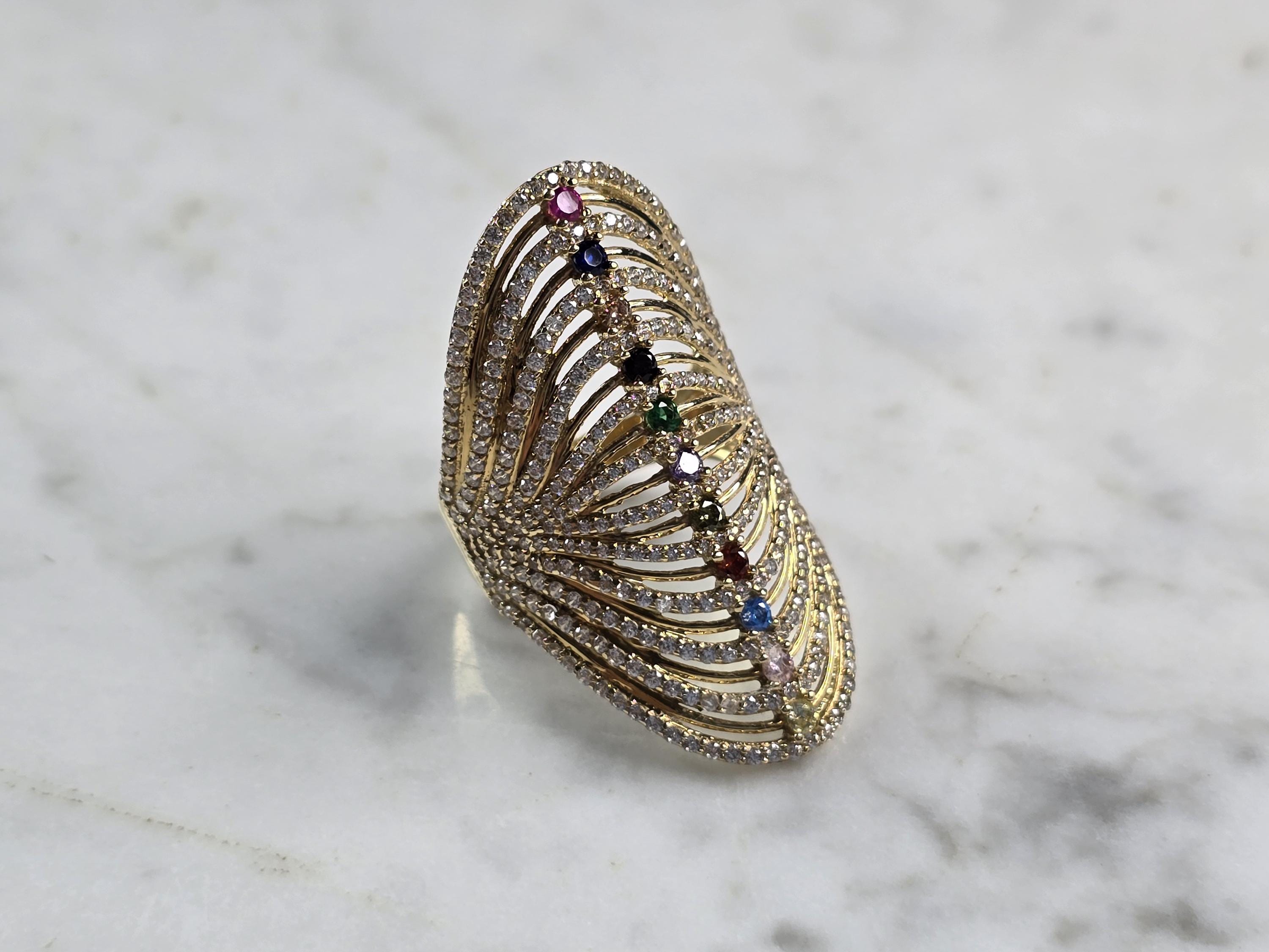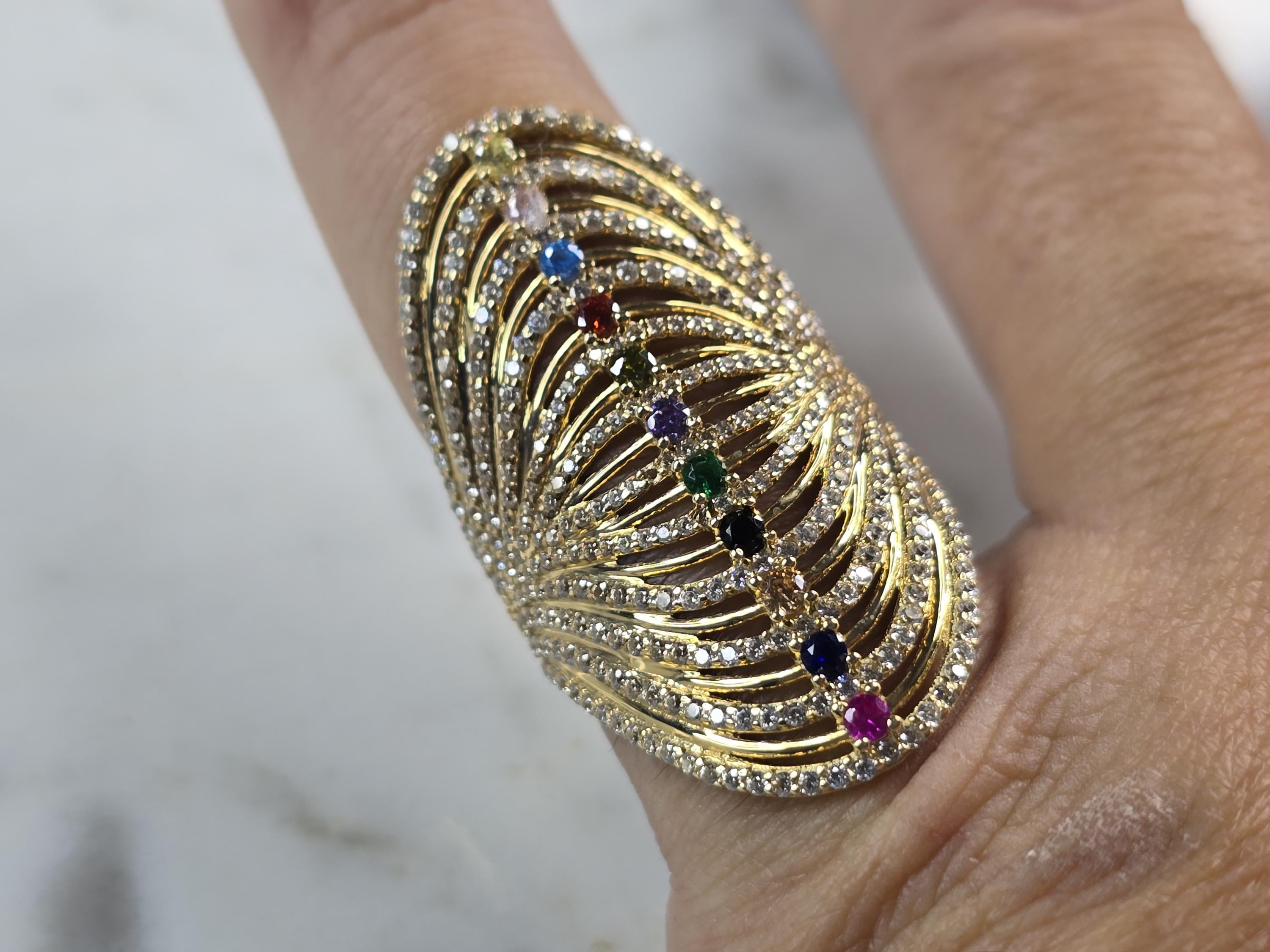 A UNIQUE WOMENS 14K YELLOW GOLD MODERNIST RING WITH MULTI COLORED STONES. THE RING SIZE IS A 7.0, AND WEIGHS 6.2g. THE LENGTH OF THE RING IS 1 1/2". RING HAS A FAINT MARK ON THE INSIDE. STONES ARE MAN MADE. THIS WOULD MAKE A NICE GIFT FOR THAT SOMEONE SPECIAL. ANY QUESTIONS, PLEASE DO NOT HESITATE TO ASK. BE SURE TO CHECK OUT MY OTHER GREAT ITEMS UP FOR SALE. THANK YOU.