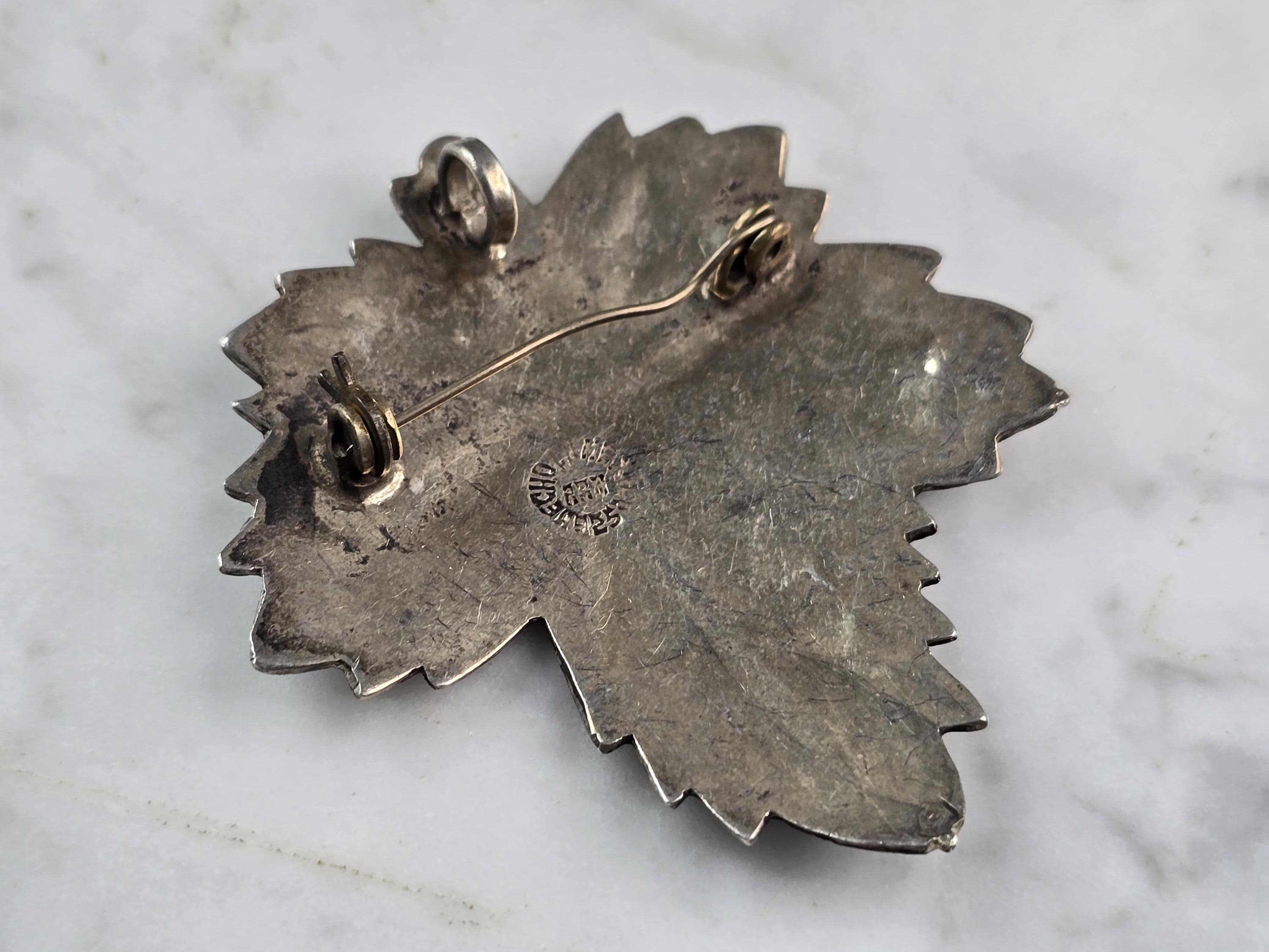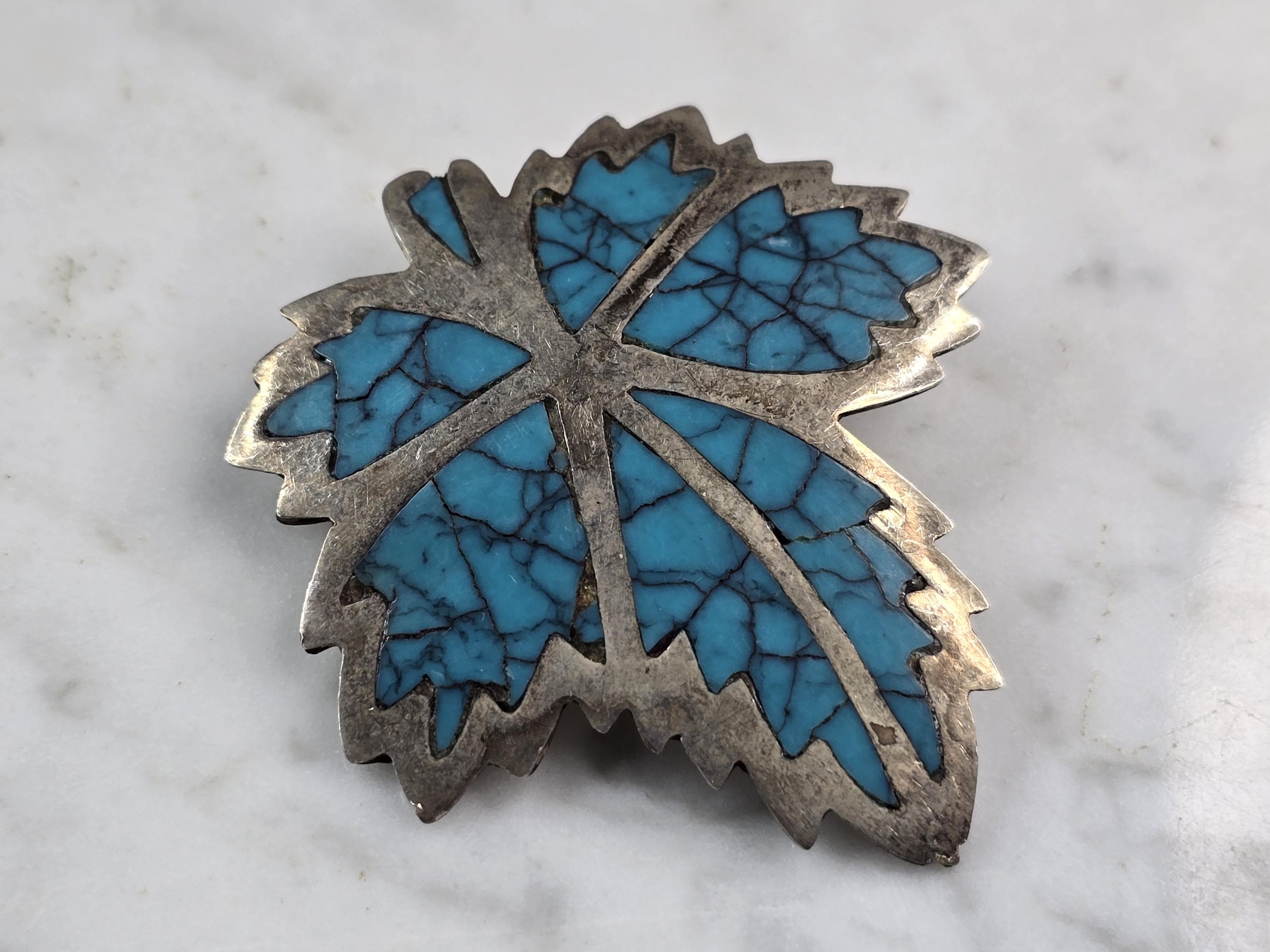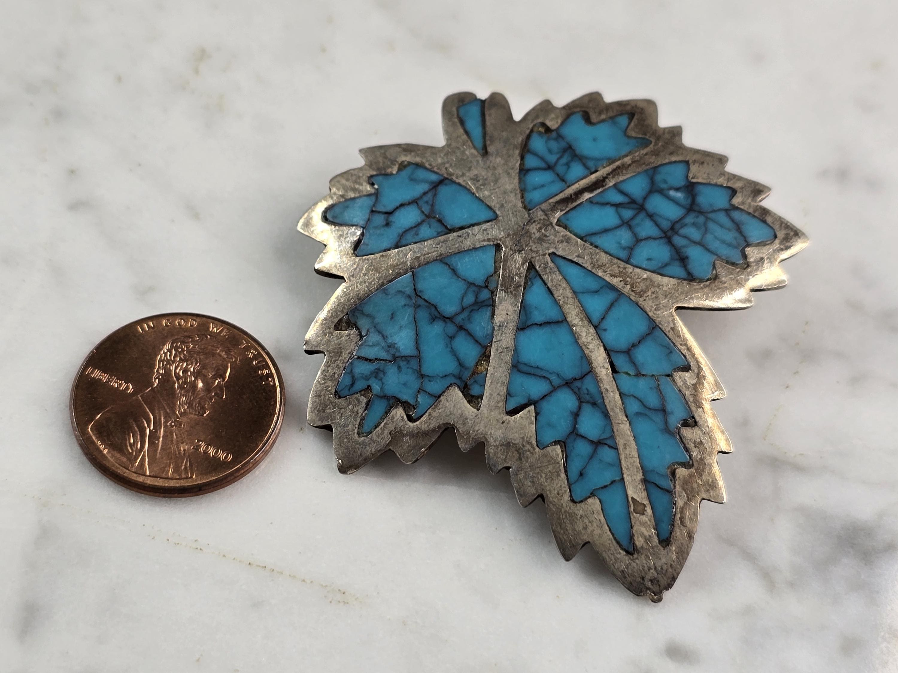 A WOMENS VINTAGE ESTATE STERLING SILVER TURQUOISE MAPLE LEAF BROOCH. THE TOTAL WEIGHT OF THE BROOCH IS 9.2g. THE BROOCH MEASURES 2" BY 2". MAKES A GREAT GIFT FOR THAT SPECIAL SOMEONE. ANY QUESTIONS, PLEASE ASK. BE SURE TO CHECK OUT SOME OF OUR OTHER GREAT ITEMS FOR SALE.
