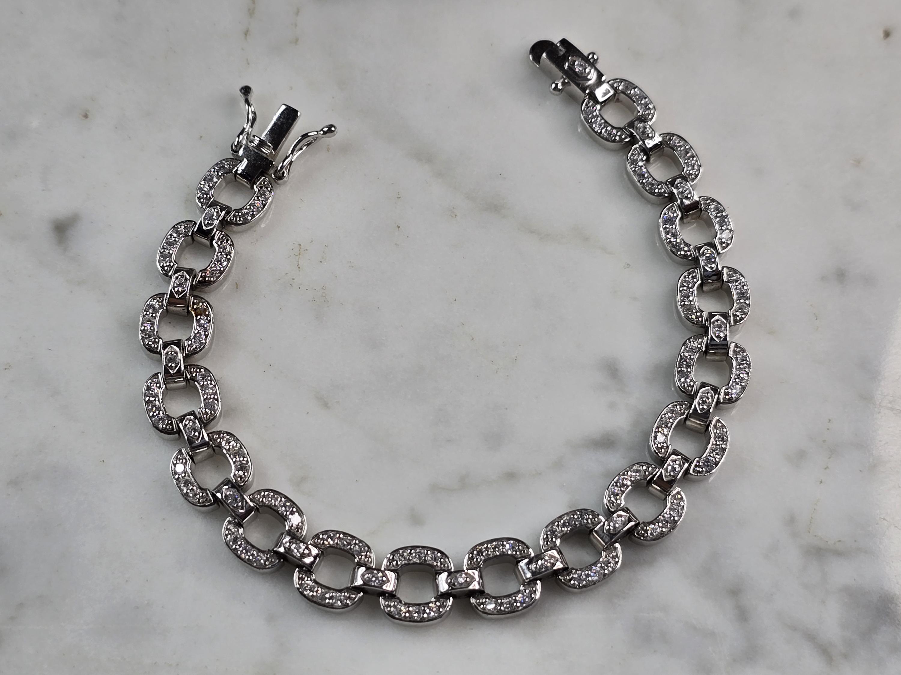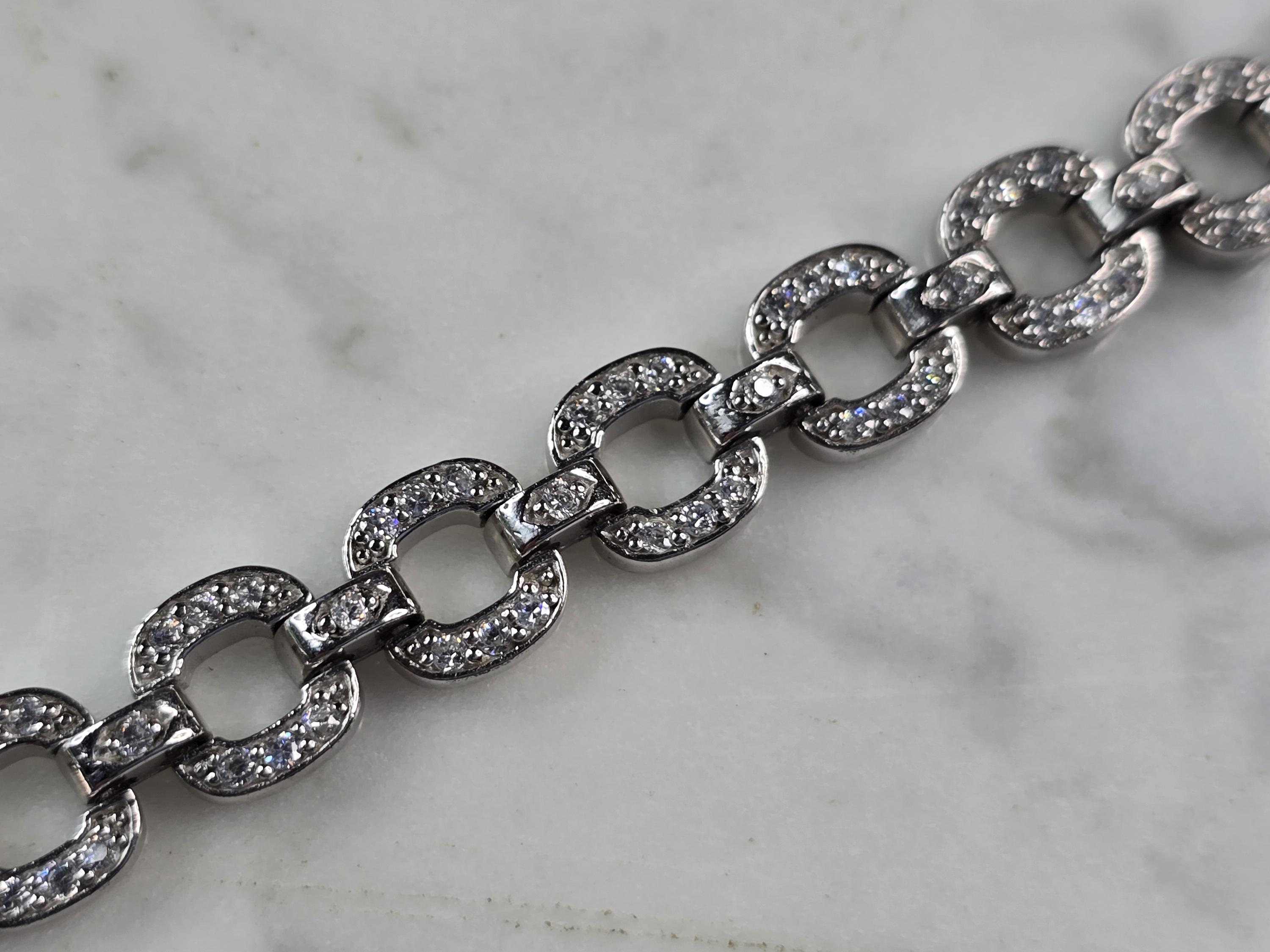 A WOMENS VINTAGE ESTATE STERLING SILVER MODERNIST CZ BRACELET. BRACELET MEASURES 7" LONG BY 3/8" WIDE AND WEIGHS 17.8g. THIS WOULD MAKE A LOVELY GIFT FOR THAT SOMEONE SPECIAL. ANY QUESTIONS, PLEASE DON'T HESITATE TO ASK. BE SURE TO CHECK OUT SOME OF MY OTHER GREAT ITEMS UP FOR SALE. THANK YOU.