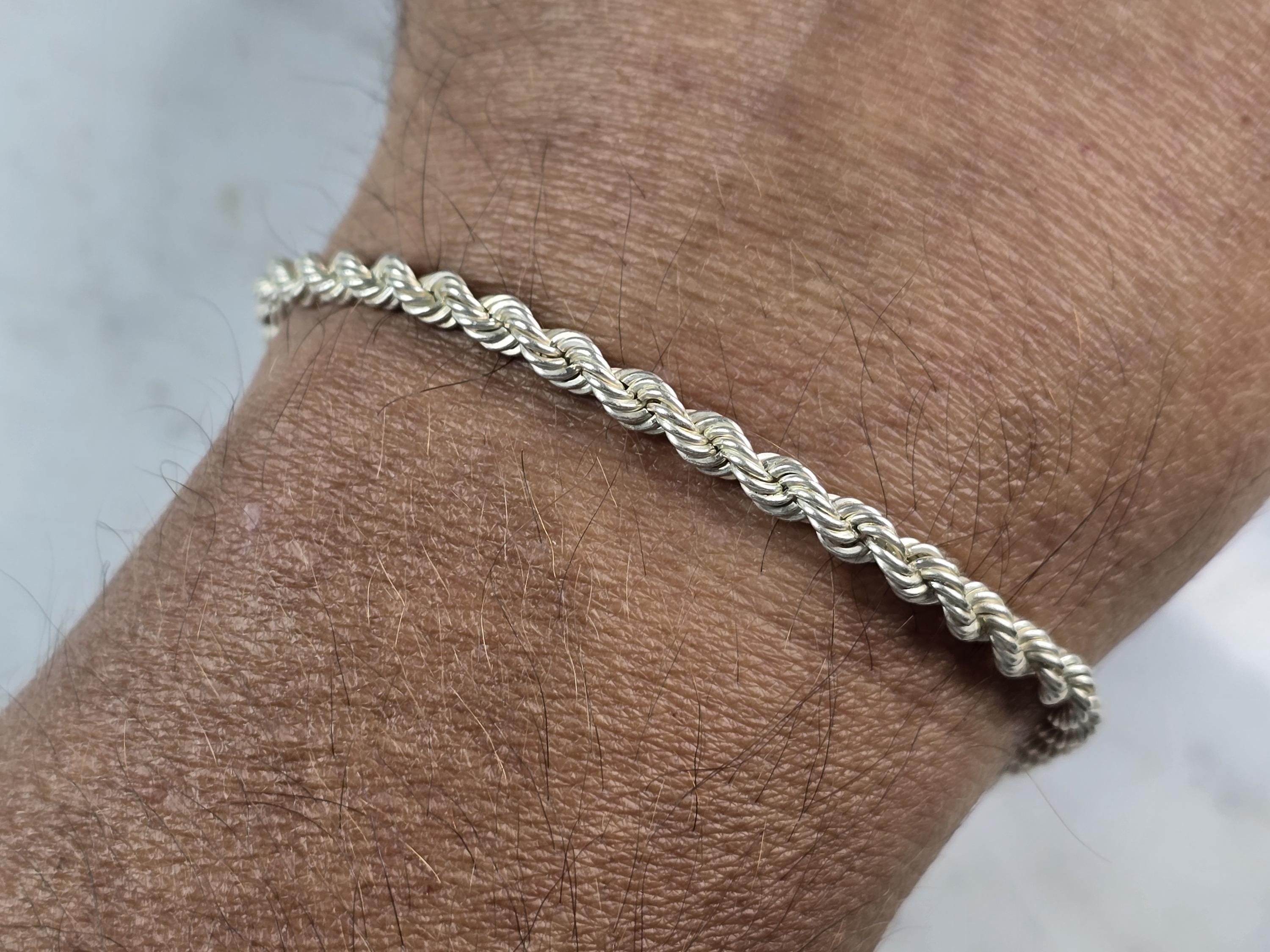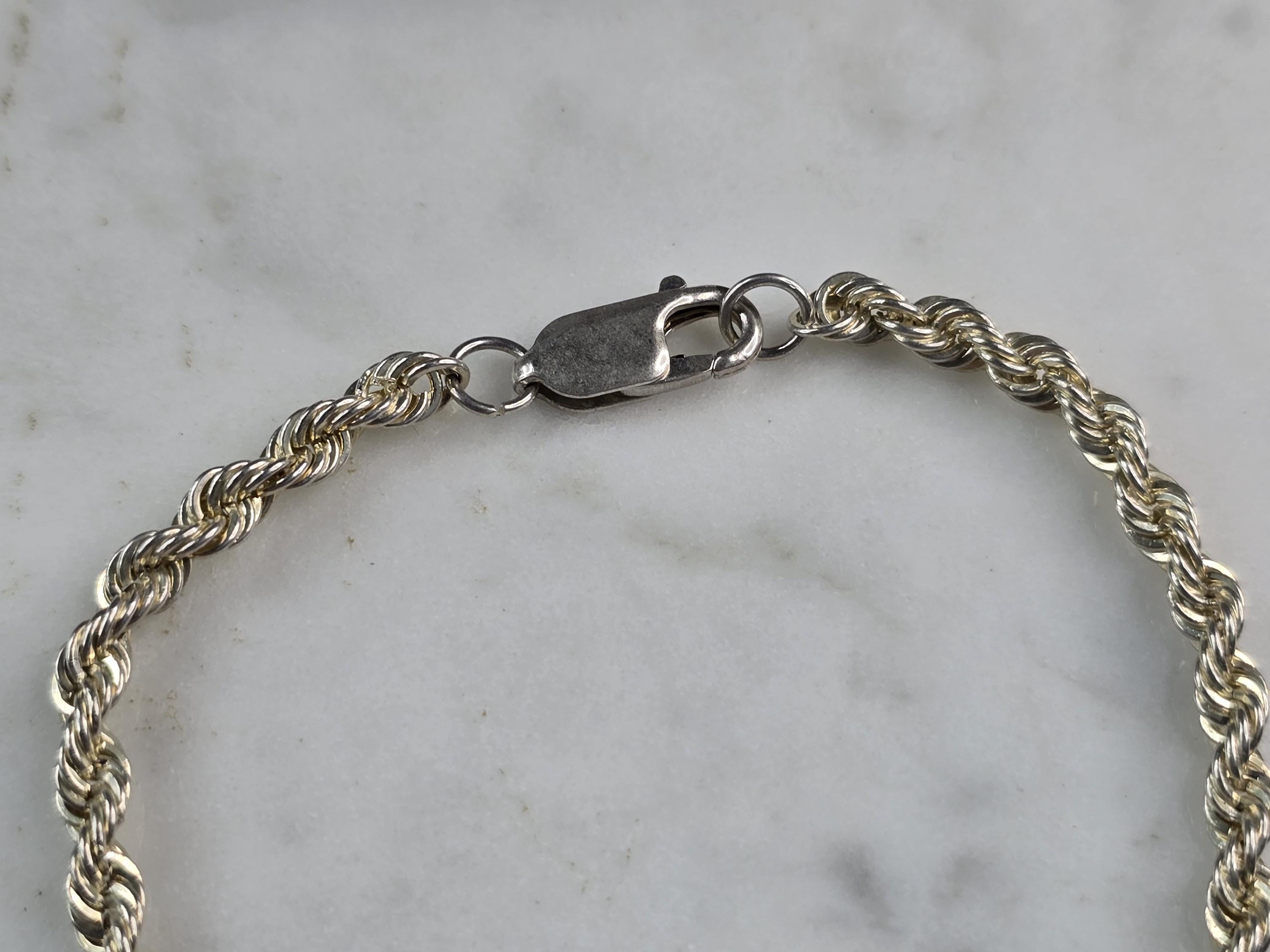 A WOMENS VINTAGE ESTATE STERLING SILVER ROPE BRACELET. BRACELET IS ABOUT 7 1/2" LONG BY 1/8" WIDE AND WEIGHS 8.9g. WOULD MAKE A LOVELY GIFT FOR THAT SOMEONE SPECIAL. BE SURE TO CHECK OUT SOME OF MY OTHER GREAT ITEMS UP FOR SALE. THANK YOU.