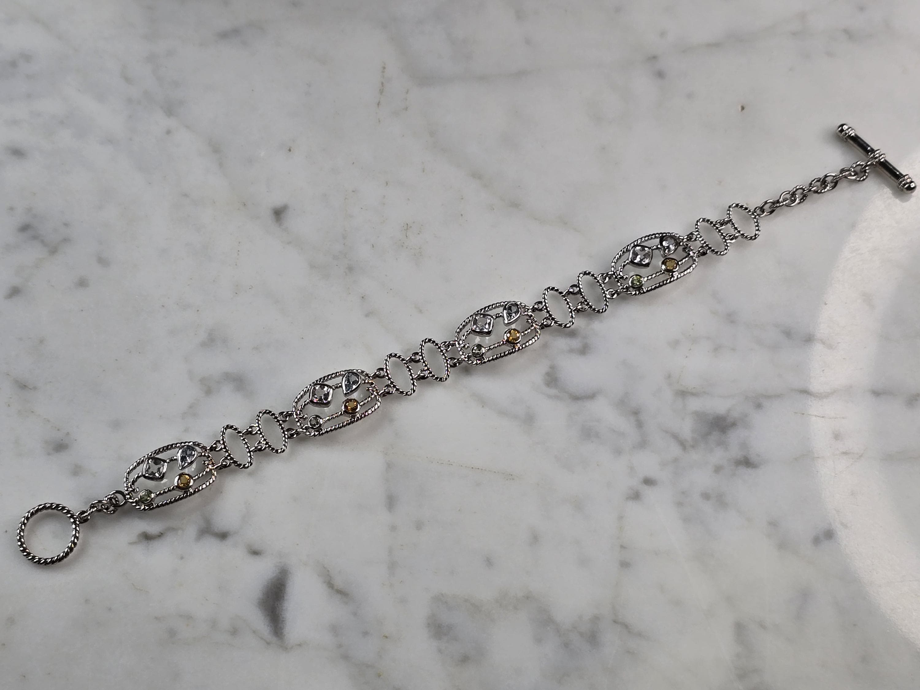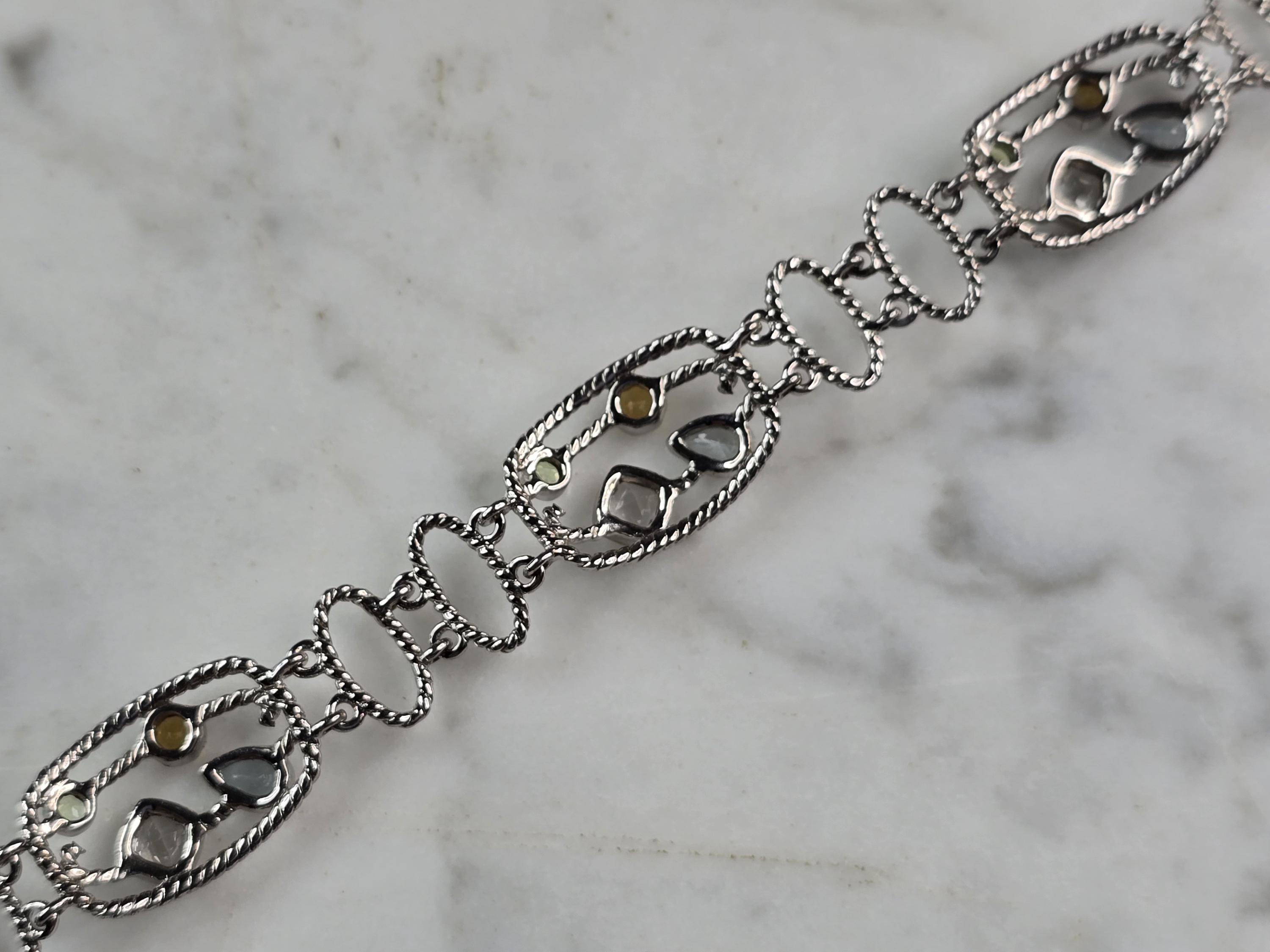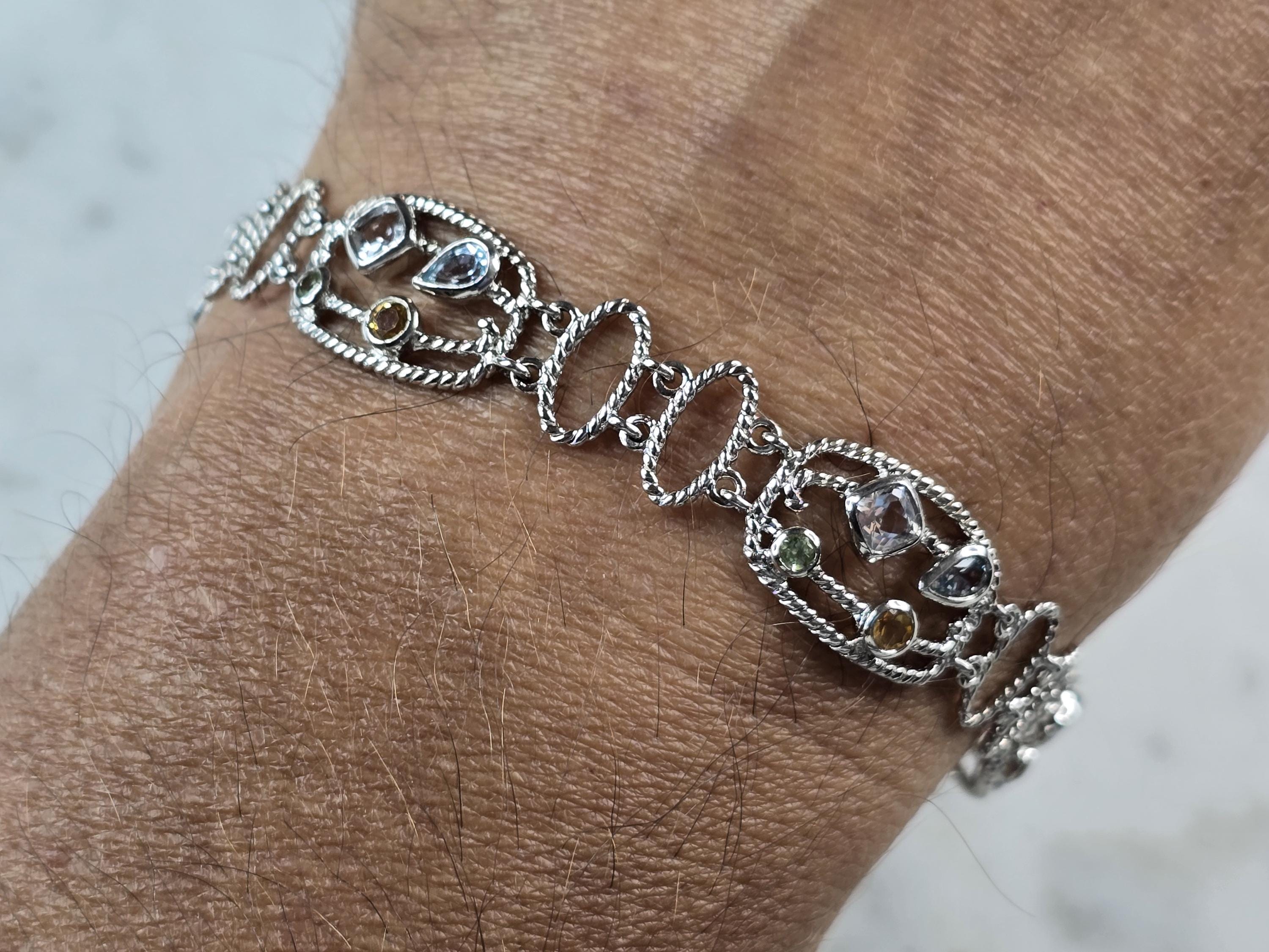A WOMENS VINTAGE ESTATE STERLING SILVER MULTI STONE BRACELET. BRACELET MEASURES 8" LONG BY 1/2" WIDE AND WEIGHS 12.1g. NOT SURE IF STONES ARE NATURAL OR MAN MADE. THIS WOULD MAKE A LOVELY GIFT FOR THAT SOMEONE SPECIAL. ANY QUESTIONS, PLEASE DON'T HESITATE TO ASK. BE SURE TO CHECK OUT SOME OF MY OTHER GREAT ITEMS UP FOR SALE. THANK YOU.