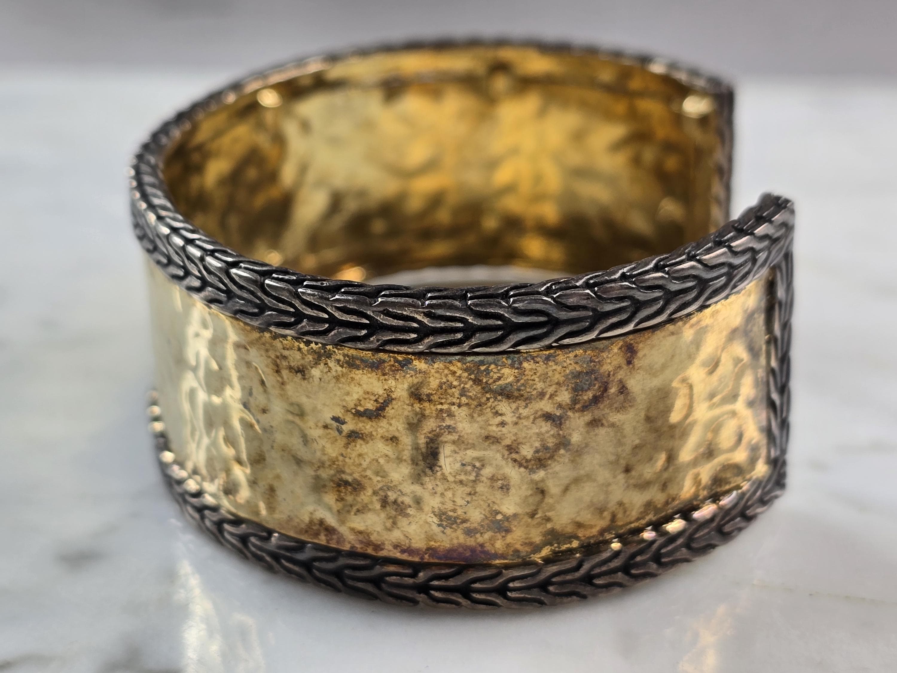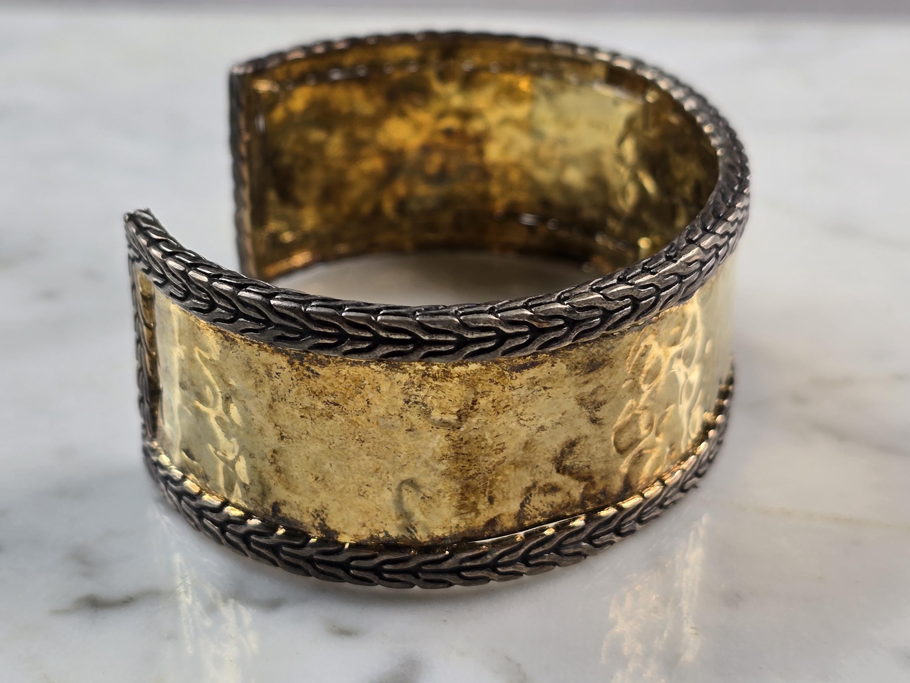 A LOVELY VINTAGE ESTATE STERLING SILVER GOLD TONE MODERNIST CUFF BRACELET. BRACELET MEASURES 7" IN CIRCUMFERENCE BY 1 1/8" WIDE AND WEIGHS 38.7g. THIS WOULD MAKE A LOVELY GIFT FOR THAT SOMEONE SPECIAL. ANY QUESTIONS, PLEASE DON'T HESITATE TO ASK. BE SURE TO CHECK OUT SOME OF MY OTHER GREAT ITEMS UP FOR SALE. THANK YOU.