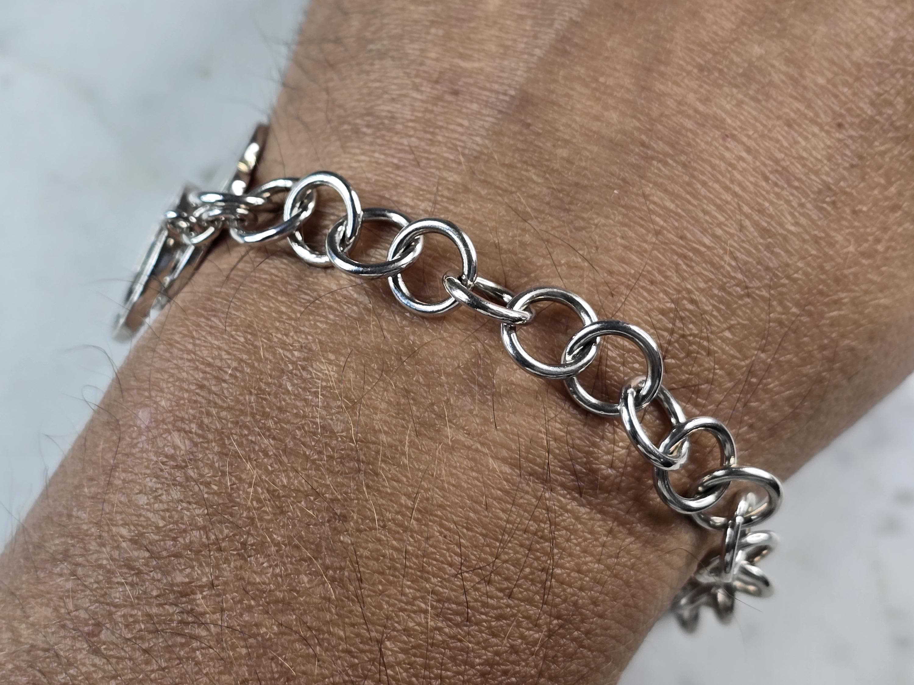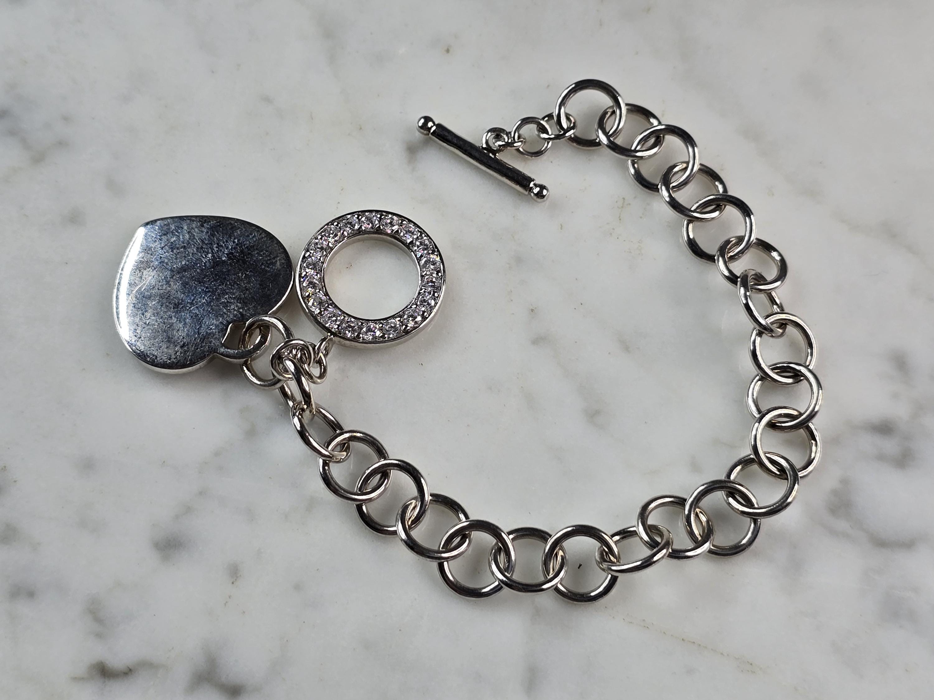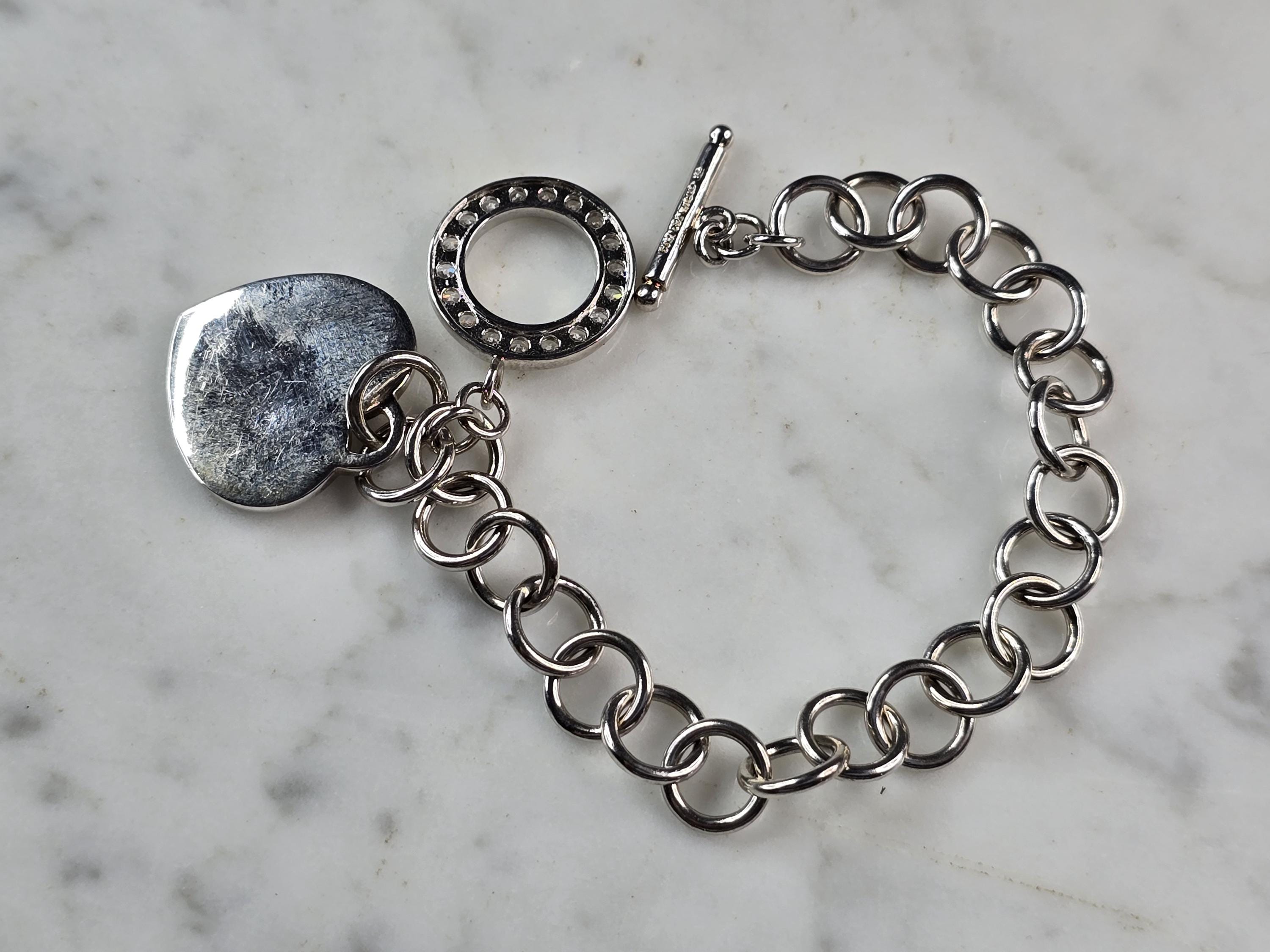 A WOMENS VINTAGE ESTATE STERLING SILVER HEART CHARM BRACELET. BRACELET MEASURES 7" LONG BY 1/4" WIDE AND WEIGHS 23.2g. THIS WOULD MAKE A LOVELY GIFT FOR THAT SOMEONE SPECIAL. ANY QUESTIONS, PLEASE DON'T HESITATE TO ASK. BE SURE TO CHECK OUT SOME OF MY OTHER GREAT ITEMS UP FOR SALE. THANK YOU.