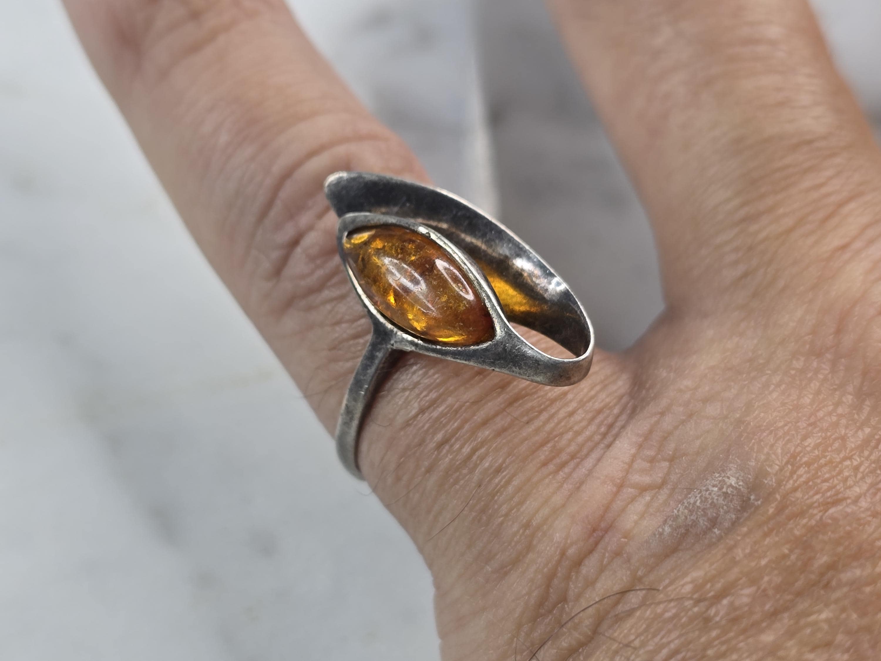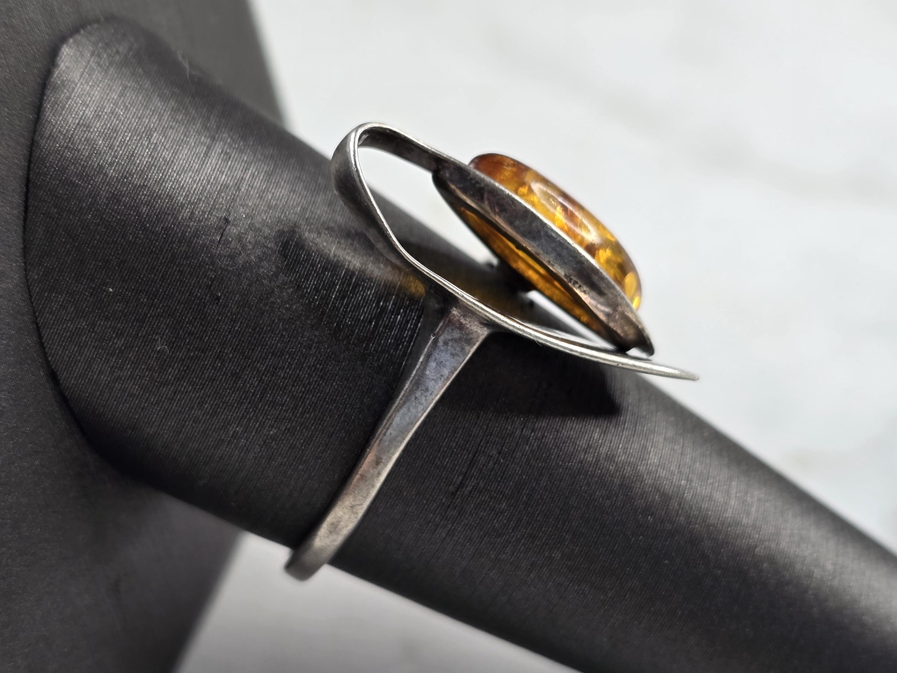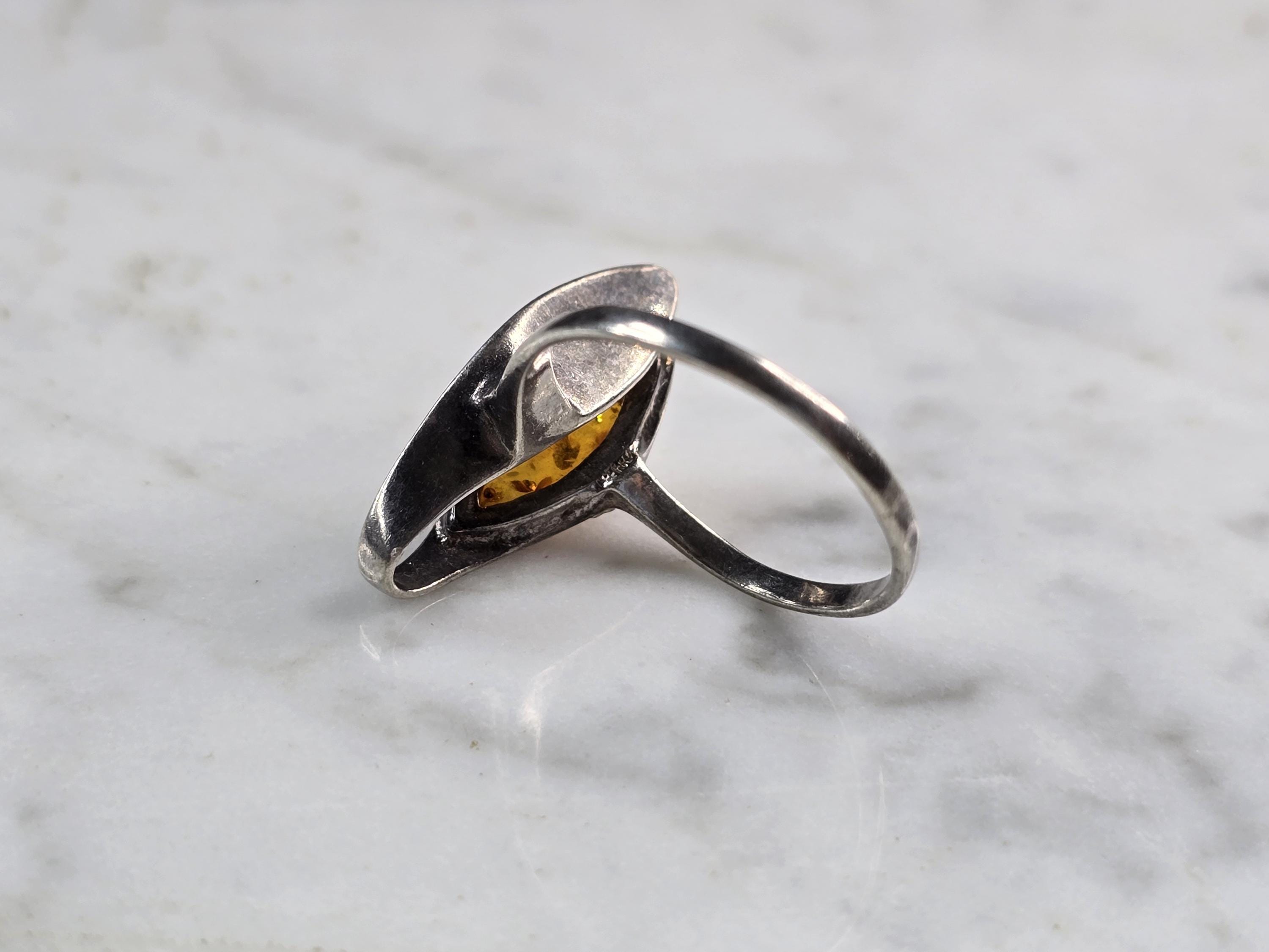 A WOMENS VINTAGE ESTATE STERLING SILVER MODERNIST RING WITH A CITRINE COLORED STONE. THE RING WEIGHS 2.8g, AND IS A SIZE 9.25. THE LENGTH OF THE RING IS ABOUT 1". NOT SURE IF THE STONE IS NATURAL OR MANMADE. ANY QUESTIONS PLEASE DO NOT HESITATE TO ASK. BE SURE TO CHECK OUT SOME OF MY OTHER GREAT ITEMS UP FOR SALE. THANK YOU.