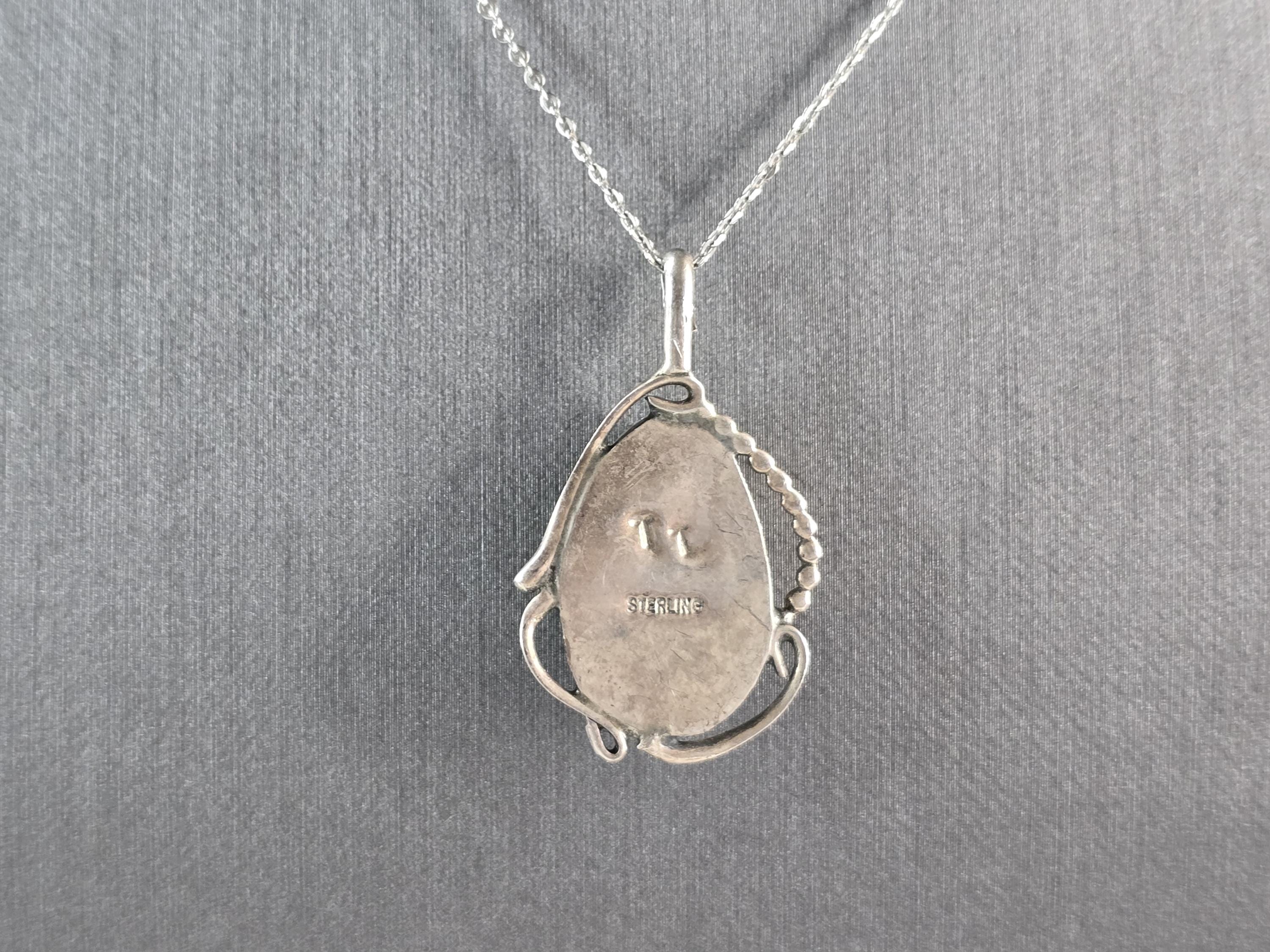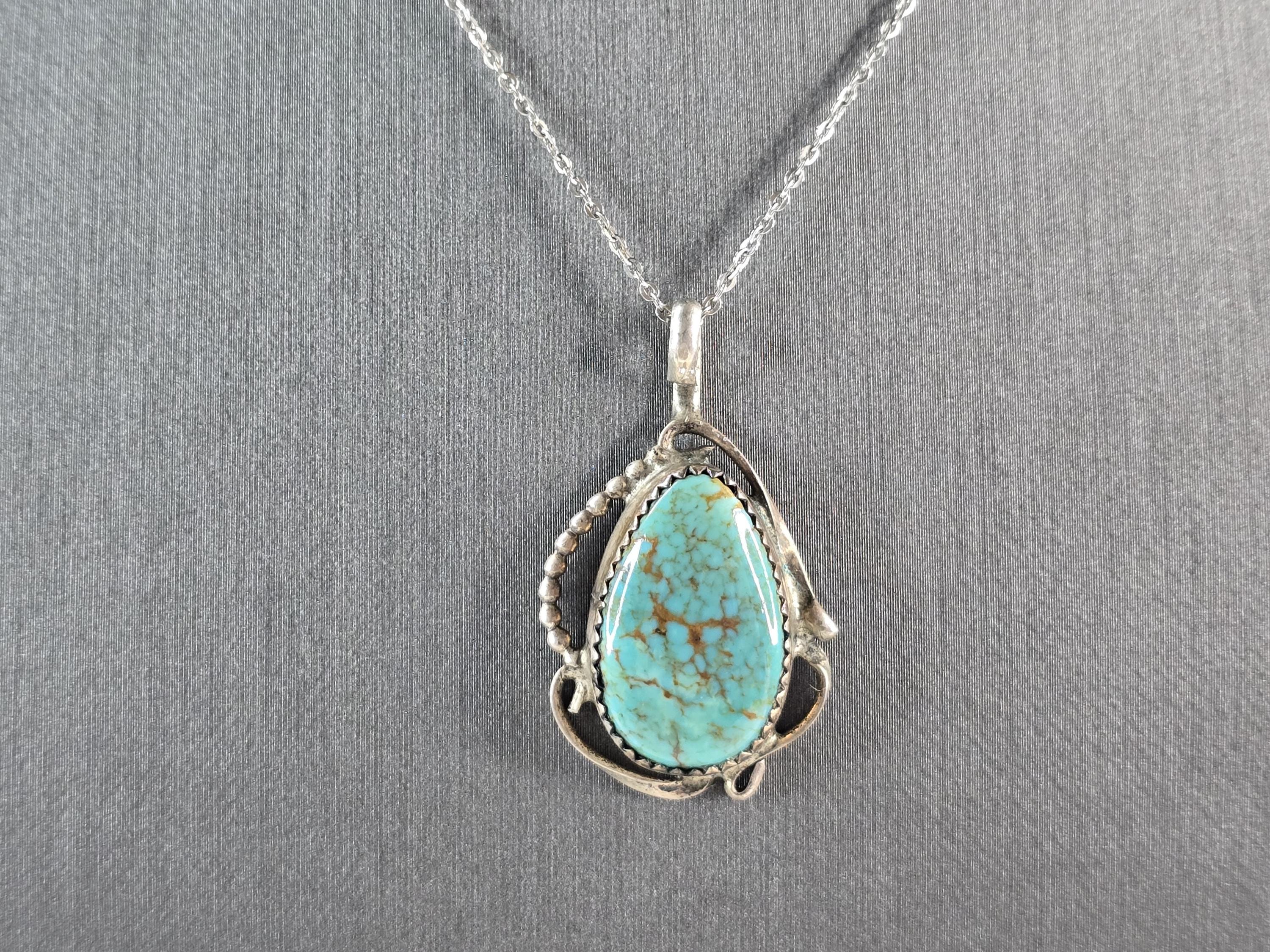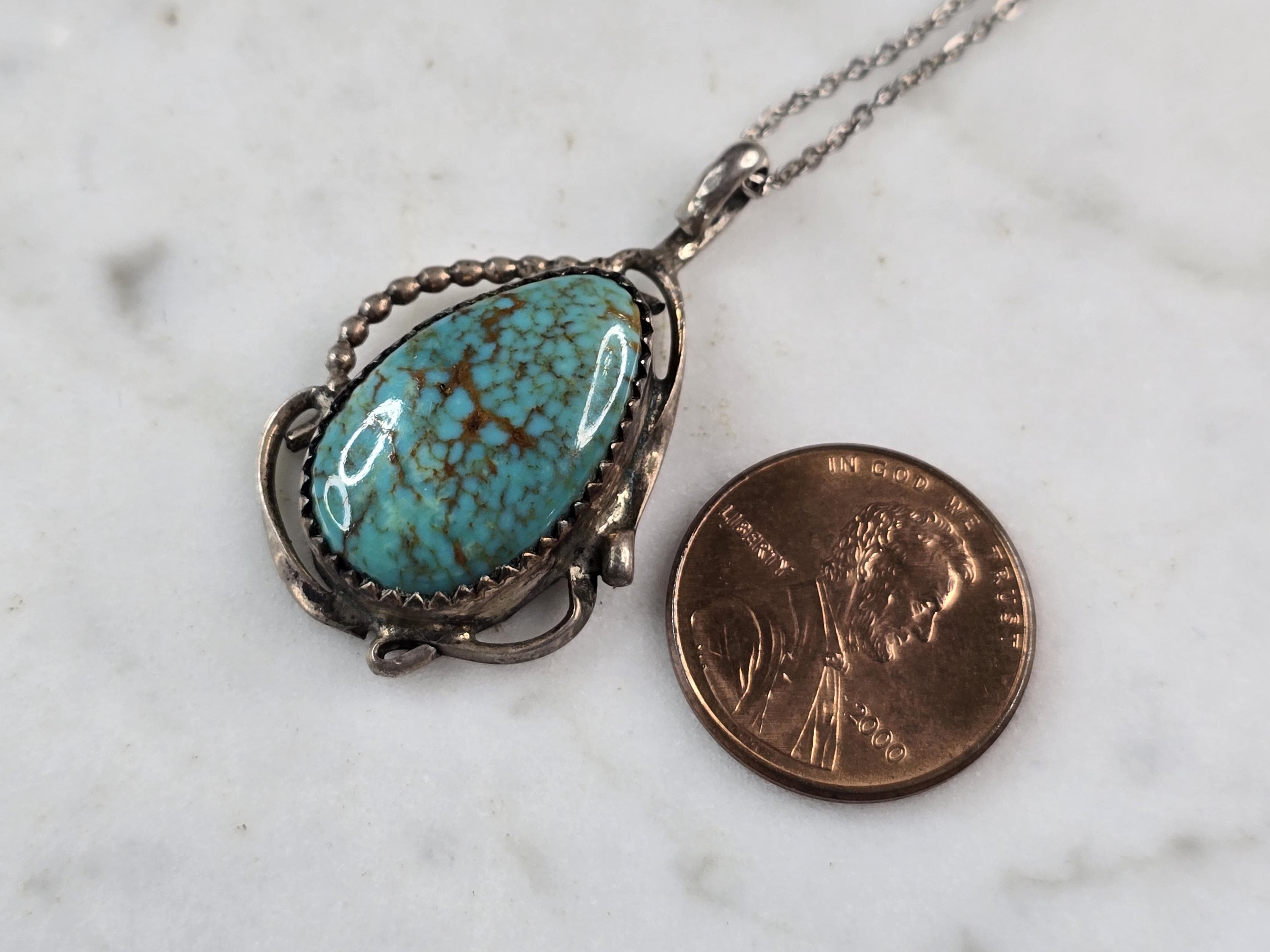 A WOMENS VINTAGE ESTATE STERLING SILVER TURQUOISE PENDANT WITH NECKLACE. TOGETHER NECKLACE AND PENDANT WEIGHS 6.4g. PENDANT MEASURES 1 3/8" LONG BY 3/4" WIDE. NECKLACE MEASURES 18" LONG AND IS ADJUSTABLE TO 16". MAKES A GREAT GIFT FOR THAT SOMEONE SPECIAL. ANY QUESTIONS, PLEASE ASK. BE SURE TO CHECK OUT OUR OTHER ITEMS FOR SALE.
