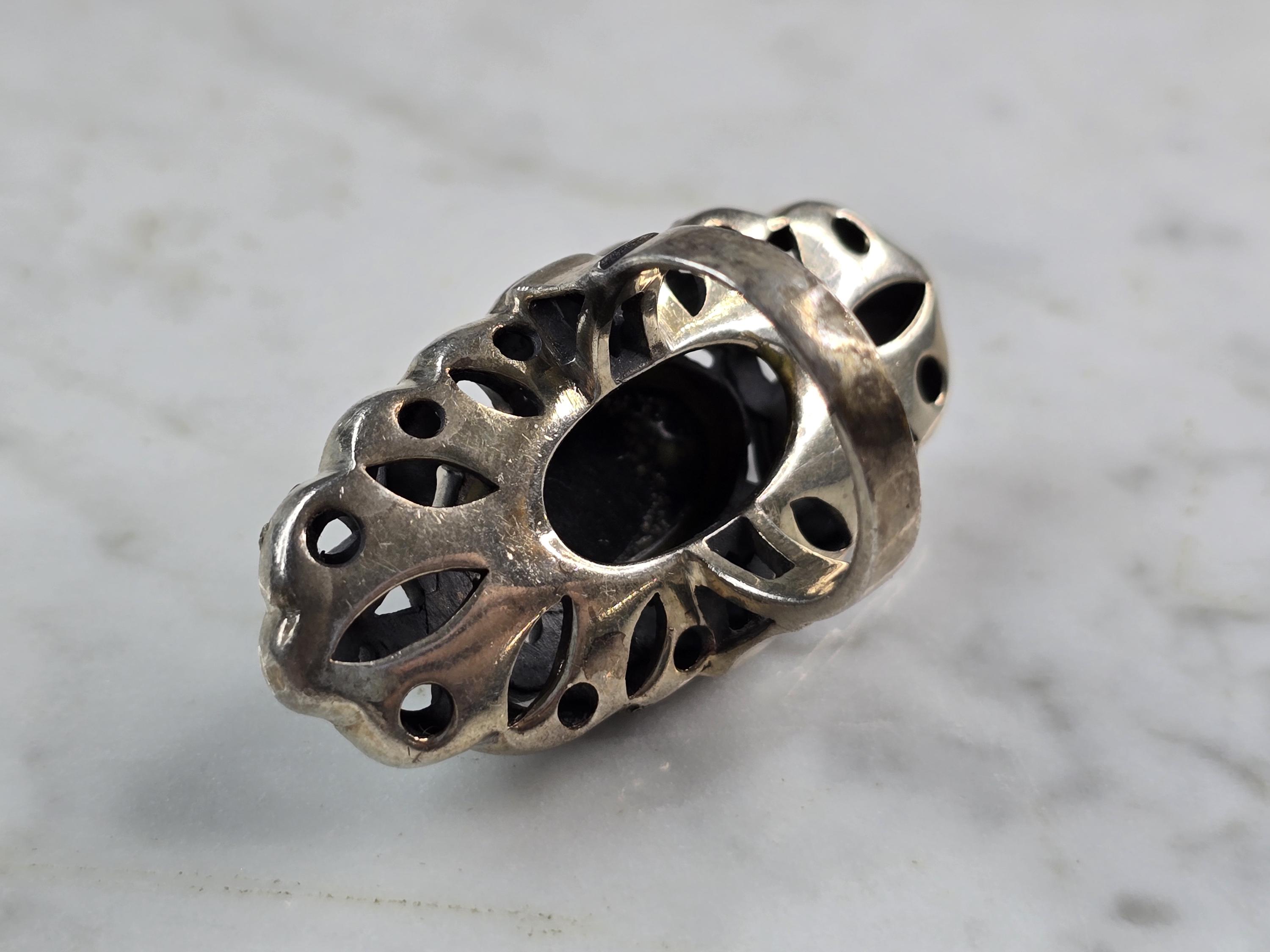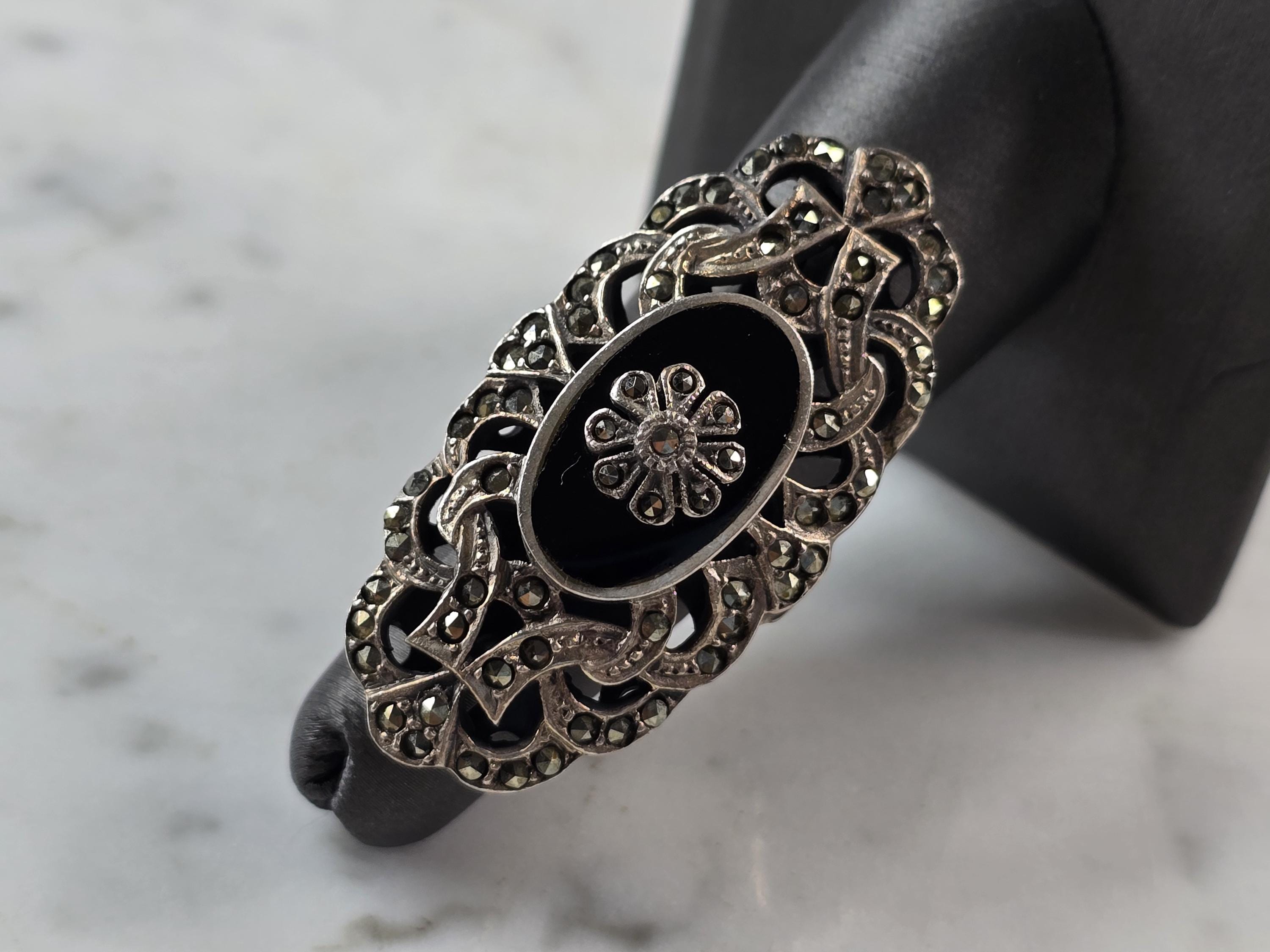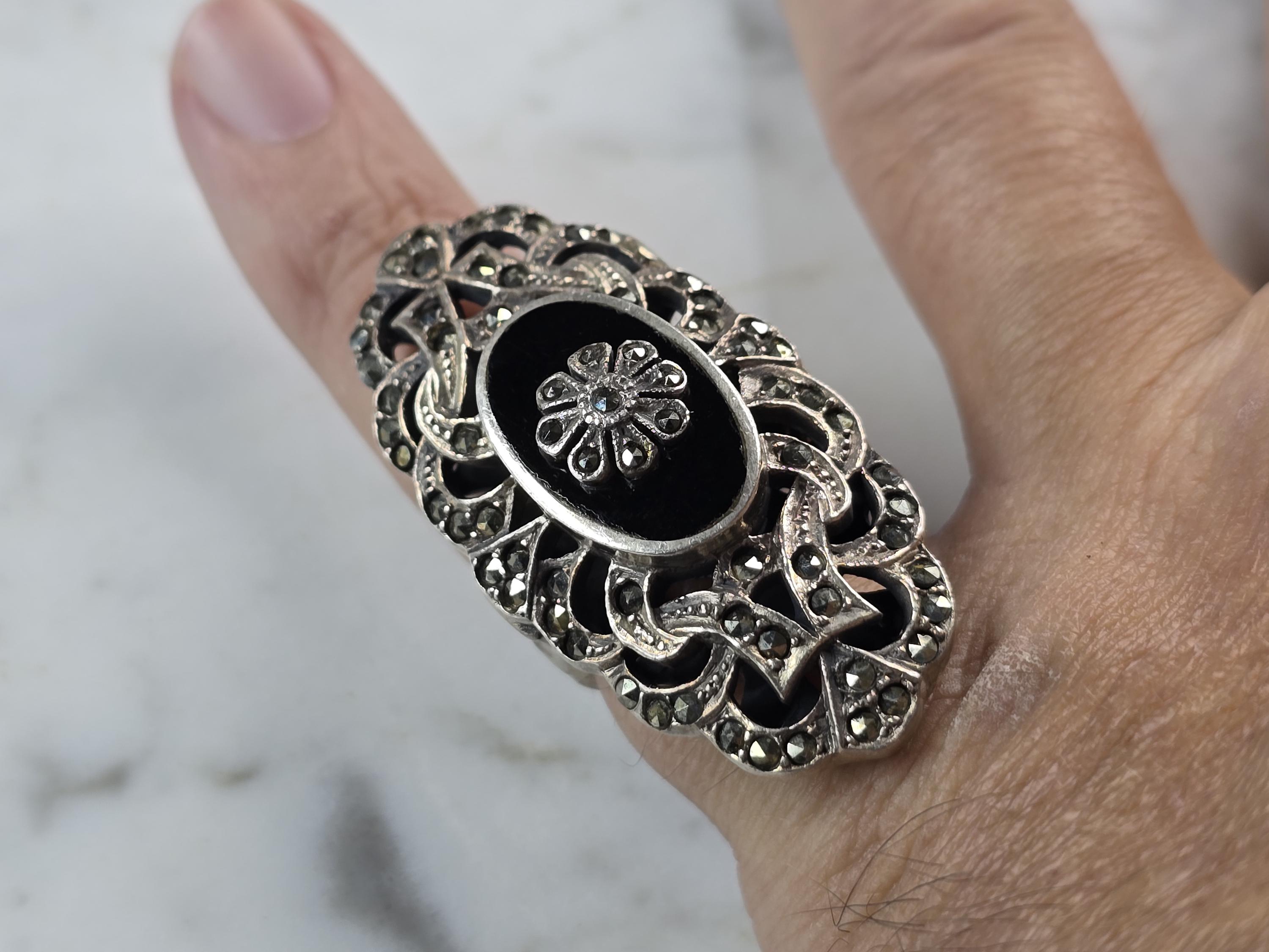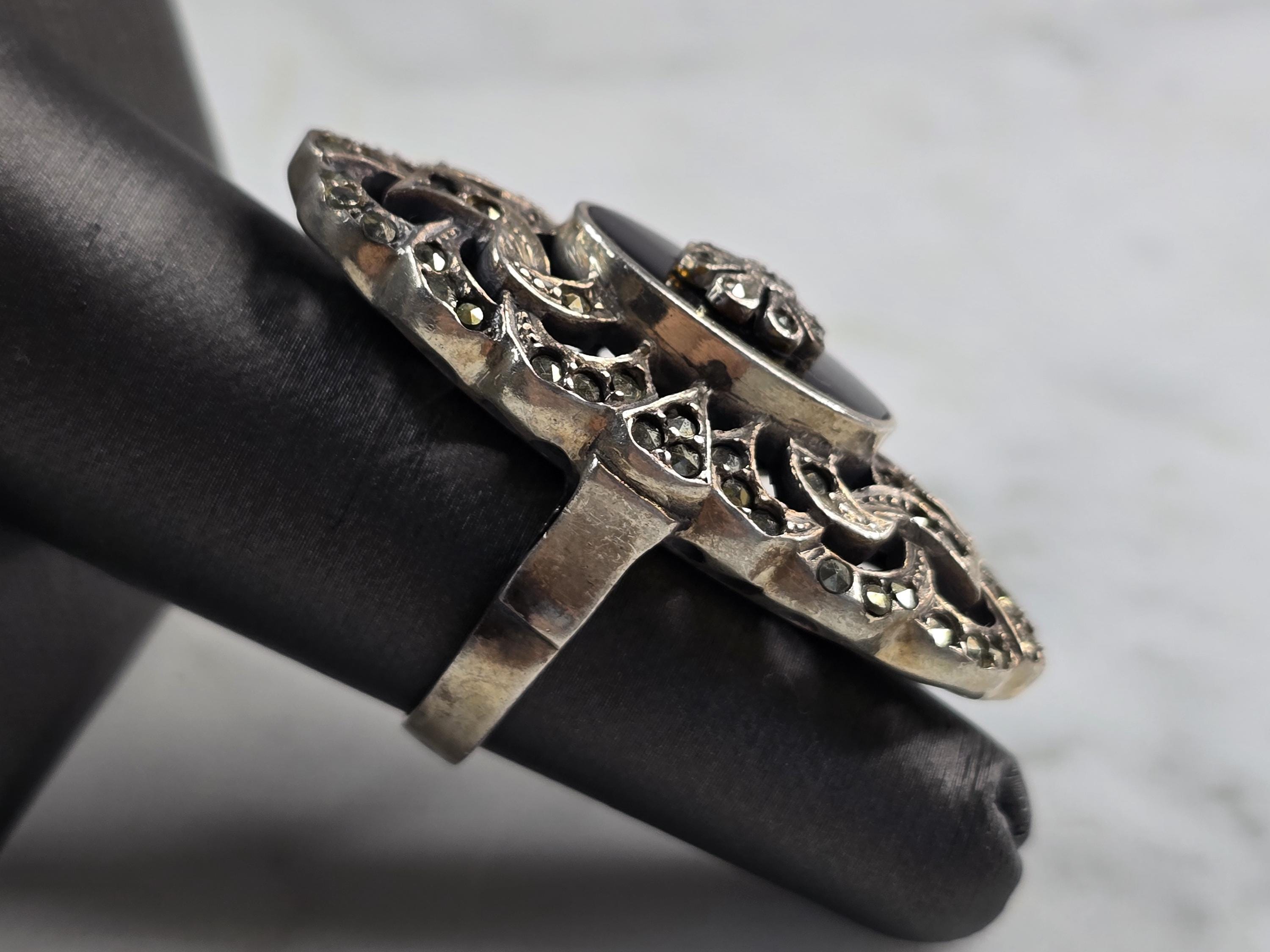 A WOMENS VINTAGE ESTATE STERLING SILVER ART DECO ONYX RING. THE SIZE OF THE RING IS A 6.75 AND WEIGHS 19.3g. THE LENGTH OF THE RING IS 1 3/4". ANY QUESTIONS, PLEASE DO NOT HESITATE TO ASK. THIS MAKES A LOVELY GIFT FOR THAT SOMEONE SPECIAL. BE SURE TO CHECK OUT SOME OF MY OTHER GREAT ITEMS UP FOR SALE. THANK YOU.