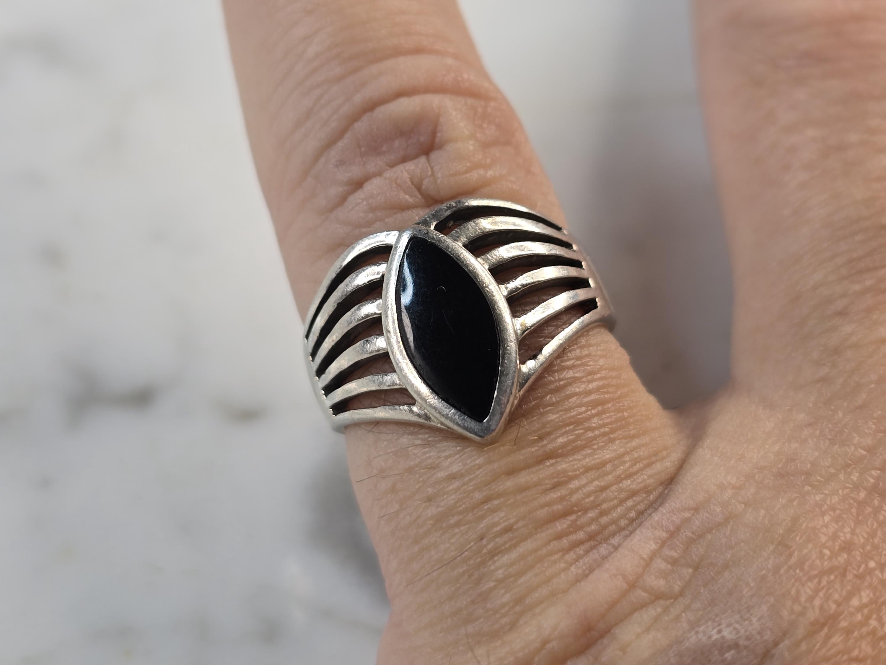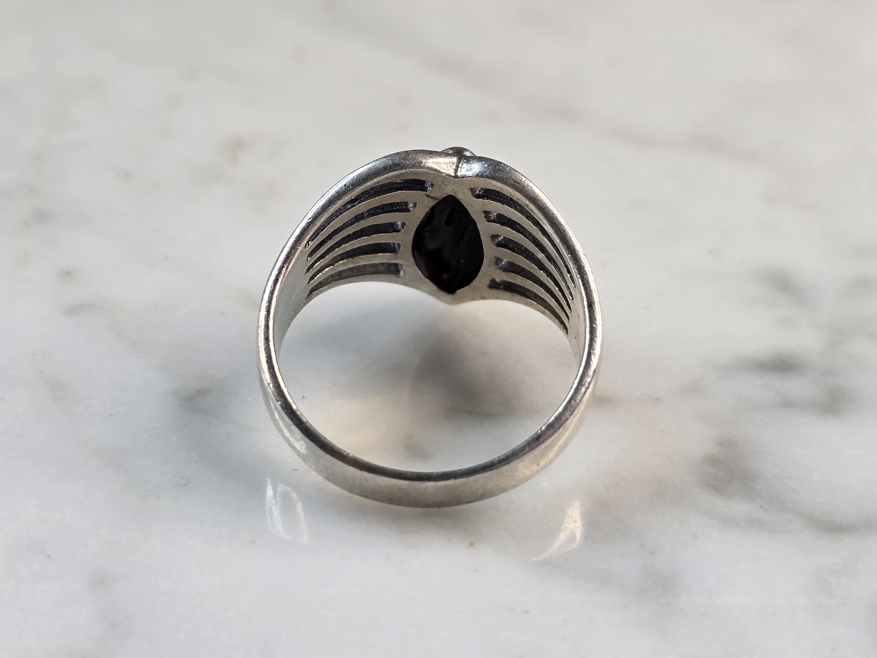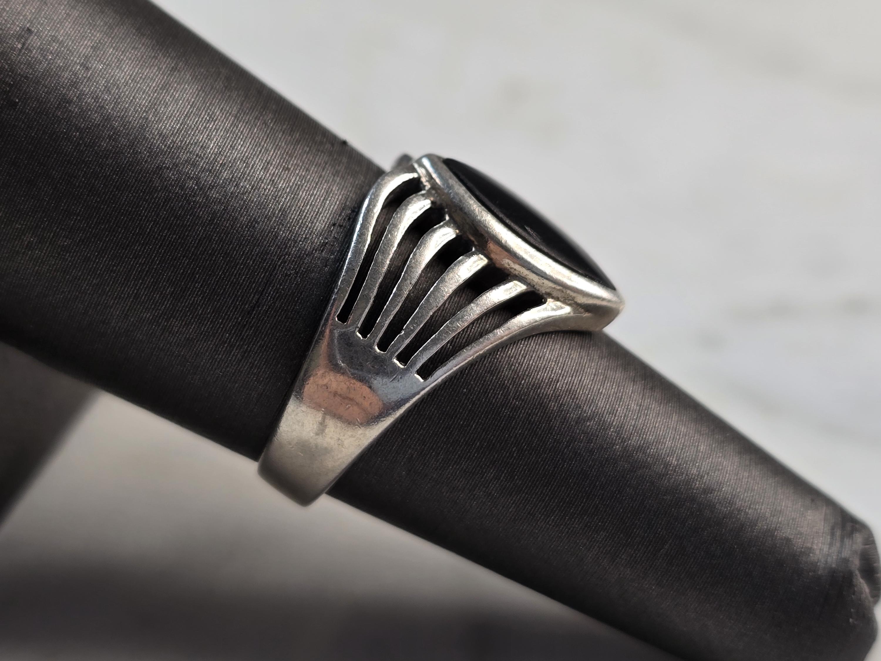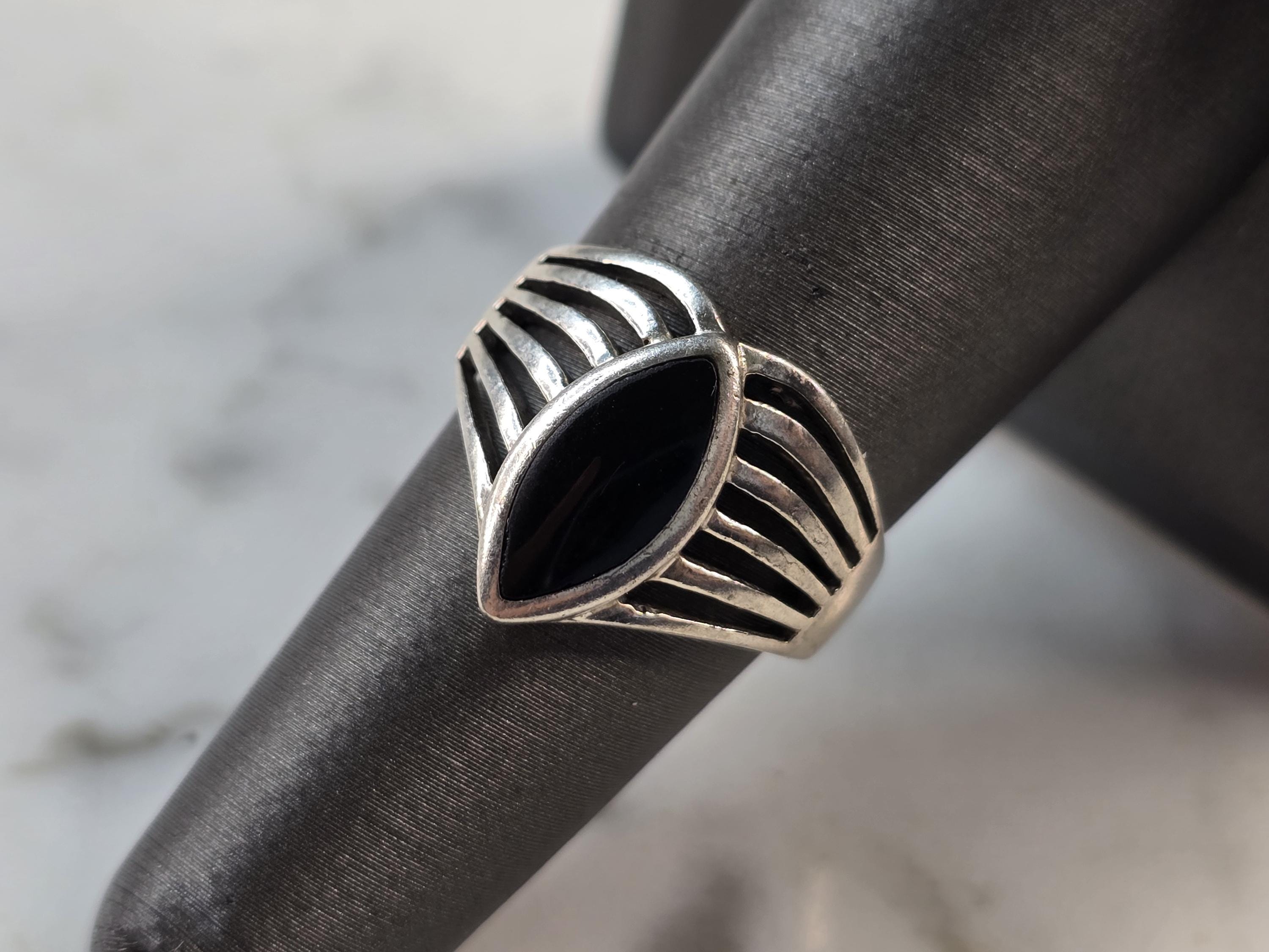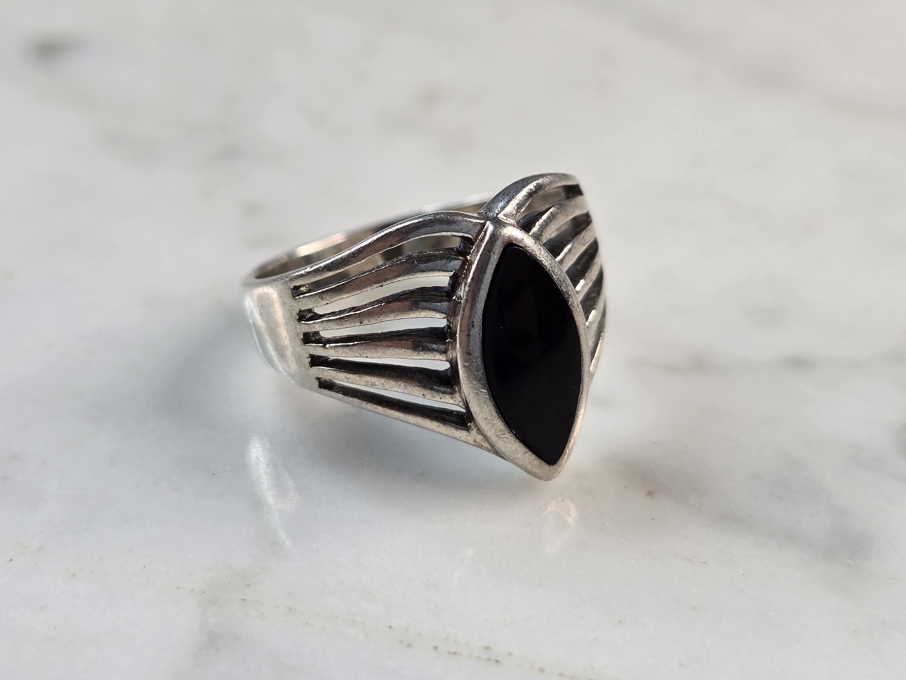 A WOMENS VINTAGE ESTATE STERLING SILVER MODERNIST ONYX RING. RING SIZE IS AN 7.0, AND WEIGHS 4.6g. THE LENGTH OF THE RING IS 1/2". THIS WOULD MAKE A NICE GIFT FOR THAT SOMEONE SPECIAL. ANY QUESTIONS PLEASE DO NOT HESITATE TO ASK. BE SURE TO CHECK OUT SOME OF MY OTHER GREAT ITEMS UP FOR SALE. THANK YOU