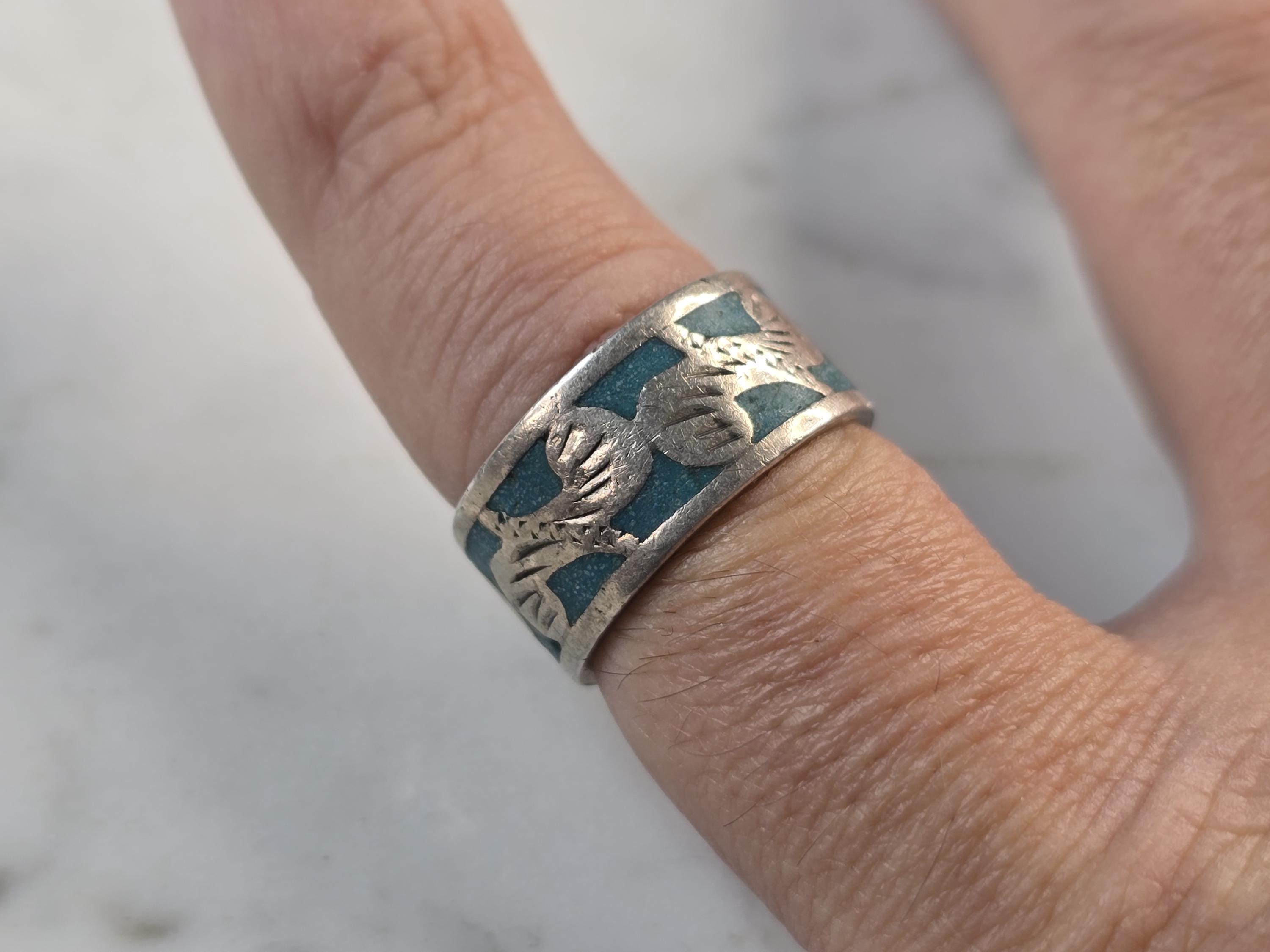 A WOMENS VINTAGE ESTATE STERLING SILVER & ENAMEL RING. THE RING SIZE IS A 5.75, AND WEIGHS 5.2g. THE WIDTH OF THE RING IS 3/8". WOULD MAKE A NICE GIFT FOR THAT SOMEONE SPECIAL. ANY QUESTIONS PLEASE DO NOT HESITATE TO ASK. BE SURE TO CHECK OUT SOME OF MY OTHER GREAT ITEMS UP FOR SALE. THANK YOU.